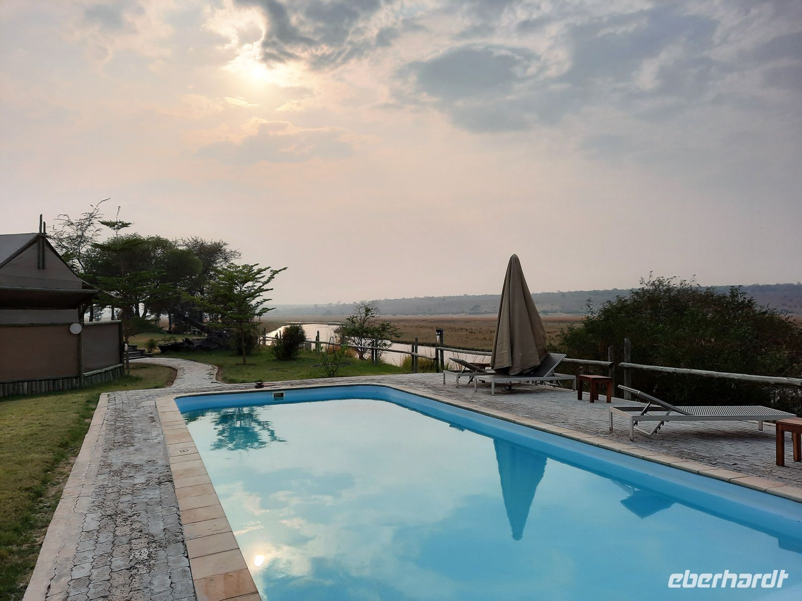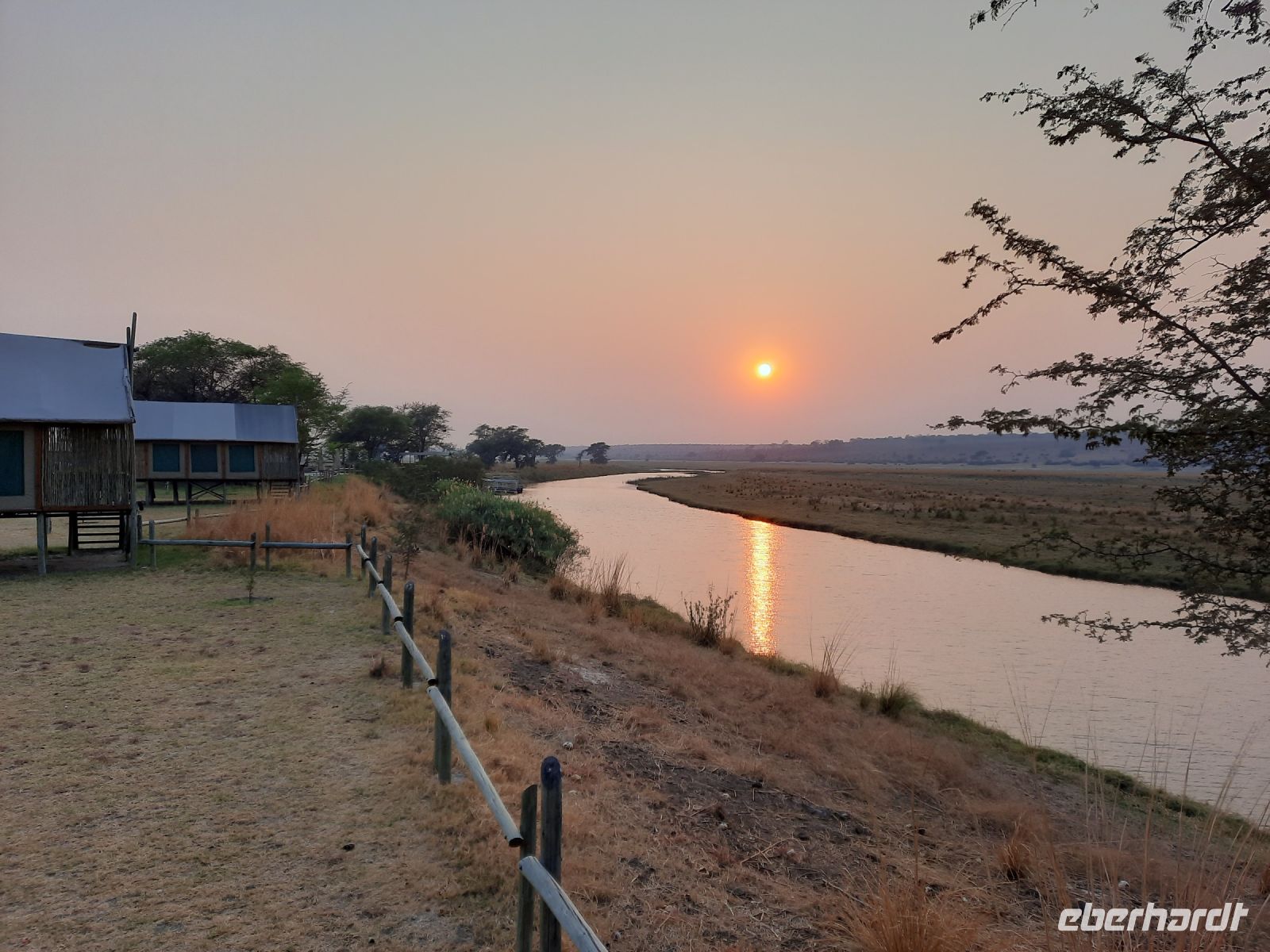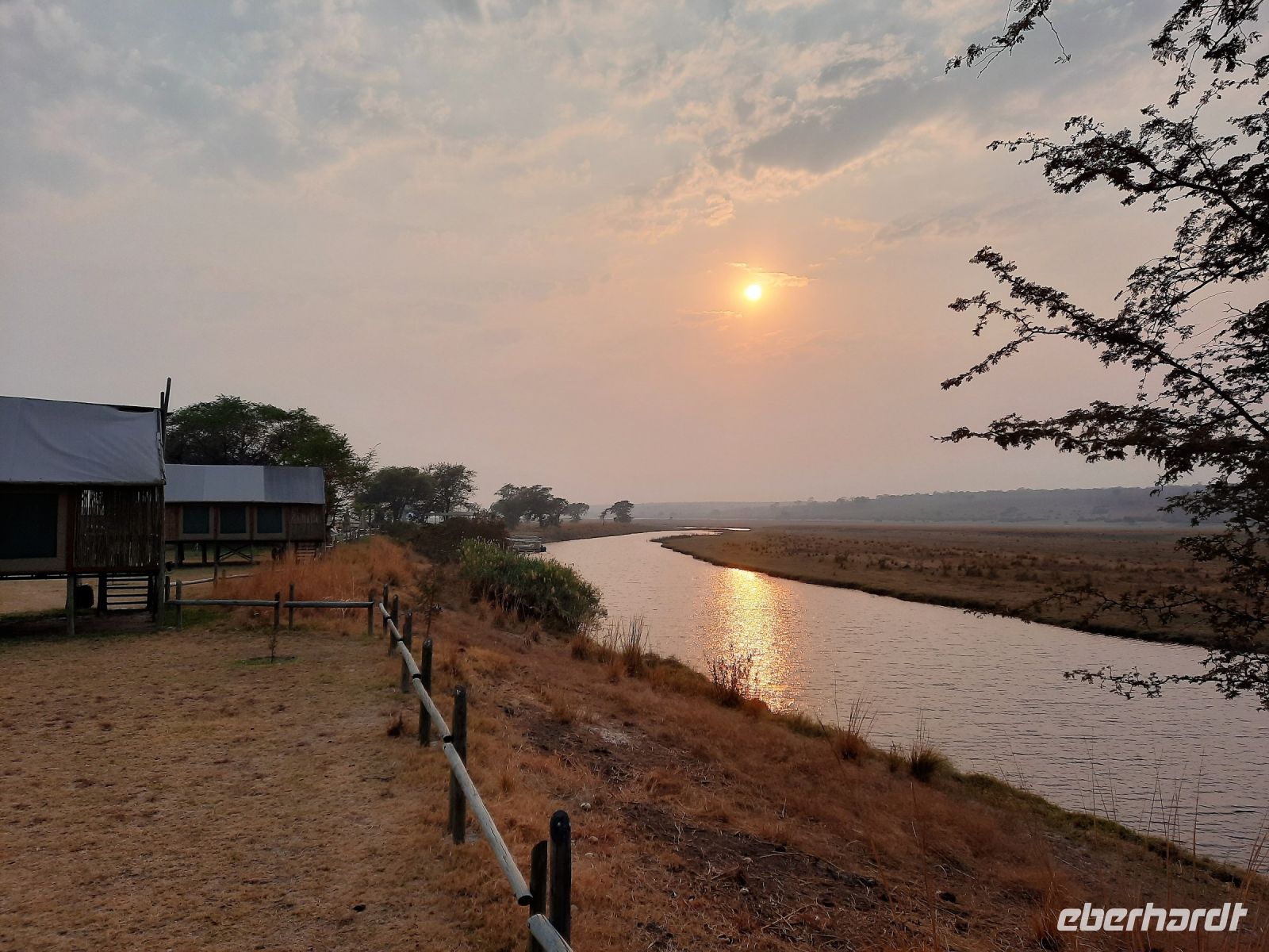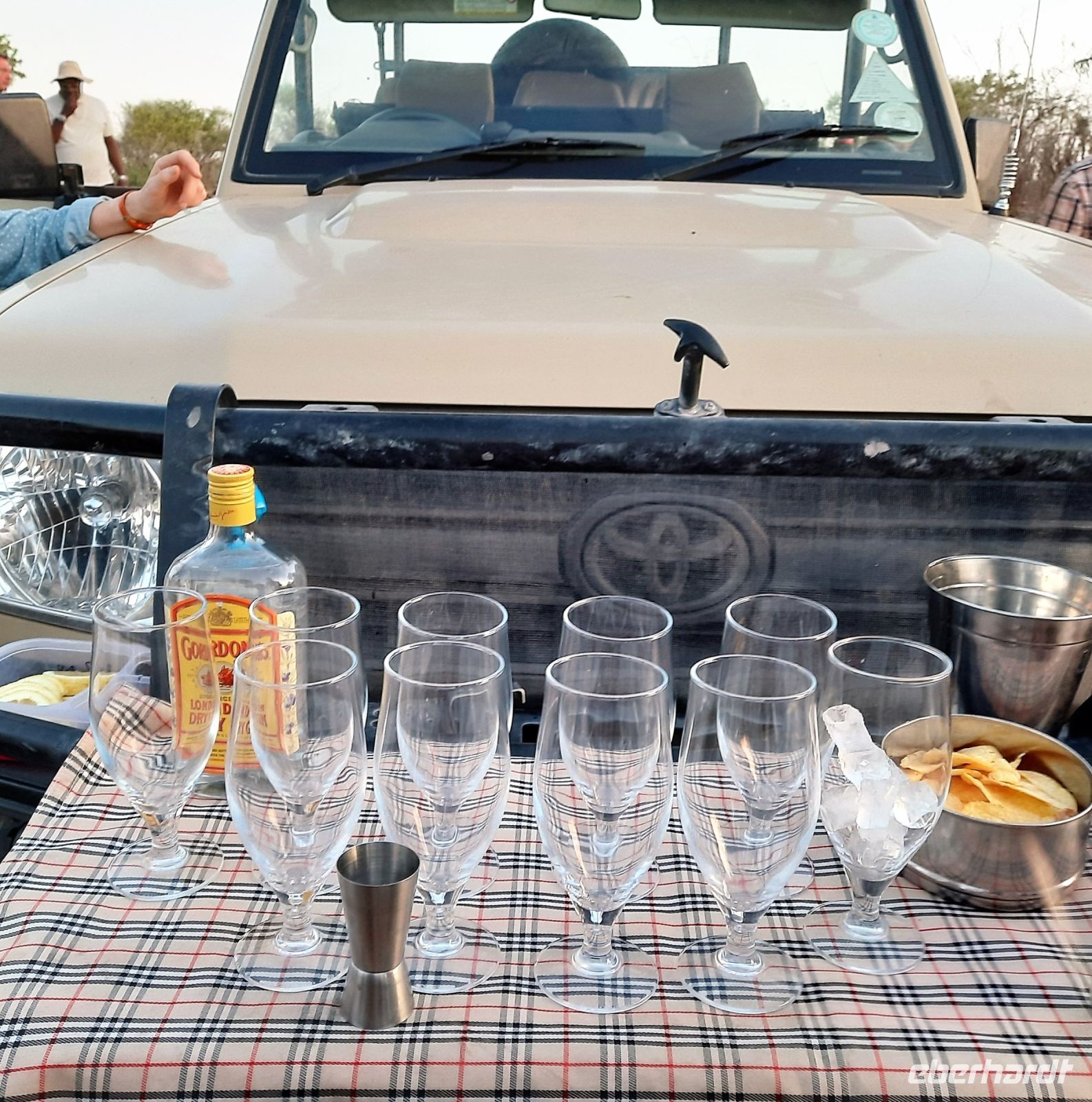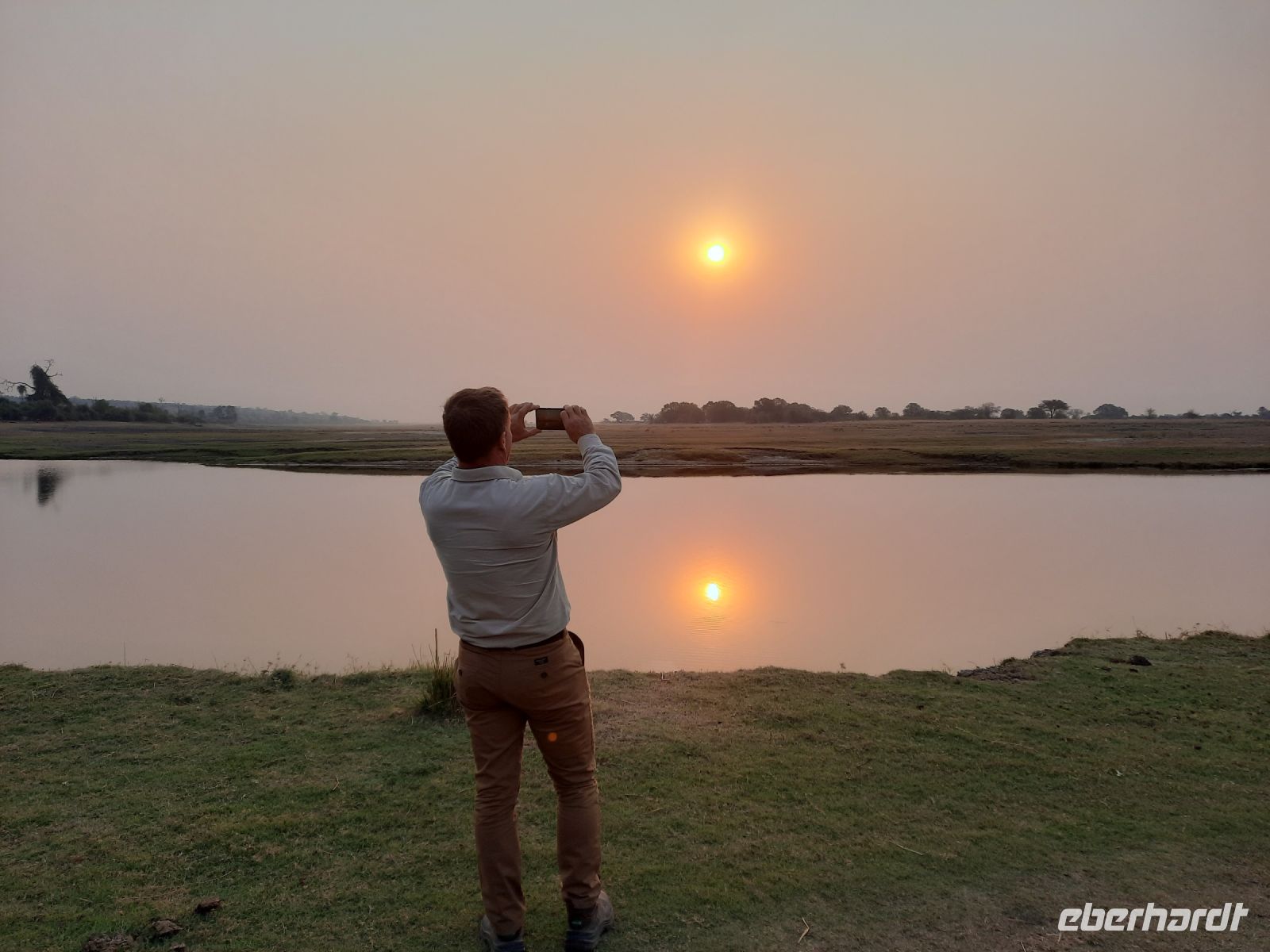 Die heißen Mittagsstunden verbrachten wir in unserer schönen Lodge und wurden mit einem leckeren Mittagslunch verwöhnt. Nach Kaffee und Kuchen starteten wir mit Rider und Roy zur nachmittäglichen Pirschfahrt und waren gespannt, was wir noch so alles vor die Linse bekommen würden. Mister Wasserbock begrüßte uns zuerst - die Hippos lagen noch faul im Wasser, auch die Krokodile hingen noch ab - später wurde es lebhafter und die Hippos begannen zu spielen, Buffalos kamen zum Fluss und auch wir wollten am Ufer den Sonnenuntergang geniessen. Doch halt, gerade waren Löwen am Flussufer, die nun im Gebüsch verschwanden.... Hier wollten wir aussteigen? Wir fuhren lieber ein kurzes Stück weiter und bauten dort die Sundowner-Bar auf. Pünktlich zum fantastischen Farbenspiel der untergehenden Sonne marschierten Elefanten zur Parade an. Darauf ein Gin Tonic! Zurück in der Lodge waren wir Ready for Dinner, was wieder super schmeckte und mit guten Wein begleitet wurde. Diesen schönen, tierreichen Tag beendeten wir mit einem Cocktail an der Bar, bevor wir zu unseren Zelten chauffiert wurden.