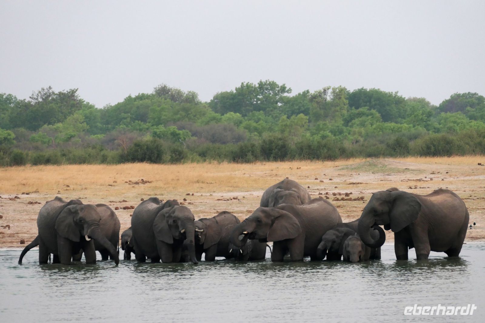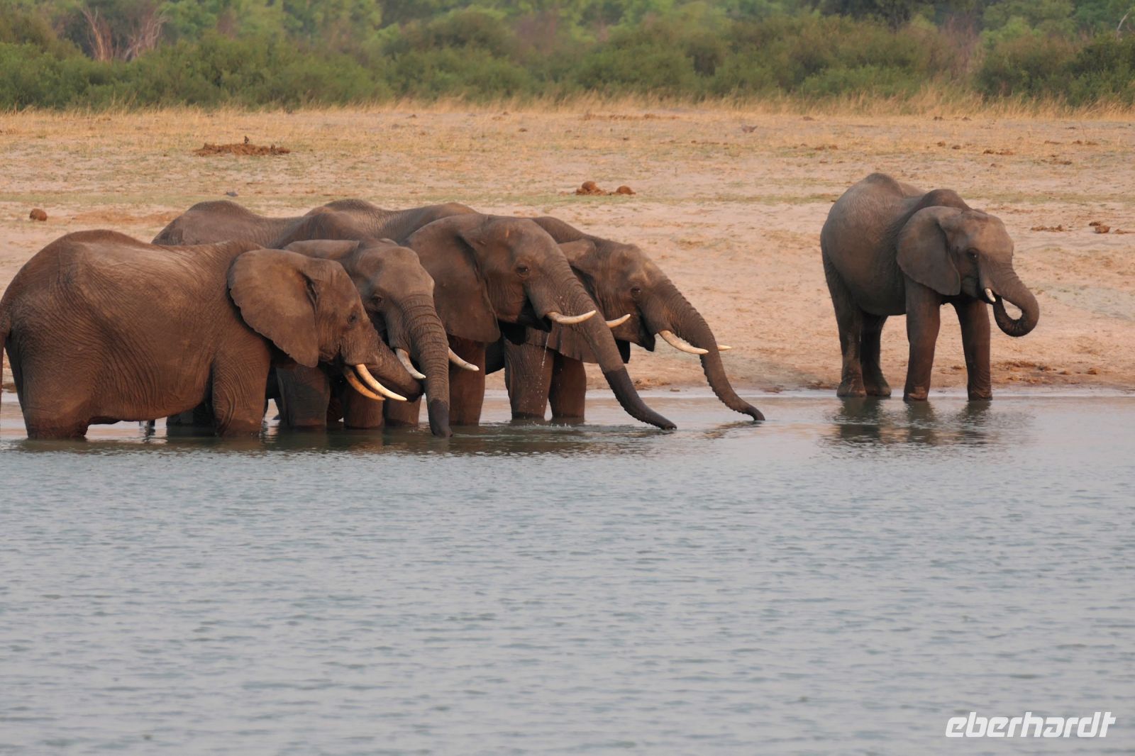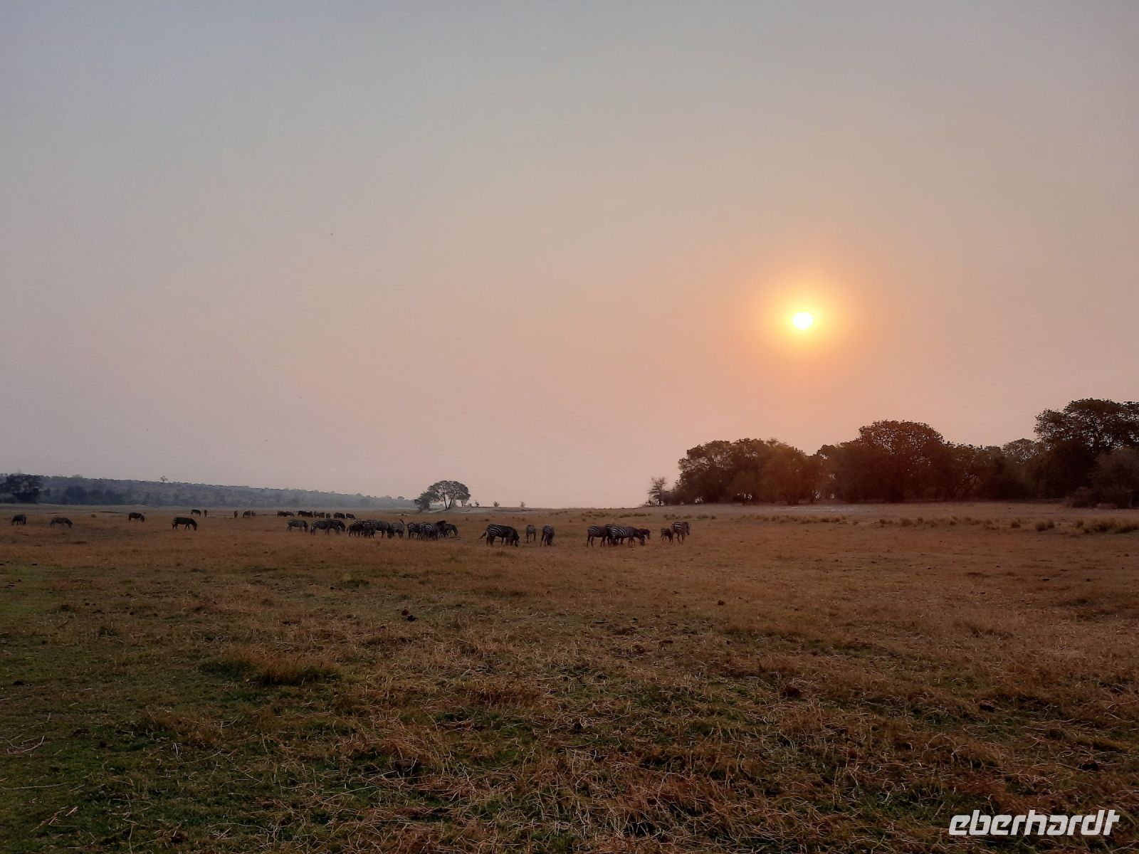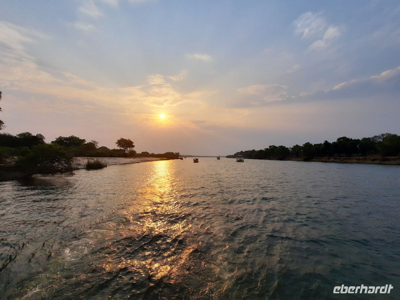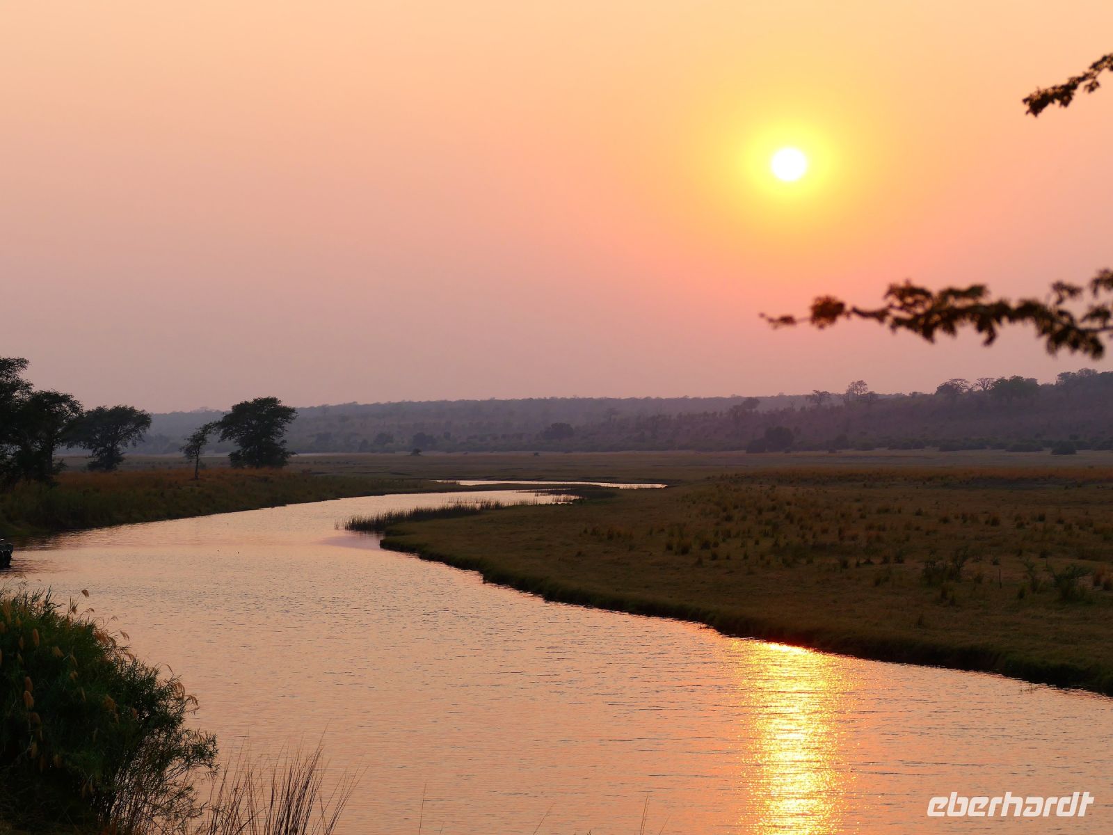 Die heißen Mittagsstunden verbrachten wir in unserer schönen Lodge und wurden mit einem leckeren Mittagslunch verwöhnt. Nach Kaffee und Kuchen starteten wir mit Rider und Roy zur nachmittäglichen Pirschfahrt und waren gespannt, was wir noch so alles vor die Linse bekommen würden. Mister Wasserbock begrüßte uns zuerst - die Hippos lagen noch faul im Wasser, auch die Krokodile hingen noch ab - später wurde es lebhafter und die Hippos begannen zu spielen, Buffalos kamen zum Fluss und auch wir wollten am Ufer den Sonnenuntergang geniessen. Doch halt, gerade waren Löwen am Flussufer, die nun im Gebüsch verschwanden.... Hier wollten wir aussteigen? Wir fuhren lieber ein kurzes Stück weiter und bauten dort die Sundowner-Bar auf. Pünktlich zum fantastischen Farbenspiel der untergehenden Sonne marschierten Elefanten zur Parade an. Darauf ein Gin Tonic! Zurück in der Lodge waren wir Ready for Dinner, was wieder super schmeckte und mit guten Wein begleitet wurde. Diesen schönen, tierreichen Tag beendeten wir mit einem Cocktail an der Bar, bevor wir zu unseren Zelten chauffiert wurden.