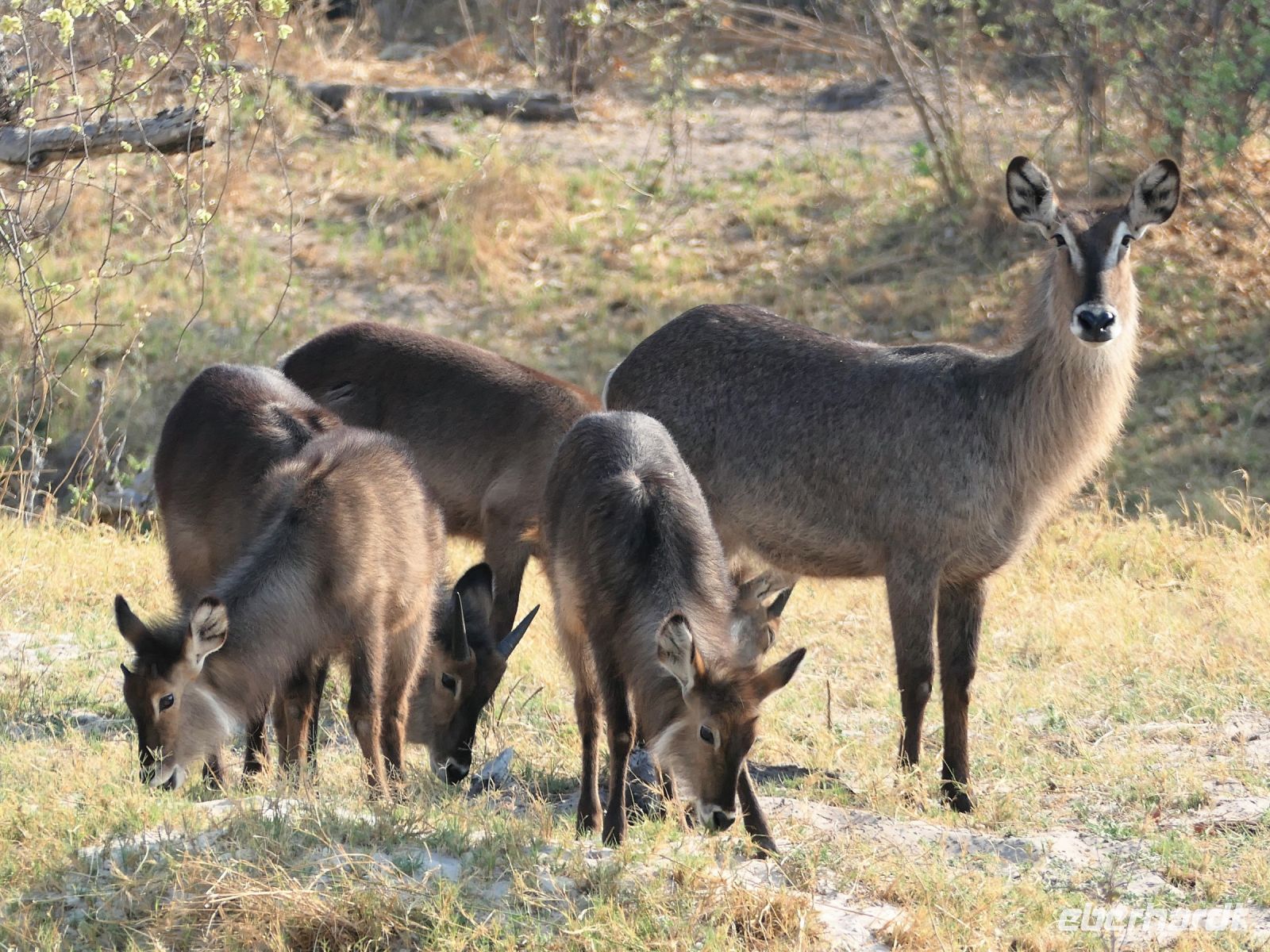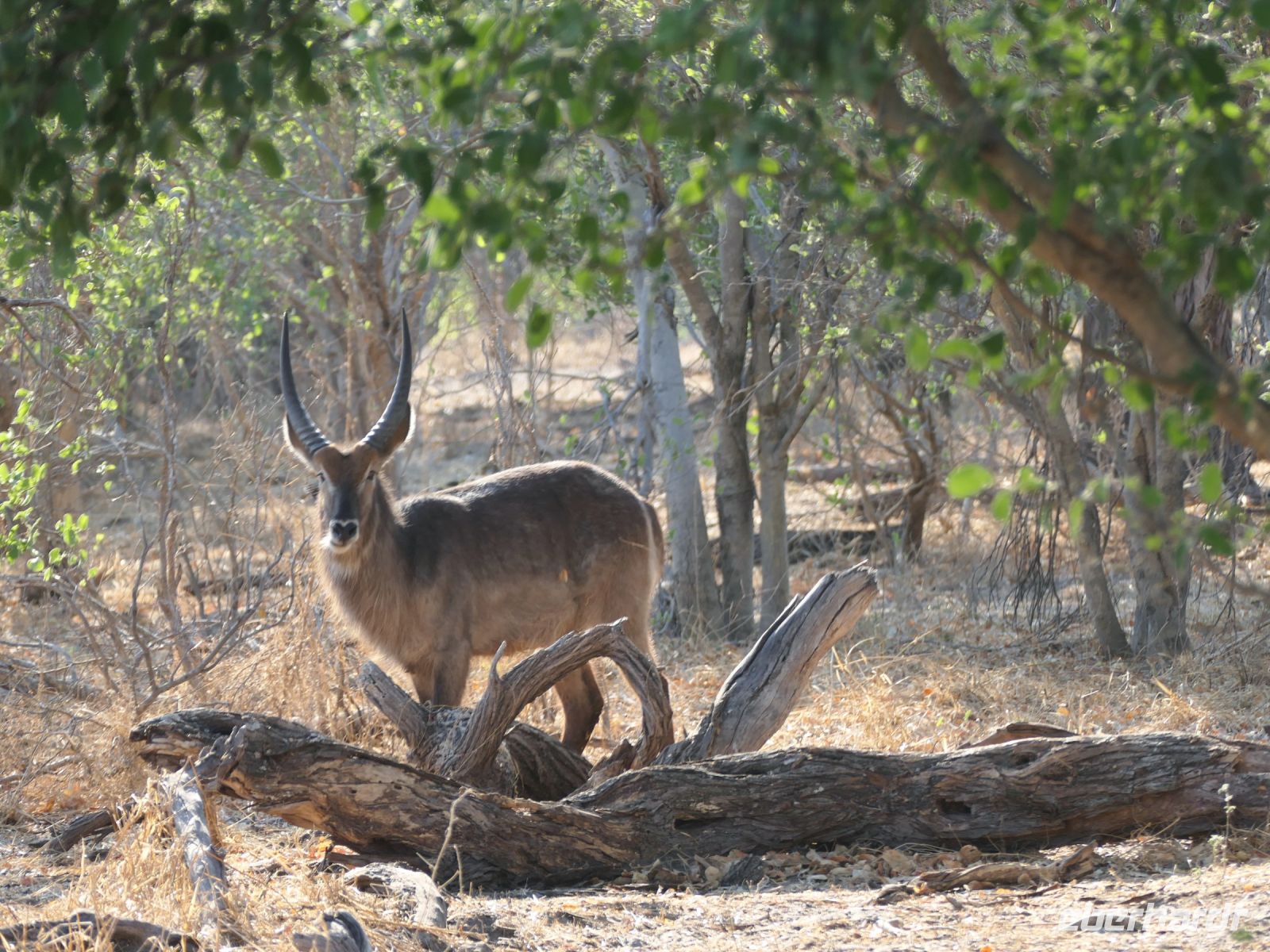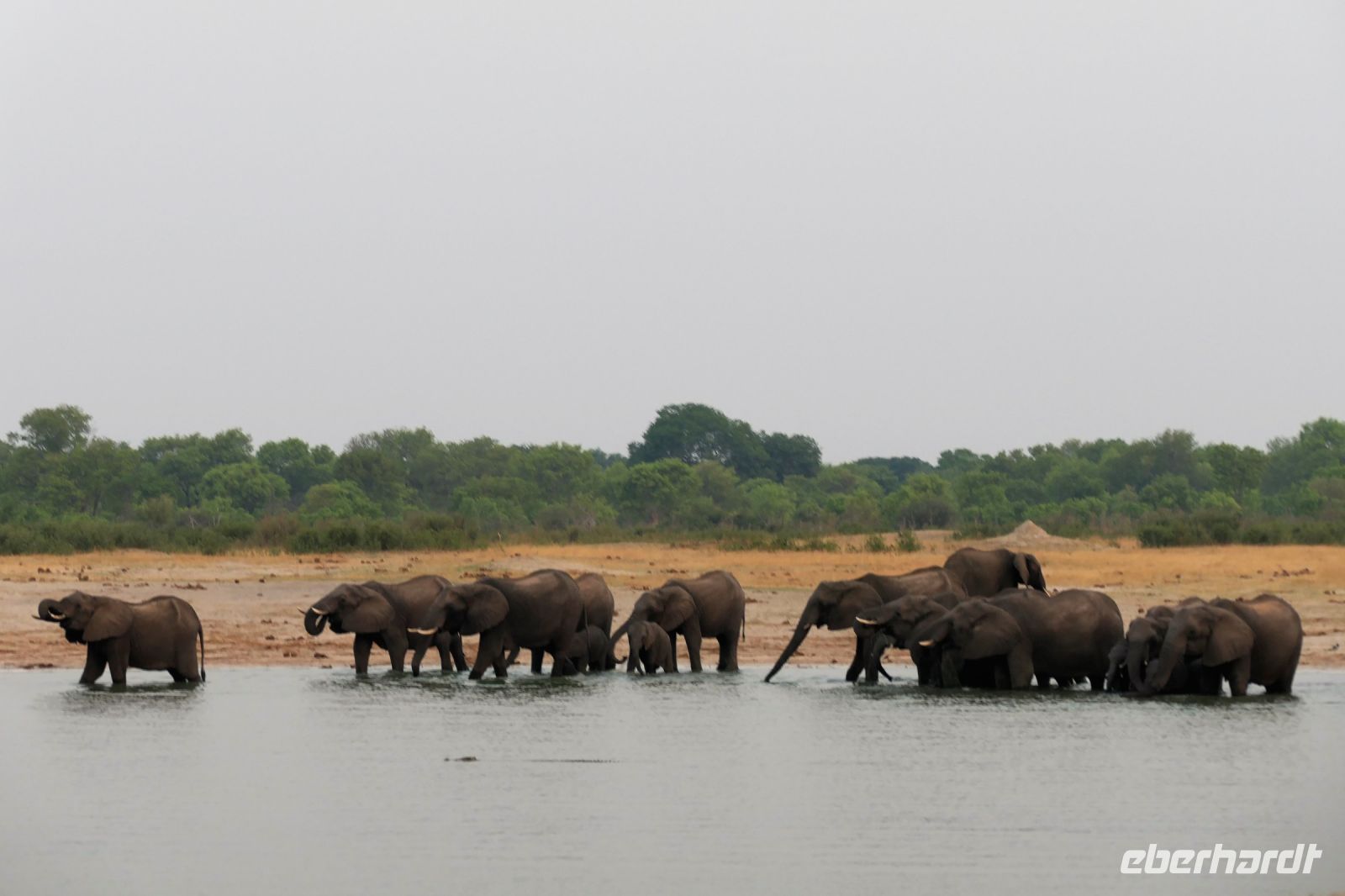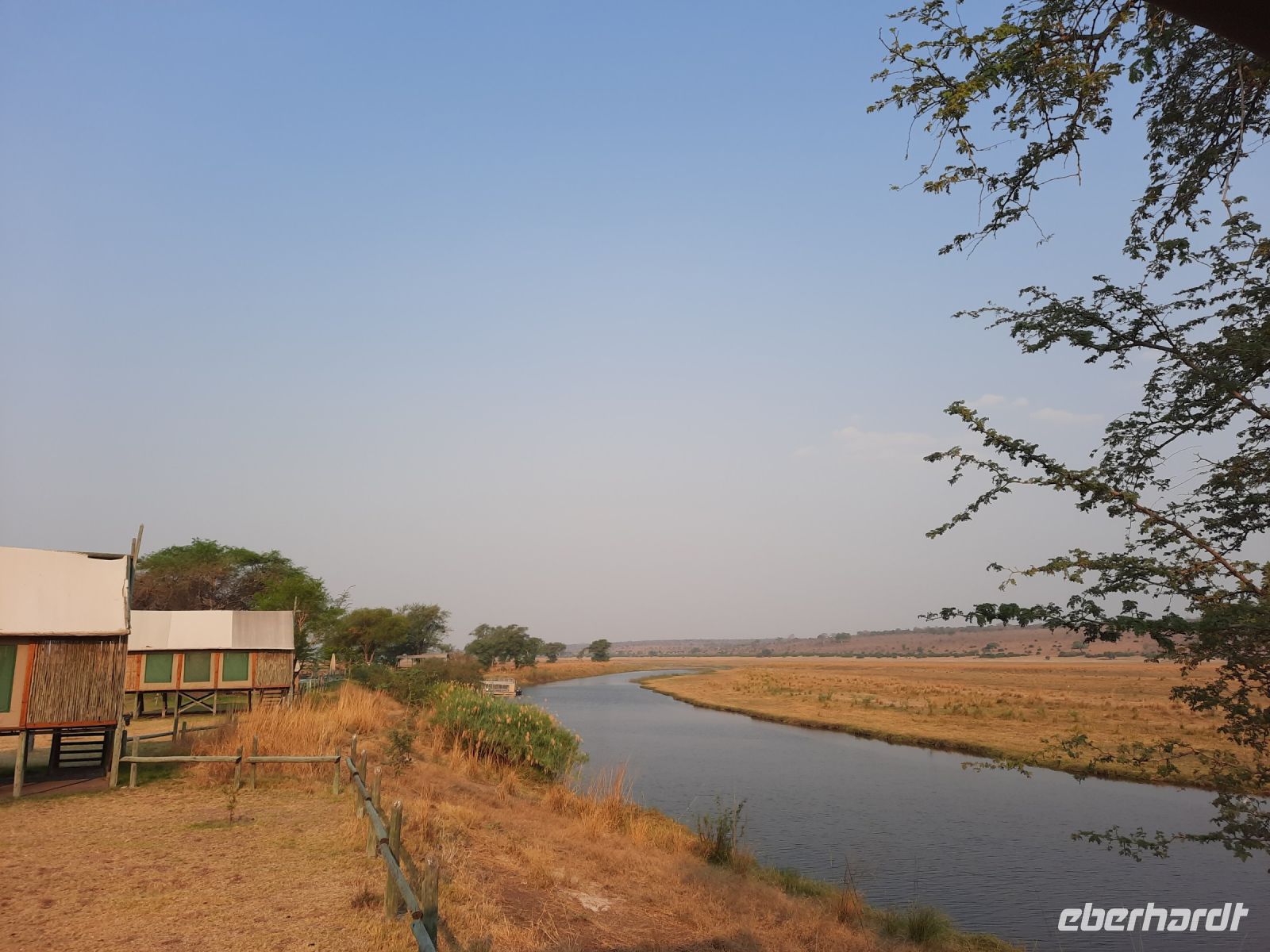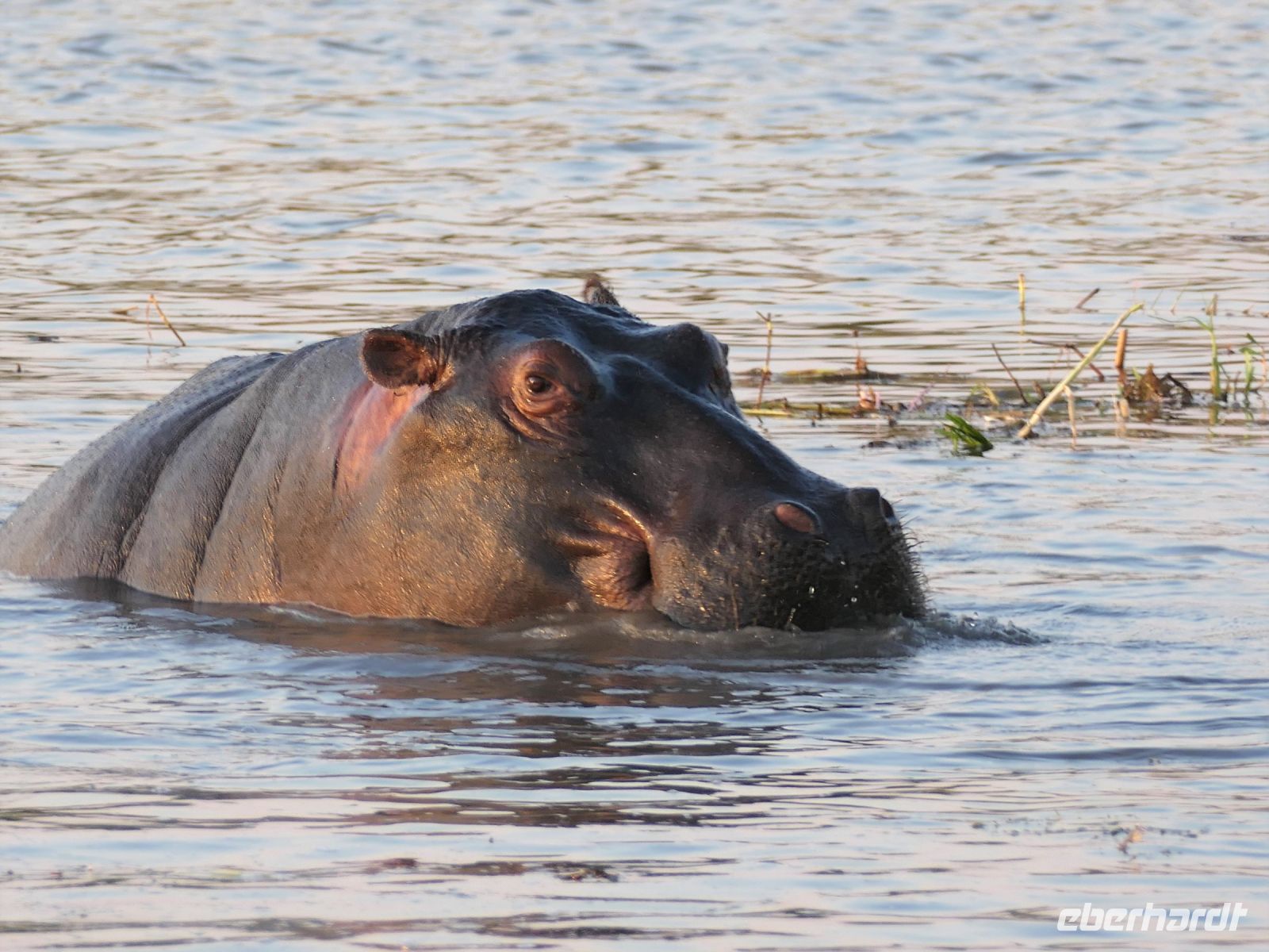 Die heißen Mittagsstunden verbrachten wir in unserer schönen Lodge und wurden mit einem leckeren Mittagslunch verwöhnt. Nach Kaffee und Kuchen starteten wir mit Rider und Roy zur nachmittäglichen Pirschfahrt und waren gespannt, was wir noch so alles vor die Linse bekommen würden. Mister Wasserbock begrüßte uns zuerst - die Hippos lagen noch faul im Wasser, auch die Krokodile hingen noch ab - später wurde es lebhafter und die Hippos begannen zu spielen, Buffalos kamen zum Fluss und auch wir wollten am Ufer den Sonnenuntergang geniessen. Doch halt, gerade waren Löwen am Flussufer, die nun im Gebüsch verschwanden.... Hier wollten wir aussteigen? Wir fuhren lieber ein kurzes Stück weiter und bauten dort die Sundowner-Bar auf. Pünktlich zum fantastischen Farbenspiel der untergehenden Sonne marschierten Elefanten zur Parade an. Darauf ein Gin Tonic! Zurück in der Lodge waren wir Ready for Dinner, was wieder super schmeckte und mit guten Wein begleitet wurde. Diesen schönen, tierreichen Tag beendeten wir mit einem Cocktail an der Bar, bevor wir zu unseren Zelten chauffiert wurden.