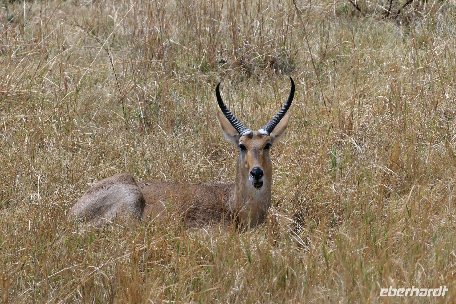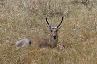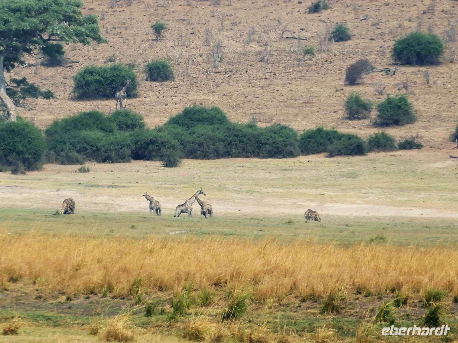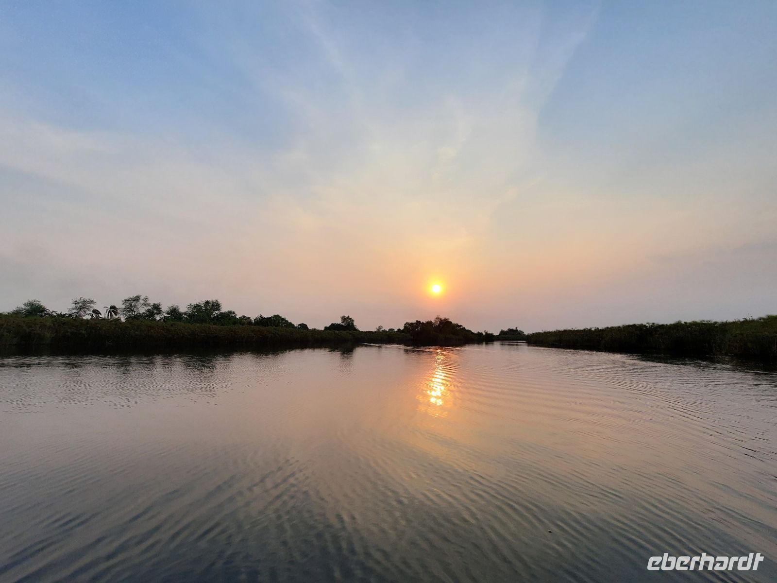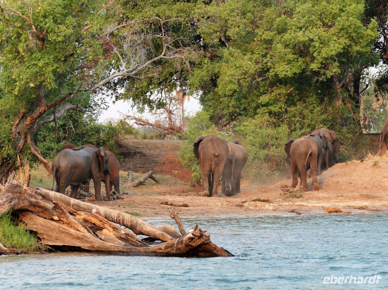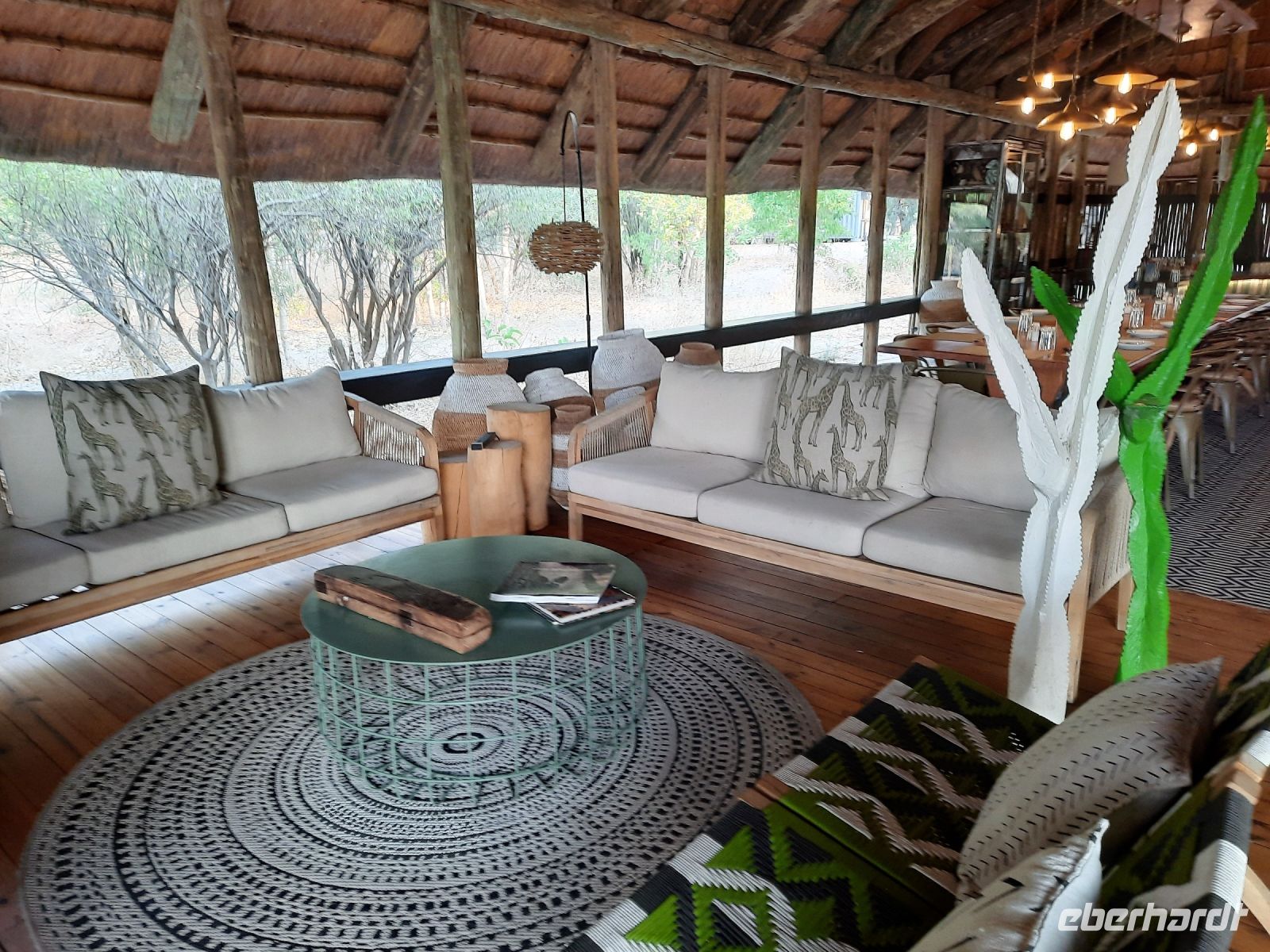 Die heißen Mittagsstunden verbrachten wir in unserer schönen Lodge und wurden mit einem leckeren Mittagslunch verwöhnt. Nach Kaffee und Kuchen starteten wir mit Rider und Roy zur nachmittäglichen Pirschfahrt und waren gespannt, was wir noch so alles vor die Linse bekommen würden. Mister Wasserbock begrüßte uns zuerst - die Hippos lagen noch faul im Wasser, auch die Krokodile hingen noch ab - später wurde es lebhafter und die Hippos begannen zu spielen, Buffalos kamen zum Fluss und auch wir wollten am Ufer den Sonnenuntergang geniessen. Doch halt, gerade waren Löwen am Flussufer, die nun im Gebüsch verschwanden.... Hier wollten wir aussteigen? Wir fuhren lieber ein kurzes Stück weiter und bauten dort die Sundowner-Bar auf. Pünktlich zum fantastischen Farbenspiel der untergehenden Sonne marschierten Elefanten zur Parade an. Darauf ein Gin Tonic! Zurück in der Lodge waren wir Ready for Dinner, was wieder super schmeckte und mit guten Wein begleitet wurde. Diesen schönen, tierreichen Tag beendeten wir mit einem Cocktail an der Bar, bevor wir zu unseren Zelten chauffiert wurden.