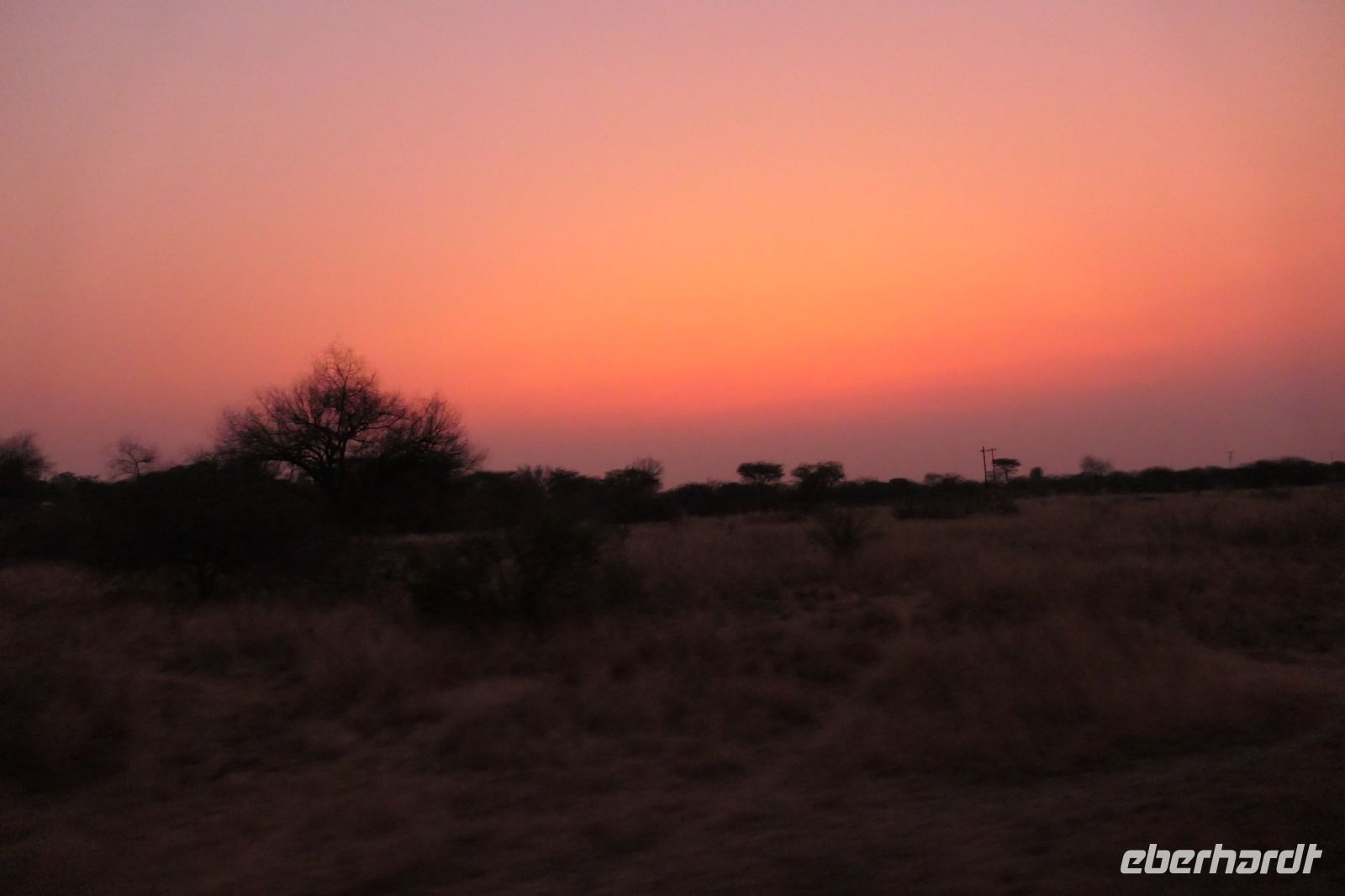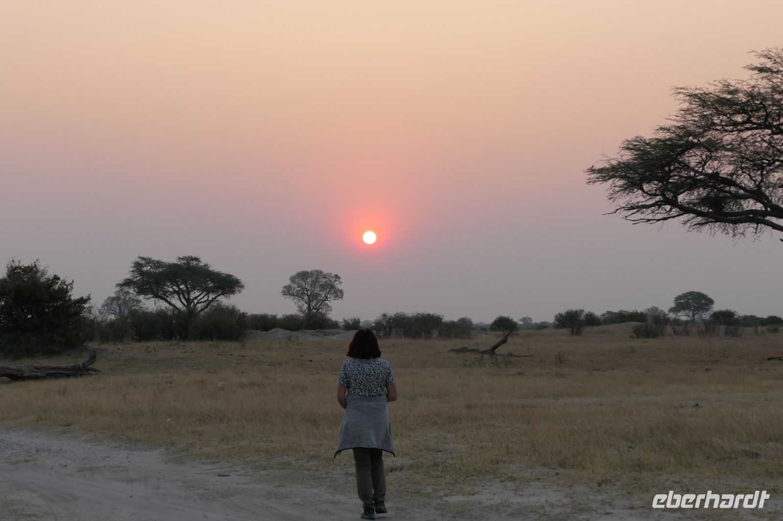 Diesen Tag begannen wir mit südafrikanischer Gelassenheit und mit einem Bingo-Spiel bei der Bestellung diverser Eierspeisen beim Frühstück. Danach starteten wir zu neuen Abenteuern. Unser Ziel war Maun, das Tor zum Okavango Delta. Die schlechte Teerstraße führte uns am Ort Gweta vorbei. Der Name des Ortes stammt aus der Sprache der San und bedeutet so viel wie "wo die großen Frösche quaken". Früher war das ein sehr feuchtes Gebiet, heute nur in der Regen- und Flugzeit, sonst absolut trocken und dürr. Rechts neben der Straße verlief die Wasserpipeline mit Pumpstationen, die die Dörfer in der Gegend mit Wasserversorgt. Elefanten haben ein unglaubliches Gespür, Wasseradern in der trockenen Saison zu finden. So sahen wir immer wieder Elefanten, die die Betonplatten der Stationen einfach aufgebrochen haben und an das frische Wasser zu kommen. Die Straße war eben gesäumt von Elefanten-Bars. Die Strecke führte direkt durch das ebene Salzpfannengebiet, eine trockene Landschaft und flach wie weine Flunder. Strauße, Zebras und Eselkarren waren ebenso unterwegs wie wir. Auch sichteten wir Steinböckchen und einen Raubadler in nächster Nähe. Erstaunlich viele Pferde waren zu sehen. Die werden hauptsächlich für den Nahverkehr und als Transportmittel genutzt und manchmal auch in der Küche. Auch sichteten wir einen riesigen Ameisenbär, allerdings war dieser steinhart. Am frühen Nachmittag waren wir in Maun und kurze Zeit später in der komfortablen Thamalakane Lodge, welche am Ufer des gleichnamigen Flusses liegt. Entspannung war angesagt. Ob beim Käffchen oder kühlem Bier auf der schattigen Terrasse mit Blick auf den Fluss oder bei der Erkundung des Gartens, wo viele Vögel in den Bäumen zu beobachten waren. Für einige Gäste stand heut noch ein besonderes Highlight auf dem Programm: Ein Flug über das Okavango Delta. Wie mir die Gäste nachher berichteten, konnten sie große Herden von Elefanten und Hippos von oben sehen. Am Abend erwartete uns ein leckeres 3-Gänge-Menü mit perfekten Sonnenuntergang.