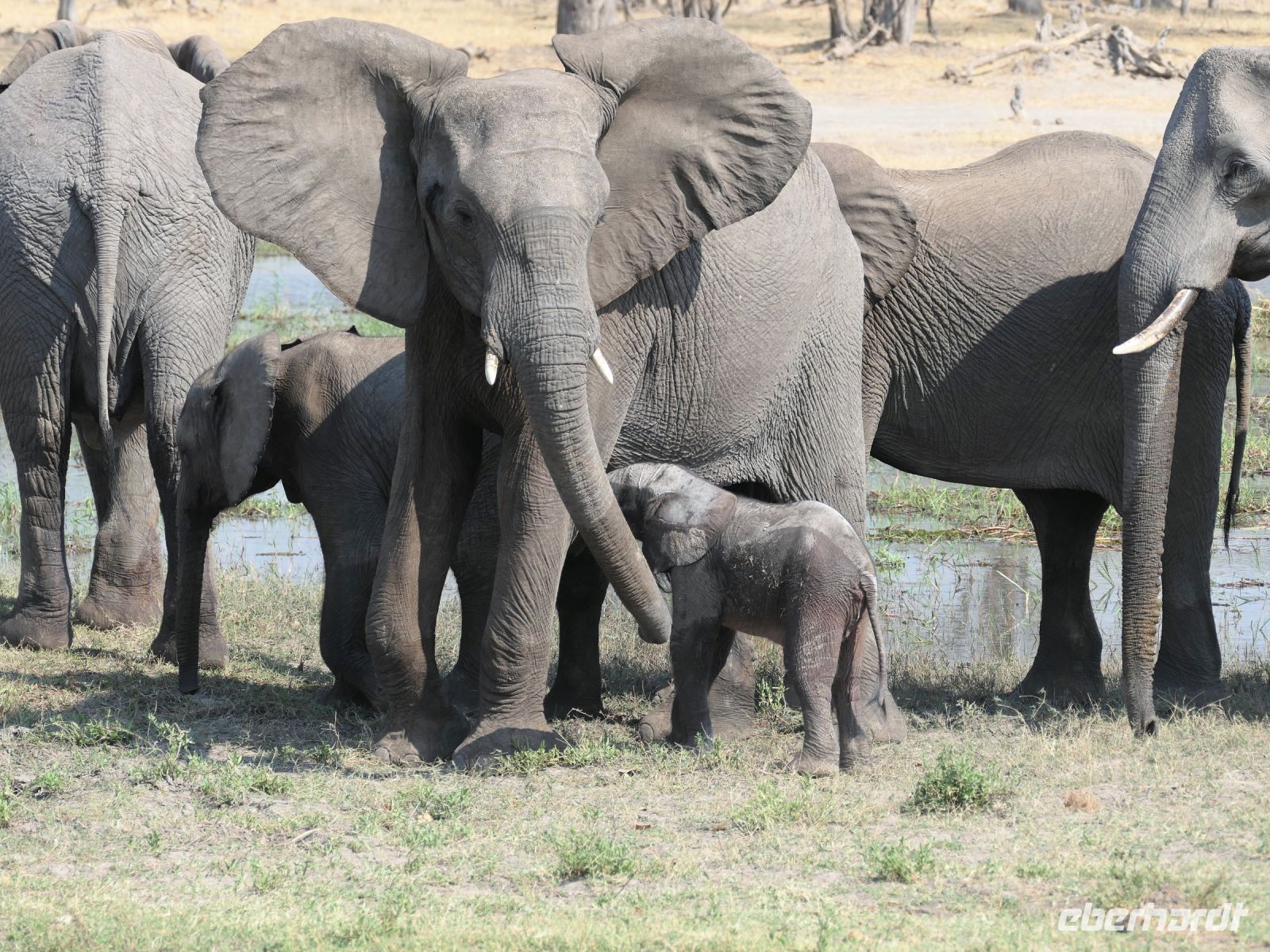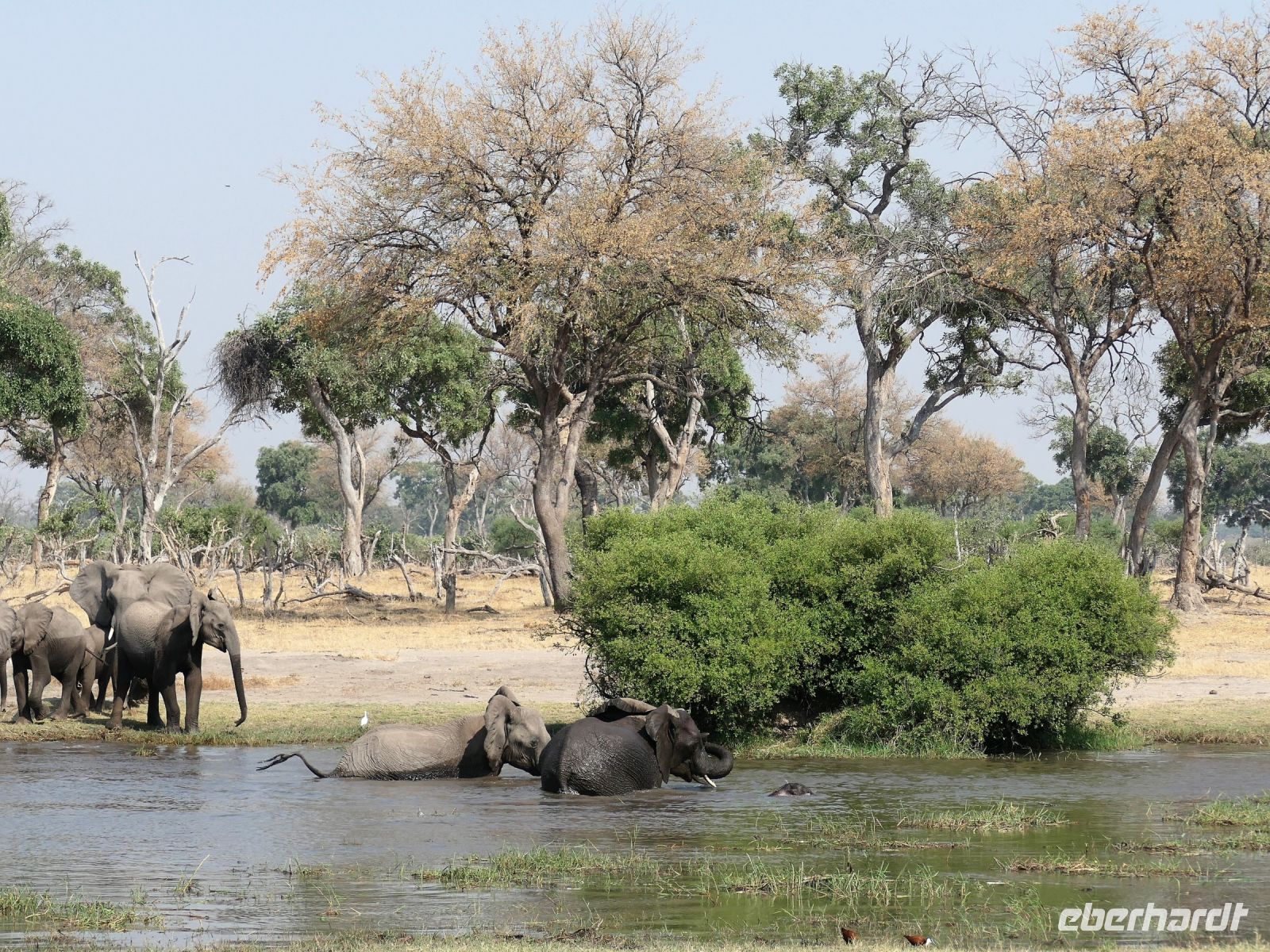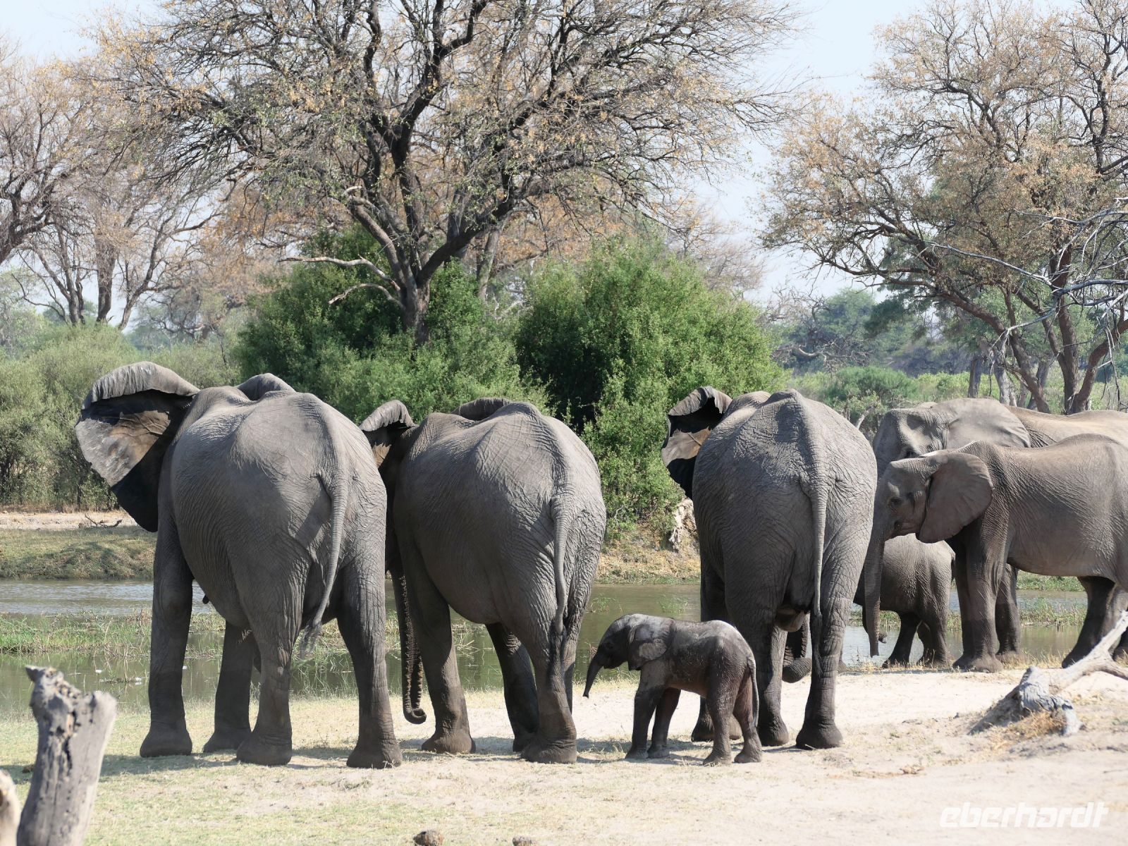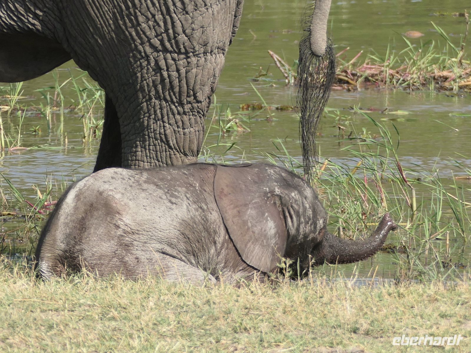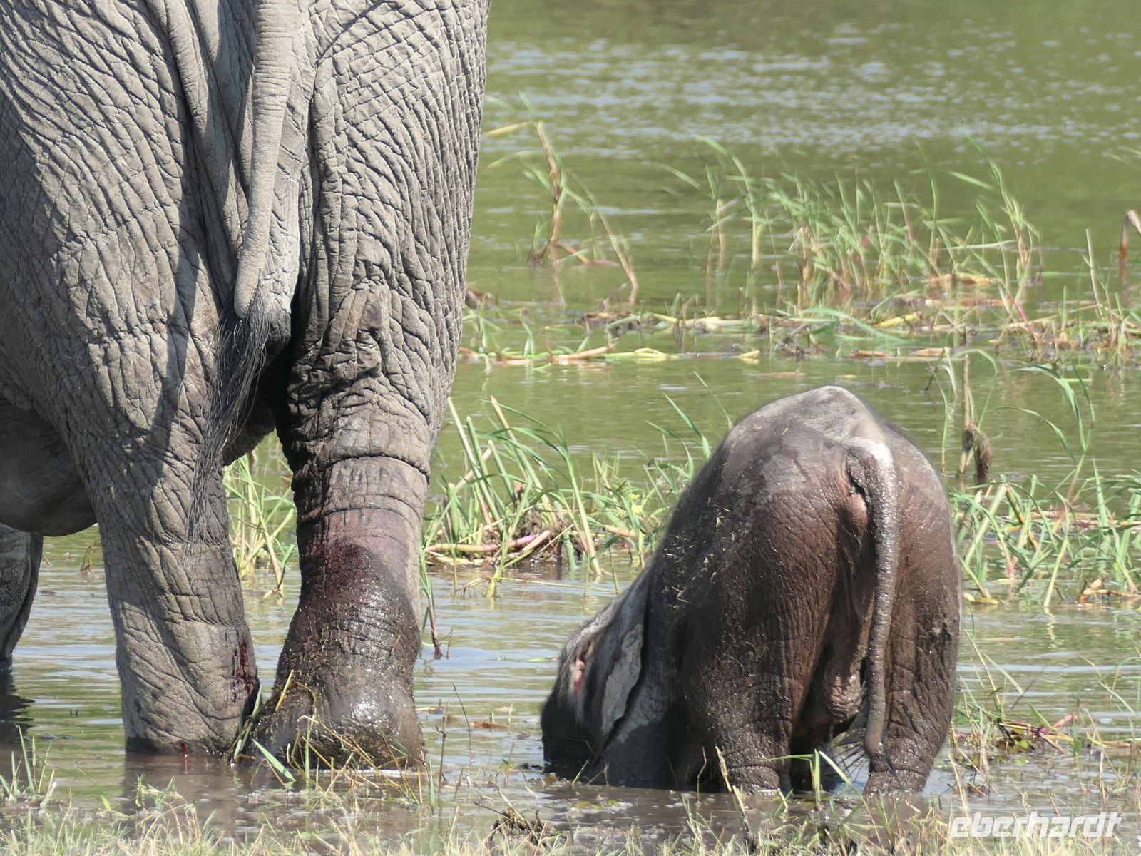 Alle freuen sich heute auf einen entspannten , spannenden und tierreichen Tag in unserer schönen Lodge im Khwai-Konzessionsgebiet. Zwar werden wir heut auch wieder zeitig geweckt und später zum Early Morning Frühstück in den Main Bereich chauffiert. Gut gestärkt starten wir mit unseren Rangern Rider und Roy in2 Jeeps zur morgendlichen Pirschfahrt. Die Sonne erwacht langsam und wir durchstreifen den Busch entlang des Flusses, der zwar wenig, aber dennoch genügend Wasser führt. Eine herrliche, abwechslungsreiche und grüne Landschaft. In den Lagunen blühten die weißen Tages-Wasserlilien, Hippos an Land und zu Wasser, ein Steppenadler spähte sein Frühstück aus, eine Riesentrappe (größter flugfähiger Vogel) nahm Anlauf und erhob sich in die Lüfte. In dieser traumhaften Umgebung schlürften wir einen zweiten Kaffee und naschten ein paar Cookies. Später schummelte sich noch ein Raubadler (Tawny Eagle) und ein Sattelstorch in diese Filmkulisse. Ein Graufischer saß etwas zerzaust auf einen Ast, kleine Braunkopfpapageien pickten ihr Frühstück auf dem sandigen Boden. Stolz präsentierten sich ein Schreiseeadler (Fish Eagle) und ein Schlangenhalsvogel. Im Wasser ist der Schlangenhalsvogel mit seinem gesamten Körper unter Wasser und bewegt sich, nur sein Hals und der Kopf schauen heraus. Das sieht aus wie eine Wasserschlange, daher auch der Name. Im Busch viele Impalas, Familie Wasserbock mit flauschigen Kids war auch unterwegs. Am anderen Ufer des Khwais sahen wir noch einen erschöpften und verletzten Junglöwen. Wie die Rangern erzählten, hatte eine Löwen Mama mit kleinen Kids den Junglöwen in seine Schranken gewiesen. Noch war unsere morgendliche Pirschfahrt nicht zu Ende. Wir fuhren noch einmal zur Flussbiegung, wo es ein größeres Elefanten-Meeting gab. Besonders niedliche war der max. 2 Monate alte Babyfant, der seiner mama nicht von der Seite wich und sich immer bei ihr mit Mama-Milch stärken musste. Babyfanten müssen erst lernen, mit ihrem Rüssel umzugehen und mit ihm Wasser aufzunehmen. Der Kleine konnte es noch nicht, sondern ging auf die Knie und schlürfte genüsslich das frische Nass - einfach zuckersüss. Die anderen Familienmitglieder mit den größeren Babyfanten hatten bereits den Fluss durchquert und warteten auf der anderen Seite auf die beiden. Mama Elefant ging und schubste ihren Sprössling immer nach oben. Der Kleine hielt sich tapfer, manchmal war nur der winzige Rüssel aus dem Wasser zu sehen. An der Biegung war die Strömung im Wasser etwas stark und plötzlich trieb Babyfant ab. Aber schnell kamen die Tanten ins Wasser zu Hilfe und brachten Mama und Babyfant sicher an Land. Elefanten sind sehr soziale Tiere und helfen untereinander - beeindruckend zu sehen.