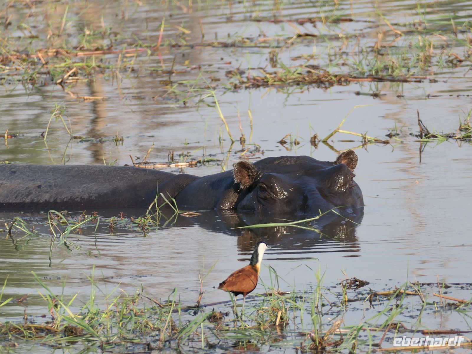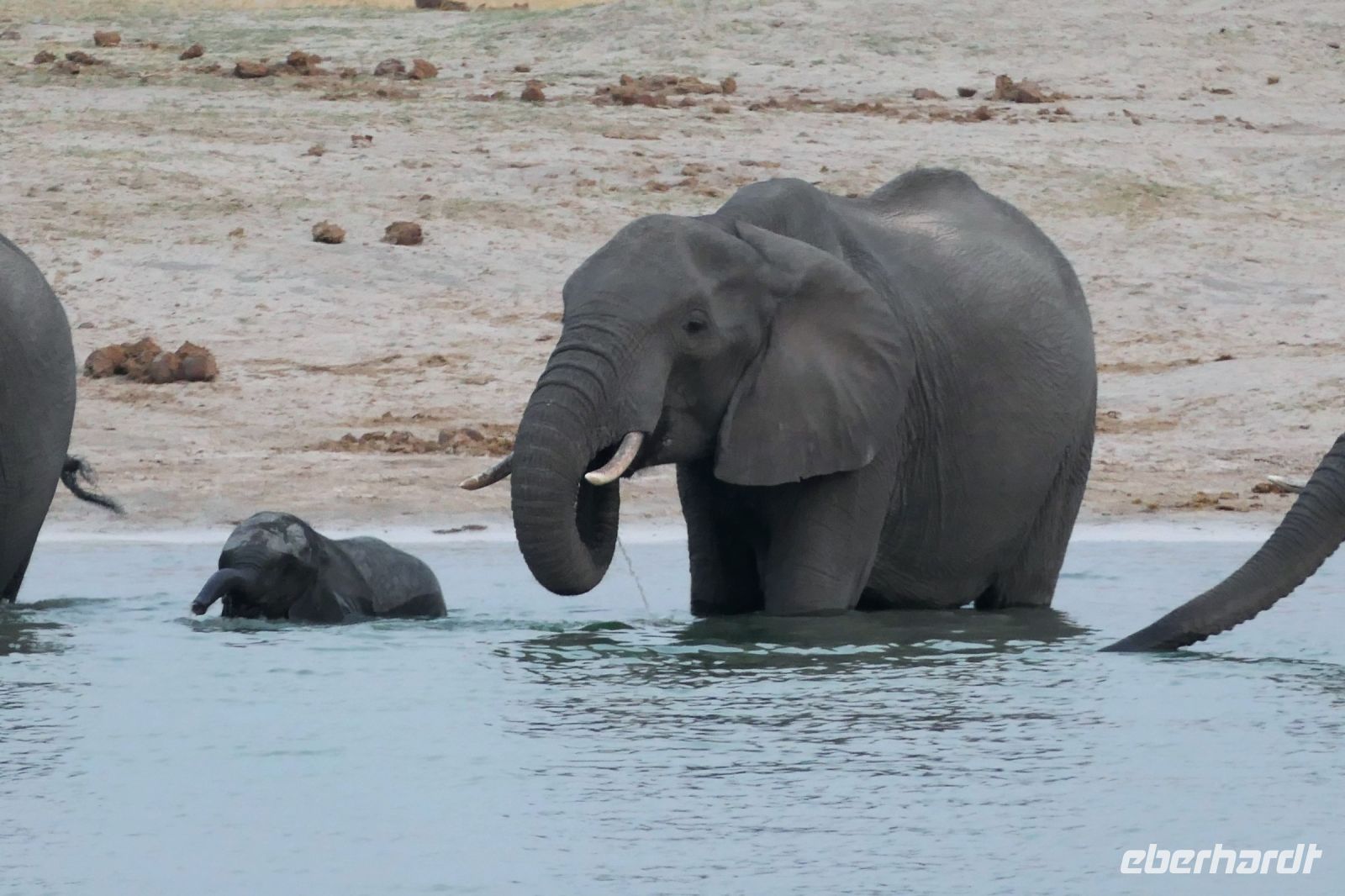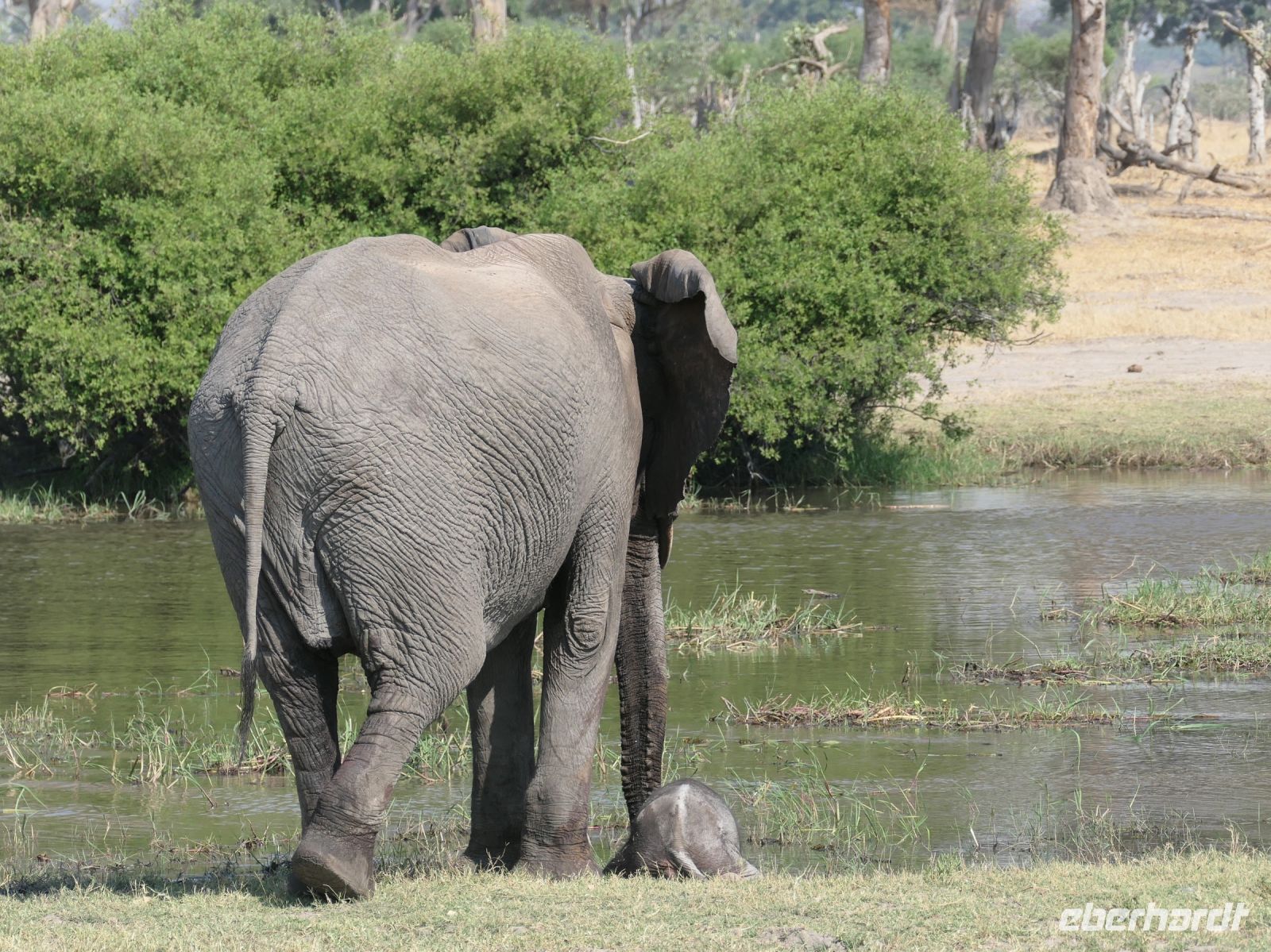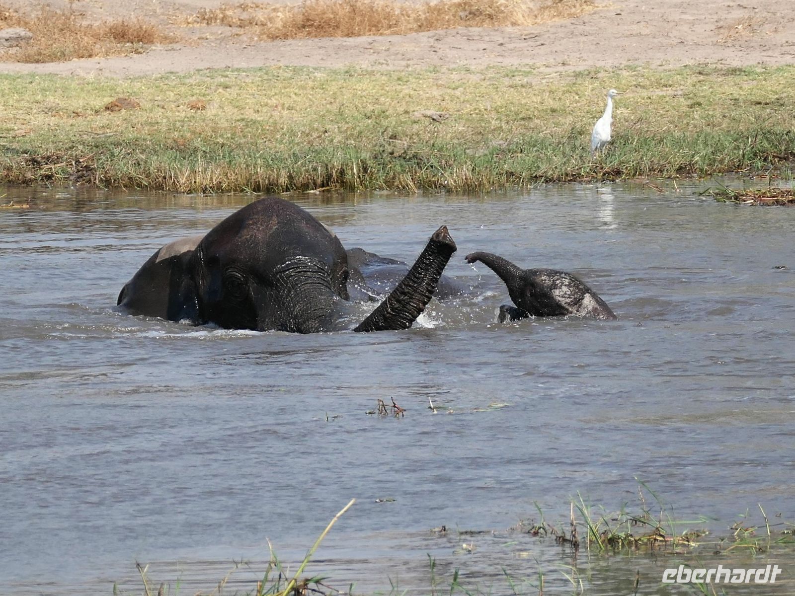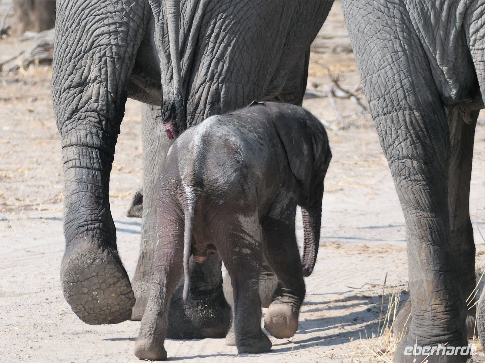 Alle freuen sich heute auf einen entspannten , spannenden und tierreichen Tag in unserer schönen Lodge im Khwai-Konzessionsgebiet. Zwar werden wir heut auch wieder zeitig geweckt und später zum Early Morning Frühstück in den Main Bereich chauffiert. Gut gestärkt starten wir mit unseren Rangern Rider und Roy in2 Jeeps zur morgendlichen Pirschfahrt. Die Sonne erwacht langsam und wir durchstreifen den Busch entlang des Flusses, der zwar wenig, aber dennoch genügend Wasser führt. Eine herrliche, abwechslungsreiche und grüne Landschaft. In den Lagunen blühten die weißen Tages-Wasserlilien, Hippos an Land und zu Wasser, ein Steppenadler spähte sein Frühstück aus, eine Riesentrappe (größter flugfähiger Vogel) nahm Anlauf und erhob sich in die Lüfte. In dieser traumhaften Umgebung schlürften wir einen zweiten Kaffee und naschten ein paar Cookies. Später schummelte sich noch ein Raubadler (Tawny Eagle) und ein Sattelstorch in diese Filmkulisse. Ein Graufischer saß etwas zerzaust auf einen Ast, kleine Braunkopfpapageien pickten ihr Frühstück auf dem sandigen Boden. Stolz präsentierten sich ein Schreiseeadler (Fish Eagle) und ein Schlangenhalsvogel. Im Wasser ist der Schlangenhalsvogel mit seinem gesamten Körper unter Wasser und bewegt sich, nur sein Hals und der Kopf schauen heraus. Das sieht aus wie eine Wasserschlange, daher auch der Name. Im Busch viele Impalas, Familie Wasserbock mit flauschigen Kids war auch unterwegs. Am anderen Ufer des Khwais sahen wir noch einen erschöpften und verletzten Junglöwen. Wie die Rangern erzählten, hatte eine Löwen Mama mit kleinen Kids den Junglöwen in seine Schranken gewiesen. Noch war unsere morgendliche Pirschfahrt nicht zu Ende. Wir fuhren noch einmal zur Flussbiegung, wo es ein größeres Elefanten-Meeting gab. Besonders niedliche war der max. 2 Monate alte Babyfant, der seiner mama nicht von der Seite wich und sich immer bei ihr mit Mama-Milch stärken musste. Babyfanten müssen erst lernen, mit ihrem Rüssel umzugehen und mit ihm Wasser aufzunehmen. Der Kleine konnte es noch nicht, sondern ging auf die Knie und schlürfte genüsslich das frische Nass - einfach zuckersüss. Die anderen Familienmitglieder mit den größeren Babyfanten hatten bereits den Fluss durchquert und warteten auf der anderen Seite auf die beiden. Mama Elefant ging und schubste ihren Sprössling immer nach oben. Der Kleine hielt sich tapfer, manchmal war nur der winzige Rüssel aus dem Wasser zu sehen. An der Biegung war die Strömung im Wasser etwas stark und plötzlich trieb Babyfant ab. Aber schnell kamen die Tanten ins Wasser zu Hilfe und brachten Mama und Babyfant sicher an Land. Elefanten sind sehr soziale Tiere und helfen untereinander - beeindruckend zu sehen.