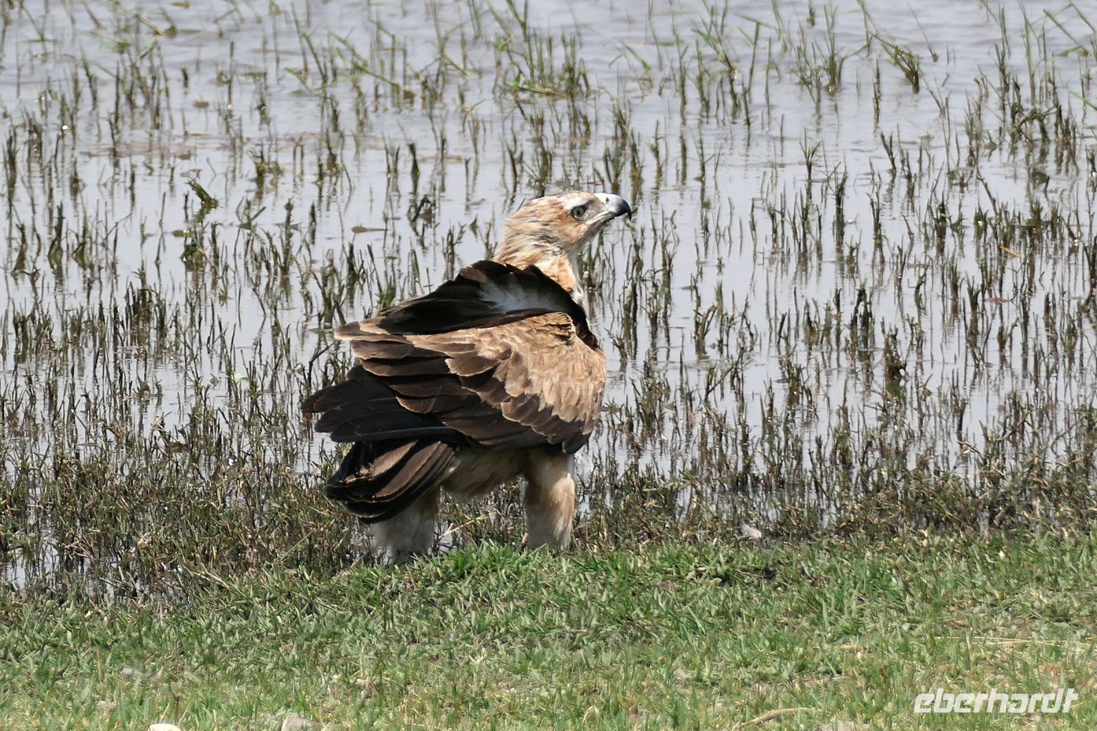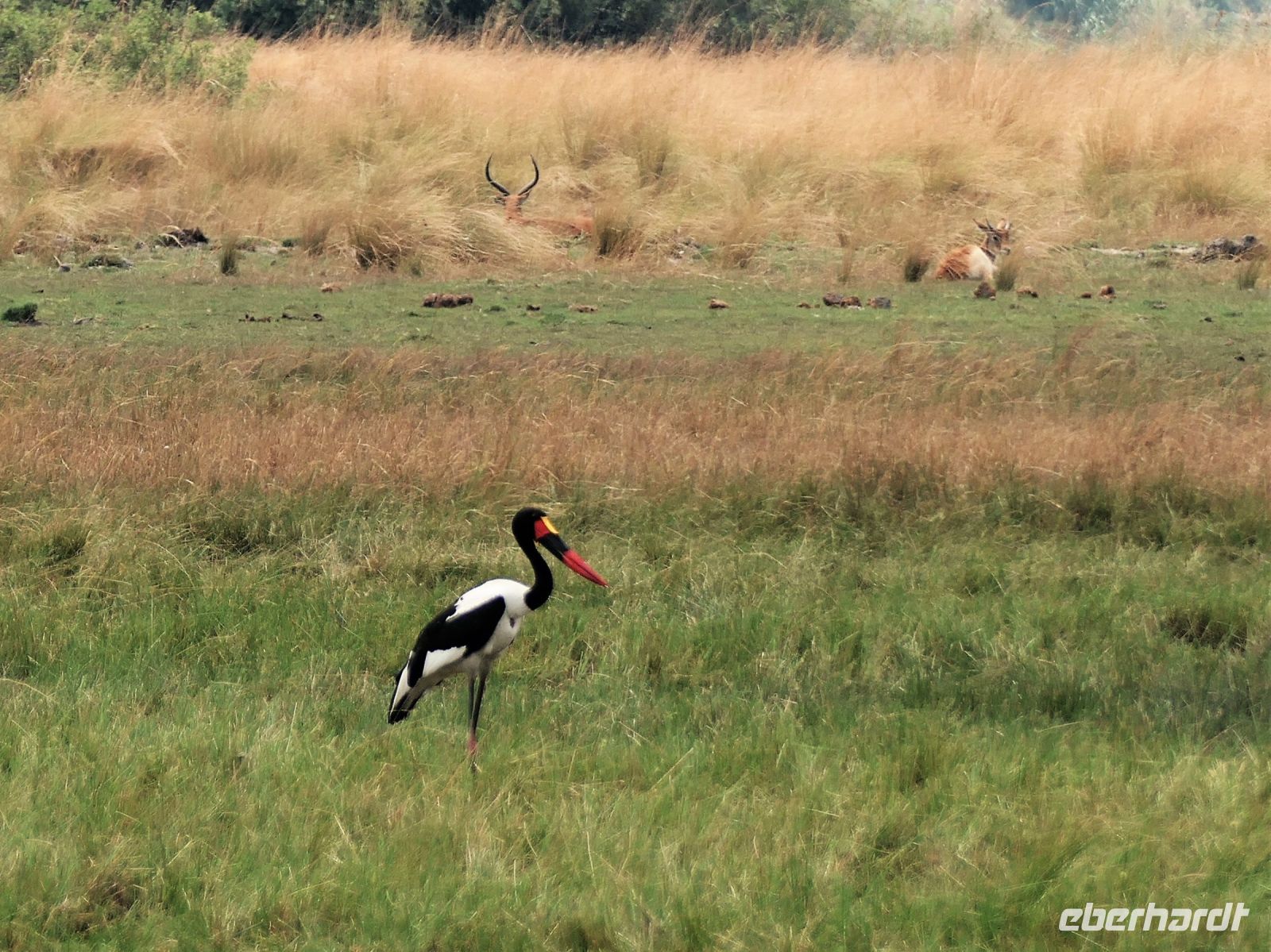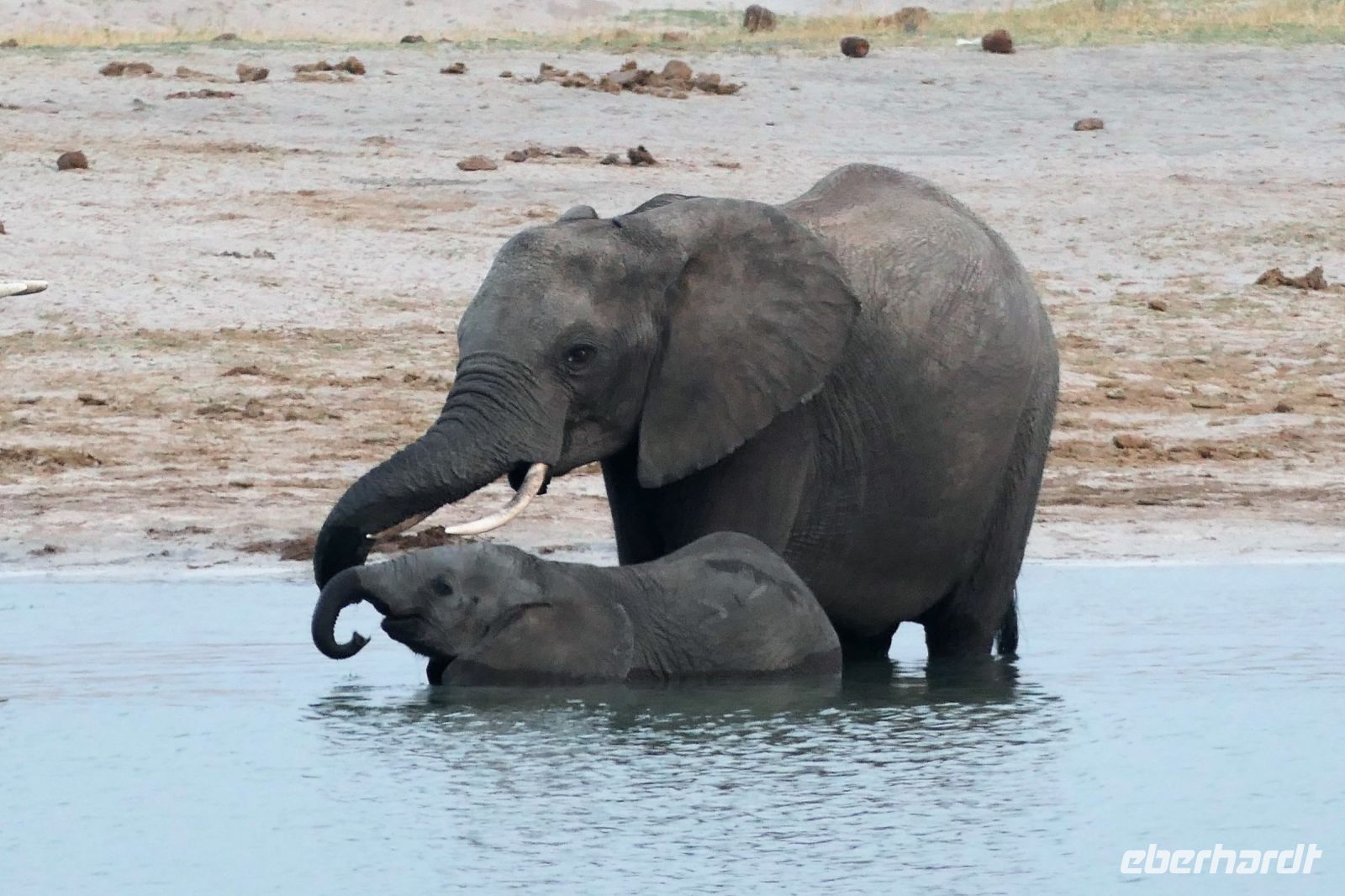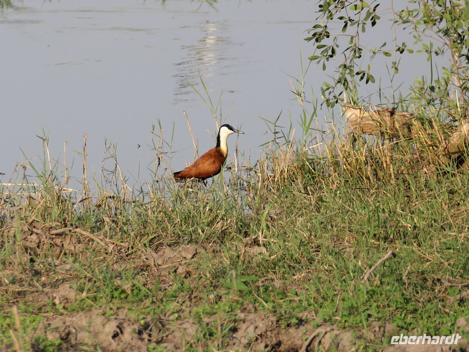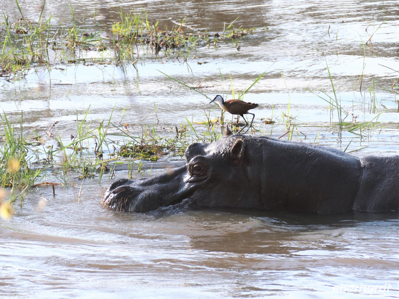 Alle freuen sich heute auf einen entspannten , spannenden und tierreichen Tag in unserer schönen Lodge im Khwai-Konzessionsgebiet. Zwar werden wir heut auch wieder zeitig geweckt und später zum Early Morning Frühstück in den Main Bereich chauffiert. Gut gestärkt starten wir mit unseren Rangern Rider und Roy in2 Jeeps zur morgendlichen Pirschfahrt. Die Sonne erwacht langsam und wir durchstreifen den Busch entlang des Flusses, der zwar wenig, aber dennoch genügend Wasser führt. Eine herrliche, abwechslungsreiche und grüne Landschaft. In den Lagunen blühten die weißen Tages-Wasserlilien, Hippos an Land und zu Wasser, ein Steppenadler spähte sein Frühstück aus, eine Riesentrappe (größter flugfähiger Vogel) nahm Anlauf und erhob sich in die Lüfte. In dieser traumhaften Umgebung schlürften wir einen zweiten Kaffee und naschten ein paar Cookies. Später schummelte sich noch ein Raubadler (Tawny Eagle) und ein Sattelstorch in diese Filmkulisse. Ein Graufischer saß etwas zerzaust auf einen Ast, kleine Braunkopfpapageien pickten ihr Frühstück auf dem sandigen Boden. Stolz präsentierten sich ein Schreiseeadler (Fish Eagle) und ein Schlangenhalsvogel. Im Wasser ist der Schlangenhalsvogel mit seinem gesamten Körper unter Wasser und bewegt sich, nur sein Hals und der Kopf schauen heraus. Das sieht aus wie eine Wasserschlange, daher auch der Name. Im Busch viele Impalas, Familie Wasserbock mit flauschigen Kids war auch unterwegs. Am anderen Ufer des Khwais sahen wir noch einen erschöpften und verletzten Junglöwen. Wie die Rangern erzählten, hatte eine Löwen Mama mit kleinen Kids den Junglöwen in seine Schranken gewiesen. Noch war unsere morgendliche Pirschfahrt nicht zu Ende. Wir fuhren noch einmal zur Flussbiegung, wo es ein größeres Elefanten-Meeting gab. Besonders niedliche war der max. 2 Monate alte Babyfant, der seiner mama nicht von der Seite wich und sich immer bei ihr mit Mama-Milch stärken musste. Babyfanten müssen erst lernen, mit ihrem Rüssel umzugehen und mit ihm Wasser aufzunehmen. Der Kleine konnte es noch nicht, sondern ging auf die Knie und schlürfte genüsslich das frische Nass - einfach zuckersüss. Die anderen Familienmitglieder mit den größeren Babyfanten hatten bereits den Fluss durchquert und warteten auf der anderen Seite auf die beiden. Mama Elefant ging und schubste ihren Sprössling immer nach oben. Der Kleine hielt sich tapfer, manchmal war nur der winzige Rüssel aus dem Wasser zu sehen. An der Biegung war die Strömung im Wasser etwas stark und plötzlich trieb Babyfant ab. Aber schnell kamen die Tanten ins Wasser zu Hilfe und brachten Mama und Babyfant sicher an Land. Elefanten sind sehr soziale Tiere und helfen untereinander - beeindruckend zu sehen.