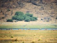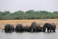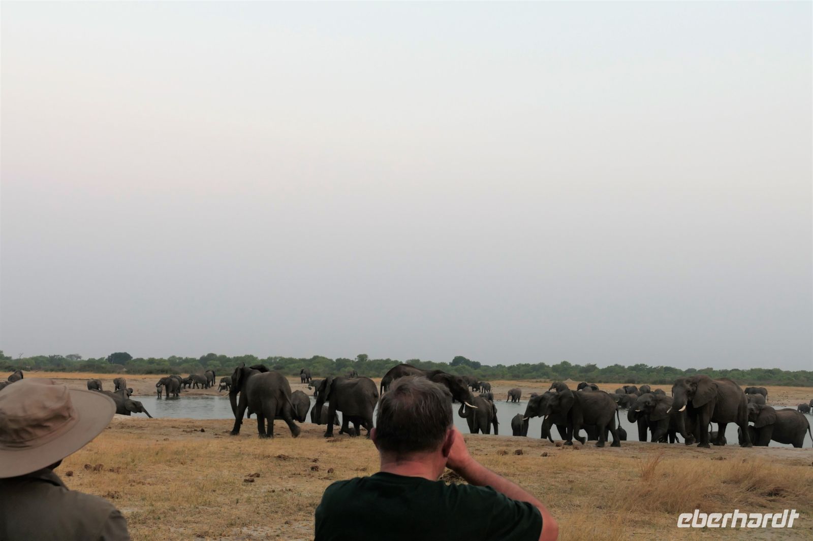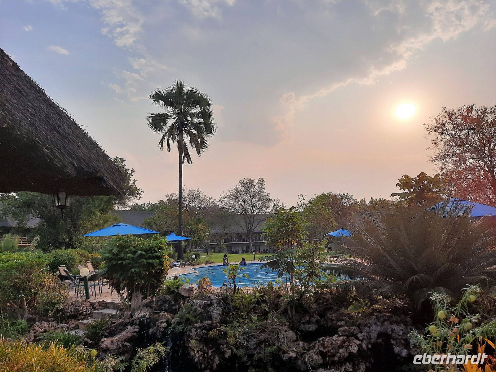 Kurz vor Sonnenaufgang trafen wir uns an der Rezeption, wo wir uns mit Kaffee, Tee und Cockies versorgten. In 2 offenen Jeeps und unseren Fahrern Lazarus und Blazzey starteten wir zur ersten Pirschfahrt in den Hwange Nationalpark. Bis zum Eingang sichteten wir schon reichlich Tiere wie Impales, Kudus und Giraffen. Am Parkeingang mussten sich alle noch kurz im "Gästebuch" persönlich registrieren und später öffnete sich die Schranke zur Wildnis. Die Landschaft im Hwange NP ist abwechslungsreich und sehr ursprünglich, auch nicht so überlaufen wie der Kruger NP in Südafrika. Obwohl es sehr trocken war, bekamen wir viel zu sehen: zahlreiche Antilopenarten, Giraffen, Wasserböcke, Zebras, Paviane und Meerkatzen sowie die bunte Gabelracke und die frechen Tokos (Flying Banana). An den Wasserlöchern beobachteten wir ein faules Krokodil und Flusspferde, die sich schon in kühlende Nass zurück gezogen hatten. Unser Fahrer entdeckte frische Spuren von Löwen mit Babies, die sich aber im Busch verliefen. Doch kurze Zeit später das Highlight: ein stattlicher Gepard aus nächster Nähe, der uns ein perfektes Fotoshooting präsentierte. Nach so viel Glück kehrten wir zur Lodge zurück und wurden von zahlreichen Elefanten begrüßt. Danach stürmten das Frühstücksbuffet und anschließend war relaxen angesagt. Dazu lief der Kino-Film: Elefanten live am Wasserloch, später gesellten sich auch 3 Hornraben dazu. Zum Mittag trafen wir beim ausgiebigen Lunch wieder. Al gusto konnte sich jeder seinen Mittagssnack aus dem a la carte Menü aussuchen, die Portionen waren mächtig. Am frühen Nachmittag ging es erneut auf Pirsch. Wir stellten fest, dass die Tiere viel aktiver waren als am Morgen. Diesmal hatten wir Glück und sichteten das Löwenrudel. Die Damen entspannten im Gras und Pascha Löwe kam später unter seinem Ruhebusch hervor, um nach dem rechten zu sehen. Nur der Nachwuchs war gut versteckt. Am großen Wasserloch war auch jede Menge Betrieb: zahlreiche Elefantenherden hatten Durst. Doch die Elefantenshow ließen wir kurz links liegen und brausten zurück. Der andere Jeep hatte unseren bereits bekannten Gepard beim Riss eines Impalas gesichtet, WOW. Zurück am großen Wasserloch gab es pünktlich zum Sundowner ein riesiges Elefantentreffen, geschätzt ca. 500 bis 600. Von allen Seiten kamen große und kleine Elefantenherden, so dass der Platz am Wasser eng wurde. Keine 30 m von uns entfernt, liefen die grauen Riesen an uns vorbei. Als jedoch ein stürmische Bulle mit seinen Ohren wedelte, kletterte ich schnell in den Jeep zurück. Wir waren so fasziniert, dass wir den magischen Sonnenuntergang kaum Beachtung schenkten. Auf rasanter Fahrt ging es dann zurück, um noch rechtzeitig den Park verlassen zu können. Nachzügler müssen nämlich Strafe zahlen. Beim Abendessen und einem kühlen Bierchen oder Cocktail begutachteten wir unsere Schnappschüsse des Tages. Am beleuchteten Wasserloch gaben sich wieder Elefanten ein StellDichEin und wir gingen zu Bett.