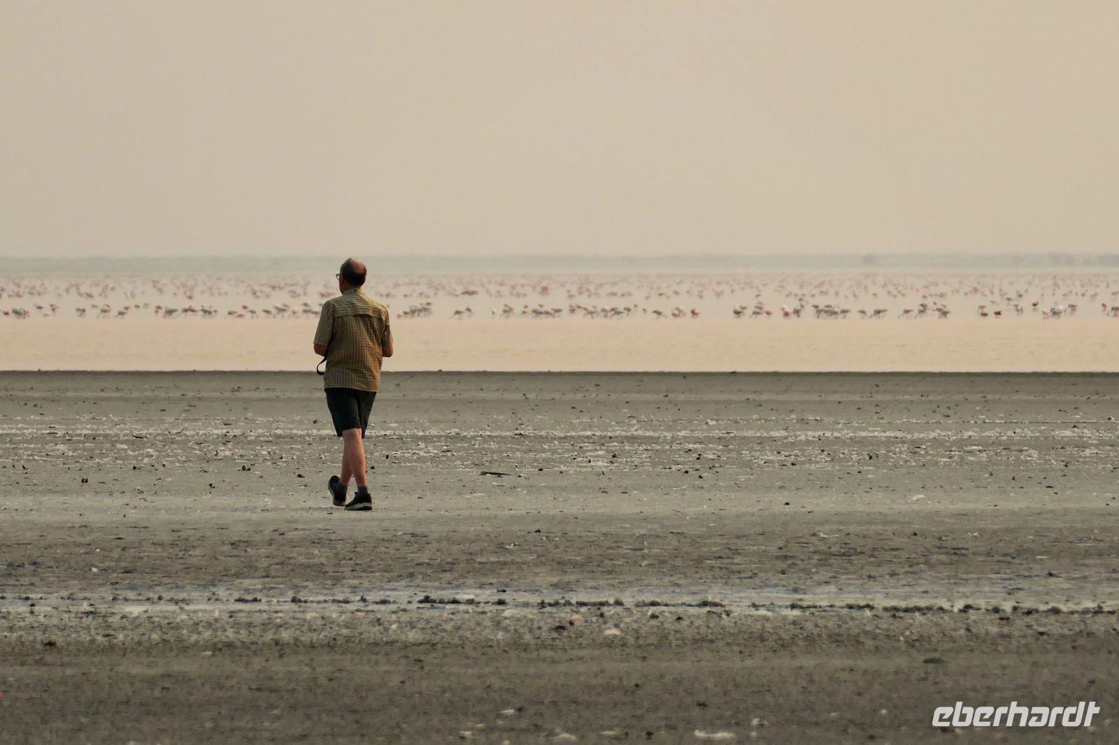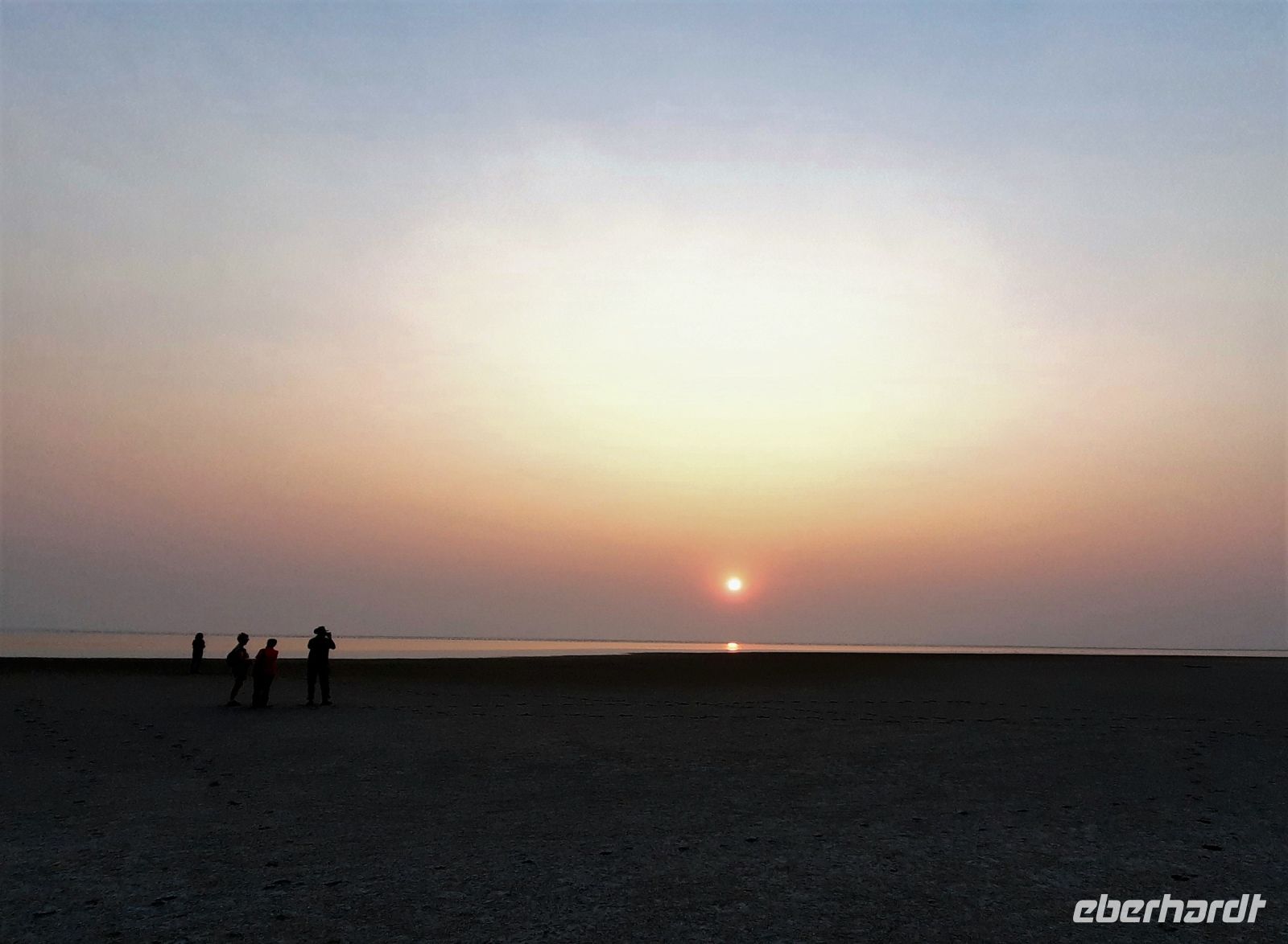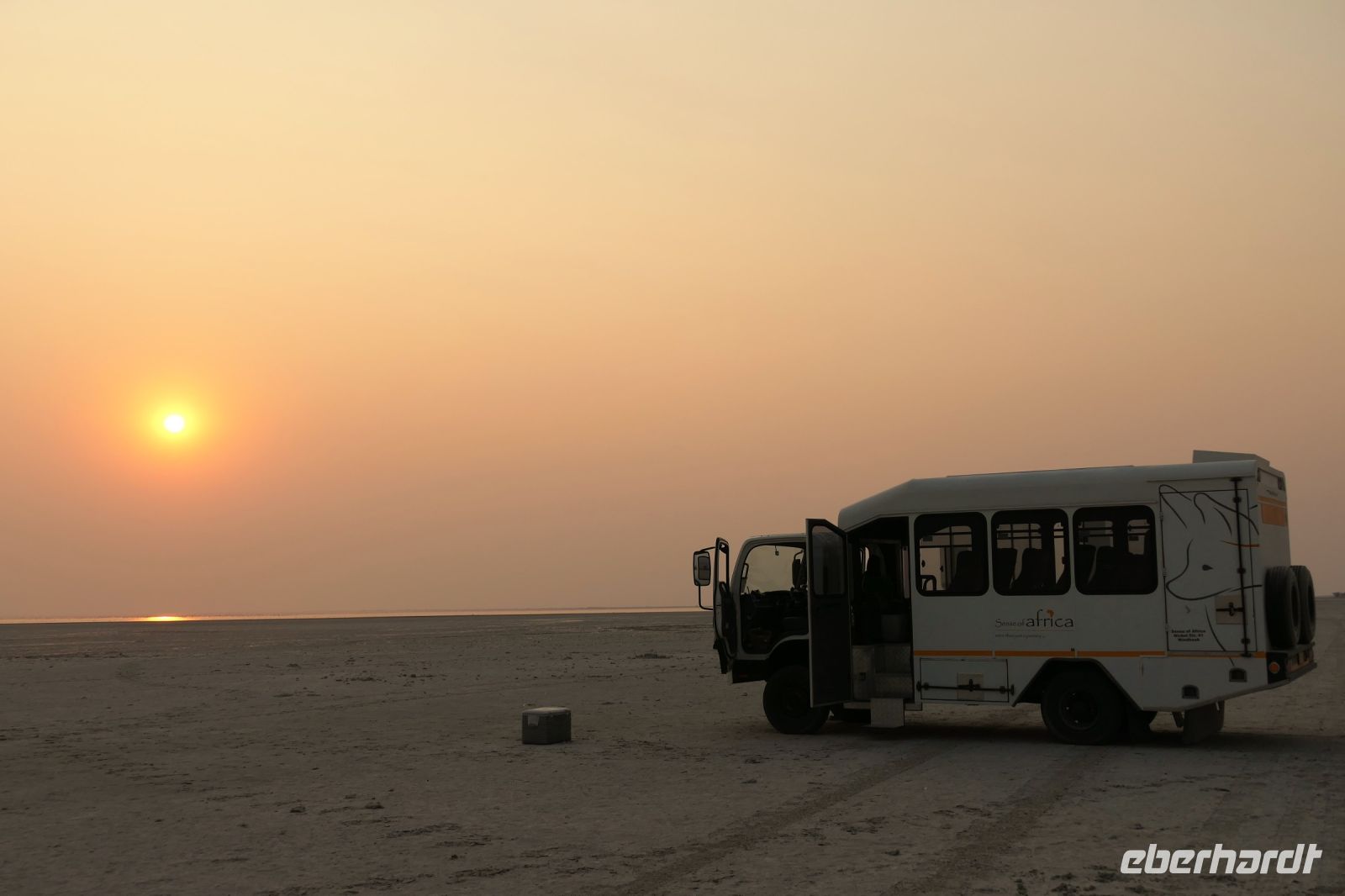 Nach dem Frühstück packten wir unsere sieben Sachen und starteten zu neuen Abenteuern. Vielen Dank an die Hwange Safari Lodge, die uns Lunchpakete verwöhnten, damit wir auf unserer heutigen Etappe nicht verhungern. Bis zur Stadt Hwange, wo wir einen Tankstopp einlegten und uns harmonisierten, fuhren wir auf Asphalt. Später bogen wir links ab und fuhren auf Schotterpiste am Rande des Hwange Parks entlang (inklusive einer afrikanischen Massage). Es war gleichzeitig eine kleine Pirschfahrt. Die hügelige Landschaft war sehenswert und wir sahen wieder Elefanten und so manch anderes Getier. Unser Ziel die Grenze zu Botswana. Der kleine Grenzübergang bei Pandamatenga befindet sich mitten im Busch. Abenteuerlich die Fahrt dorthin, aber viel kürzer als der Umweg über Vic Falls. Dieser Grenzübergang hatte wegen Corona fast zwei Jahre geschlossen und war erst seit wenigen Monaten wieder "bewirtschaftet". Der Beamte in der Schreibstube sichtete unsere Pässe und schrieb Name und Passnummer fein säuberlich in sein verstaubtes Grenz-Gästebuch. Dann erhob sich die Schranke und wir konnten passieren. Kurz darauf waren wir am Grenzzaun in Botswana. Zunächst mussten alle über die Seuchenmatte, auch das 2. Paar Schuhe tunkten wir ordnungsgemäß auf dem feuchten Desi-Lappen aus. Die BeamtenInnen-Stube war neu und fest in Frauenhand. Dennoch war hier die Zettelwirtschaft noch nicht abgeschafft bzw. die Änderung war noch nicht bekannt. Also schnell die Einreisezettel ausgefüllt, Stempel in den Pass und weiter ging es. Wir mussten uns etwas sputen, denn die Grenzformalitäten hatten doch einige Zeit in Anspruch genommen. Bis Nata hatten wir wieder Asphalt unterm Hintern und es herrschte kaum Verkehr. Den ganzen Tag war wieder sehr heiß. Kein Wunder, in dieser Region herrscht bereits arides Wüstenklima. Ausgetrocknete, weite Ebenen, kaum Bäume, nur Buschwerk. Unterwegs am Straßenrand sahen wir Elefanten, Warzenschweine und Steinböckchen. Im Dorf Nata herrschte nachmittägliche Betriebsamkeit. Der Verkehr rollte langsam, da man viele Potholes (Schlaglöcher) umfahren musste. Ein kleiner Vorgeschmack auf die nächsten Tage. In den letzten 2 Jahren waren kaum Touristen im Land unterwegs. Deshalb wurde auf die jährlich notwendige Ausbesserung der öffentlichen Straßen nach "Regenzeit" bzw. Flutzeit aus Geldmangel verzichtet. Unweit vom Dorf befindet sich unsere heutige Unterkunft, die Nata Lodge. Dort wartete bereits Paddi und nach einem quicky Check In fuhren wir zur Sowa Pan, um den Sonnenuntergang nicht zu verpassen. Die Sowa Pan ist neben der Nxai und Ntwetwe Pan ein Teil der Makgadikgadi-Salzpfannen, die ineinander über gehen. Das geschützte Gebiet umfasst ca. 12.000 km², das weltweit größte Salzpfannensystem. Hier gibt es keine Straßen, ausgetrocknete Spuren. Gott sei Dank hatten wir Paddi an Bord, der uns den Weg zeigte. Unendliche, ebene Weite - unvorstellbar, dass früher hier ein "Riesensee" (60.000 km²) war, der aber verdunstete. In der trockenen Zeit kann man kaum glauben, dass sich das Gebiet nach der Regenzeit in eine ausgedehnte Seenlandschaft verwandelt, die Massen von Tieren und Vögeln anzieht. Nur die Sowa Pan führt ganzjährig Wasser. Da wir in der Trockenzeit reisten, konnten wir in die Pfanne hinein fahren. Im Wasser tummelten sich noch viele Flamingos, auch einzelne Pelikane waren von weiten zu sehen. In den Ebenen entdeckten wir eine lustige Gackeltrappe, ein paar Strauße und ein einsames Gnu. Auch ein einsames Straußenei, welches Annett zu Ouwo Strapazzata (Rührei) verarbeitete. Langsam neigte sich die Sonne zum Horizont und wir "sundownerten" mit. Anschließend halfen wir noch einer anderen Gruppe, deren Fahrzeug keinen Allrad-Antrieb hatte. Sonst hätten sie ihre Zelte auf dem salzigen Boden aufbauen müssen. Zurück in der Lodge bezogen wir unsere geräumigen Holzchalets mit Klimaanlage, Himmelbett mit Moskitonetz und viele probierten gleich noch die Outdoor-Dusche. Bei lauen Temperaturen genossen wir später ein leckeres Abendessen, welches wir uns je nach Geschmack a la carte aussuchen konnten.