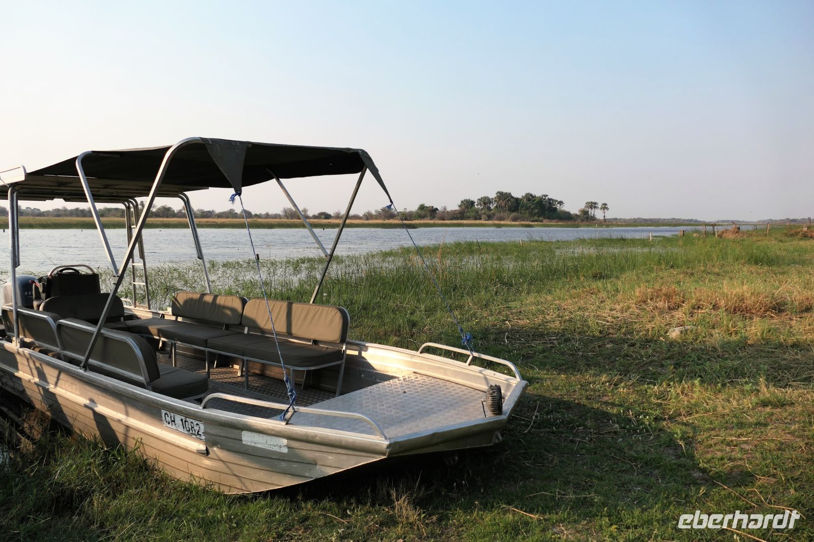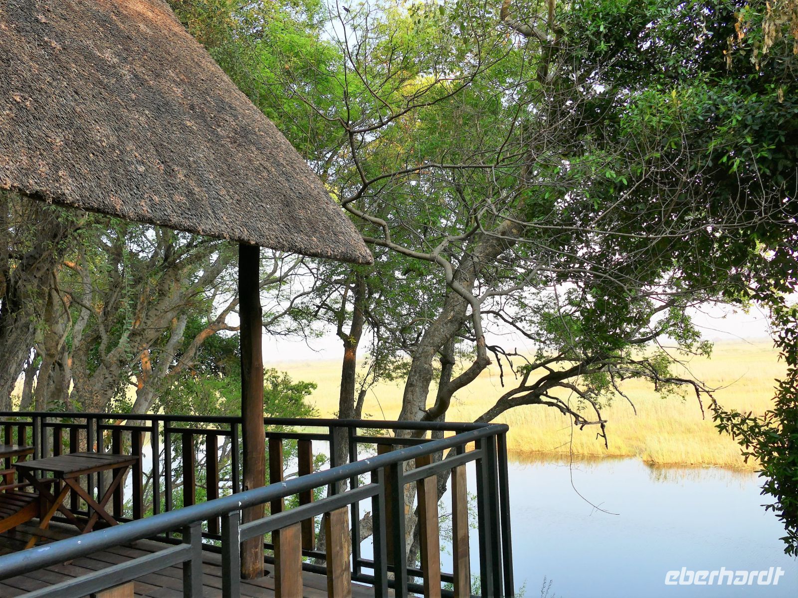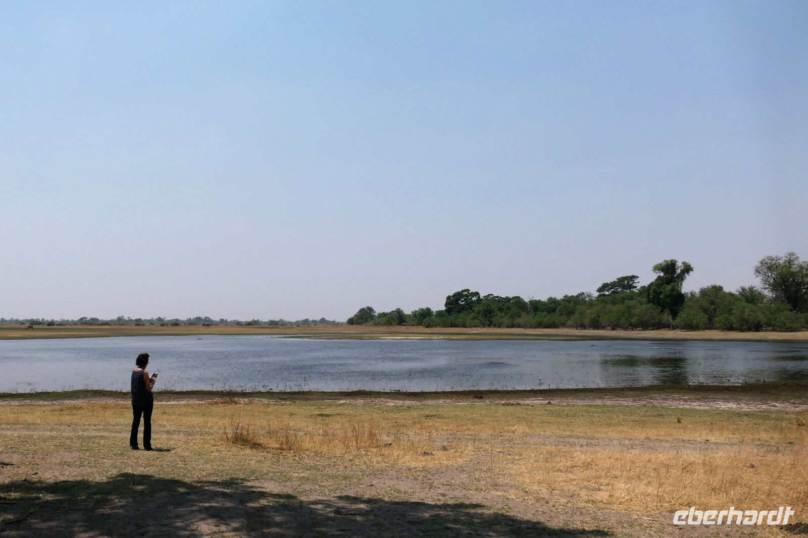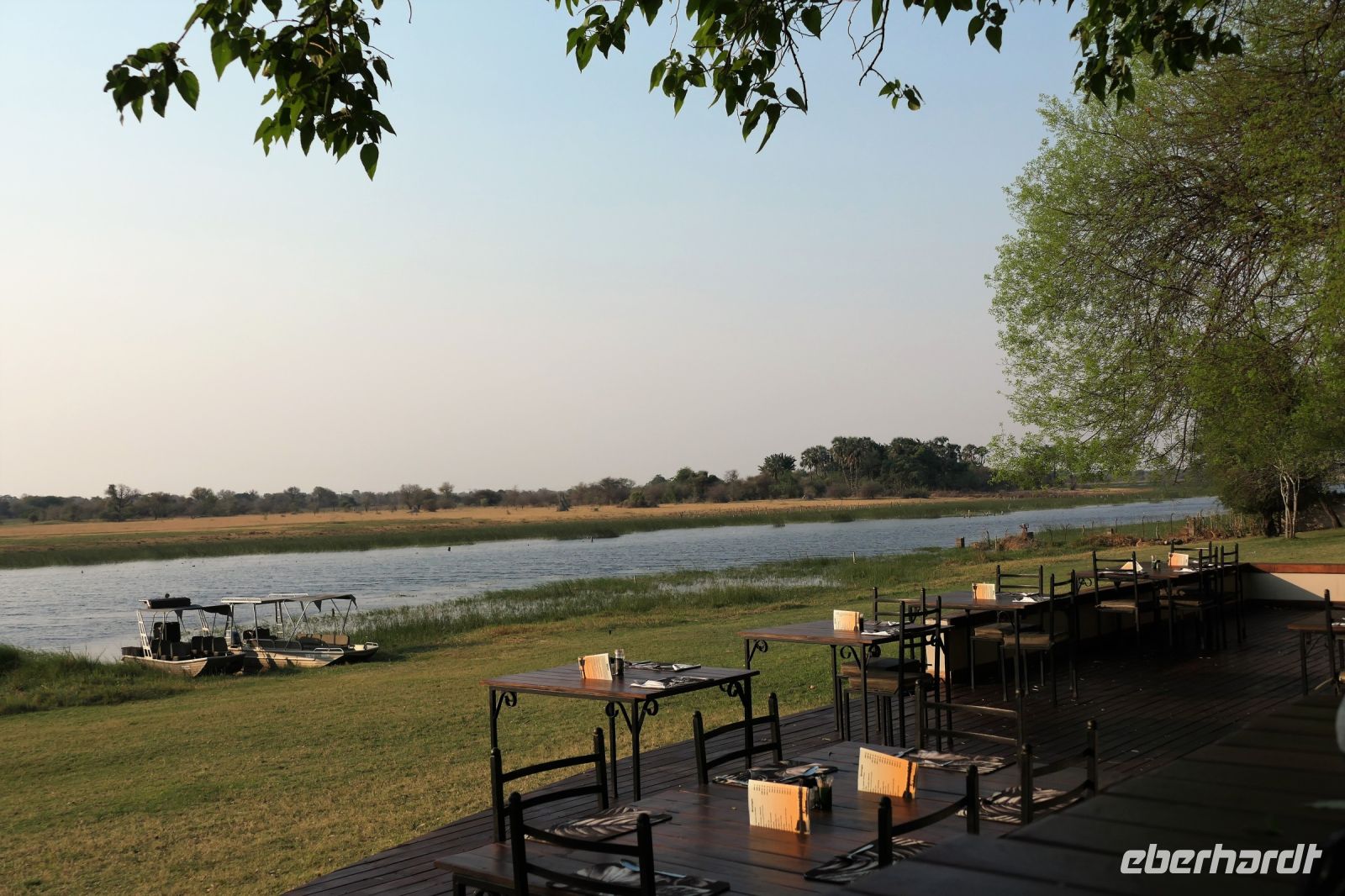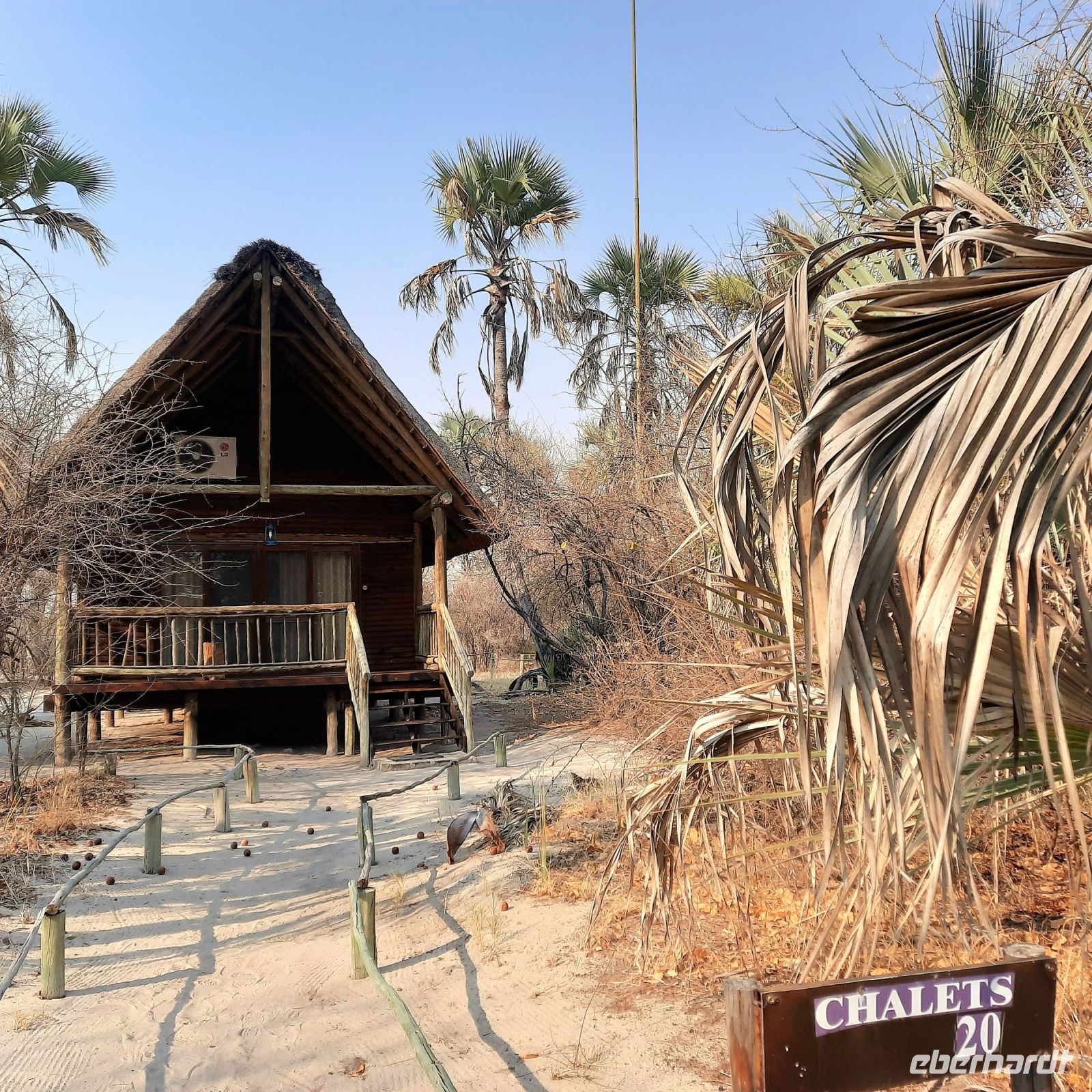 gut ausgestatteten Zeltchalets und hatten den weiteren Nachmittag hatten wir freie Zeit. Ein optionaler Mittagslunch entpuppte sich als Völlerei. Ein Gericht reichte absolut für zwei, so riesig waren die Portionen. Leider wurden Annett und Tutu erst beim Check In informiert, dass die geplante Bootstour am nächsten Nachmittag wegen dem extremen Niedrigwassers nicht stattfinden kann. Es war nicht möglich, von der Lodge zum Hauptarm des Chobes zu gelangen, der in Sichtweite der Lodge lag. Per Jeep war es nicht machbar, da der Hauptarm nur von botswanischer Seite erreichbar war und die Grenze 18 Uhr schließt. Alle hatten sich auf diese Bootsfahrt gefreut, aber Natur ist Natur. Dies kann vorkommen, aber eine rechtzeitigere Information der Lodge an uns oder unsere namibischen Partner wäre fairer gewesen, als uns vor vollendete Tatsachen zu stellen. So hätten wir die Chance gehabt, schon eher einen Alternativ-Plan zu schmieden. Tutu und Annett suchten gemeinsam nach Plan C. In Afrika muß man immer einen anderen Plan in der Tasche haben, der war auch später gefunden.