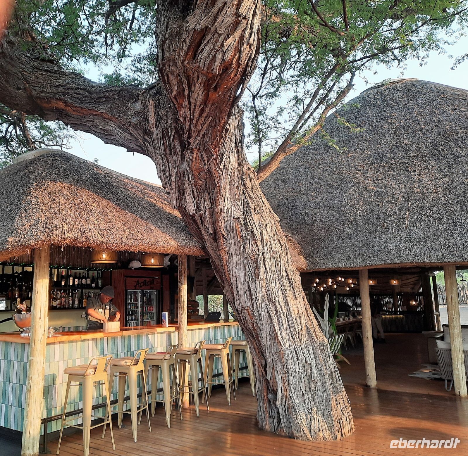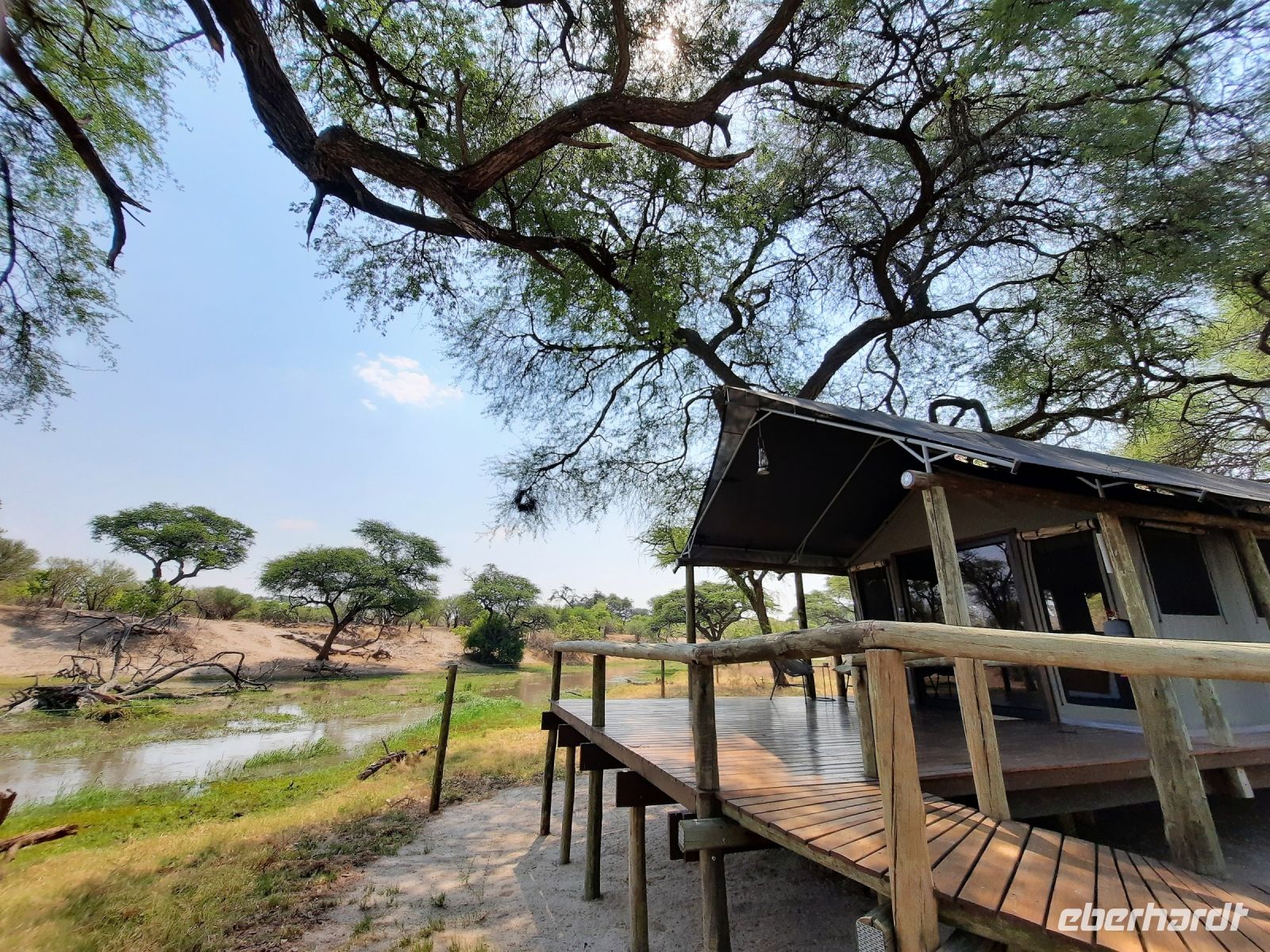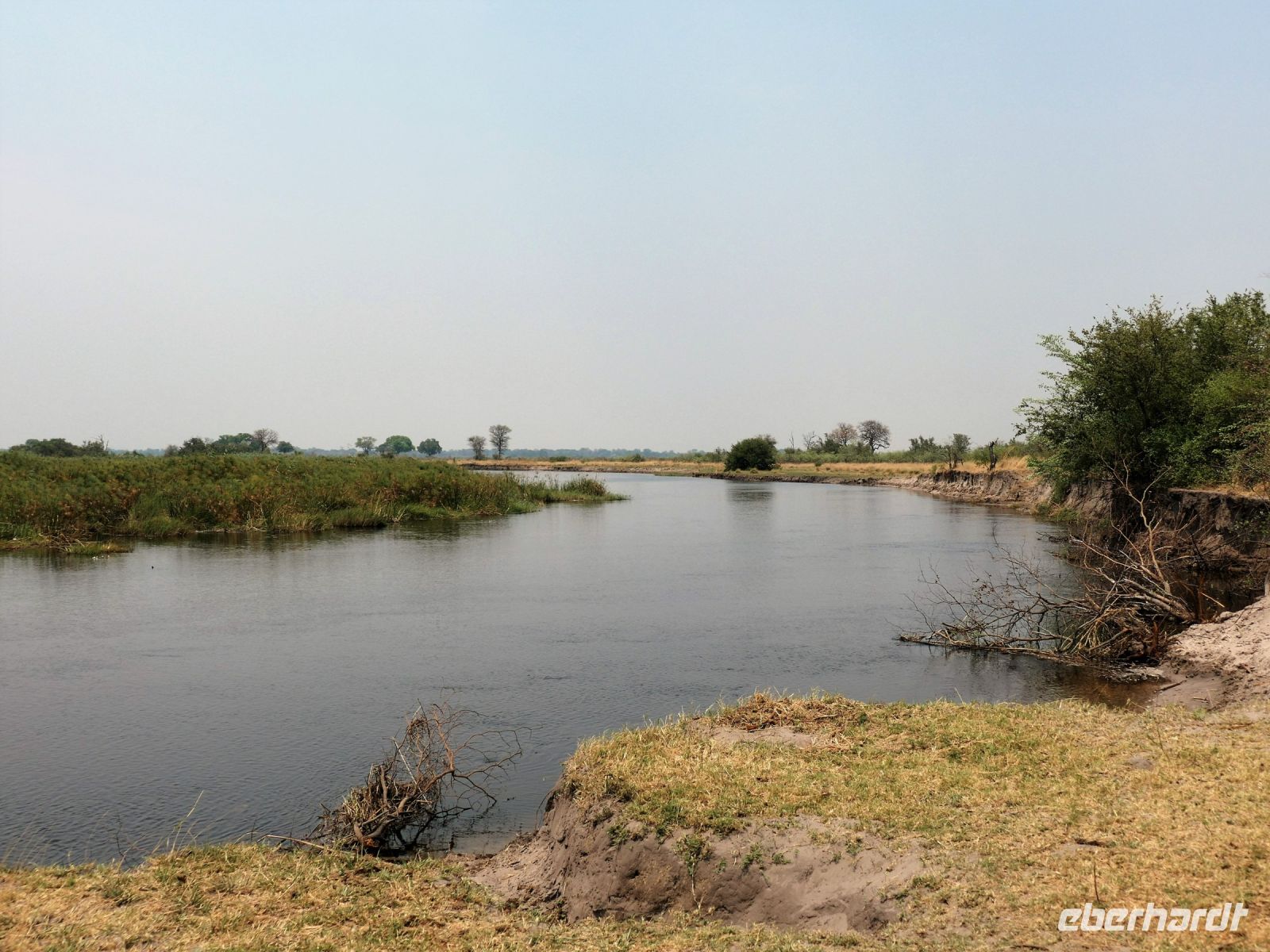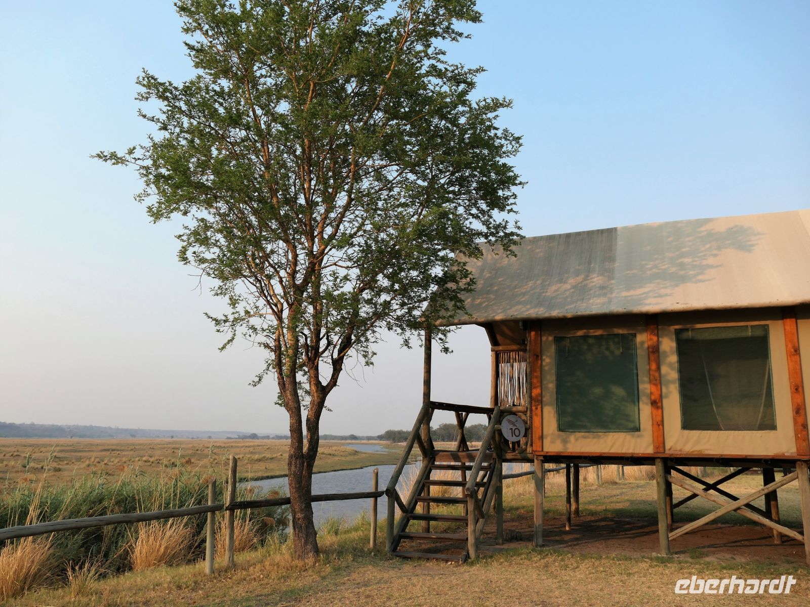 gut ausgestatteten Zeltchalets und hatten den weiteren Nachmittag hatten wir freie Zeit. Ein optionaler Mittagslunch entpuppte sich als Völlerei. Ein Gericht reichte absolut für zwei, so riesig waren die Portionen. Leider wurden Annett und Tutu erst beim Check In informiert, dass die geplante Bootstour am nächsten Nachmittag wegen dem extremen Niedrigwassers nicht stattfinden kann. Es war nicht möglich, von der Lodge zum Hauptarm des Chobes zu gelangen, der in Sichtweite der Lodge lag. Per Jeep war es nicht machbar, da der Hauptarm nur von botswanischer Seite erreichbar war und die Grenze 18 Uhr schließt. Alle hatten sich auf diese Bootsfahrt gefreut, aber Natur ist Natur. Dies kann vorkommen, aber eine rechtzeitigere Information der Lodge an uns oder unsere namibischen Partner wäre fairer gewesen, als uns vor vollendete Tatsachen zu stellen. So hätten wir die Chance gehabt, schon eher einen Alternativ-Plan zu schmieden. Tutu und Annett suchten gemeinsam nach Plan C. In Afrika muß man immer einen anderen Plan in der Tasche haben, der war auch später gefunden.