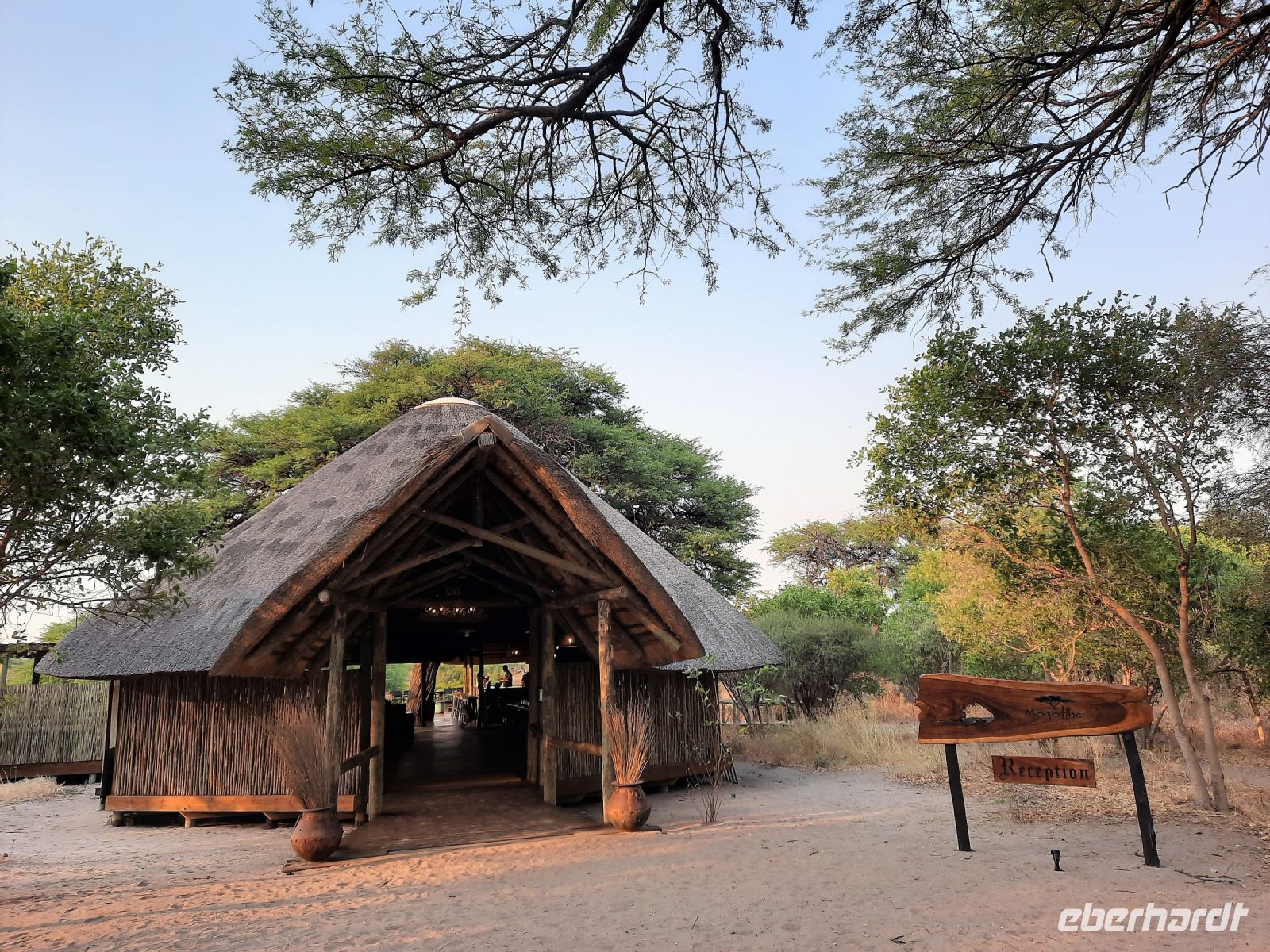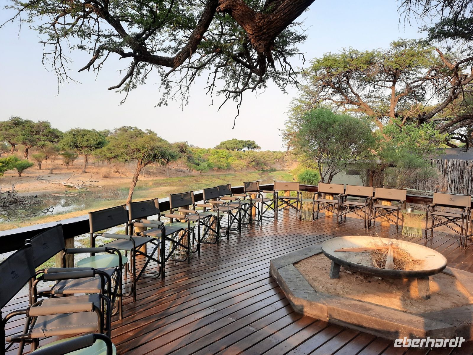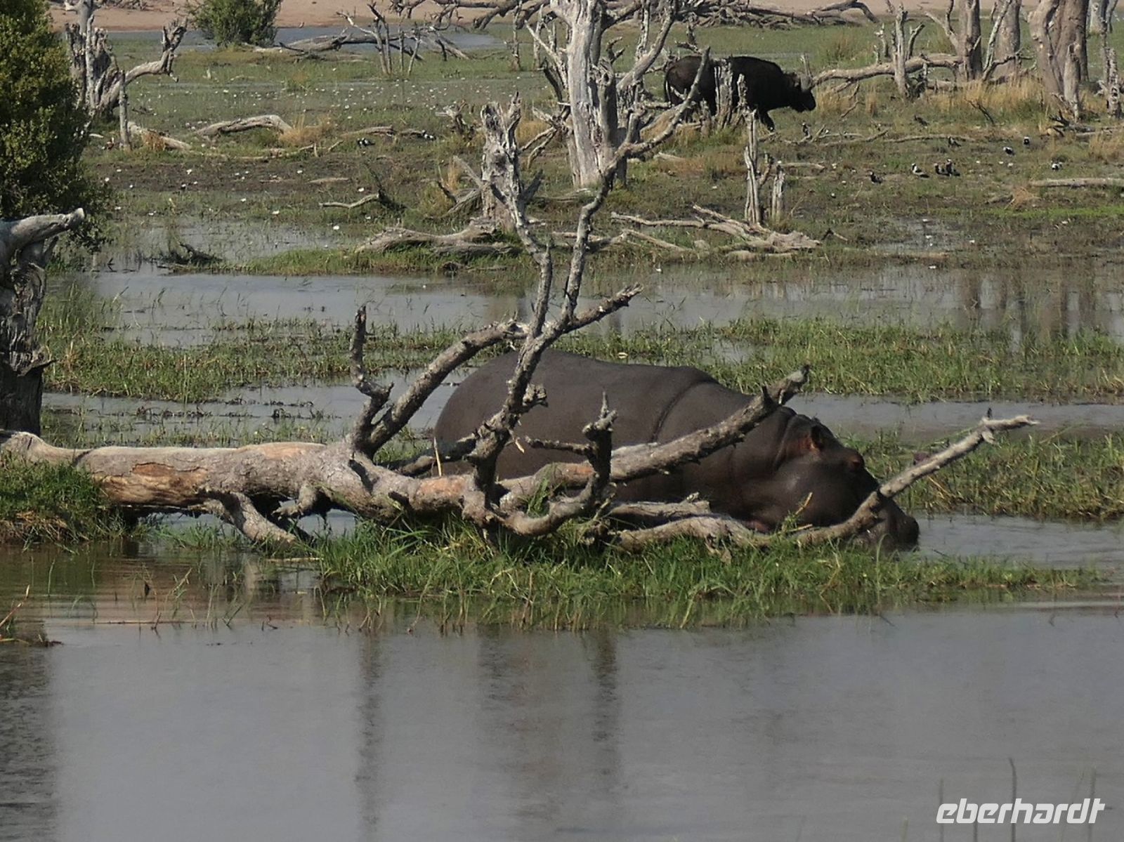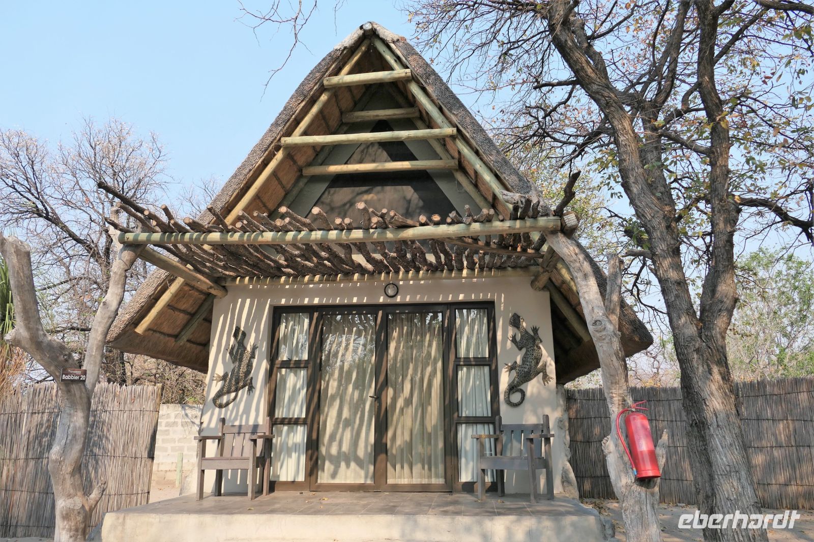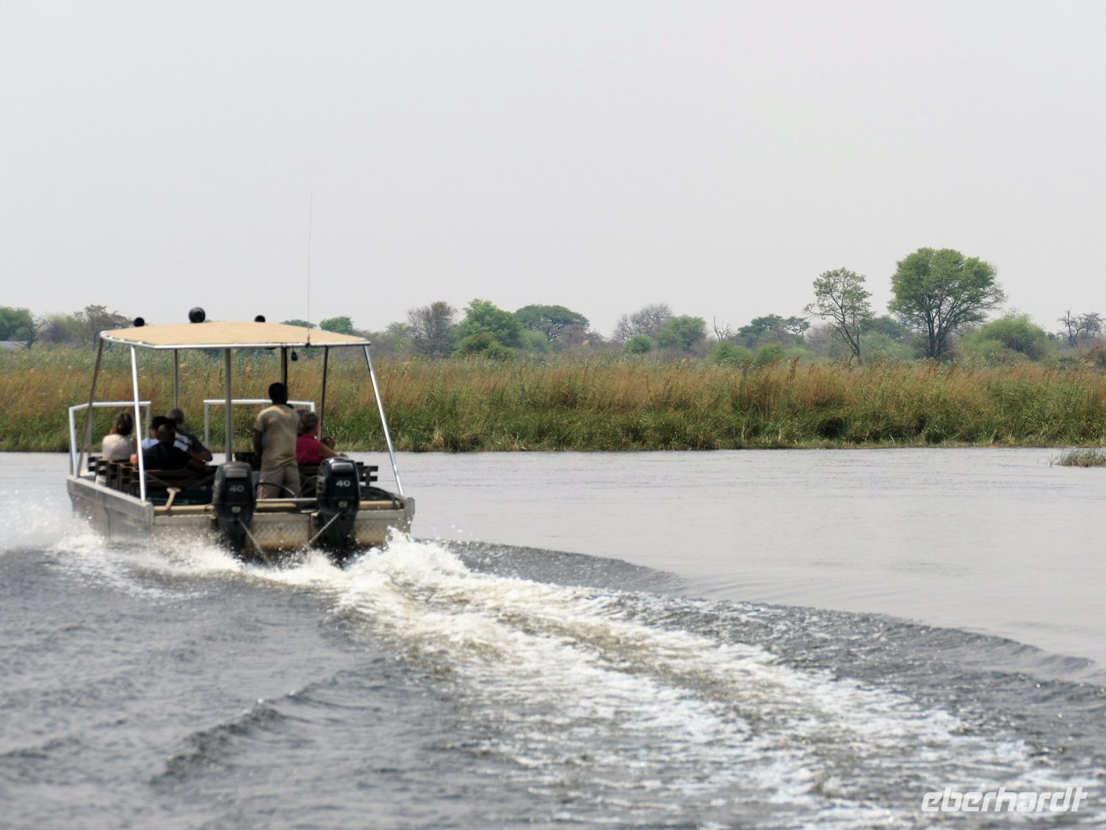 gut ausgestatteten Zeltchalets und hatten den weiteren Nachmittag hatten wir freie Zeit. Ein optionaler Mittagslunch entpuppte sich als Völlerei. Ein Gericht reichte absolut für zwei, so riesig waren die Portionen. Leider wurden Annett und Tutu erst beim Check In informiert, dass die geplante Bootstour am nächsten Nachmittag wegen dem extremen Niedrigwassers nicht stattfinden kann. Es war nicht möglich, von der Lodge zum Hauptarm des Chobes zu gelangen, der in Sichtweite der Lodge lag. Per Jeep war es nicht machbar, da der Hauptarm nur von botswanischer Seite erreichbar war und die Grenze 18 Uhr schließt. Alle hatten sich auf diese Bootsfahrt gefreut, aber Natur ist Natur. Dies kann vorkommen, aber eine rechtzeitigere Information der Lodge an uns oder unsere namibischen Partner wäre fairer gewesen, als uns vor vollendete Tatsachen zu stellen. So hätten wir die Chance gehabt, schon eher einen Alternativ-Plan zu schmieden. Tutu und Annett suchten gemeinsam nach Plan C. In Afrika muß man immer einen anderen Plan in der Tasche haben, der war auch später gefunden.