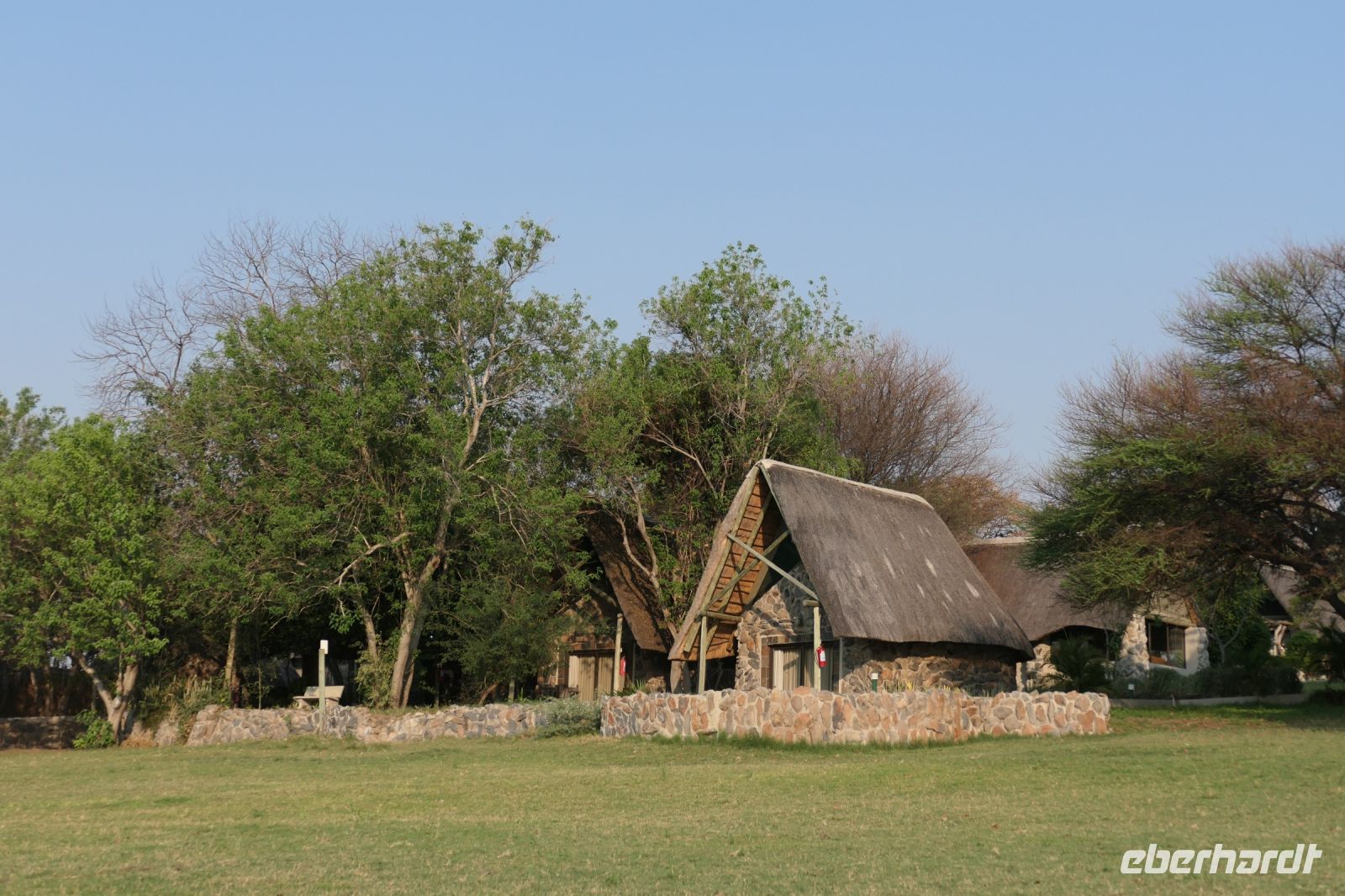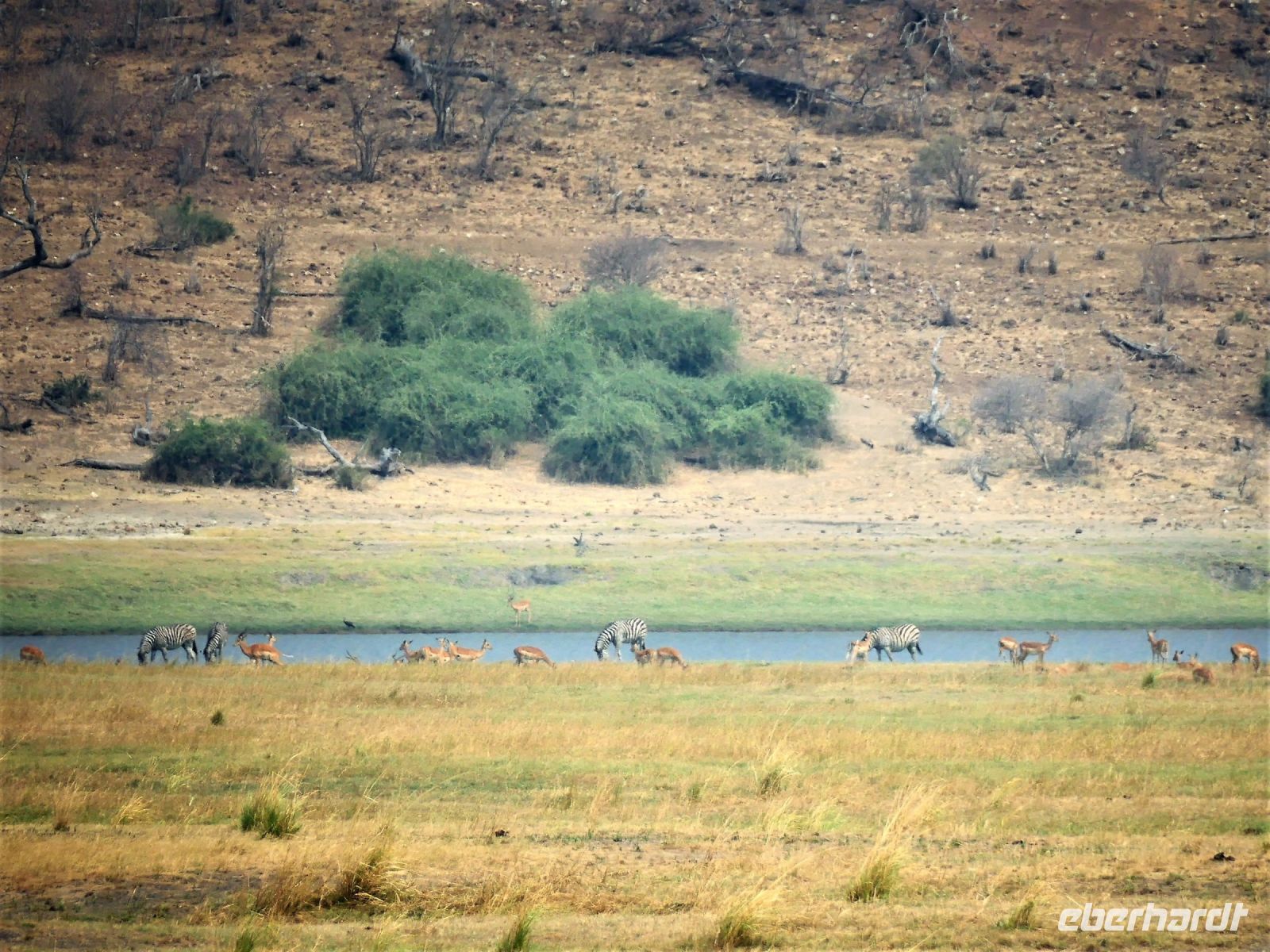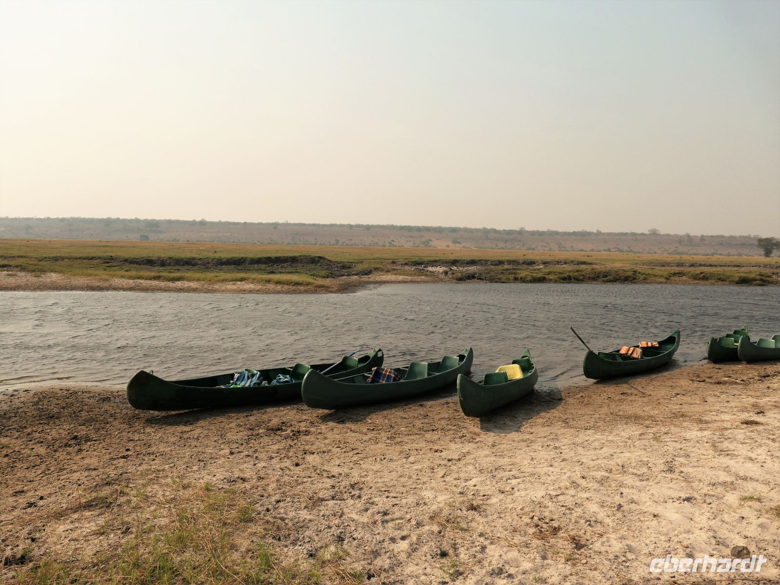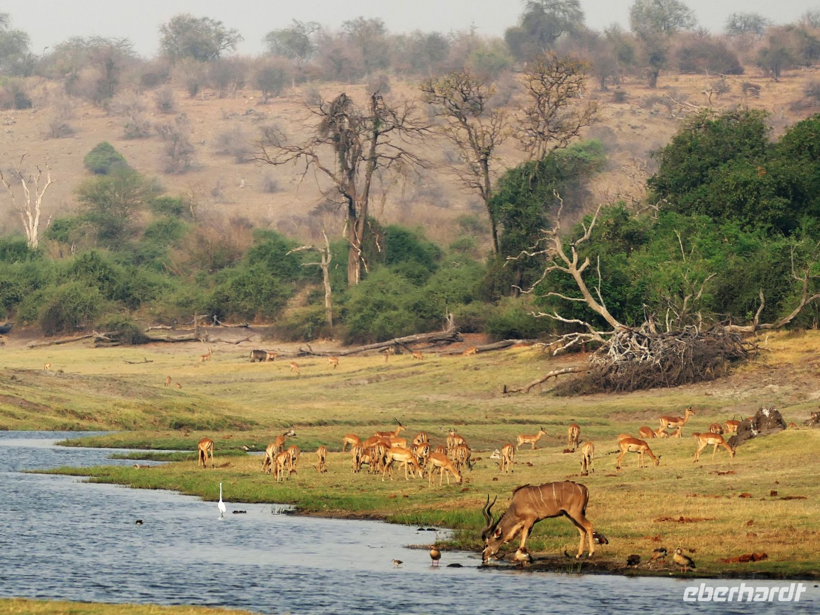 gut ausgestatteten Zeltchalets und hatten den weiteren Nachmittag hatten wir freie Zeit. Ein optionaler Mittagslunch entpuppte sich als Völlerei. Ein Gericht reichte absolut für zwei, so riesig waren die Portionen. Leider wurden Annett und Tutu erst beim Check In informiert, dass die geplante Bootstour am nächsten Nachmittag wegen dem extremen Niedrigwassers nicht stattfinden kann. Es war nicht möglich, von der Lodge zum Hauptarm des Chobes zu gelangen, der in Sichtweite der Lodge lag. Per Jeep war es nicht machbar, da der Hauptarm nur von botswanischer Seite erreichbar war und die Grenze 18 Uhr schließt. Alle hatten sich auf diese Bootsfahrt gefreut, aber Natur ist Natur. Dies kann vorkommen, aber eine rechtzeitigere Information der Lodge an uns oder unsere namibischen Partner wäre fairer gewesen, als uns vor vollendete Tatsachen zu stellen. So hätten wir die Chance gehabt, schon eher einen Alternativ-Plan zu schmieden. Tutu und Annett suchten gemeinsam nach Plan C. In Afrika muß man immer einen anderen Plan in der Tasche haben, der war auch später gefunden.