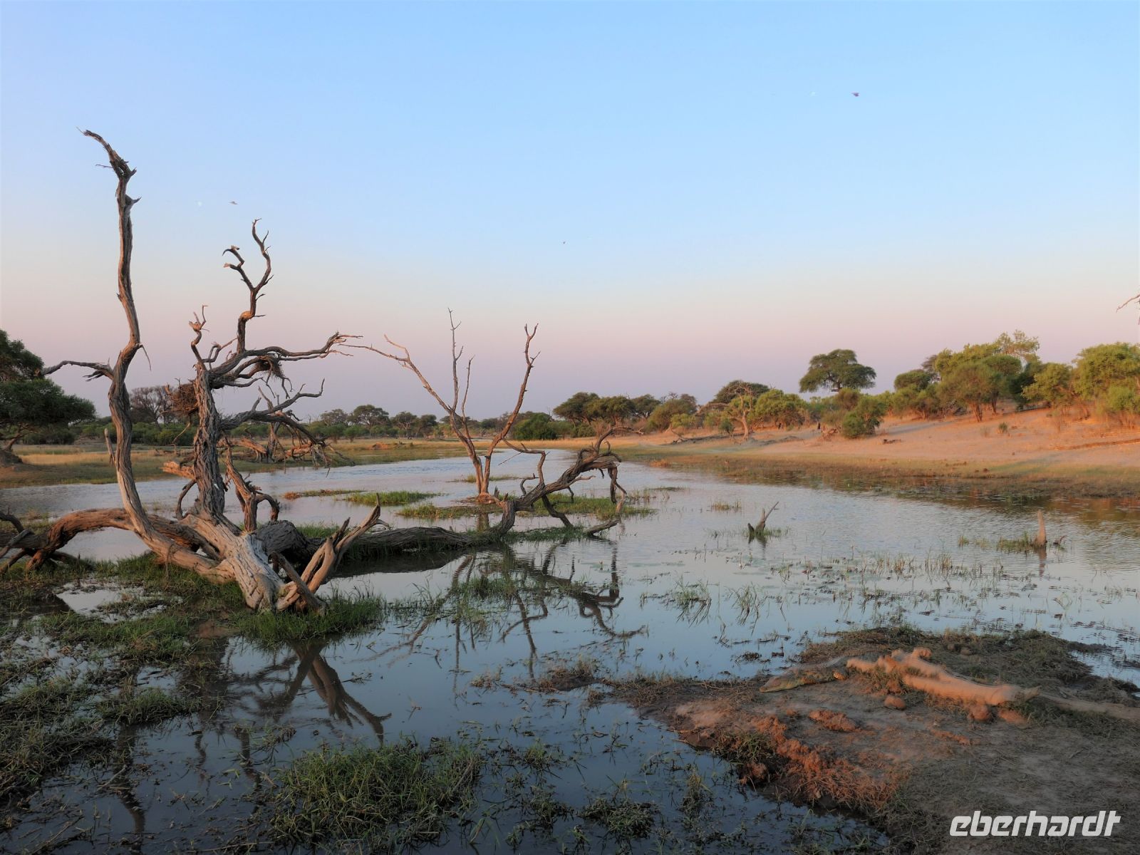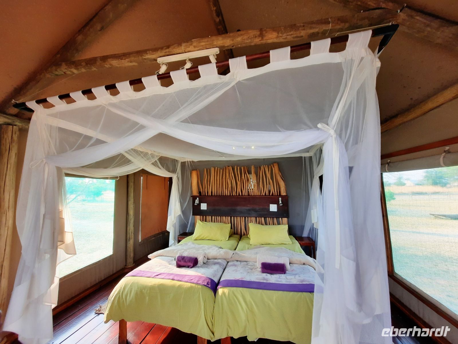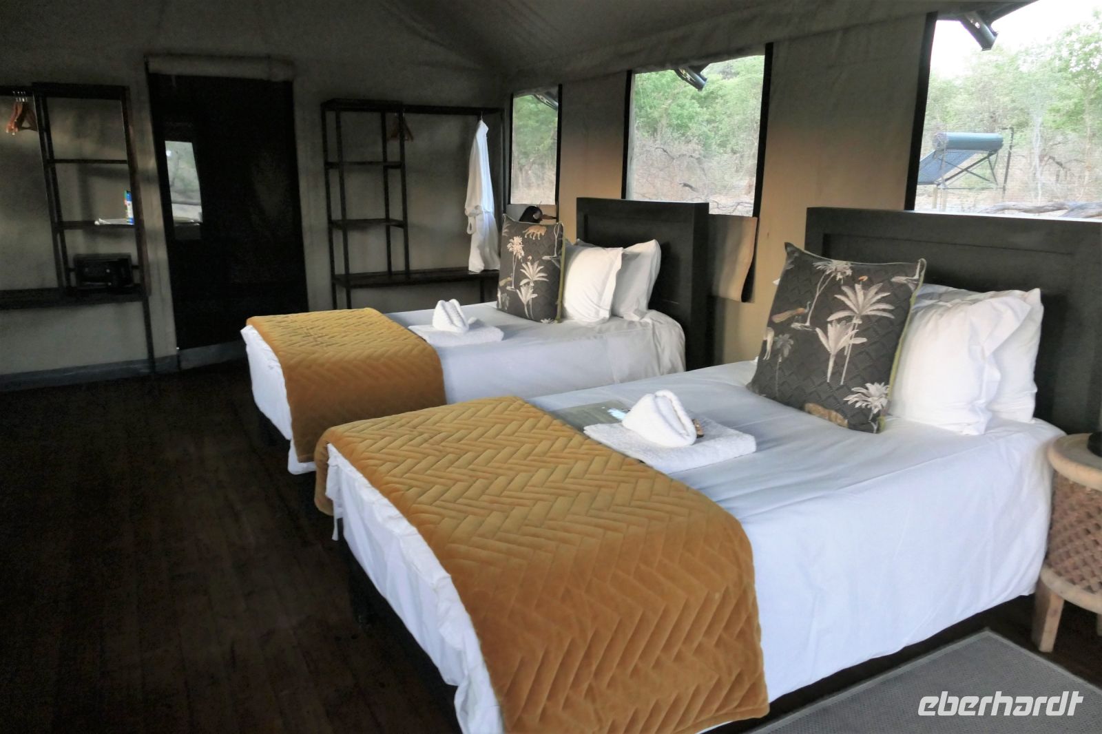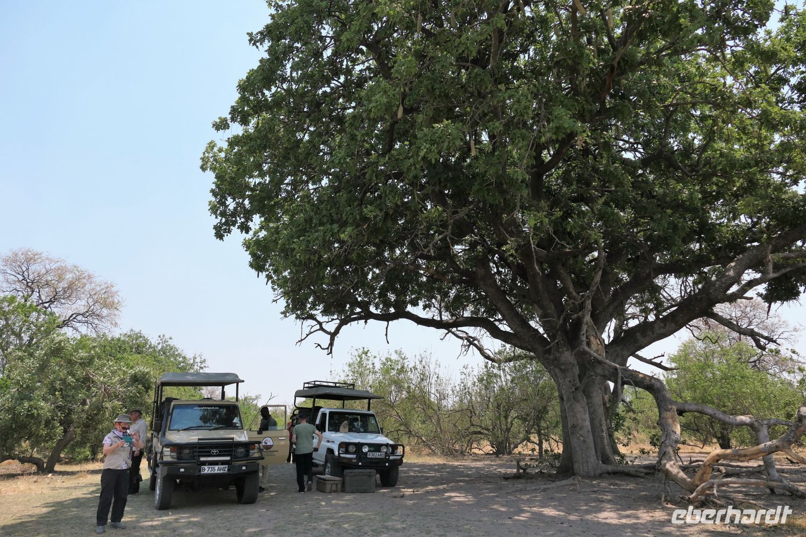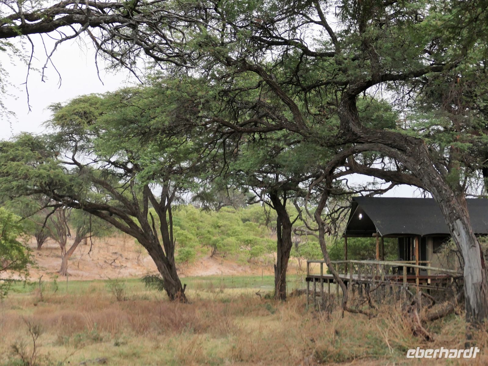 gut ausgestatteten Zeltchalets und hatten den weiteren Nachmittag hatten wir freie Zeit. Ein optionaler Mittagslunch entpuppte sich als Völlerei. Ein Gericht reichte absolut für zwei, so riesig waren die Portionen. Leider wurden Annett und Tutu erst beim Check In informiert, dass die geplante Bootstour am nächsten Nachmittag wegen dem extremen Niedrigwassers nicht stattfinden kann. Es war nicht möglich, von der Lodge zum Hauptarm des Chobes zu gelangen, der in Sichtweite der Lodge lag. Per Jeep war es nicht machbar, da der Hauptarm nur von botswanischer Seite erreichbar war und die Grenze 18 Uhr schließt. Alle hatten sich auf diese Bootsfahrt gefreut, aber Natur ist Natur. Dies kann vorkommen, aber eine rechtzeitigere Information der Lodge an uns oder unsere namibischen Partner wäre fairer gewesen, als uns vor vollendete Tatsachen zu stellen. So hätten wir die Chance gehabt, schon eher einen Alternativ-Plan zu schmieden. Tutu und Annett suchten gemeinsam nach Plan C. In Afrika muß man immer einen anderen Plan in der Tasche haben, der war auch später gefunden.