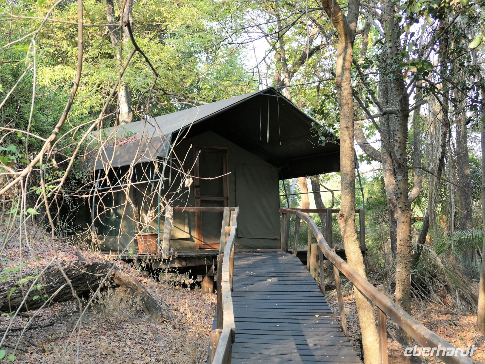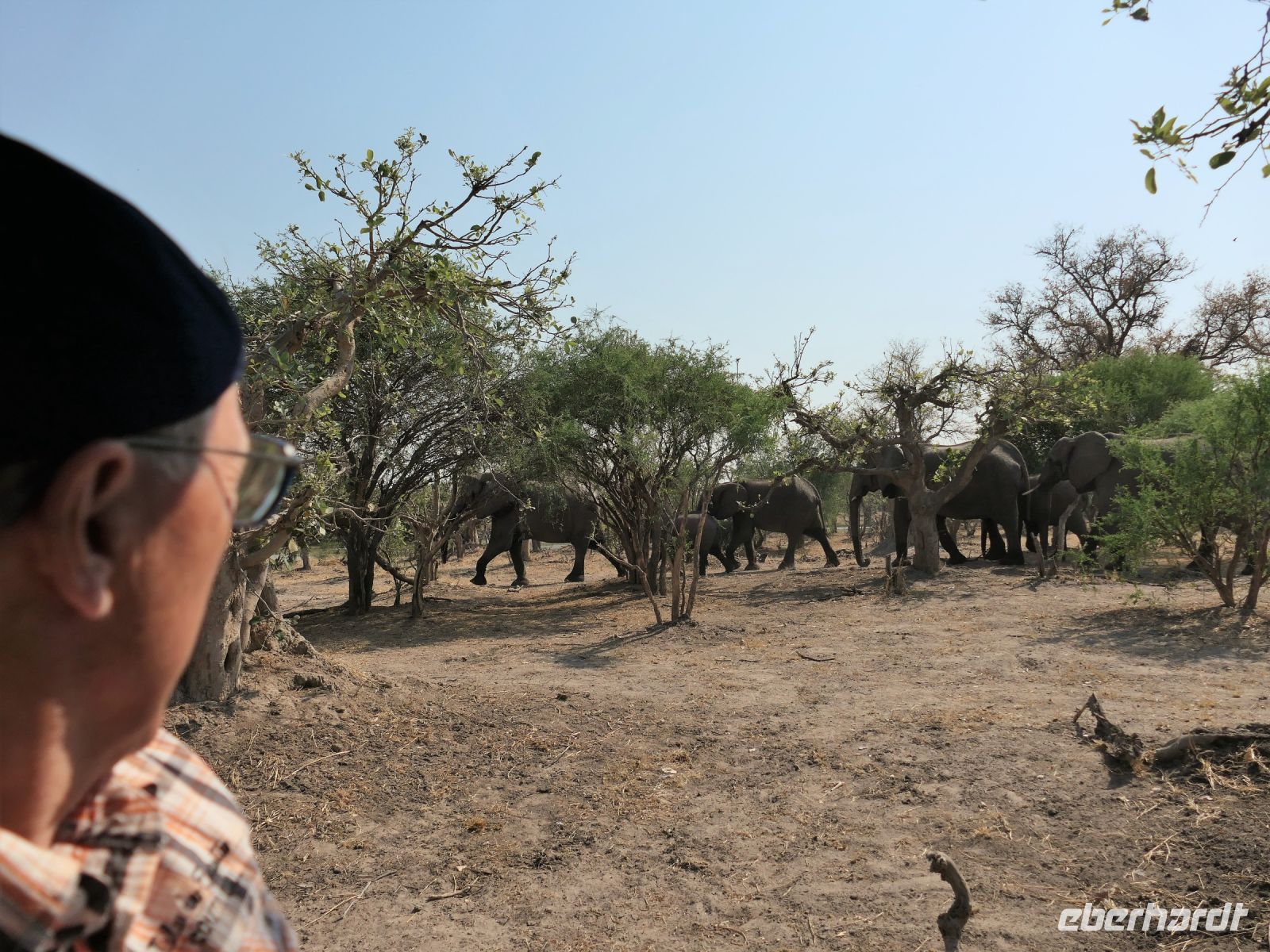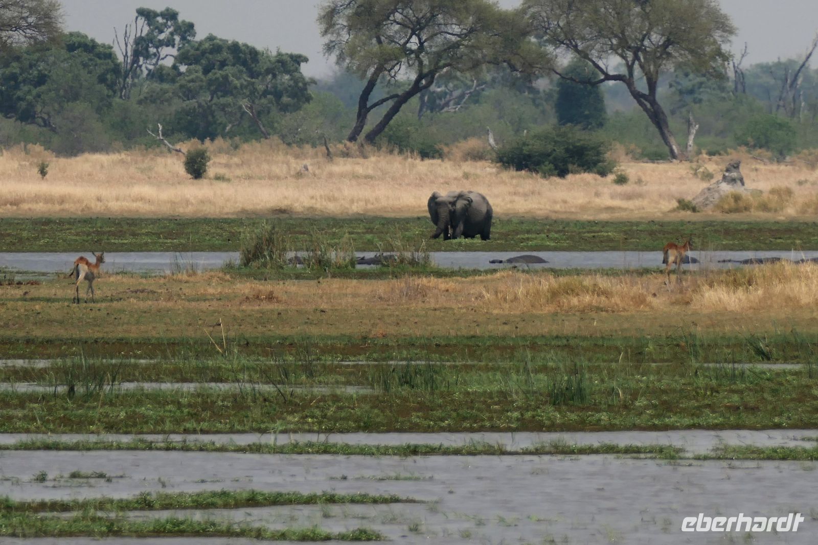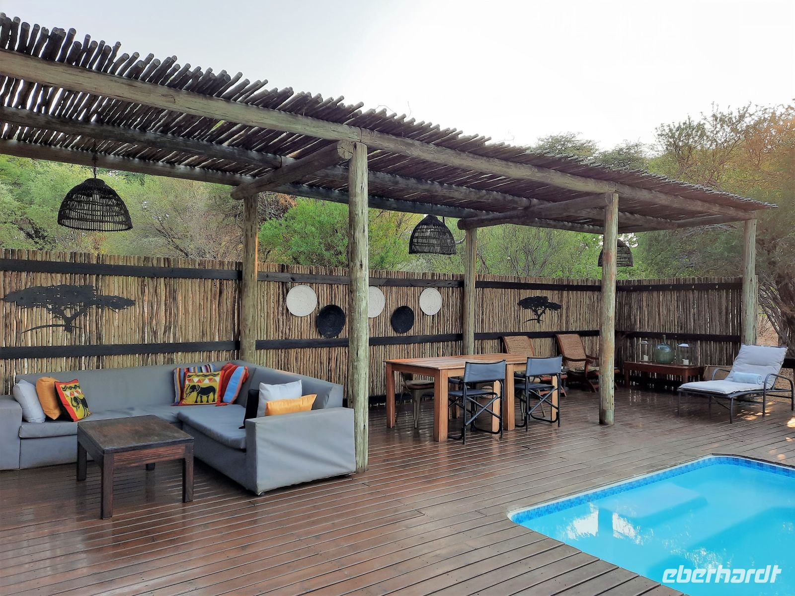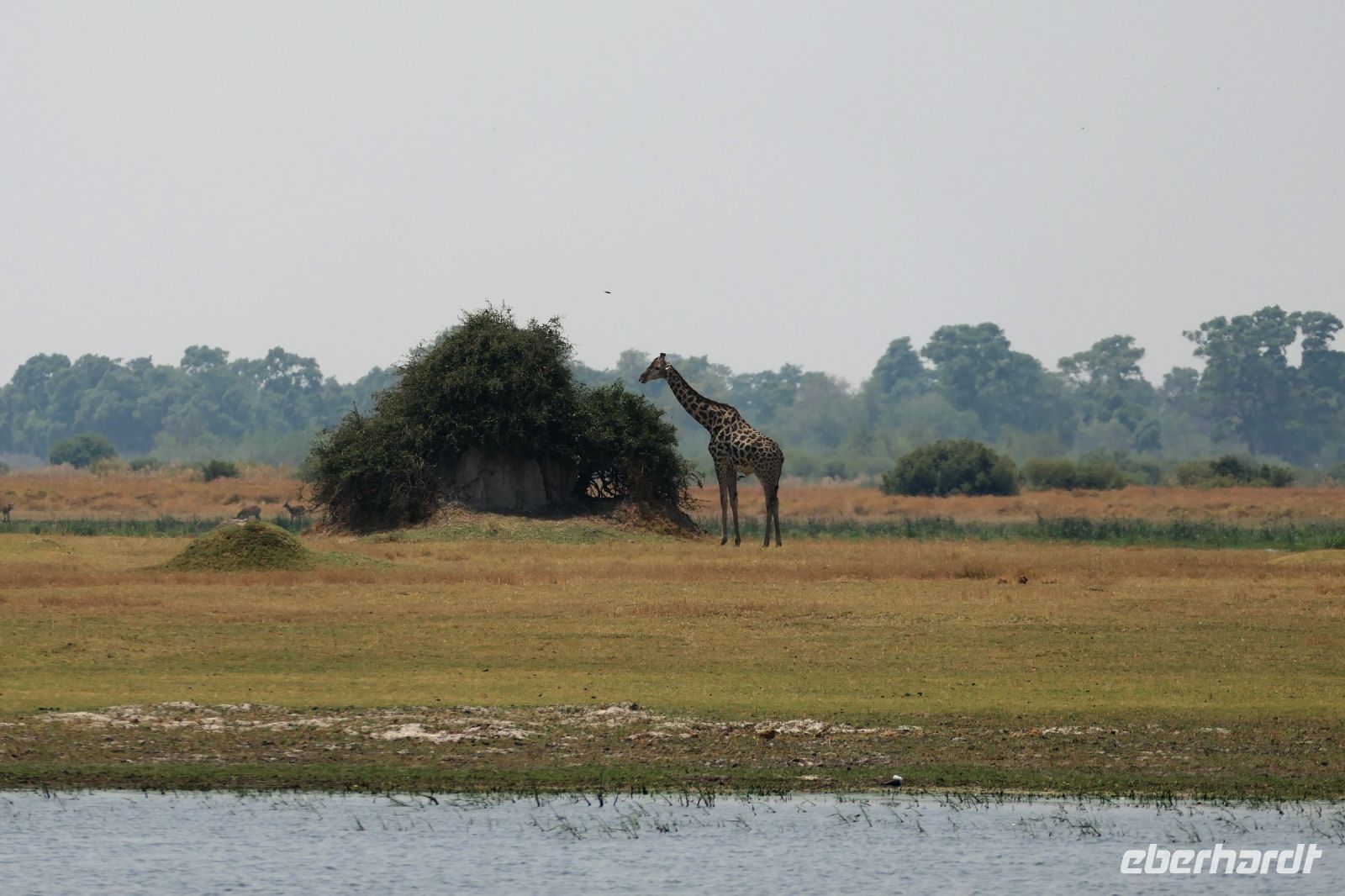 gut ausgestatteten Zeltchalets und hatten den weiteren Nachmittag hatten wir freie Zeit. Ein optionaler Mittagslunch entpuppte sich als Völlerei. Ein Gericht reichte absolut für zwei, so riesig waren die Portionen. Leider wurden Annett und Tutu erst beim Check In informiert, dass die geplante Bootstour am nächsten Nachmittag wegen dem extremen Niedrigwassers nicht stattfinden kann. Es war nicht möglich, von der Lodge zum Hauptarm des Chobes zu gelangen, der in Sichtweite der Lodge lag. Per Jeep war es nicht machbar, da der Hauptarm nur von botswanischer Seite erreichbar war und die Grenze 18 Uhr schließt. Alle hatten sich auf diese Bootsfahrt gefreut, aber Natur ist Natur. Dies kann vorkommen, aber eine rechtzeitigere Information der Lodge an uns oder unsere namibischen Partner wäre fairer gewesen, als uns vor vollendete Tatsachen zu stellen. So hätten wir die Chance gehabt, schon eher einen Alternativ-Plan zu schmieden. Tutu und Annett suchten gemeinsam nach Plan C. In Afrika muß man immer einen anderen Plan in der Tasche haben, der war auch später gefunden.