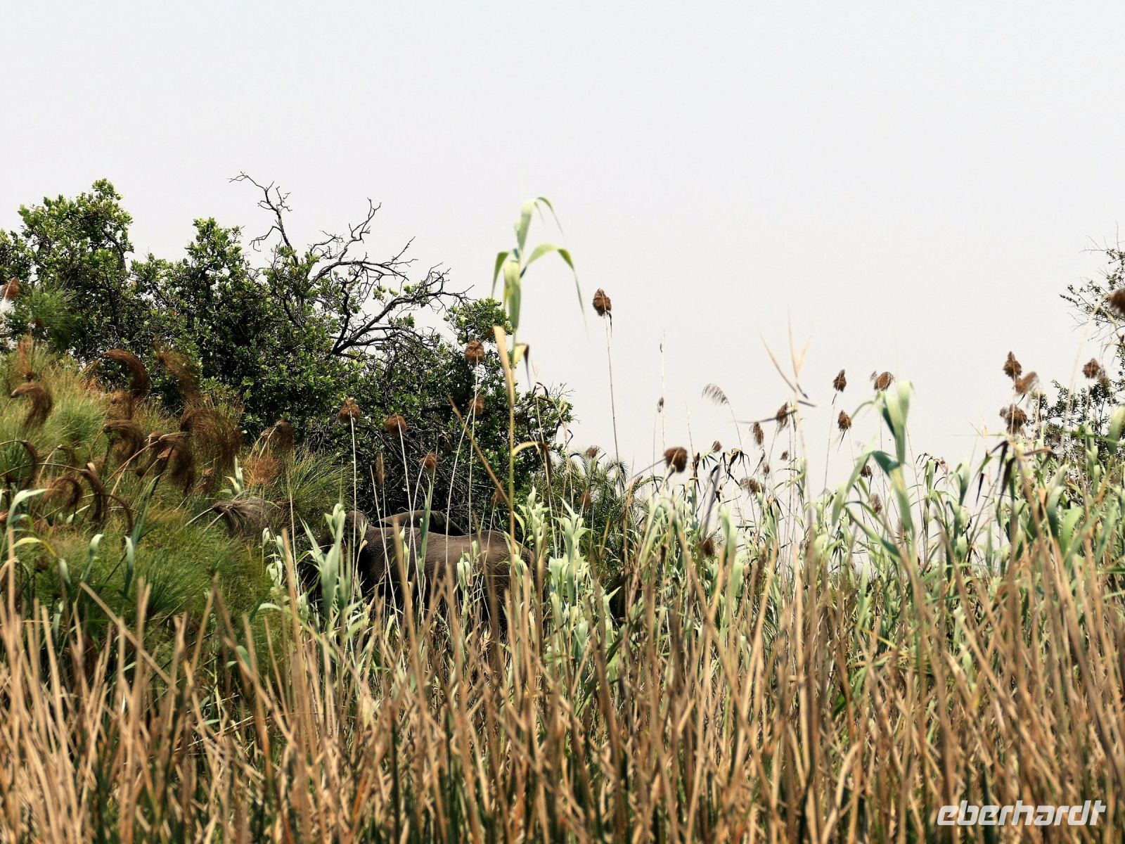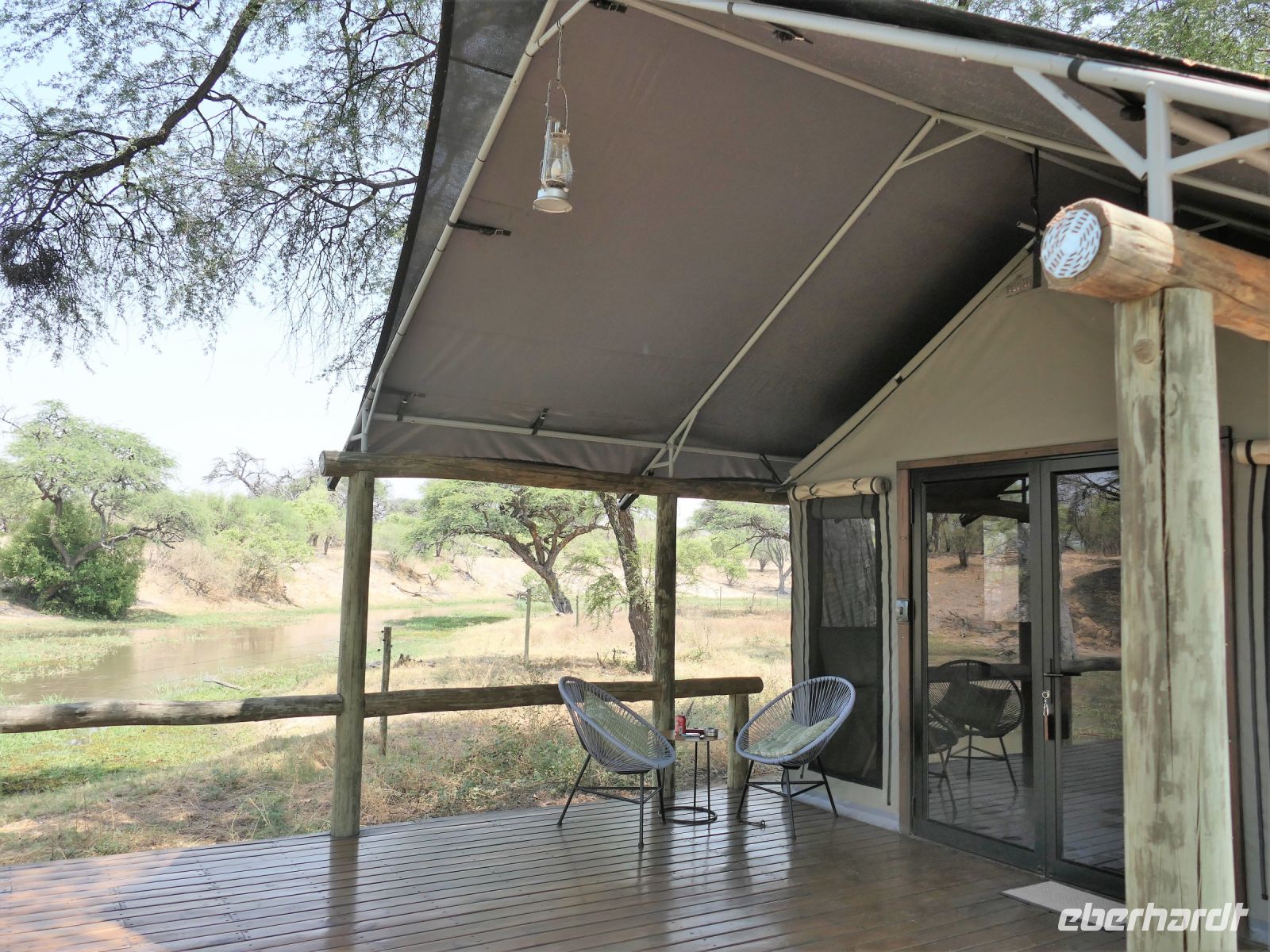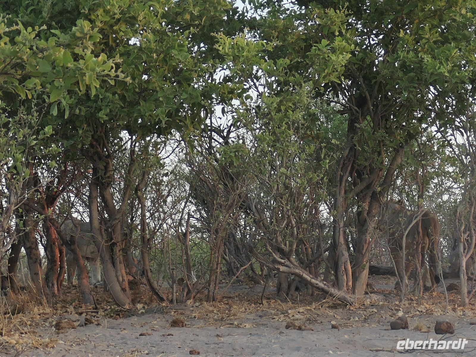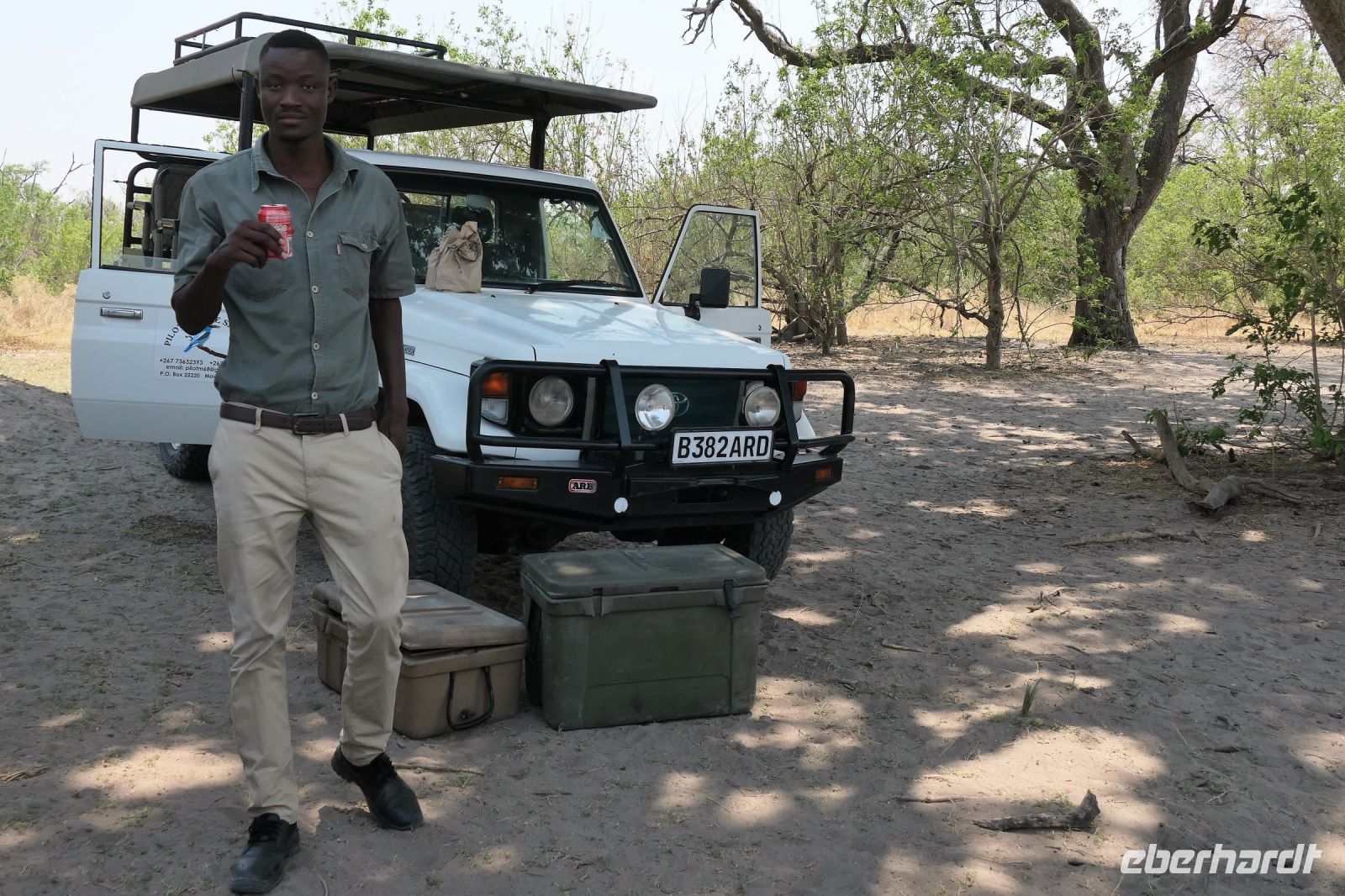 gut ausgestatteten Zeltchalets und hatten den weiteren Nachmittag hatten wir freie Zeit. Ein optionaler Mittagslunch entpuppte sich als Völlerei. Ein Gericht reichte absolut für zwei, so riesig waren die Portionen. Leider wurden Annett und Tutu erst beim Check In informiert, dass die geplante Bootstour am nächsten Nachmittag wegen dem extremen Niedrigwassers nicht stattfinden kann. Es war nicht möglich, von der Lodge zum Hauptarm des Chobes zu gelangen, der in Sichtweite der Lodge lag. Per Jeep war es nicht machbar, da der Hauptarm nur von botswanischer Seite erreichbar war und die Grenze 18 Uhr schließt. Alle hatten sich auf diese Bootsfahrt gefreut, aber Natur ist Natur. Dies kann vorkommen, aber eine rechtzeitigere Information der Lodge an uns oder unsere namibischen Partner wäre fairer gewesen, als uns vor vollendete Tatsachen zu stellen. So hätten wir die Chance gehabt, schon eher einen Alternativ-Plan zu schmieden. Tutu und Annett suchten gemeinsam nach Plan C. In Afrika muß man immer einen anderen Plan in der Tasche haben, der war auch später gefunden.