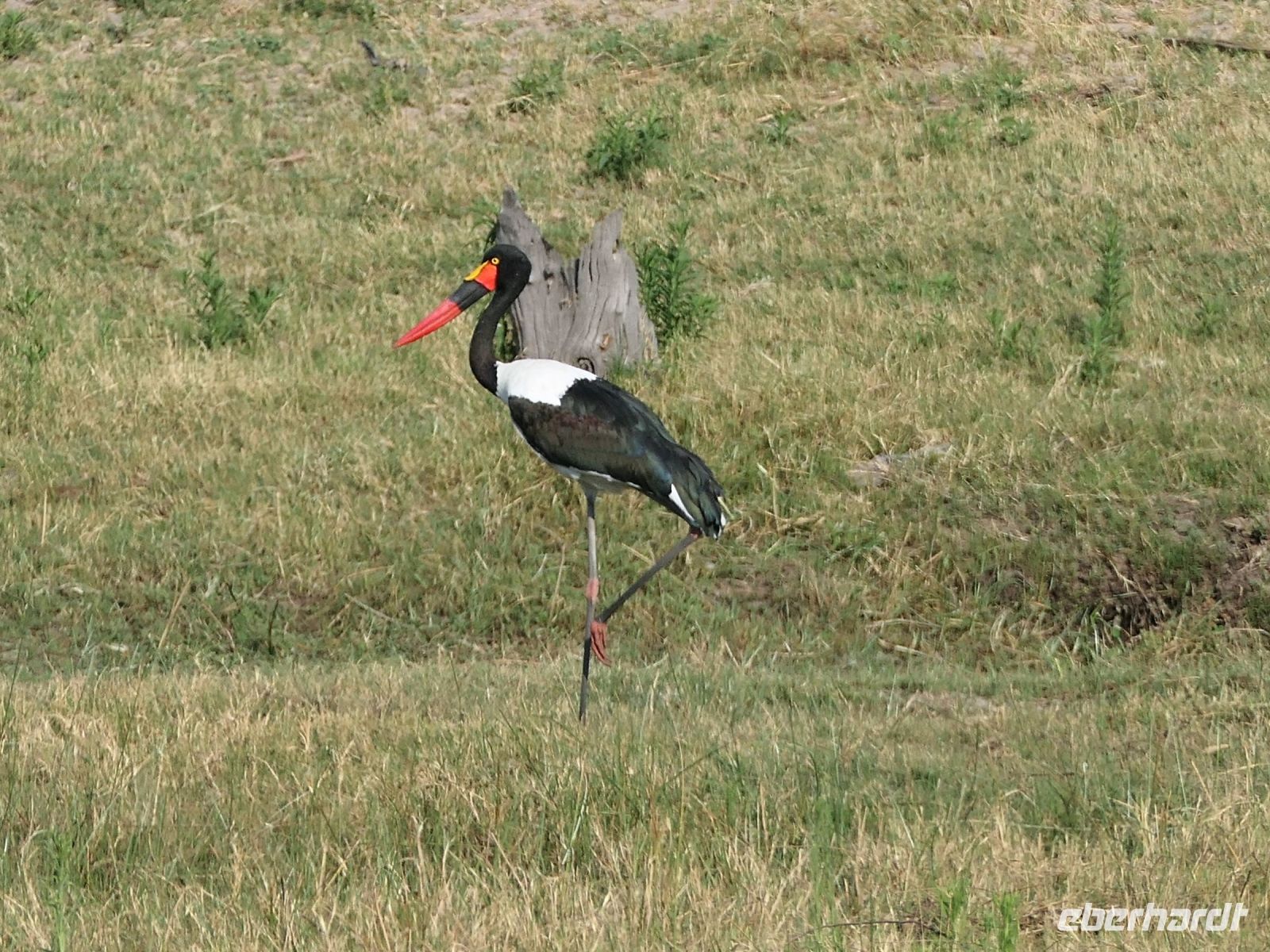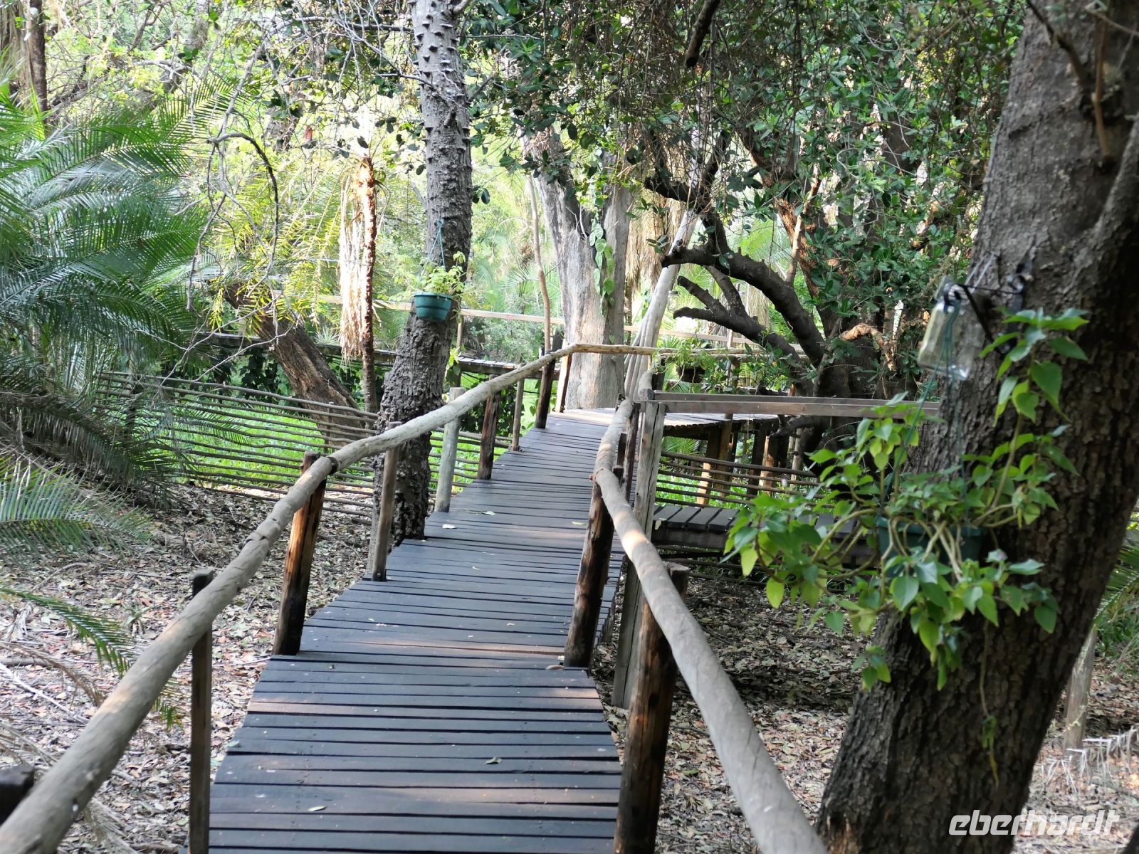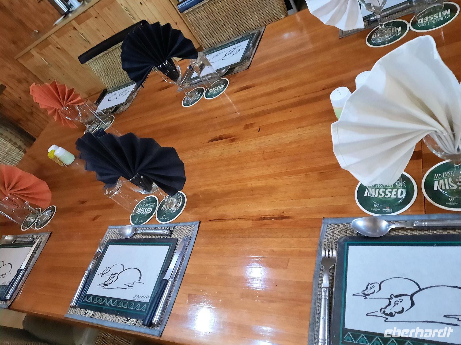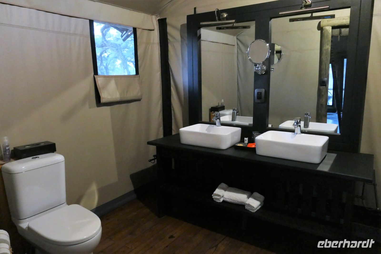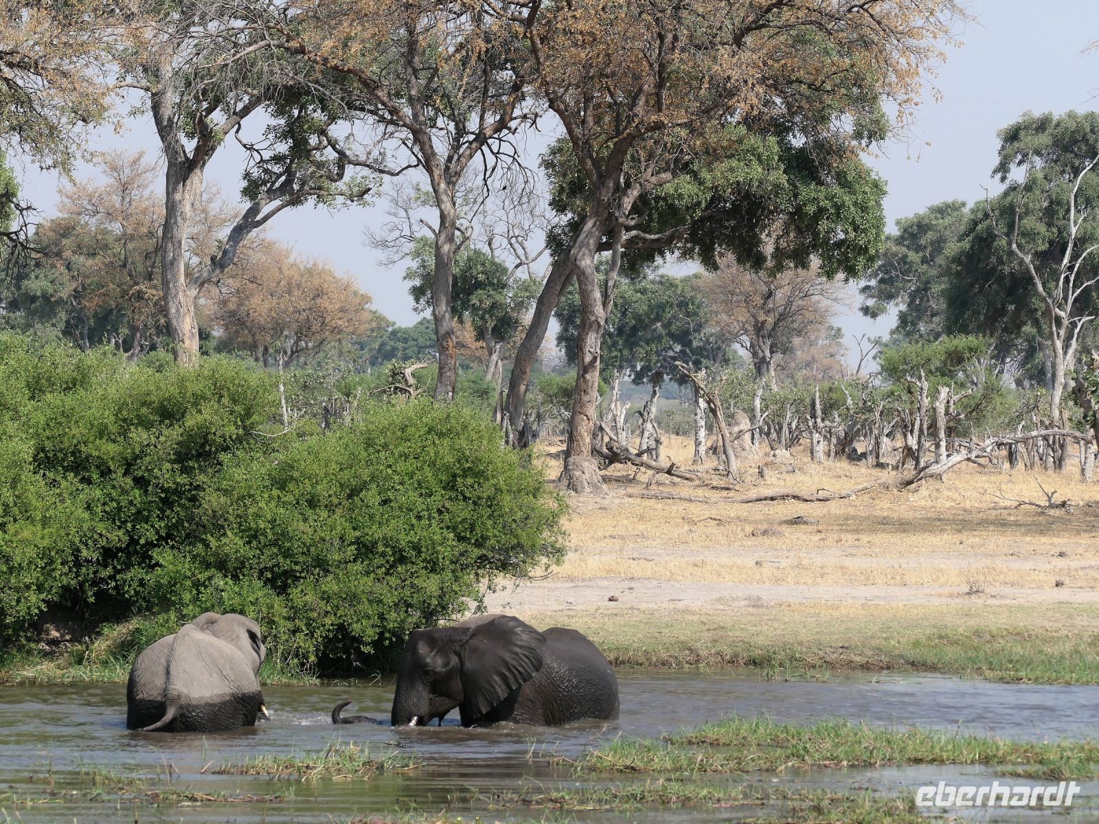 gut ausgestatteten Zeltchalets und hatten den weiteren Nachmittag hatten wir freie Zeit. Ein optionaler Mittagslunch entpuppte sich als Völlerei. Ein Gericht reichte absolut für zwei, so riesig waren die Portionen. Leider wurden Annett und Tutu erst beim Check In informiert, dass die geplante Bootstour am nächsten Nachmittag wegen dem extremen Niedrigwassers nicht stattfinden kann. Es war nicht möglich, von der Lodge zum Hauptarm des Chobes zu gelangen, der in Sichtweite der Lodge lag. Per Jeep war es nicht machbar, da der Hauptarm nur von botswanischer Seite erreichbar war und die Grenze 18 Uhr schließt. Alle hatten sich auf diese Bootsfahrt gefreut, aber Natur ist Natur. Dies kann vorkommen, aber eine rechtzeitigere Information der Lodge an uns oder unsere namibischen Partner wäre fairer gewesen, als uns vor vollendete Tatsachen zu stellen. So hätten wir die Chance gehabt, schon eher einen Alternativ-Plan zu schmieden. Tutu und Annett suchten gemeinsam nach Plan C. In Afrika muß man immer einen anderen Plan in der Tasche haben, der war auch später gefunden.