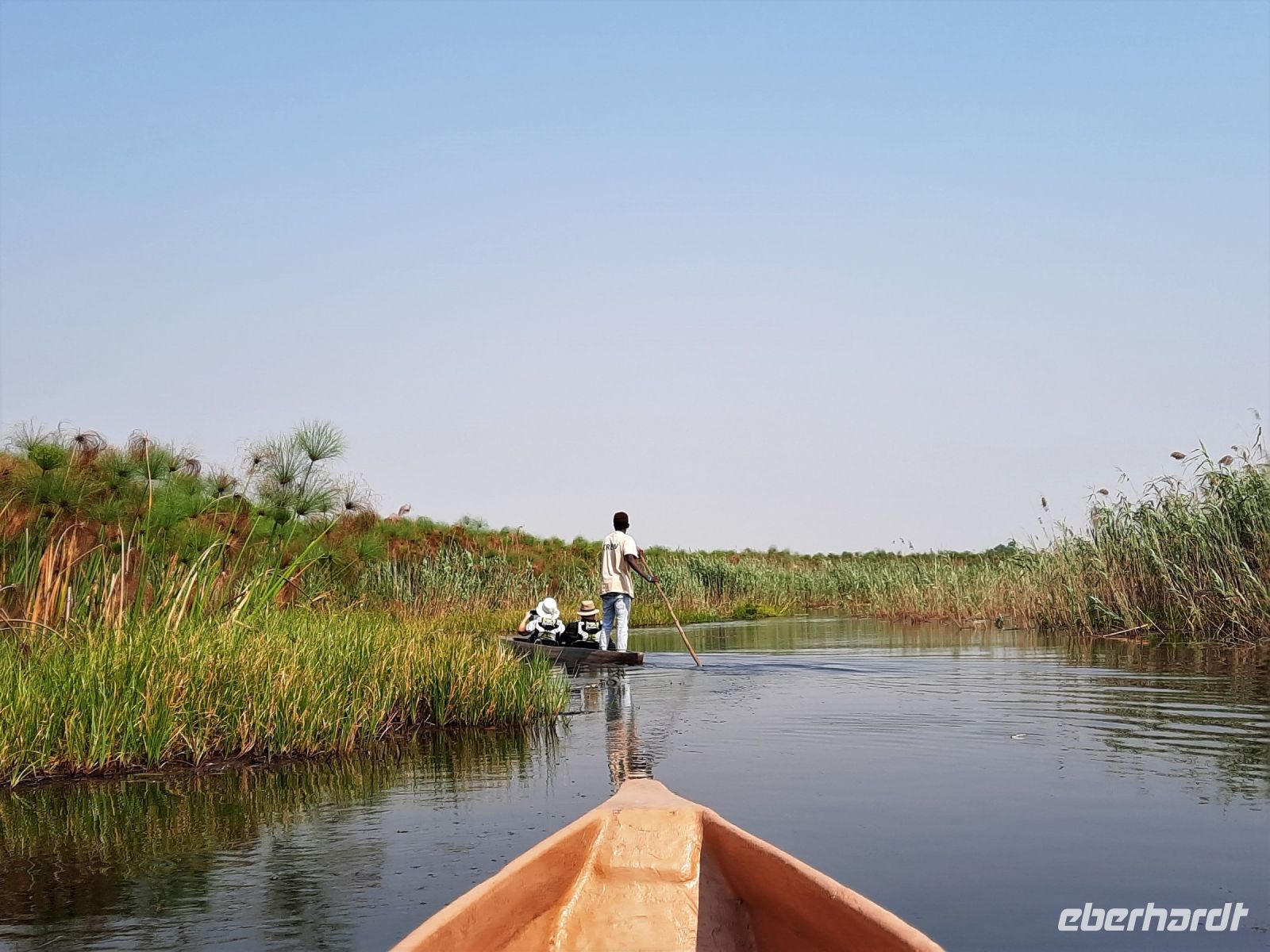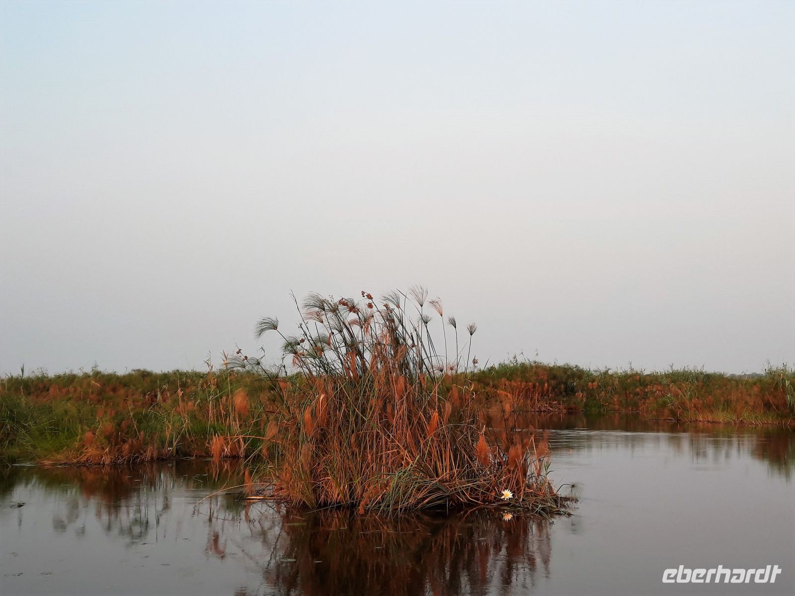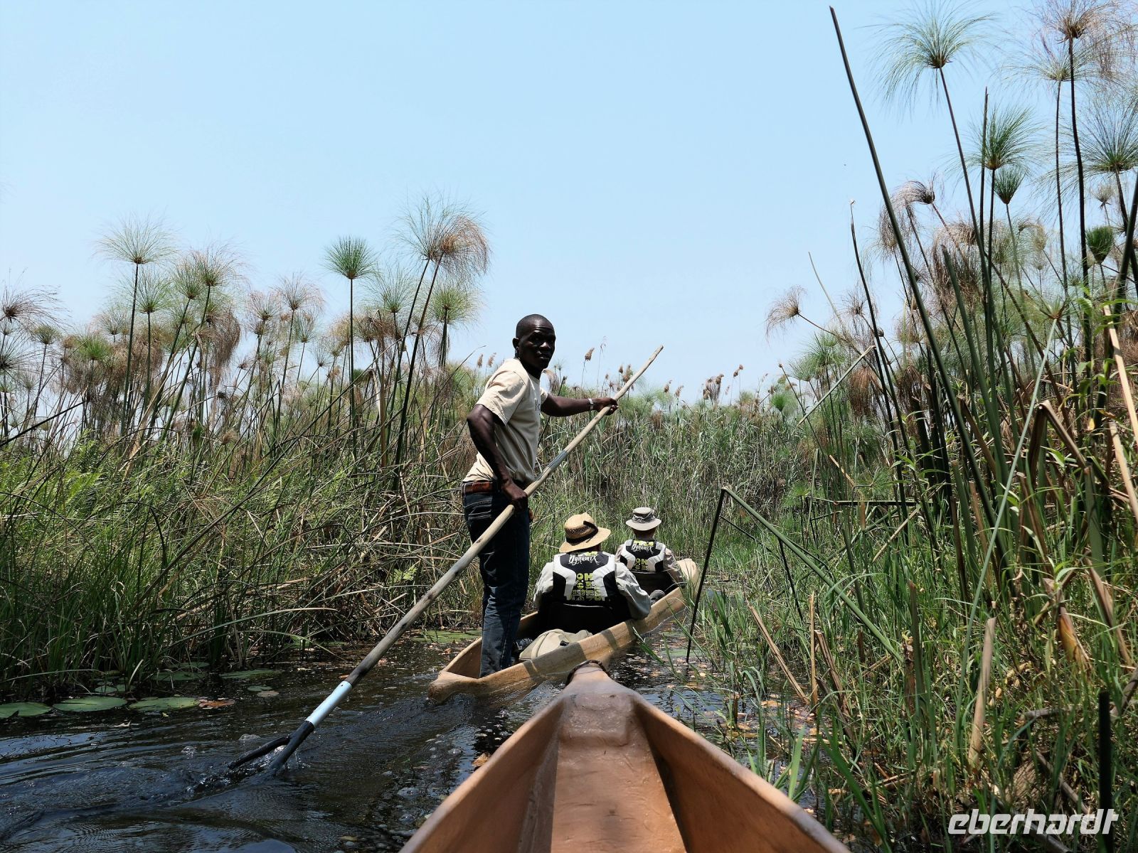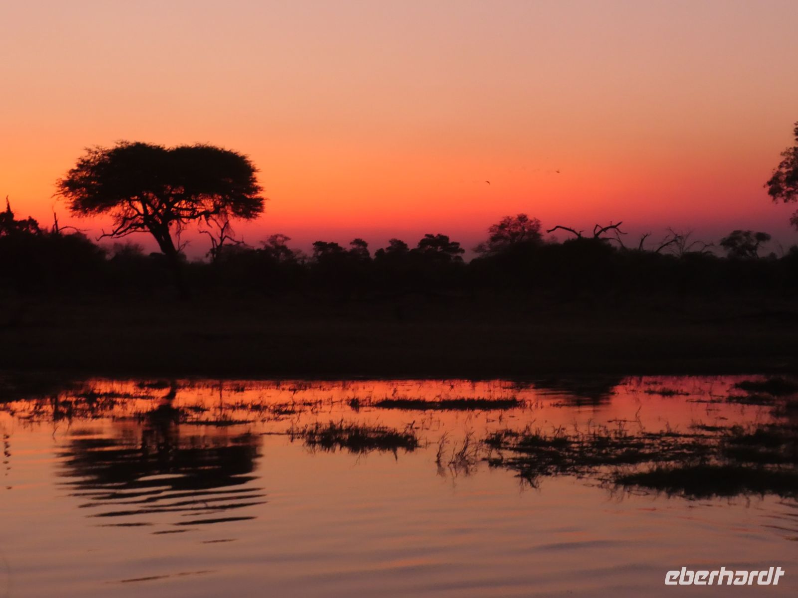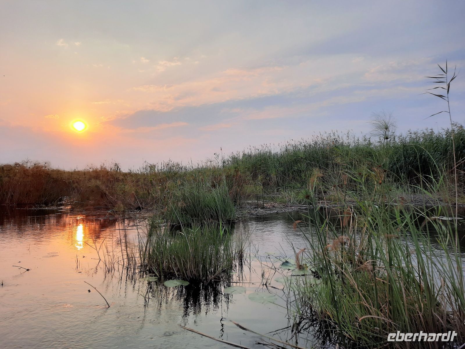Vom Zwitschern der Vögel wurden wir geweckt. Auch heute sollte es wieder sehr heiß werden. Deshalb verzichteten wir auf den geplanten Ausflug zu den Tsodilo Hills. Aufgrund der schlechten Straßen hätte die An- und Abreise dorthin wieder viel, viel Zeit in Anspruch genommen und in der heißen Mittagszeit, die imposante Hügelkette aus Quarzit auf einer Wanderung zu erkunden, wäre für alle zu anstrengend gewesen. In dem relativ kleinen Gebiet der Tsodilo Hills befinden sich viele, sehr gut erhaltene Felszeichnungen der San - ähnlich wie bei Twyfelfontein in Namibia, aber unzählige mehr (ca. 4.500). Die Tsodilo Hills gehören deshalb zu den UNESCO Weltkulturerbestätten. Für viele San-Buschmänner ist dieser Platz auch heute noch ein heiliger Ort und viele Legenden ragen sich um diese Hügel. Reisebegleitung Annett hatte bereits am Vorabend einen Plan B organisiert. Nach einem entspannten Frühstück begrüßte uns Josef und seine Jungs. Nach einer kurzen Briefing kleideten wir uns schick ein, mit farbenfrohen Schwimmwesten! Und auf ging`s zu einer relaxten Mokoro-Tour durch das Delta. Jeweils zu zweit kletterten wir in die flachen Boote (Mokoro) und werden vom Poler (Bootsführer) gestakt. Wir erfuhren, dass die Mokoros früher aus einem einzigen Holzstamm (meist vom Leberwurstbaum, dessen Früchte wirklich wie große Leberwürste aussehen) gefertigt wurden. Für die Fertigung brauchte man schon ein paar Wochen und die Lebensdauer der Boote war begrenzt. Daher werden die Mokoros heute meist aus Kunststoff gebaut. Das traditionelle Boot der Einheimischen im Delta und an den großen Flüssen ist auch heute noch unentbehrlich im täglichen Leben (Fischfang/Transport), also nicht nur um Touristen durchs Delta zu staken. Fast lautlos glitten wir durch die seichte, urwüchsige, mit Schilfgras bedeckte Landschaft, lauschten den Geräuschen der Natur. Josef, der Chef-Poler erklärte uns einige Dinge über das Delta, deren Wasserläufe und dessen Flora und Fauna. Auch konnten wir Spuren im und am Wasser sehen, Schneisen, die Elefanten und Hippos auf ihrem Weg ins Riedgras und Papyrus geschlagen hatten. Die Einheimischen kennen sich im Wasserlabyrinth sehr gut aus, für uns ein riesiger Irrgarten. Mal dicht bewachsene kleine Kanäle, mal größere freie Flächen, kleine Papyrus-Inselchen durchzogen das Wasser und einzelne weiß blühende Tages-Wasserlilien wirkten wie idyllische Farbtupfer. Die Haupt-Blütezeit der Wasserlilien ist im Februar, dann breiten sich die Lilien wie ein riesiger Teppich auf dem Wasser aus. Josef zeigte uns auch, was man mit Wasserlilien zu alles anstellen kann: der längste, biologisch abbaubare Strohhalm mit Filtersystem, auch essbar oder für dekorative Zwecke. Die Wasserlilie darf auch bei Feierlichkeiten wie Hochzeit der Geburt nicht fehlen. Dann verwandelt man das Blatt in einen eleganten Hut für den Bräutigam und schmückt die Braut mit einer anmutenden Halskette. Spontan wurde King K, Nr. 1 (kurz KK) und Queen L, die 1. zum Brautpaar des Tages gekürt. Auf einer der größeren Inseln stiegen wir später aus und unternahmen eine kleine Busch-Wanderung. Auch für eine stilvolle Harmonisierung wurde gesorgt, eigens für uns wurde eine Busch-Toilette gebaut. Auf der Rückfahrt raschelte und knackste es laut im Dickicht, einige konnten noch den grauen Rücken eines Elefanten erkennen, der sich durchs Delta fraß. Schnell zurück zur Lodge, wo ein Mittagsimbiss auf uns wartete. Am Nachmittag ging es noch einmal auf`s Wasser, allerdings mit einem Motorboot. Wir schipperten über die Lagune und durch die größeren Kanäle. Die geschulten Augen unserer Vogelexperten sichteten schnell Schlangenhalsvogel, Reiher, Bienenfresser und ein hübsches Eisvogel-Paar. Während die Sonne sich langsam vom Tag verabschiedete, servierten Barmann Tutu und Bardame Annett diverse Getränke aus der Bar. Nach dem wiederum schmackhaften Abendessen wollten wir noch einen kleinen Schlummertrunk mit Moskitoschutz zu uns nehmen, aber leider war der Tonic aus.