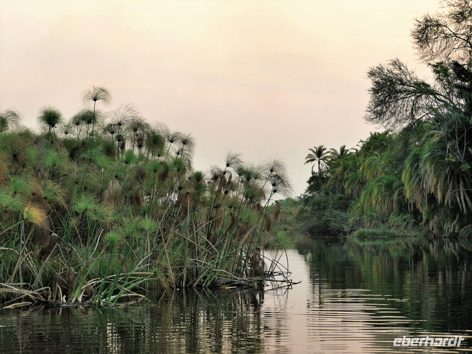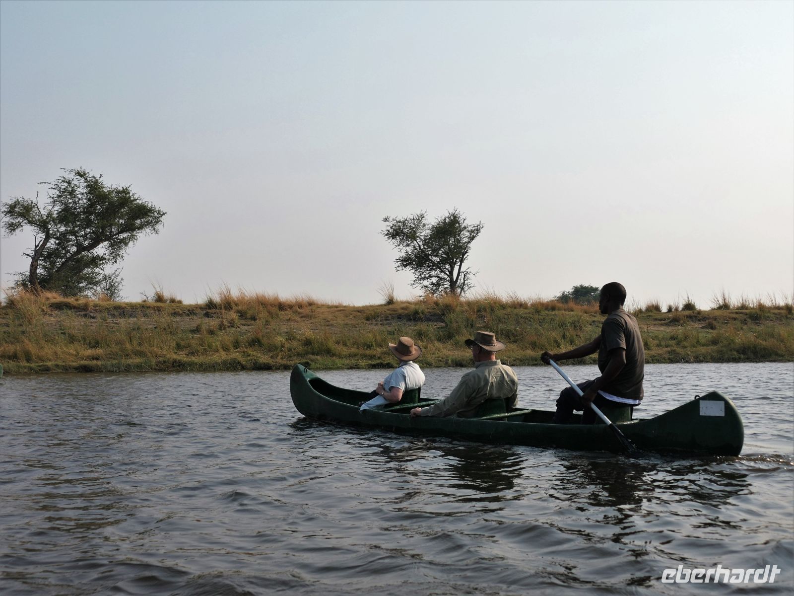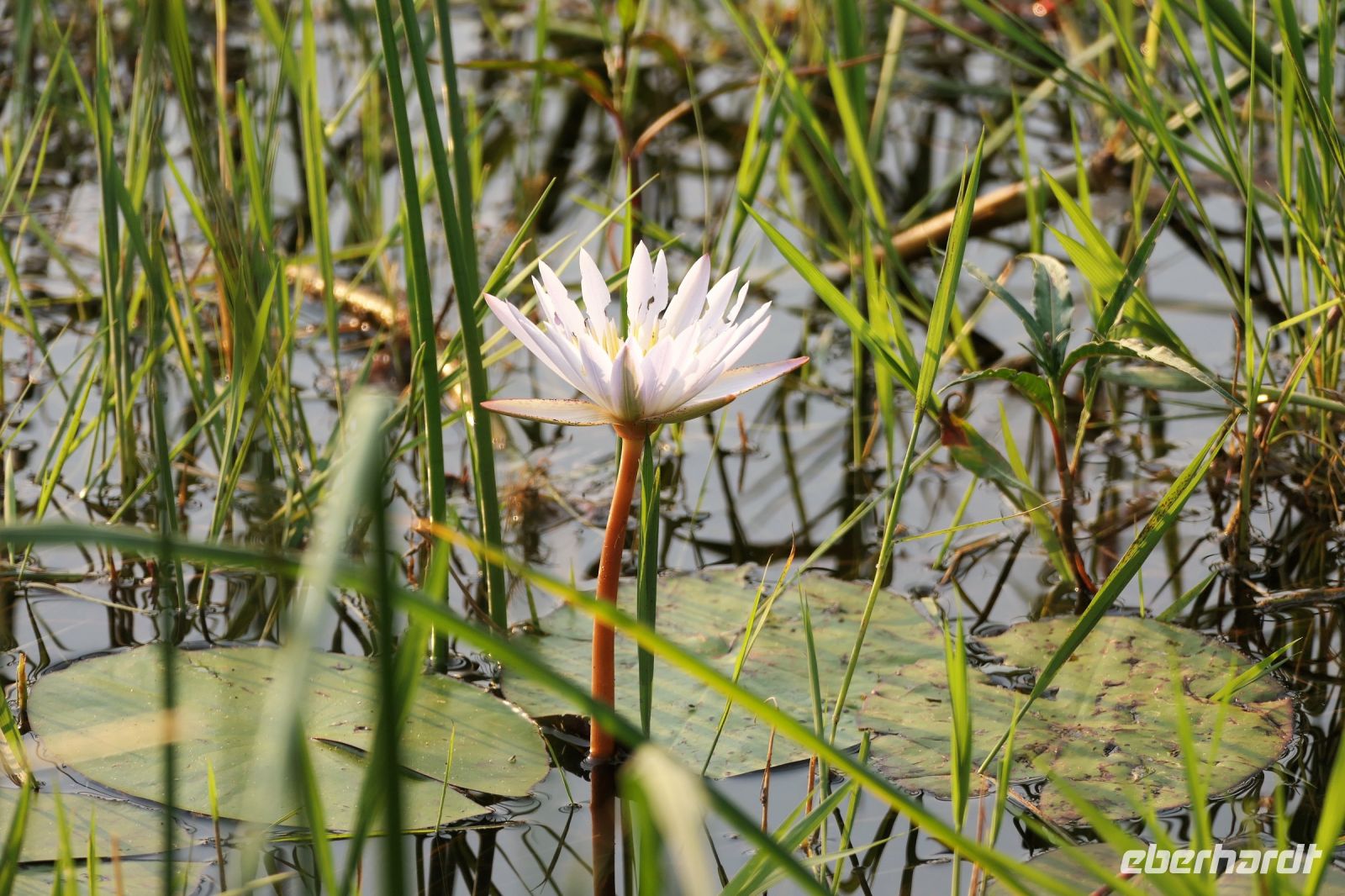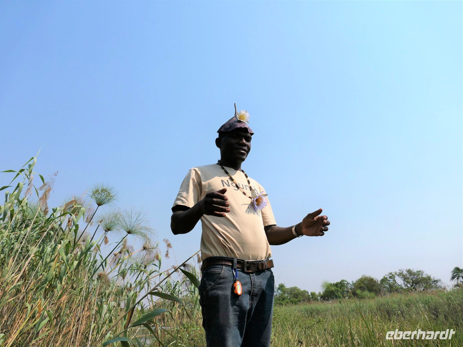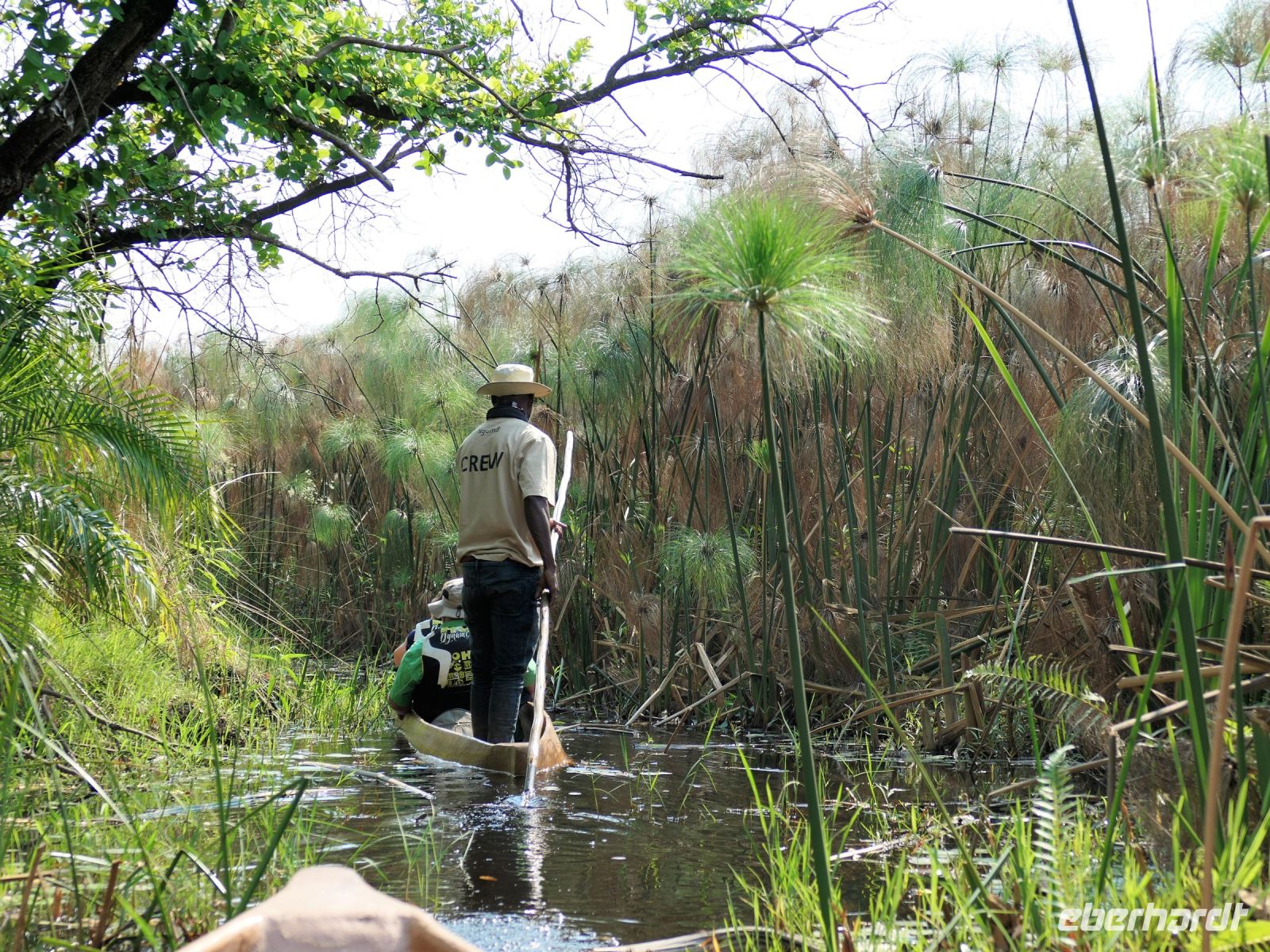 Vom Zwitschern der Vögel wurden wir geweckt. Auch heute sollte es wieder sehr heiß werden. Deshalb verzichteten wir auf den geplanten Ausflug zu den Tsodilo Hills. Aufgrund der schlechten Straßen hätte die An- und Abreise dorthin wieder viel, viel Zeit in Anspruch genommen und in der heißen Mittagszeit, die imposante Hügelkette aus Quarzit auf einer Wanderung zu erkunden, wäre für alle zu anstrengend gewesen. In dem relativ kleinen Gebiet der Tsodilo Hills befinden sich viele, sehr gut erhaltene Felszeichnungen der San - ähnlich wie bei Twyfelfontein in Namibia, aber unzählige mehr (ca. 4.500). Die Tsodilo Hills gehören deshalb zu den UNESCO Weltkulturerbestätten. Für viele San-Buschmänner ist dieser Platz auch heute noch ein heiliger Ort und viele Legenden ragen sich um diese Hügel. Reisebegleitung Annett hatte bereits am Vorabend einen Plan B organisiert. Nach einem entspannten Frühstück begrüßte uns Josef und seine Jungs. Nach einer kurzen Briefing kleideten wir uns schick ein, mit farbenfrohen Schwimmwesten! Und auf ging`s zu einer relaxten Mokoro-Tour durch das Delta. Jeweils zu zweit kletterten wir in die flachen Boote (Mokoro) und werden vom Poler (Bootsführer) gestakt. Wir erfuhren, dass die Mokoros früher aus einem einzigen Holzstamm (meist vom Leberwurstbaum, dessen Früchte wirklich wie große Leberwürste aussehen) gefertigt wurden. Für die Fertigung brauchte man schon ein paar Wochen und die Lebensdauer der Boote war begrenzt. Daher werden die Mokoros heute meist aus Kunststoff gebaut. Das traditionelle Boot der Einheimischen im Delta und an den großen Flüssen ist auch heute noch unentbehrlich im täglichen Leben (Fischfang/Transport), also nicht nur um Touristen durchs Delta zu staken. Fast lautlos glitten wir durch die seichte, urwüchsige, mit Schilfgras bedeckte Landschaft, lauschten den Geräuschen der Natur. Josef, der Chef-Poler erklärte uns einige Dinge über das Delta, deren Wasserläufe und dessen Flora und Fauna. Auch konnten wir Spuren im und am Wasser sehen, Schneisen, die Elefanten und Hippos auf ihrem Weg ins Riedgras und Papyrus geschlagen hatten. Die Einheimischen kennen sich im Wasserlabyrinth sehr gut aus, für uns ein riesiger Irrgarten. Mal dicht bewachsene kleine Kanäle, mal größere freie Flächen, kleine Papyrus-Inselchen durchzogen das Wasser und einzelne weiß blühende Tages-Wasserlilien wirkten wie idyllische Farbtupfer. Die Haupt-Blütezeit der Wasserlilien ist im Februar, dann breiten sich die Lilien wie ein riesiger Teppich auf dem Wasser aus. Josef zeigte uns auch, was man mit Wasserlilien zu alles anstellen kann: der längste, biologisch abbaubare Strohhalm mit Filtersystem, auch essbar oder für dekorative Zwecke. Die Wasserlilie darf auch bei Feierlichkeiten wie Hochzeit der Geburt nicht fehlen. Dann verwandelt man das Blatt in einen eleganten Hut für den Bräutigam und schmückt die Braut mit einer anmutenden Halskette. Spontan wurde King K, Nr. 1 (kurz KK) und Queen L, die 1. zum Brautpaar des Tages gekürt. Auf einer der größeren Inseln stiegen wir später aus und unternahmen eine kleine Busch-Wanderung. Auch für eine stilvolle Harmonisierung wurde gesorgt, eigens für uns wurde eine Busch-Toilette gebaut. Auf der Rückfahrt raschelte und knackste es laut im Dickicht, einige konnten noch den grauen Rücken eines Elefanten erkennen, der sich durchs Delta fraß. Schnell zurück zur Lodge, wo ein Mittagsimbiss auf uns wartete. Am Nachmittag ging es noch einmal auf`s Wasser, allerdings mit einem Motorboot. Wir schipperten über die Lagune und durch die größeren Kanäle. Die geschulten Augen unserer Vogelexperten sichteten schnell Schlangenhalsvogel, Reiher, Bienenfresser und ein hübsches Eisvogel-Paar. Während die Sonne sich langsam vom Tag verabschiedete, servierten Barmann Tutu und Bardame Annett diverse Getränke aus der Bar. Nach dem wiederum schmackhaften Abendessen wollten wir noch einen kleinen Schlummertrunk mit Moskitoschutz zu uns nehmen, aber leider war der Tonic aus.