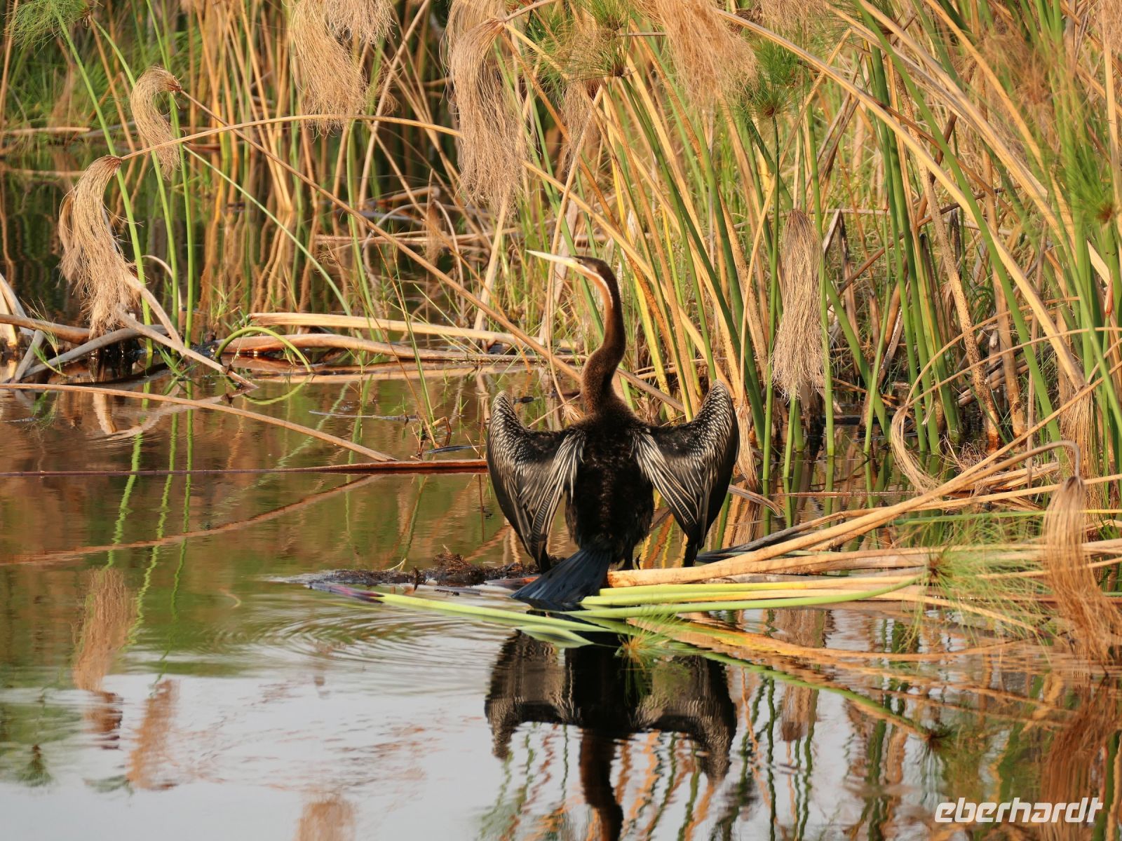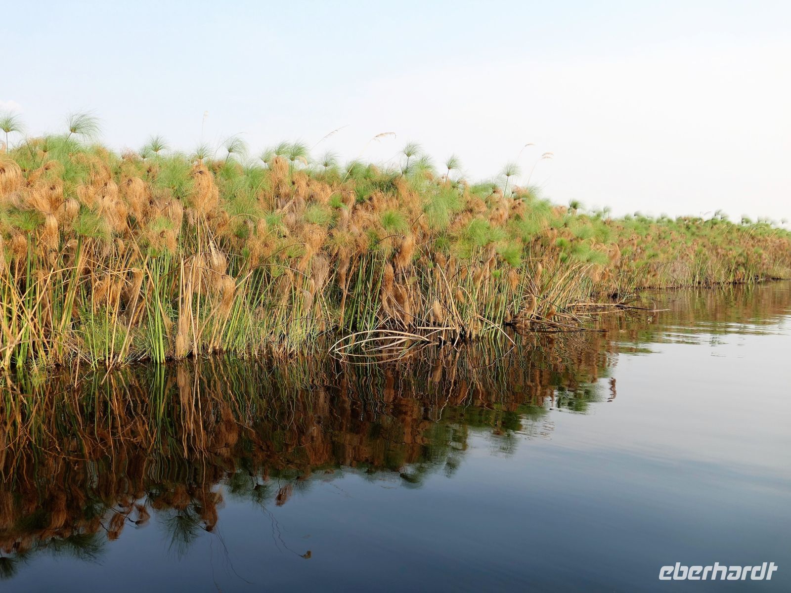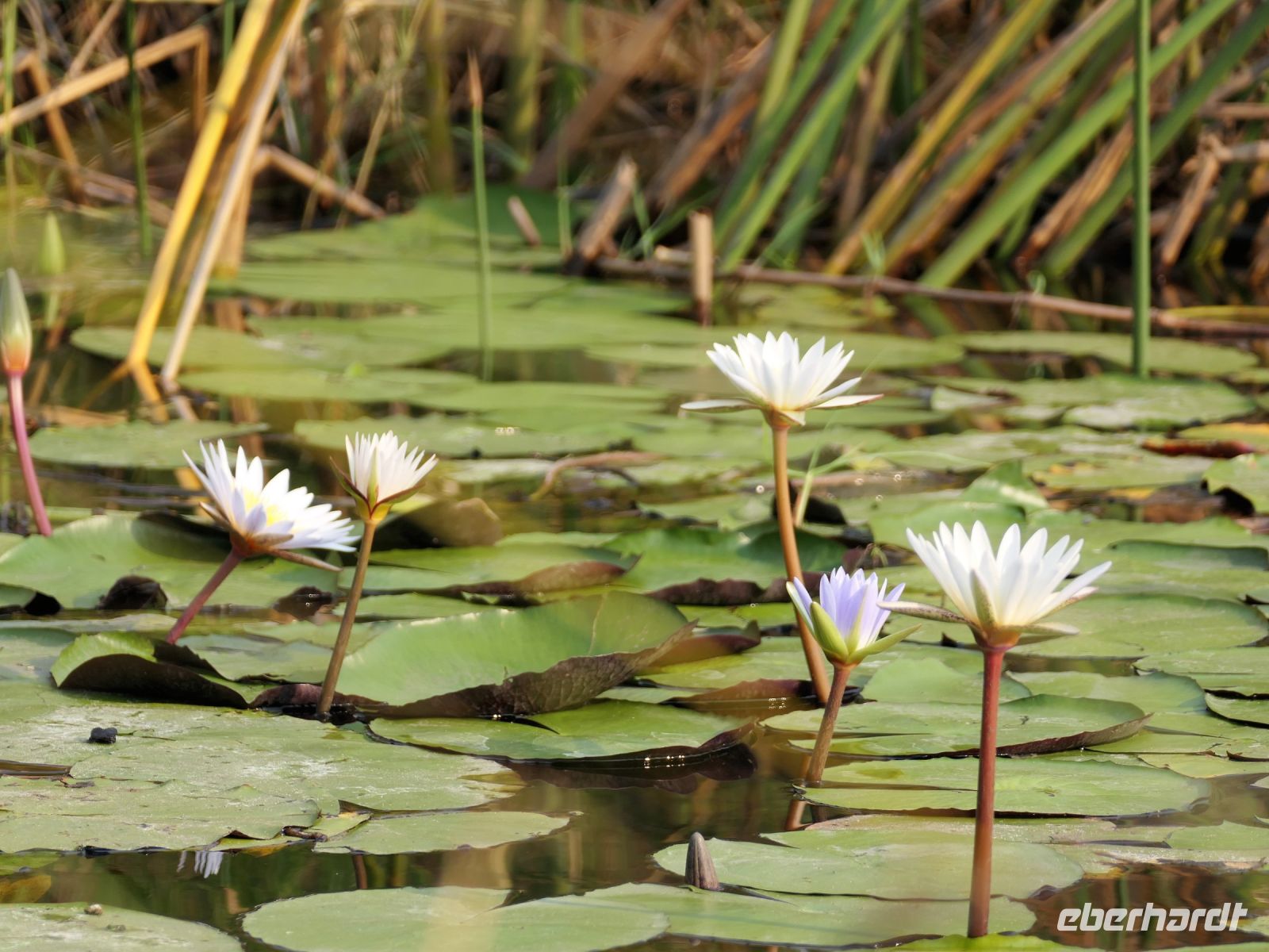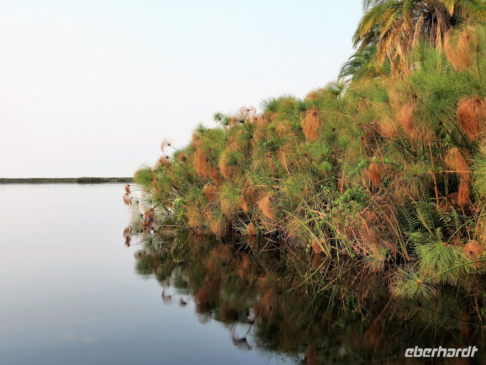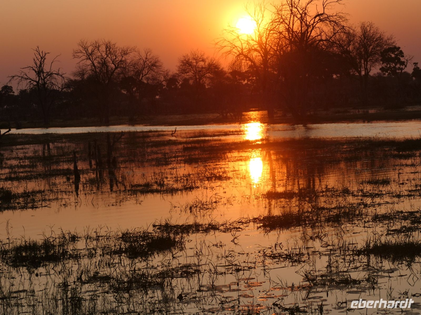 Vom Zwitschern der Vögel wurden wir geweckt. Auch heute sollte es wieder sehr heiß werden. Deshalb verzichteten wir auf den geplanten Ausflug zu den Tsodilo Hills. Aufgrund der schlechten Straßen hätte die An- und Abreise dorthin wieder viel, viel Zeit in Anspruch genommen und in der heißen Mittagszeit, die imposante Hügelkette aus Quarzit auf einer Wanderung zu erkunden, wäre für alle zu anstrengend gewesen. In dem relativ kleinen Gebiet der Tsodilo Hills befinden sich viele, sehr gut erhaltene Felszeichnungen der San - ähnlich wie bei Twyfelfontein in Namibia, aber unzählige mehr (ca. 4.500). Die Tsodilo Hills gehören deshalb zu den UNESCO Weltkulturerbestätten. Für viele San-Buschmänner ist dieser Platz auch heute noch ein heiliger Ort und viele Legenden ragen sich um diese Hügel. Reisebegleitung Annett hatte bereits am Vorabend einen Plan B organisiert. Nach einem entspannten Frühstück begrüßte uns Josef und seine Jungs. Nach einer kurzen Briefing kleideten wir uns schick ein, mit farbenfrohen Schwimmwesten! Und auf ging`s zu einer relaxten Mokoro-Tour durch das Delta. Jeweils zu zweit kletterten wir in die flachen Boote (Mokoro) und werden vom Poler (Bootsführer) gestakt. Wir erfuhren, dass die Mokoros früher aus einem einzigen Holzstamm (meist vom Leberwurstbaum, dessen Früchte wirklich wie große Leberwürste aussehen) gefertigt wurden. Für die Fertigung brauchte man schon ein paar Wochen und die Lebensdauer der Boote war begrenzt. Daher werden die Mokoros heute meist aus Kunststoff gebaut. Das traditionelle Boot der Einheimischen im Delta und an den großen Flüssen ist auch heute noch unentbehrlich im täglichen Leben (Fischfang/Transport), also nicht nur um Touristen durchs Delta zu staken. Fast lautlos glitten wir durch die seichte, urwüchsige, mit Schilfgras bedeckte Landschaft, lauschten den Geräuschen der Natur. Josef, der Chef-Poler erklärte uns einige Dinge über das Delta, deren Wasserläufe und dessen Flora und Fauna. Auch konnten wir Spuren im und am Wasser sehen, Schneisen, die Elefanten und Hippos auf ihrem Weg ins Riedgras und Papyrus geschlagen hatten. Die Einheimischen kennen sich im Wasserlabyrinth sehr gut aus, für uns ein riesiger Irrgarten. Mal dicht bewachsene kleine Kanäle, mal größere freie Flächen, kleine Papyrus-Inselchen durchzogen das Wasser und einzelne weiß blühende Tages-Wasserlilien wirkten wie idyllische Farbtupfer. Die Haupt-Blütezeit der Wasserlilien ist im Februar, dann breiten sich die Lilien wie ein riesiger Teppich auf dem Wasser aus. Josef zeigte uns auch, was man mit Wasserlilien zu alles anstellen kann: der längste, biologisch abbaubare Strohhalm mit Filtersystem, auch essbar oder für dekorative Zwecke. Die Wasserlilie darf auch bei Feierlichkeiten wie Hochzeit der Geburt nicht fehlen. Dann verwandelt man das Blatt in einen eleganten Hut für den Bräutigam und schmückt die Braut mit einer anmutenden Halskette. Spontan wurde King K, Nr. 1 (kurz KK) und Queen L, die 1. zum Brautpaar des Tages gekürt. Auf einer der größeren Inseln stiegen wir später aus und unternahmen eine kleine Busch-Wanderung. Auch für eine stilvolle Harmonisierung wurde gesorgt, eigens für uns wurde eine Busch-Toilette gebaut. Auf der Rückfahrt raschelte und knackste es laut im Dickicht, einige konnten noch den grauen Rücken eines Elefanten erkennen, der sich durchs Delta fraß. Schnell zurück zur Lodge, wo ein Mittagsimbiss auf uns wartete. Am Nachmittag ging es noch einmal auf`s Wasser, allerdings mit einem Motorboot. Wir schipperten über die Lagune und durch die größeren Kanäle. Die geschulten Augen unserer Vogelexperten sichteten schnell Schlangenhalsvogel, Reiher, Bienenfresser und ein hübsches Eisvogel-Paar. Während die Sonne sich langsam vom Tag verabschiedete, servierten Barmann Tutu und Bardame Annett diverse Getränke aus der Bar. Nach dem wiederum schmackhaften Abendessen wollten wir noch einen kleinen Schlummertrunk mit Moskitoschutz zu uns nehmen, aber leider war der Tonic aus.