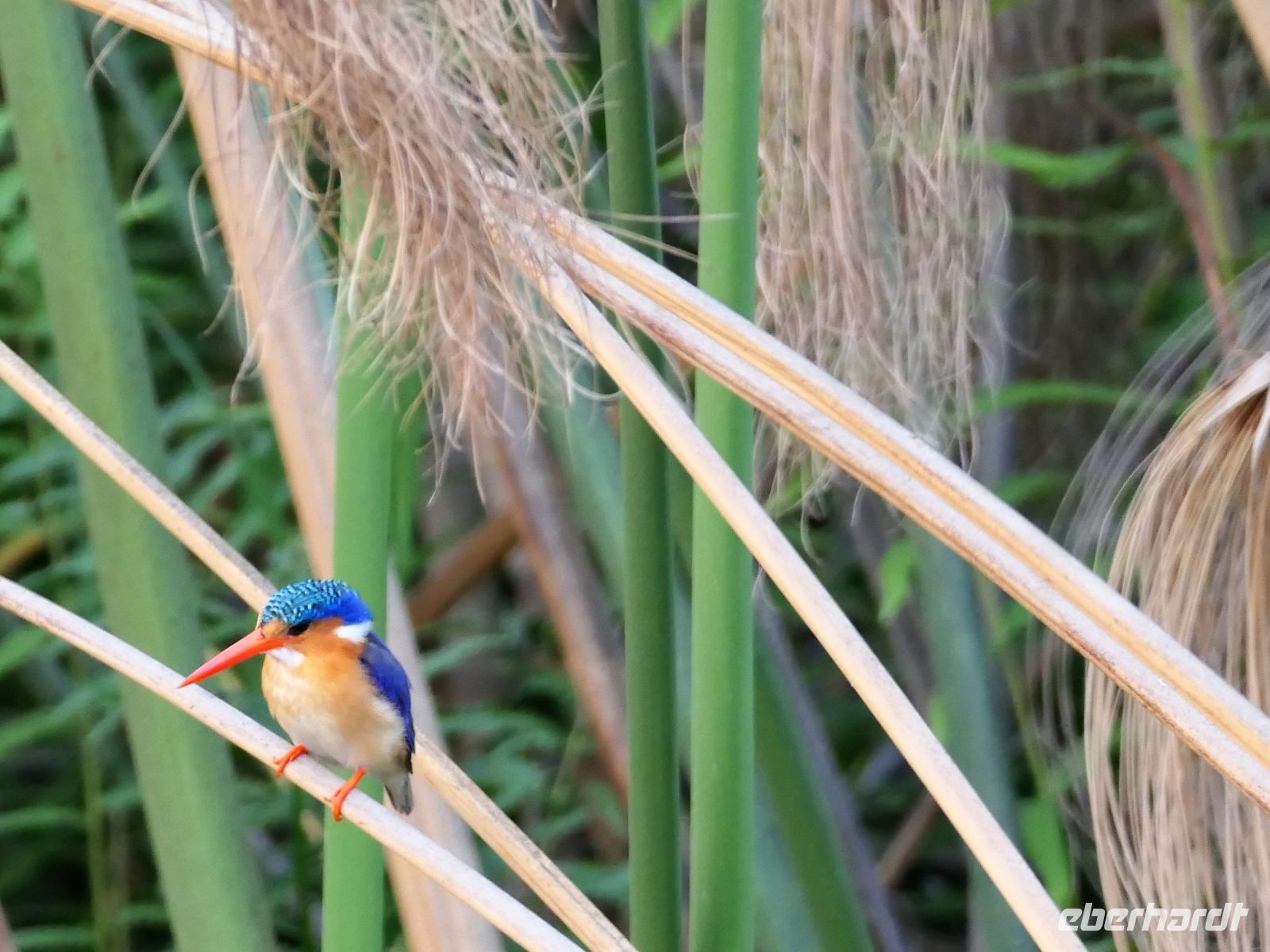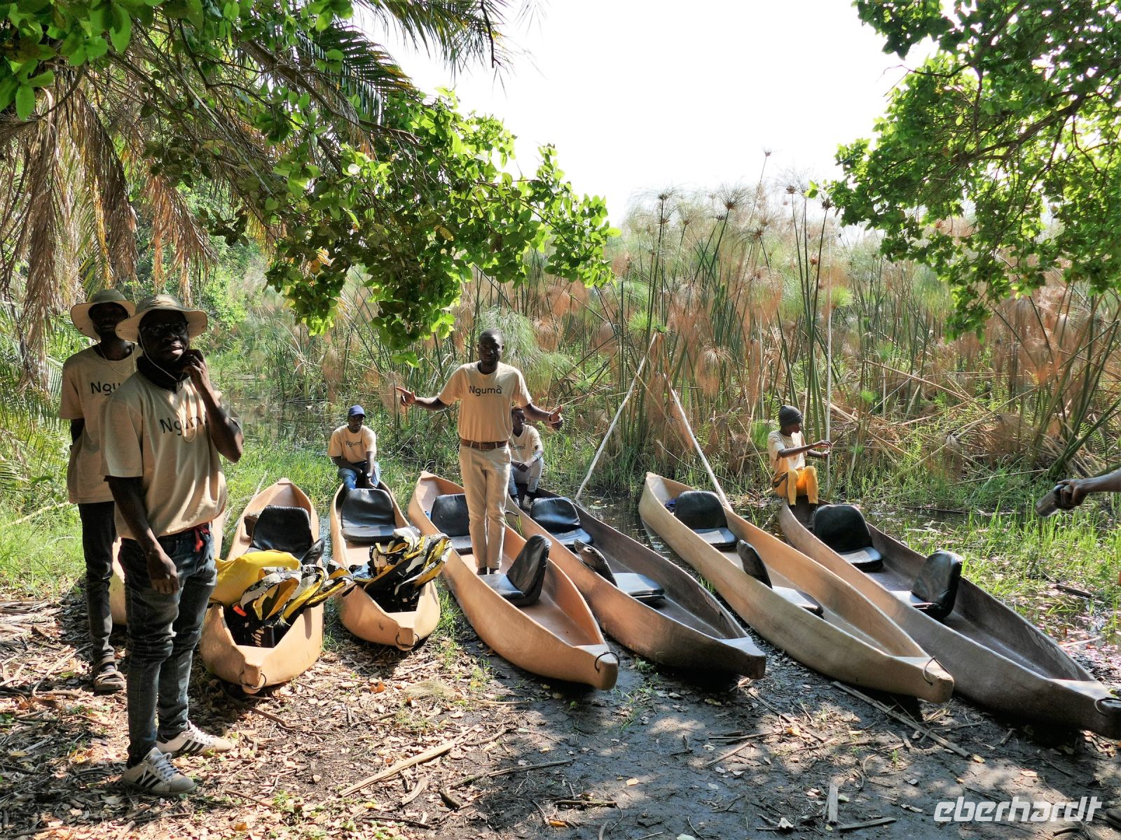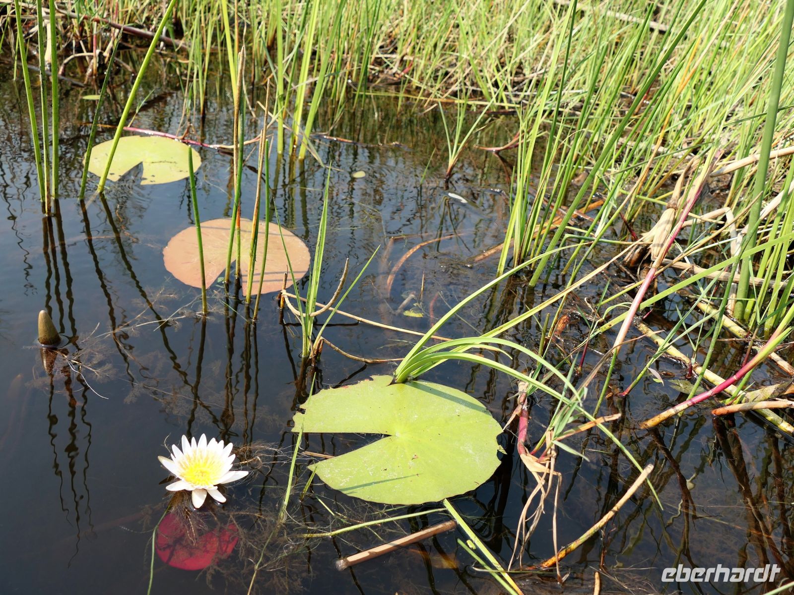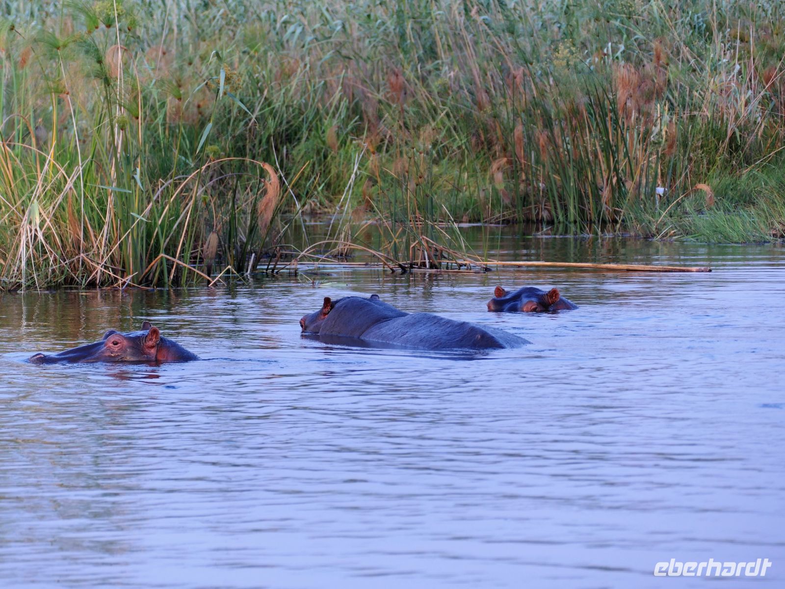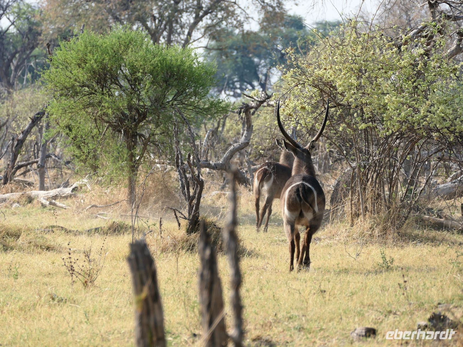 Vom Zwitschern der Vögel wurden wir geweckt. Auch heute sollte es wieder sehr heiß werden. Deshalb verzichteten wir auf den geplanten Ausflug zu den Tsodilo Hills. Aufgrund der schlechten Straßen hätte die An- und Abreise dorthin wieder viel, viel Zeit in Anspruch genommen und in der heißen Mittagszeit, die imposante Hügelkette aus Quarzit auf einer Wanderung zu erkunden, wäre für alle zu anstrengend gewesen. In dem relativ kleinen Gebiet der Tsodilo Hills befinden sich viele, sehr gut erhaltene Felszeichnungen der San - ähnlich wie bei Twyfelfontein in Namibia, aber unzählige mehr (ca. 4.500). Die Tsodilo Hills gehören deshalb zu den UNESCO Weltkulturerbestätten. Für viele San-Buschmänner ist dieser Platz auch heute noch ein heiliger Ort und viele Legenden ragen sich um diese Hügel. Reisebegleitung Annett hatte bereits am Vorabend einen Plan B organisiert. Nach einem entspannten Frühstück begrüßte uns Josef und seine Jungs. Nach einer kurzen Briefing kleideten wir uns schick ein, mit farbenfrohen Schwimmwesten! Und auf ging`s zu einer relaxten Mokoro-Tour durch das Delta. Jeweils zu zweit kletterten wir in die flachen Boote (Mokoro) und werden vom Poler (Bootsführer) gestakt. Wir erfuhren, dass die Mokoros früher aus einem einzigen Holzstamm (meist vom Leberwurstbaum, dessen Früchte wirklich wie große Leberwürste aussehen) gefertigt wurden. Für die Fertigung brauchte man schon ein paar Wochen und die Lebensdauer der Boote war begrenzt. Daher werden die Mokoros heute meist aus Kunststoff gebaut. Das traditionelle Boot der Einheimischen im Delta und an den großen Flüssen ist auch heute noch unentbehrlich im täglichen Leben (Fischfang/Transport), also nicht nur um Touristen durchs Delta zu staken. Fast lautlos glitten wir durch die seichte, urwüchsige, mit Schilfgras bedeckte Landschaft, lauschten den Geräuschen der Natur. Josef, der Chef-Poler erklärte uns einige Dinge über das Delta, deren Wasserläufe und dessen Flora und Fauna. Auch konnten wir Spuren im und am Wasser sehen, Schneisen, die Elefanten und Hippos auf ihrem Weg ins Riedgras und Papyrus geschlagen hatten. Die Einheimischen kennen sich im Wasserlabyrinth sehr gut aus, für uns ein riesiger Irrgarten. Mal dicht bewachsene kleine Kanäle, mal größere freie Flächen, kleine Papyrus-Inselchen durchzogen das Wasser und einzelne weiß blühende Tages-Wasserlilien wirkten wie idyllische Farbtupfer. Die Haupt-Blütezeit der Wasserlilien ist im Februar, dann breiten sich die Lilien wie ein riesiger Teppich auf dem Wasser aus. Josef zeigte uns auch, was man mit Wasserlilien zu alles anstellen kann: der längste, biologisch abbaubare Strohhalm mit Filtersystem, auch essbar oder für dekorative Zwecke. Die Wasserlilie darf auch bei Feierlichkeiten wie Hochzeit der Geburt nicht fehlen. Dann verwandelt man das Blatt in einen eleganten Hut für den Bräutigam und schmückt die Braut mit einer anmutenden Halskette. Spontan wurde King K, Nr. 1 (kurz KK) und Queen L, die 1. zum Brautpaar des Tages gekürt. Auf einer der größeren Inseln stiegen wir später aus und unternahmen eine kleine Busch-Wanderung. Auch für eine stilvolle Harmonisierung wurde gesorgt, eigens für uns wurde eine Busch-Toilette gebaut. Auf der Rückfahrt raschelte und knackste es laut im Dickicht, einige konnten noch den grauen Rücken eines Elefanten erkennen, der sich durchs Delta fraß. Schnell zurück zur Lodge, wo ein Mittagsimbiss auf uns wartete. Am Nachmittag ging es noch einmal auf`s Wasser, allerdings mit einem Motorboot. Wir schipperten über die Lagune und durch die größeren Kanäle. Die geschulten Augen unserer Vogelexperten sichteten schnell Schlangenhalsvogel, Reiher, Bienenfresser und ein hübsches Eisvogel-Paar. Während die Sonne sich langsam vom Tag verabschiedete, servierten Barmann Tutu und Bardame Annett diverse Getränke aus der Bar. Nach dem wiederum schmackhaften Abendessen wollten wir noch einen kleinen Schlummertrunk mit Moskitoschutz zu uns nehmen, aber leider war der Tonic aus.