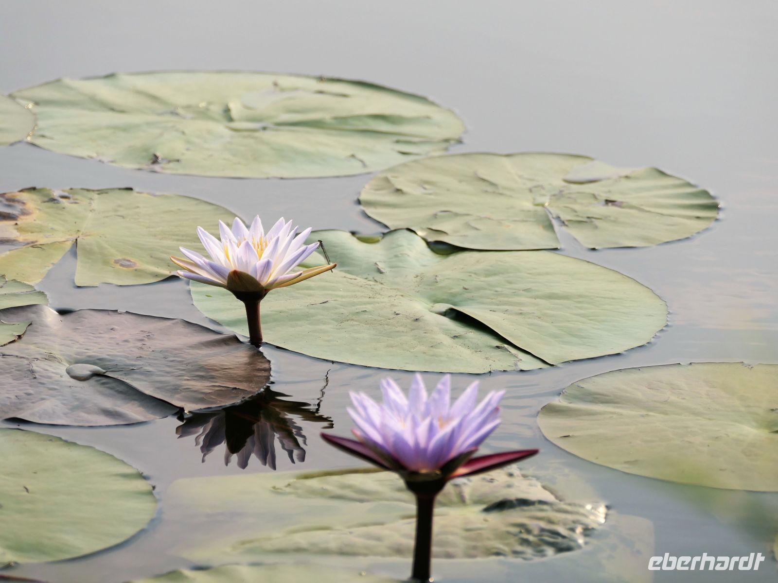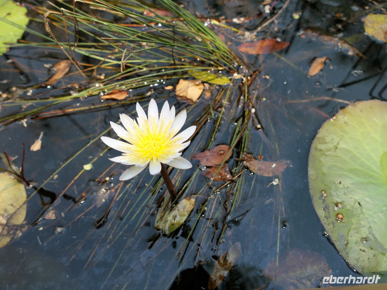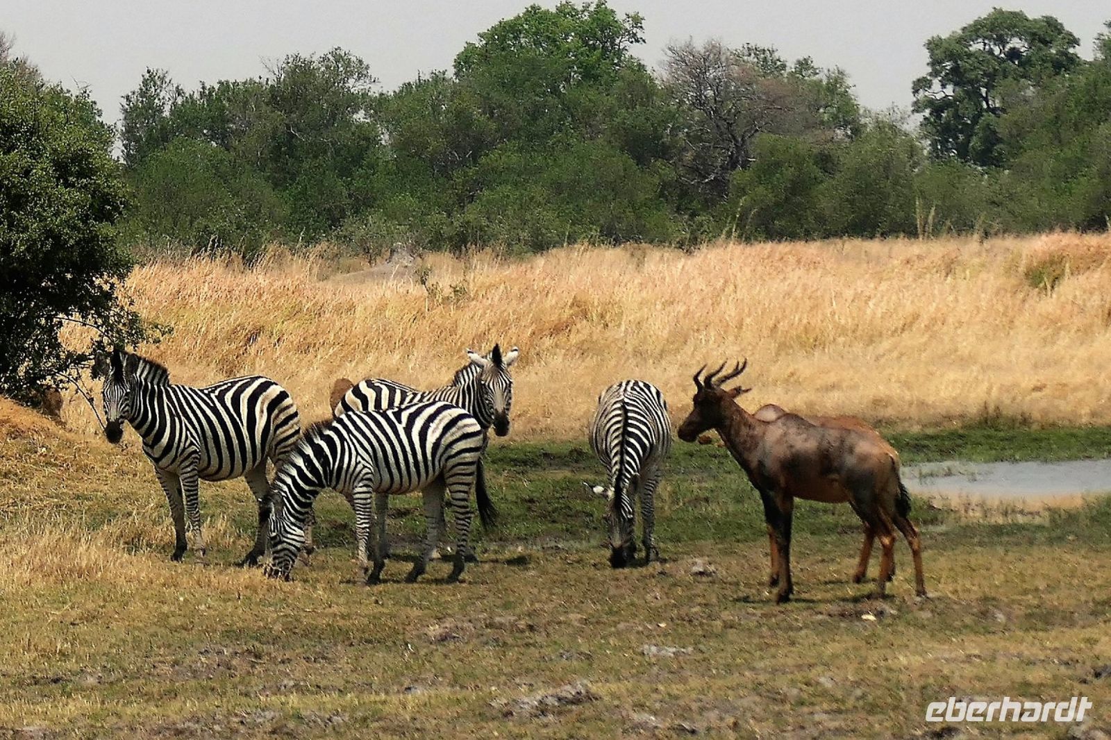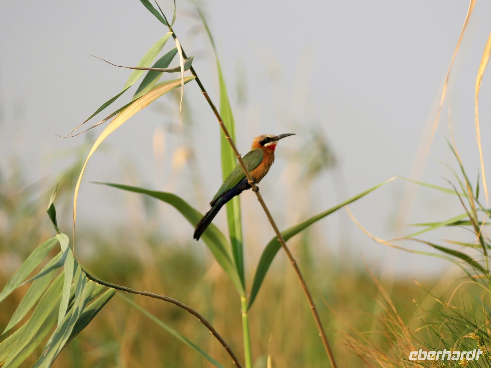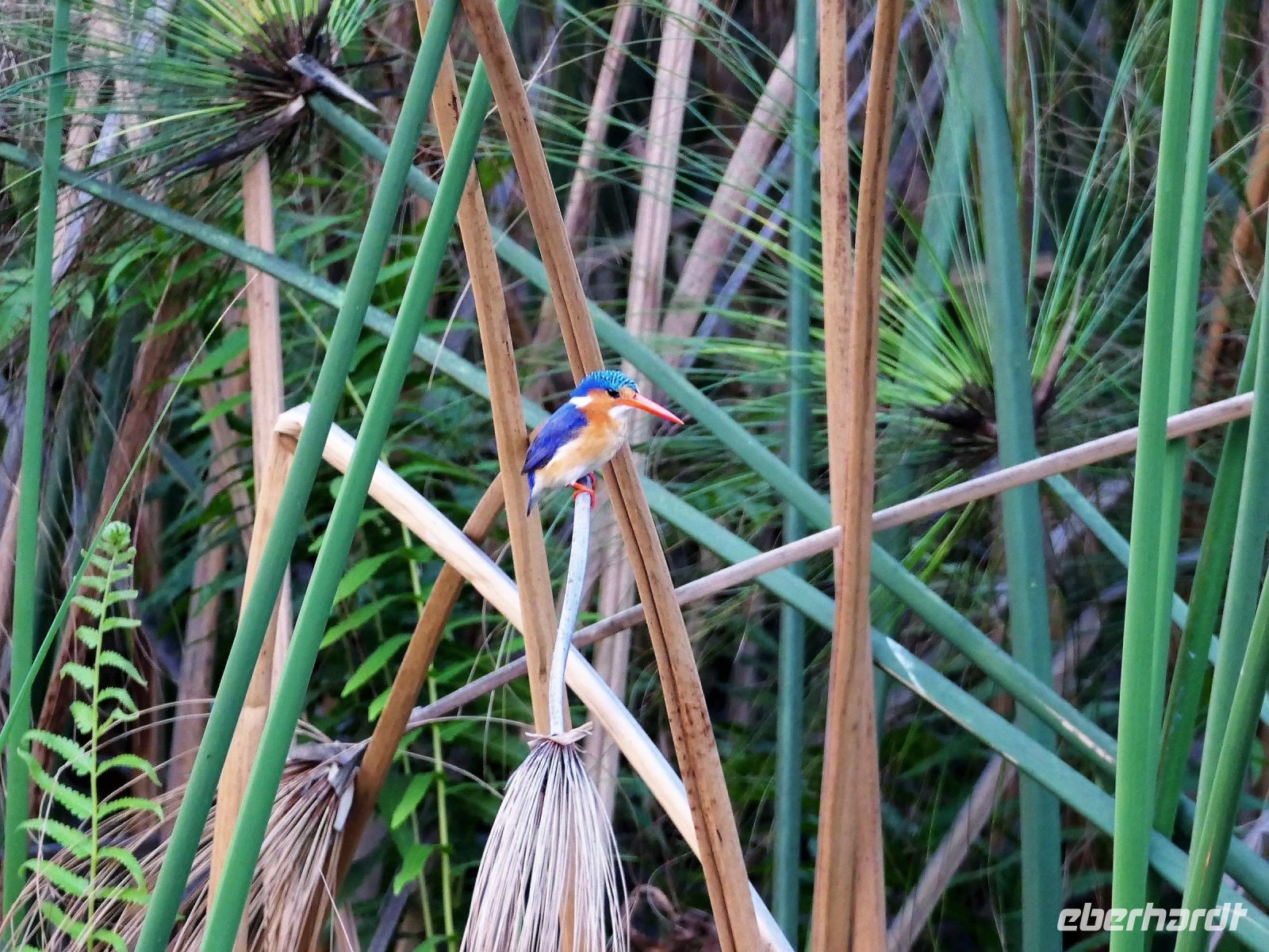 Vom Zwitschern der Vögel wurden wir geweckt. Auch heute sollte es wieder sehr heiß werden. Deshalb verzichteten wir auf den geplanten Ausflug zu den Tsodilo Hills. Aufgrund der schlechten Straßen hätte die An- und Abreise dorthin wieder viel, viel Zeit in Anspruch genommen und in der heißen Mittagszeit, die imposante Hügelkette aus Quarzit auf einer Wanderung zu erkunden, wäre für alle zu anstrengend gewesen. In dem relativ kleinen Gebiet der Tsodilo Hills befinden sich viele, sehr gut erhaltene Felszeichnungen der San - ähnlich wie bei Twyfelfontein in Namibia, aber unzählige mehr (ca. 4.500). Die Tsodilo Hills gehören deshalb zu den UNESCO Weltkulturerbestätten. Für viele San-Buschmänner ist dieser Platz auch heute noch ein heiliger Ort und viele Legenden ragen sich um diese Hügel. Reisebegleitung Annett hatte bereits am Vorabend einen Plan B organisiert. Nach einem entspannten Frühstück begrüßte uns Josef und seine Jungs. Nach einer kurzen Briefing kleideten wir uns schick ein, mit farbenfrohen Schwimmwesten! Und auf ging`s zu einer relaxten Mokoro-Tour durch das Delta. Jeweils zu zweit kletterten wir in die flachen Boote (Mokoro) und werden vom Poler (Bootsführer) gestakt. Wir erfuhren, dass die Mokoros früher aus einem einzigen Holzstamm (meist vom Leberwurstbaum, dessen Früchte wirklich wie große Leberwürste aussehen) gefertigt wurden. Für die Fertigung brauchte man schon ein paar Wochen und die Lebensdauer der Boote war begrenzt. Daher werden die Mokoros heute meist aus Kunststoff gebaut. Das traditionelle Boot der Einheimischen im Delta und an den großen Flüssen ist auch heute noch unentbehrlich im täglichen Leben (Fischfang/Transport), also nicht nur um Touristen durchs Delta zu staken. Fast lautlos glitten wir durch die seichte, urwüchsige, mit Schilfgras bedeckte Landschaft, lauschten den Geräuschen der Natur. Josef, der Chef-Poler erklärte uns einige Dinge über das Delta, deren Wasserläufe und dessen Flora und Fauna. Auch konnten wir Spuren im und am Wasser sehen, Schneisen, die Elefanten und Hippos auf ihrem Weg ins Riedgras und Papyrus geschlagen hatten. Die Einheimischen kennen sich im Wasserlabyrinth sehr gut aus, für uns ein riesiger Irrgarten. Mal dicht bewachsene kleine Kanäle, mal größere freie Flächen, kleine Papyrus-Inselchen durchzogen das Wasser und einzelne weiß blühende Tages-Wasserlilien wirkten wie idyllische Farbtupfer. Die Haupt-Blütezeit der Wasserlilien ist im Februar, dann breiten sich die Lilien wie ein riesiger Teppich auf dem Wasser aus. Josef zeigte uns auch, was man mit Wasserlilien zu alles anstellen kann: der längste, biologisch abbaubare Strohhalm mit Filtersystem, auch essbar oder für dekorative Zwecke. Die Wasserlilie darf auch bei Feierlichkeiten wie Hochzeit der Geburt nicht fehlen. Dann verwandelt man das Blatt in einen eleganten Hut für den Bräutigam und schmückt die Braut mit einer anmutenden Halskette. Spontan wurde King K, Nr. 1 (kurz KK) und Queen L, die 1. zum Brautpaar des Tages gekürt. Auf einer der größeren Inseln stiegen wir später aus und unternahmen eine kleine Busch-Wanderung. Auch für eine stilvolle Harmonisierung wurde gesorgt, eigens für uns wurde eine Busch-Toilette gebaut. Auf der Rückfahrt raschelte und knackste es laut im Dickicht, einige konnten noch den grauen Rücken eines Elefanten erkennen, der sich durchs Delta fraß. Schnell zurück zur Lodge, wo ein Mittagsimbiss auf uns wartete. Am Nachmittag ging es noch einmal auf`s Wasser, allerdings mit einem Motorboot. Wir schipperten über die Lagune und durch die größeren Kanäle. Die geschulten Augen unserer Vogelexperten sichteten schnell Schlangenhalsvogel, Reiher, Bienenfresser und ein hübsches Eisvogel-Paar. Während die Sonne sich langsam vom Tag verabschiedete, servierten Barmann Tutu und Bardame Annett diverse Getränke aus der Bar. Nach dem wiederum schmackhaften Abendessen wollten wir noch einen kleinen Schlummertrunk mit Moskitoschutz zu uns nehmen, aber leider war der Tonic aus.