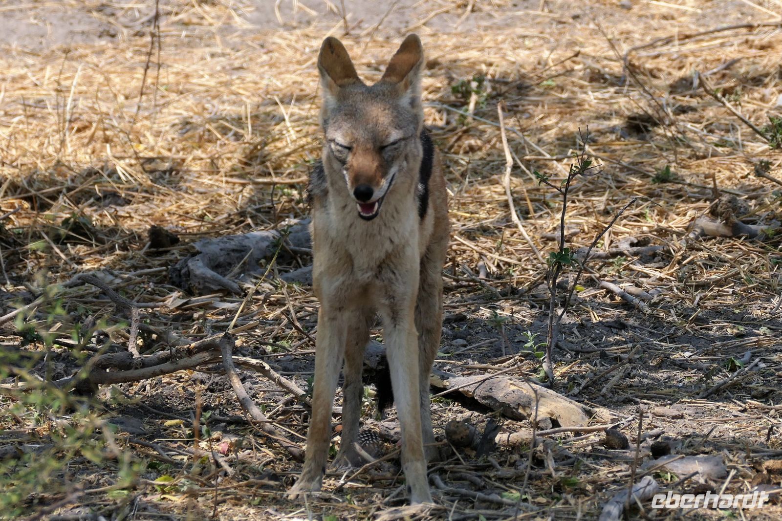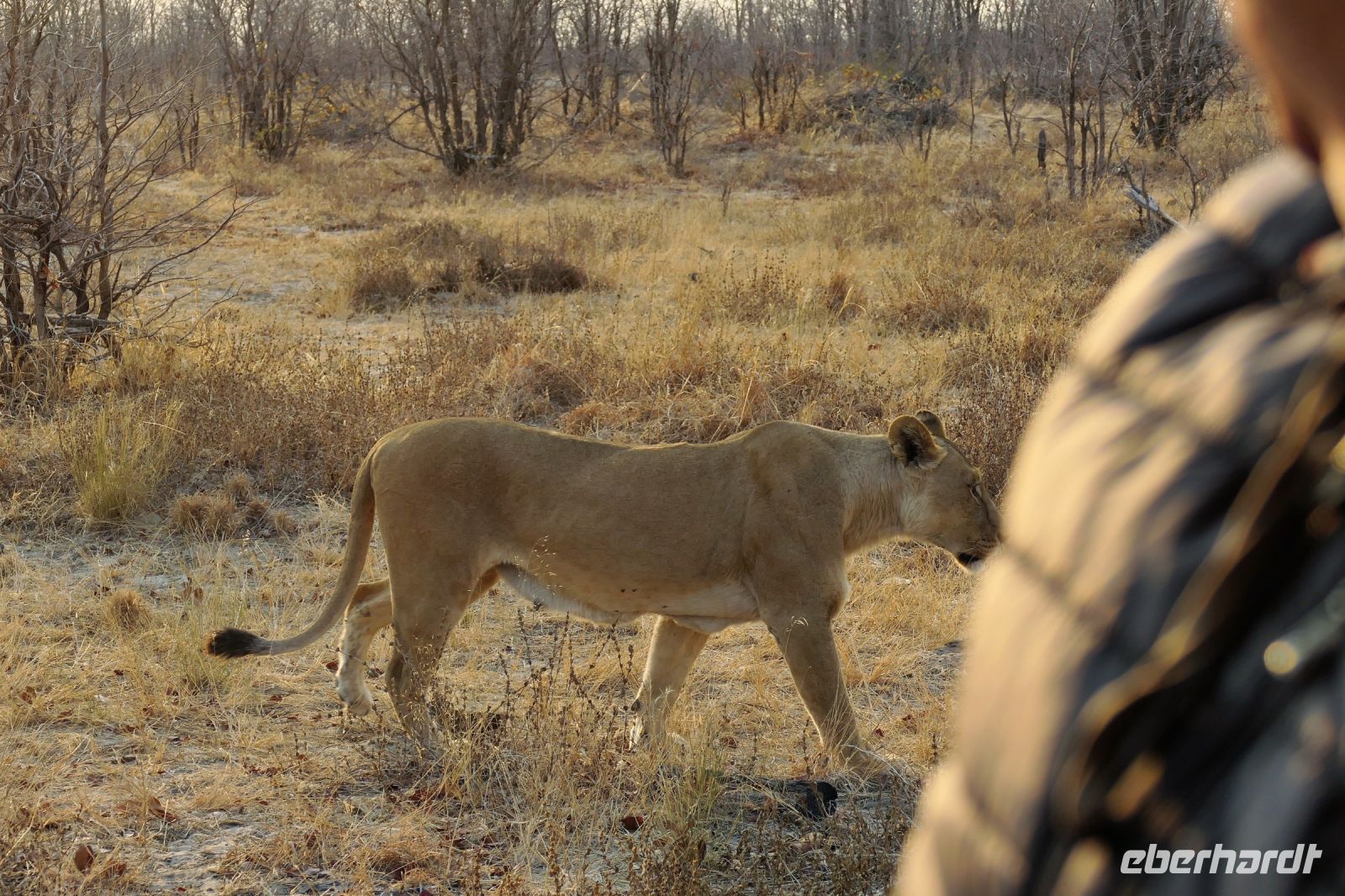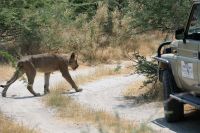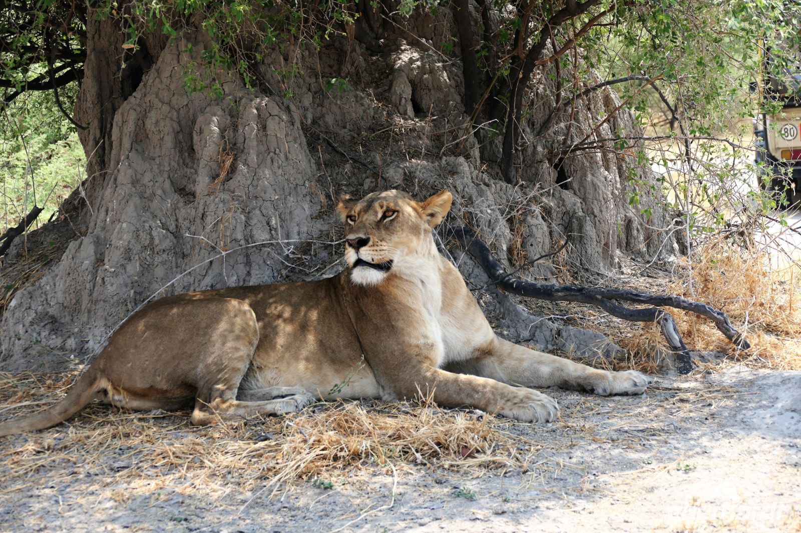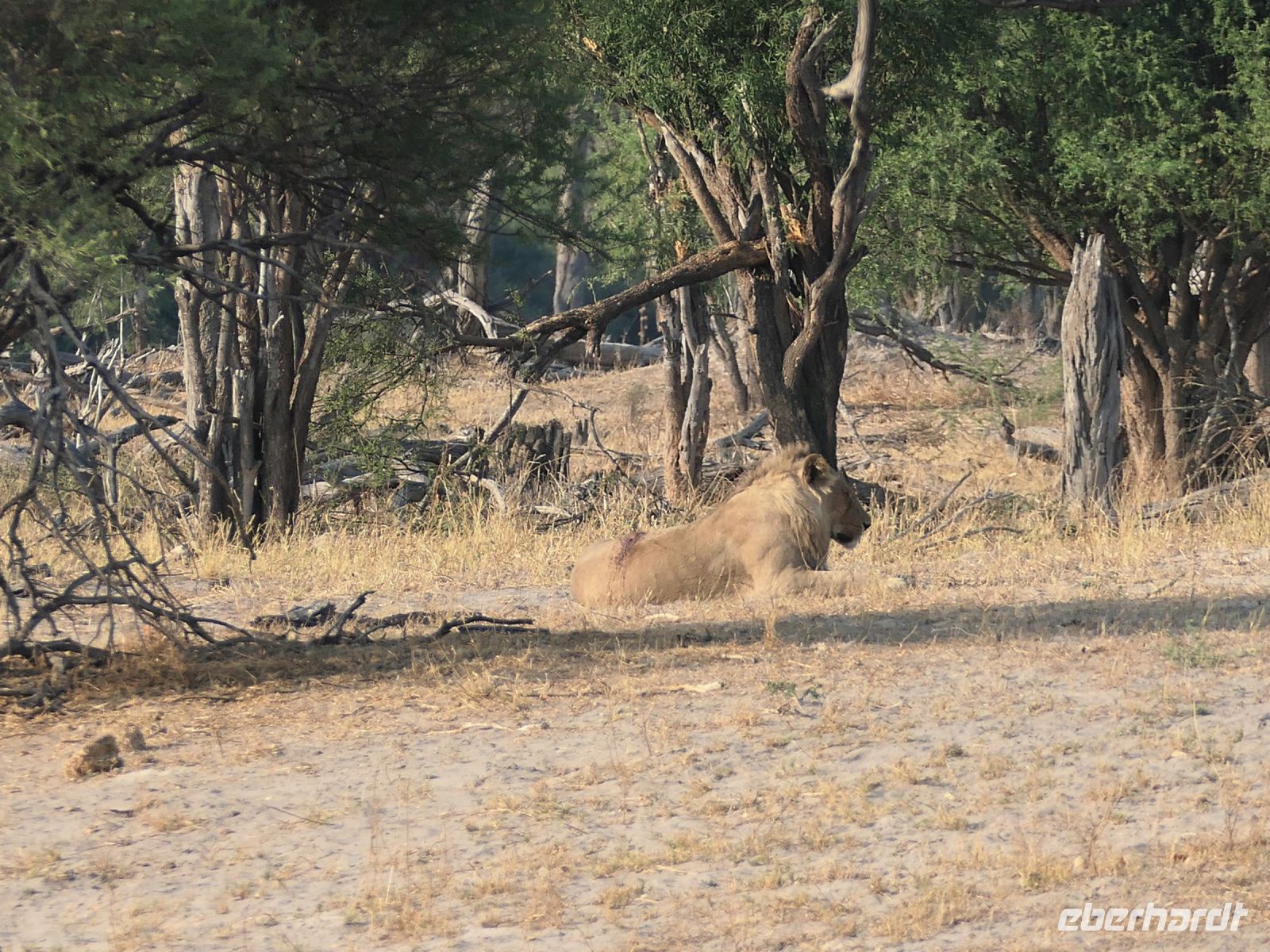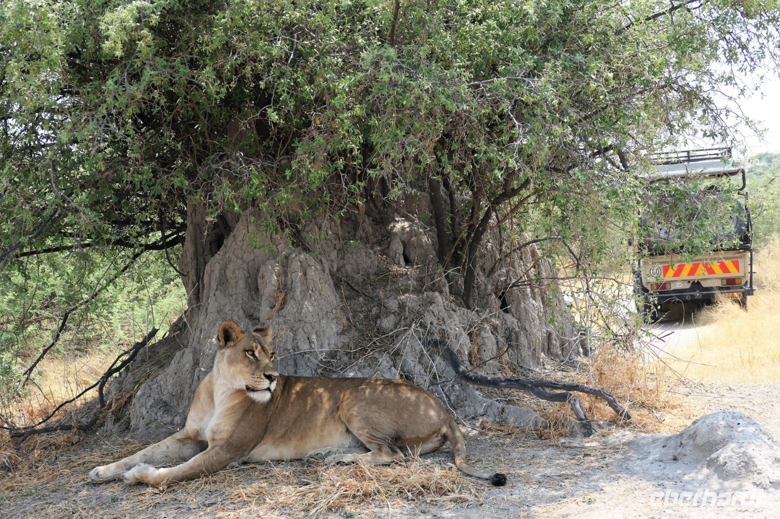 Nach vor Sonnenaufgang trafen wir uns an der Rezeption und verluden unsere Koffer ins Reisefahrzeug. Tutu, unserem DriverGuide sagten wir vorerst Bye, Bye. Er machte sich ohne uns auf den Weg. Wir dagegen bestiegen 2 offene Jeeps, die von Seedy und Mike gelenkt wurden. Unser Ziel war das Wildschutzgebiet Moremi-Crossing im Okavango Delta. Wir waren noch müde und es war etwas frisch. Eingemummelt wie Talibans fuhren wir rasant die Teerstraße, die bei Shorobe in staubige, löchrige Pad überging. Afrikanische Massagen waren wir mittlerweile gewohnt. Am Buffelo Gate passierten wir die Veterinärschleuse und eine Löwendame kreuzte den Weg, die dann später im Busch verschwand. Am Südtor des Moremi-Schutzgebietes mussten wir uns registrieren und nutzten die Pause gleich zum Frühstückspicknik. Mittlerweile heizte die Sonne schon wieder mächtig ein. Gut gestärkt begannen wir unsere Pirschfahrt durch das weit verzweigte Gebiet. Wahrscheinlich hatten Seedy und Mike vor kurzem einen Kurs bei Speedy Gonzales belegt, so schnell wie sie fuhren. Wir mussten sie immer wieder mal bremsen. Richtige Wegbeschilderungen (wie man das aus dem Etosha-NP in Namibia oder aus den südafrikanischen Parks kennt) gibt es hier kaum. Wir vertrauten unseren Fahrern. Die Landschaft war zunächst trocken und buschig. Wir sahen Giraffen, Zebras, Kudus, Warzenschweine und viele gefiederter Schnabeltiere, auch ein Sekretär stolzierte durch das Gras. Auf den weiten Ebenen viele Impalas beim Grasen. Später, versteckt untern einem Busch, unseren ersten Leoparden. Dieser ließ sich aber nicht stören und blieb in seinem schattigen Versteck. Später erreichten die grüneren Gebiete (green channels), wo noch kleine Lagunen waren . In der Regen- bzw. Flutzeit ist hier vieles überschwemmt und nur wenige Wege passierbar. Während der Trockenzeit gibt es in diesen Gebieten noch viele kleine oder größere Lagunen. Das Wasser zieht natürlich Tiere an. Wir sahen Letschwe- und Leierantilopen (Tsessebe) sowie auch vereinzelt Sumpfantilopen und Streifengnus. Ein kleiner Schabrackenschakal suchte den Schatten unter einem Strauch und beobachtete das Treiben am Wasser - ein buntes Kaleidoskop mitGabelracke, Schwarzflügel-Stelze, Löffler, Blatthühnchen (Jacana) und mächtigem Savannenadler. Glück hatten wir, als wir ein 10köpfiges Löwenrudel im Dickicht sichteten, die dann in einer Reihe vor unseren Jeeps die Seiten wechselten, um sich ein lauschiges Plätzchen für den Tag zu suchen. Die Löwenkids waren im Teenie-Alter und Mama Löwe an diesem Tag die Chefin (Pascha Löwe schlief wahrscheinlich noch). Mama Löwe nahm dann direkt neben unserem Jeep ihren Beobachtungsposten ein, während sich die anderen im hohen Gras niederlegten. An der großen, grünen Lagune, unterm schattigen Leberwurst-Baum machten wir Mittagspause und picknickten. Im Wasser vor uns eine Hippo-Burg und weiter weg ein Elefant. Auch die ARD war dabei, wie man am Kennzeichen von Speedys Jeep erkennen konnte. Am Ufer der Lagune fuhren wir zurück und verabschiedeten uns von der Tierwelt aus nächster Nähe. Ein gewaltiges Hippo fand das zunächst gar nicht lustig. Am Nachmittag trafen wir Tutu wieder, der uns am Buffalo Gate erwartete. Unser Ziel war die Mogotlho Lodge, unser Zuhause für die nächsten beiden Nächte. Auch hier Dirty Road, seit 2 Jahren keine Straßenausbesserung. Mit 20 bis max. 30 km/h schlängelten wir uns durch den Irrgarten der Löcher. Für die nur 50 km bis zur Lodge brauchten wir 2,5 h, vor Jahren noch 1 h bis max. 1,5 h. Super herzlich wurden wir von den Mitarbeitern mit Gesang und einem kühlem Getränk empfangen. Wow, vieles hatte sich seit meinem letzten Besuch vor einigen Jahren verändert. Aus der einst urigem Busch-Camp mit einfachen Zelt-Chalets und ohne Strom ist eine Wohlfühloase geworden. Die Mogotlho Lodge liegt am Khwai-Fluss. Dieser bildet die natürliche Grenze zwischen dem Khwai Konzessionsgebiet und dem Moremi Wildreservat. In der nichttouristischen Corona-Zeit wurde die Lodge umfassend renoviert. Strom (Solar) überall; fantastische, neue Zelt-Chalets, die keine Wünsche offen ließen. Wir fühlten uns sofort pudelwohl und waren begeistert. Zaunlos ist die Lodge auch heute noch, nur ein neuer, kaum sichtbarer Elektro-Zaun führt um das Gelände der Lodge. Dieser dient als Schutz vor den vielen Elefanten, die hier leben. Hippos, Löwen und anderes Getier kann aber immer noch passieren. Vor dem Abendessen saßen wir noch in geselliger Runde mit passendem Getränk am Lagerfeuer, bevor uns die Mitarbeiter mit fröhlichen Gesang ...Ready for your Dinner.... zum festlich gedeckten Tisch lockten. Bei guten Wein und anderen Getränken genossen wir ein leckeres Abendessen. Pünktlich um 21 Uhr kam Familie Hippo zu Besuch, die wir von der Terrasse ganz nah beobachten konnten. Auch eine kleine Eule beehrte uns. Zu später Stunde stand der Jeep-Shuttle den Gästen zur Verfügung und wir wurden zu unseren Zelt-Chalets chauffiert. In der Dunkelheit dürfen die Gäste aus Sicherheitsgründen nicht allein durch das Gelände laufen. Und das ist gut so, denn wäre möchte schon allein in der Dunkelheit mit einem Hippo oder Löwen Bekanntschaft machen? Sicher nahmen viele Gäste den guten Sherry als Schlummertrunk auf den privaten Terrassen, bevor sie zu Bett gingen. Durch die Zeltwände und offenen Zeltwand-Rollo hörte man ganz intensiv die Geräusche einer afrikanischen Busch-Nacht: die Hippos schmatzten genüsslich durch den Fluss, Löwen-Gebrüll aus weiter Ferne, "lachende" Hyänen und hie und da ein Knacksen und Rascheln. Da musste ich doch mal nachschauen und sah einen stattlichen Elefanten im Mondschein gemütlich zum Fluss-Ufer schlendern.