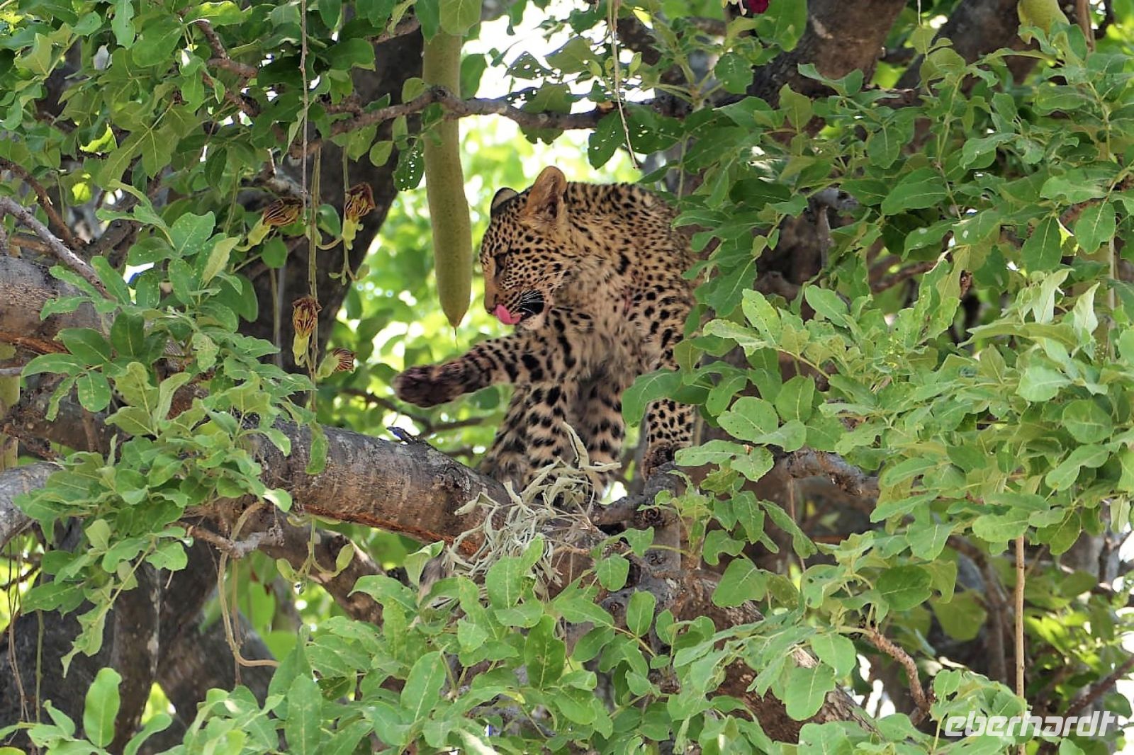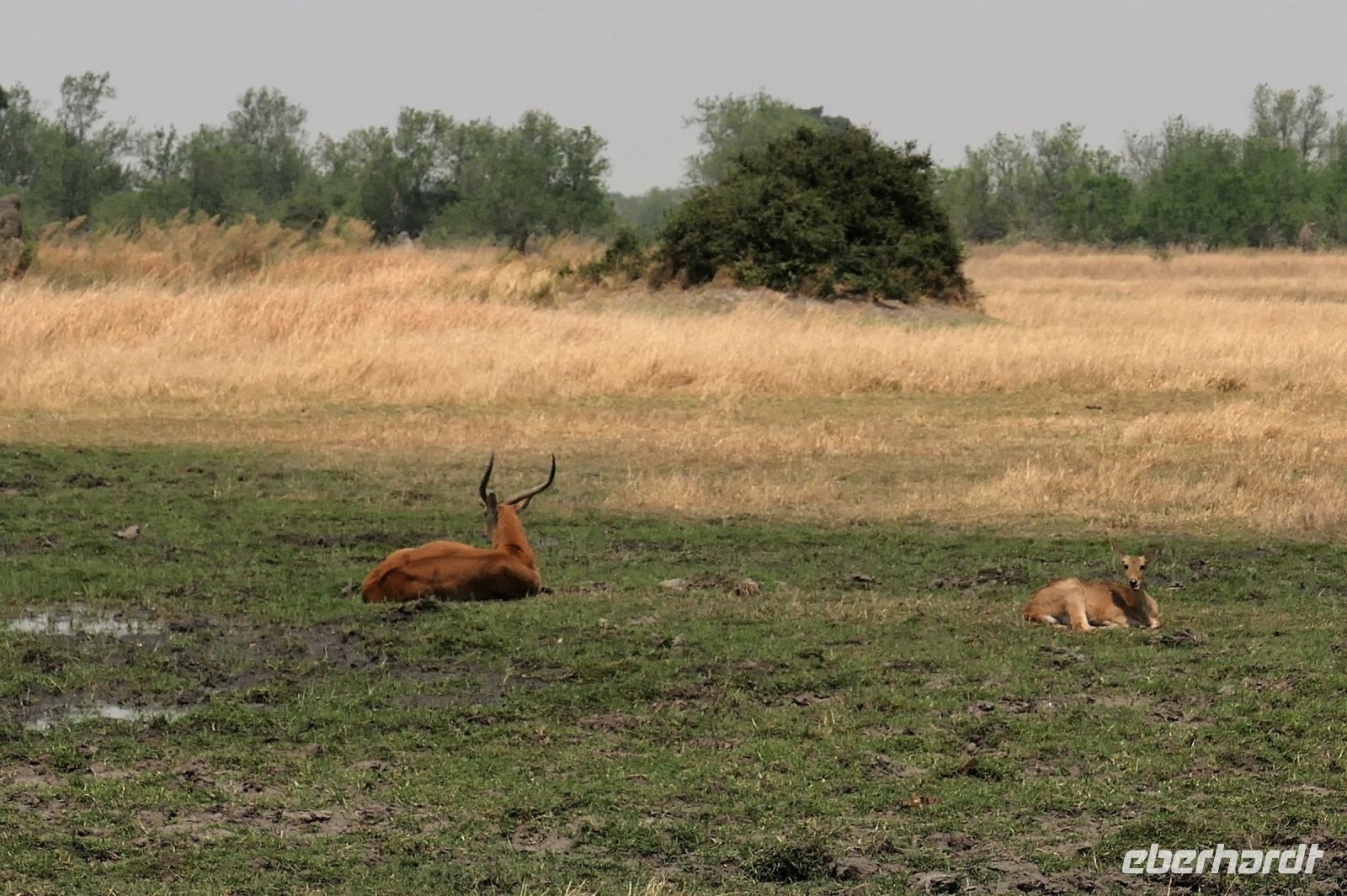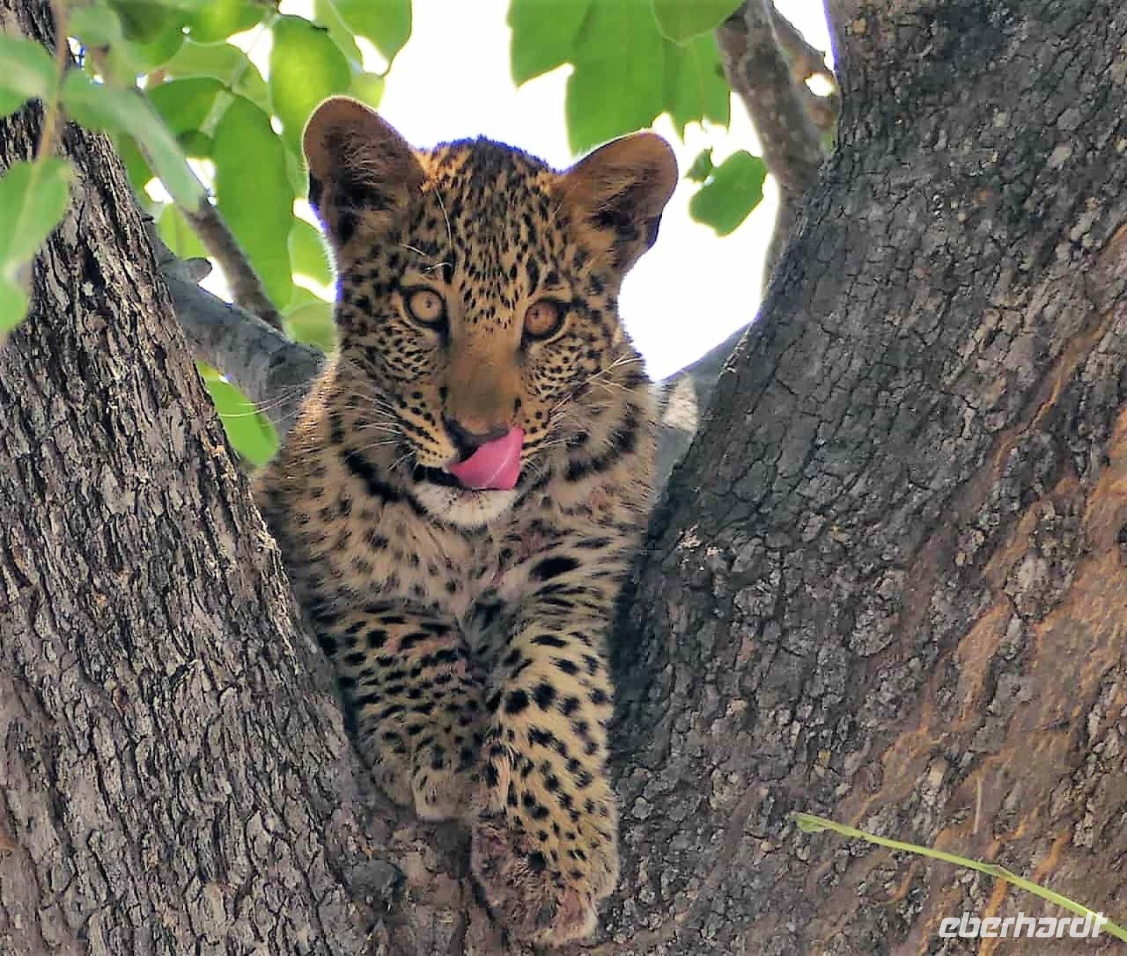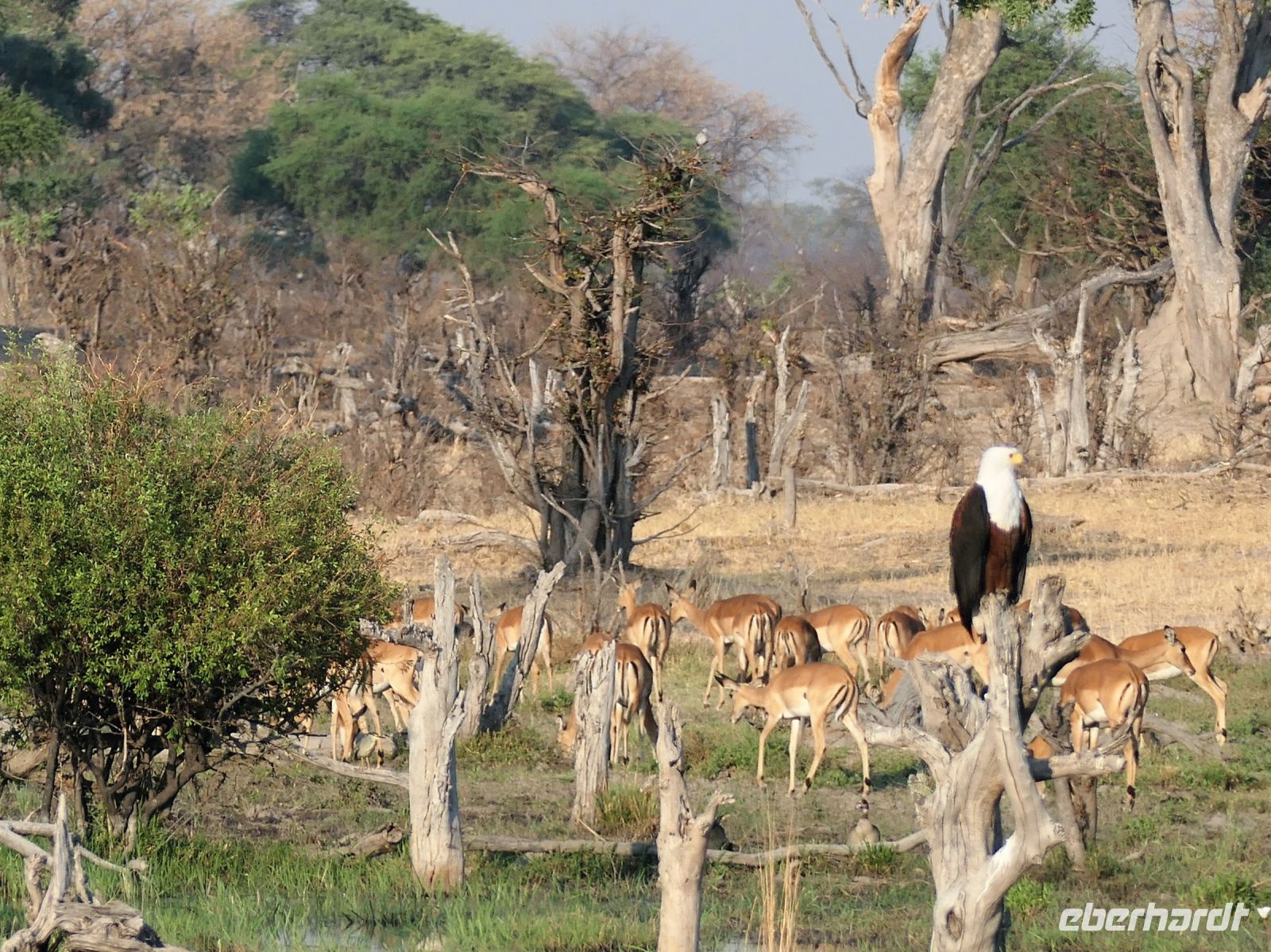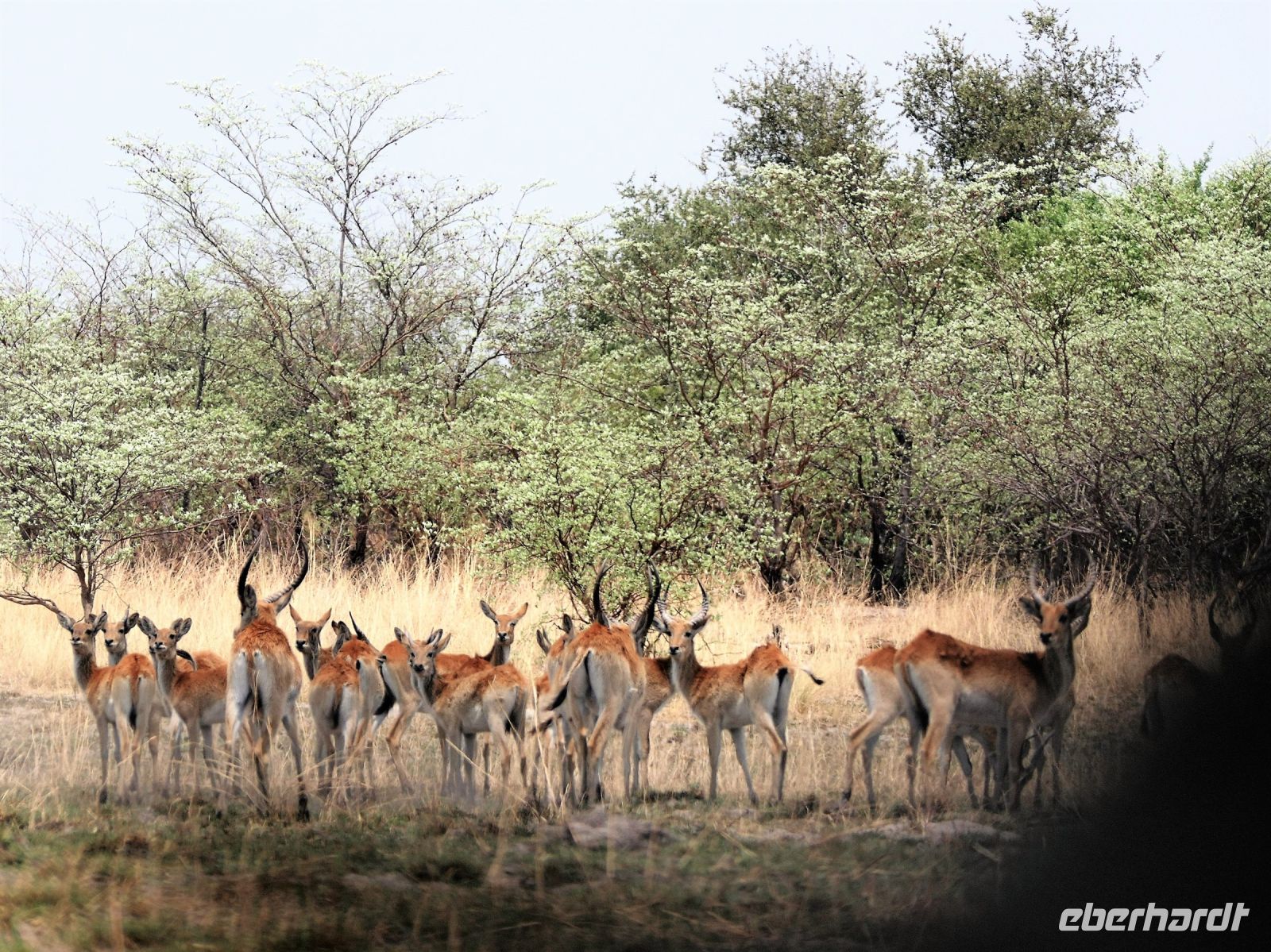 Nach einer angenehmen Nacht trafen wir uns zum reichhaltigen Frühstück wieder. An dieser Stelle schon mal ein großes Dankeschön an die Küchenfeen und -zauberer der Lodges auf unserer Reise. Gut gestärkt laufen wir zum kleinen Bootssteg der Lodge und via Bootstransfer setzen wir auf das "Festland" über. Unterwegs entdecken wir die Hippo Highways im Riedgras, Bienenfresser und die pinkfarbenen Scharlachspinte, die in den Uferwänden ihre Brutstätten haben. Wir steigen in 2 Jeeps um, die von Elias und Rektor gelenkt werden und starten unsere Pirschfahrt durch den Bwabwata Nationalpark. Wir genießen die Landschaft und die Sonnenstrahlen. Manche Wege muß Elias mit seiner Machete passierbar machen. Auf unserer Pirschfahrt bekommen so einiges vor die Linse: seltene und vom Aussterben bedrohte Rappenantilopen, Impalas, Kudus, Letschwe-(Sumpf-)Antilopen und schnellen Leierantilopen (Tsessebe). Wir erspähen einen mystisch aussehenden Baum. Auf diesem sitzen Ohren- und Weißrückengeier - eben ein Geierbaum. Am Ufer des Kwandos steigen wir später aus und beobachten die Uferzone: ein Krokodil wärmt sich in der Sonne, bevor es abtaucht - Büffel kommen zum Trinken - Familie Letschwe ruht sich im Gras aus. Kurze Zeit darauf gesellen sich Elefanten dazu - ein wunderschönes Bild. Und dann, ein Riesenglück: ein Baby Leopard im Baum, der wahrscheinlich auf seine Mama wartete. Mit seinen großen Augen schaute er neugierig auf uns herab. Unter einem Busch lag ein totes Impala, das sicher Mama Leopard erbeutet hatte. Entlang des Kwandos fahren wir zurück. Eine große Mehrgenerationsfamilie Paviane picknickt am Wasser und beschäftigt sich mit noch so anderen, lustvollen Dingen....., auch ein Sattelstorch stolziert daher, ein grüner Ibis (Hagedasch) macht sich gerade lautstark davon. Die heißen Mittagsstunden verbrachten wir in der Lodge und trafen uns am Nachmittag zur einer weiteren Pirschfahrt wieder. Diesmal ausschließlich eine Bootsfahrt auf dem Kwando-River, der hier, zwischen dem Bwabwata NP einem Delta ähnelt. Wir schippern zunächst gemächlich daher und genießen die Fahrt. Eine herrliche Landschaft aus Schilf und Papyrus mit blühenden Wasserlilien säumten die Wasserwege. Unser Bootsführer fuhr vorausschauend, denn überall könnten Krokodile und Flusspferde unerwartet auftauchen. Aufgrund der Dürre war Wasserstand auch hier extrem niedrig. Man sah die Trampelpfade der Hippos, kleine bunte Bienenfresser, leuchtende Scharlachspinte und ganz nah Krokodile, die, Gott sei Dank, noch nicht erwachsen waren. Ein Schreiseeadler präsentierte sich uns. Kurze Zeit später ein Hippo Road Block in einer Biegung des Kwandos. Wir beobachteten die Truppe aus sicherer Entfernung oder die Hippos uns? Danach gingen wir an Land und bauten unsere Sundowner-Bar auf. Mit dem passenden Getränk und kleinen Snacks betrachteten wir das Schauspiel der untergehenden Sonne. Für etwas aktive Bewegung sorgte ein "Fußballspiel" mit trockenen Elefantenknödeln. Unser Landgang wurde jäh unterbrochen. Etwas weiter wurden Löwen am Wasser gesichtet, also nix wie hin. Wir kamen leider zu spät. Aber auch ohne Löwen, die wir ja schon auf unserer Reise mehrmals gesehen hatten, war die Bootsfahrt erfolgreich. In der Dunkelheit schipperten wir zur Lodge zurück. Dort erwartete uns wiederum ein sehr leckeres und vielfältiges Abendbuffet.