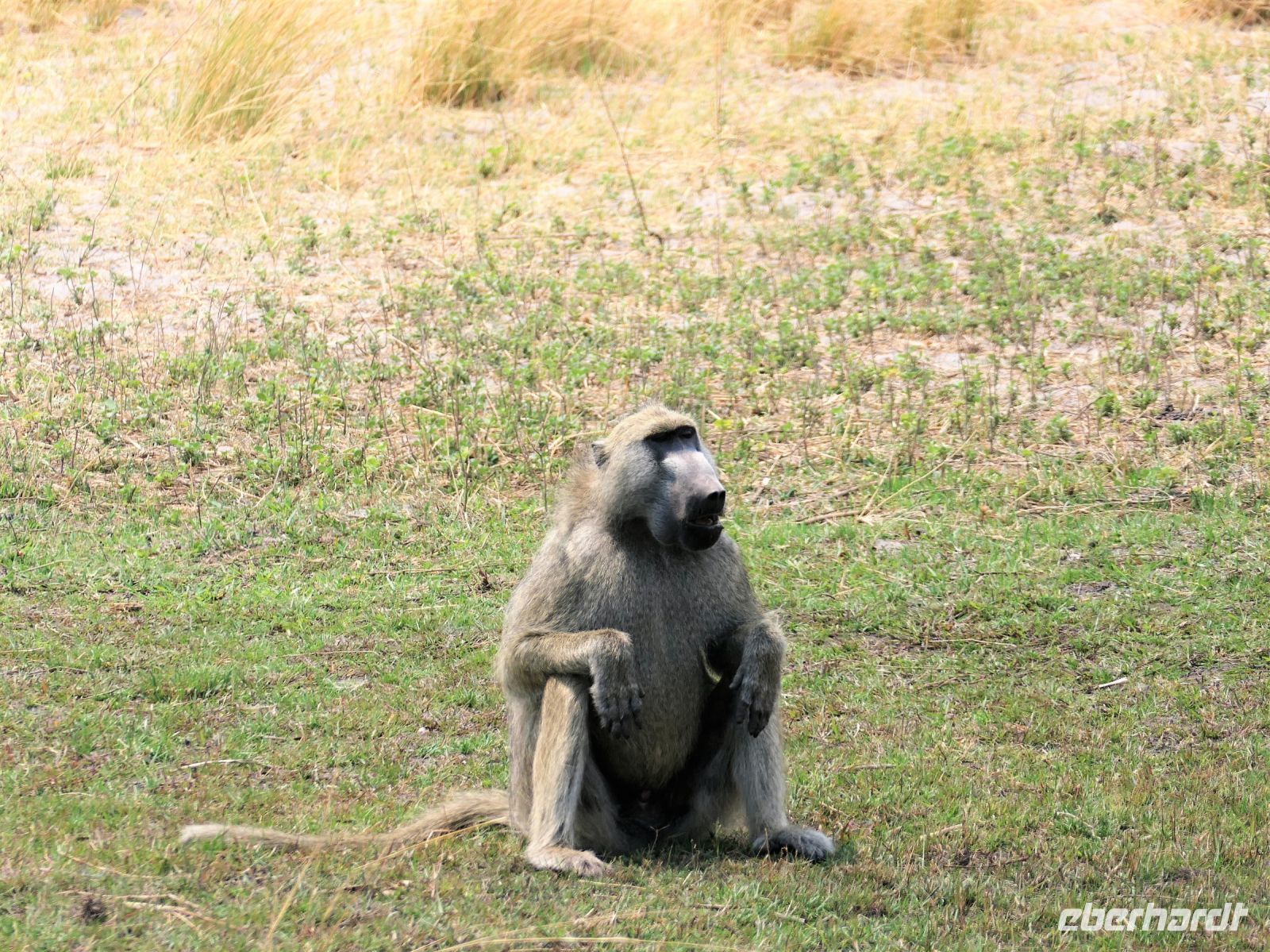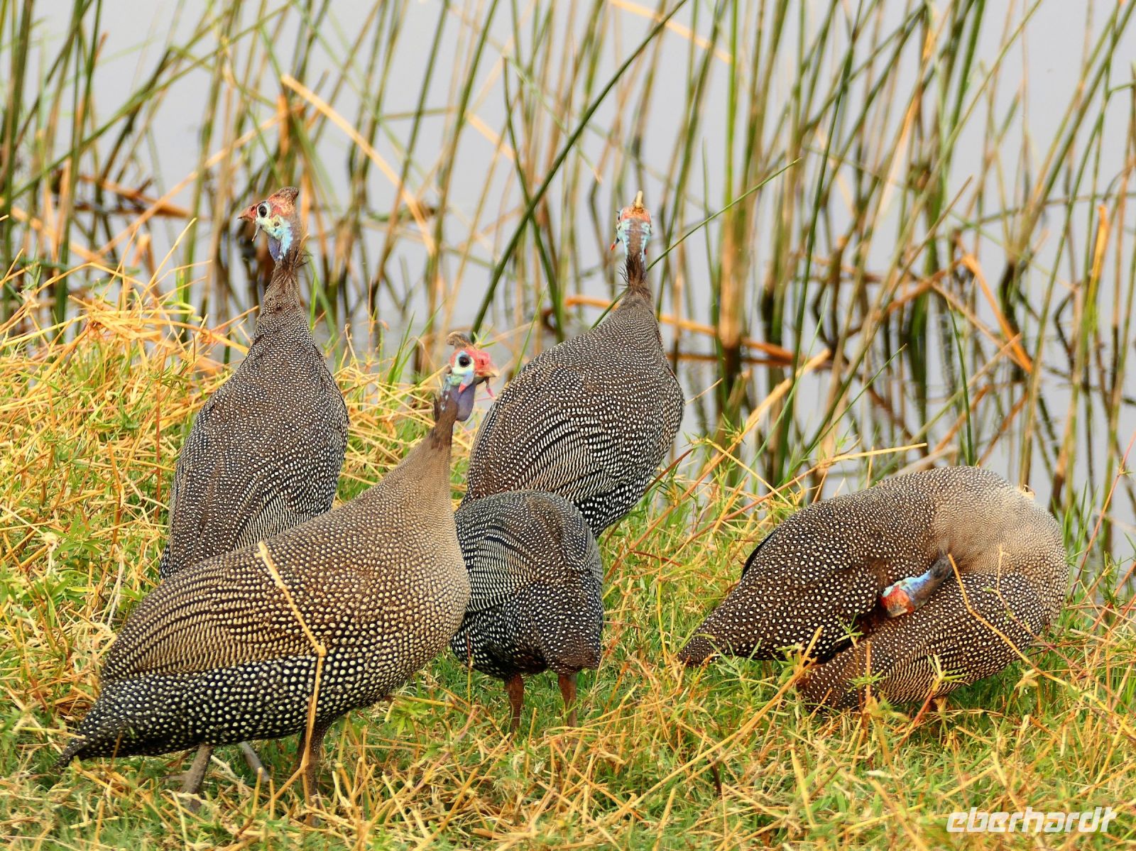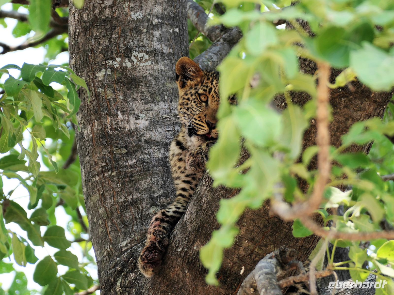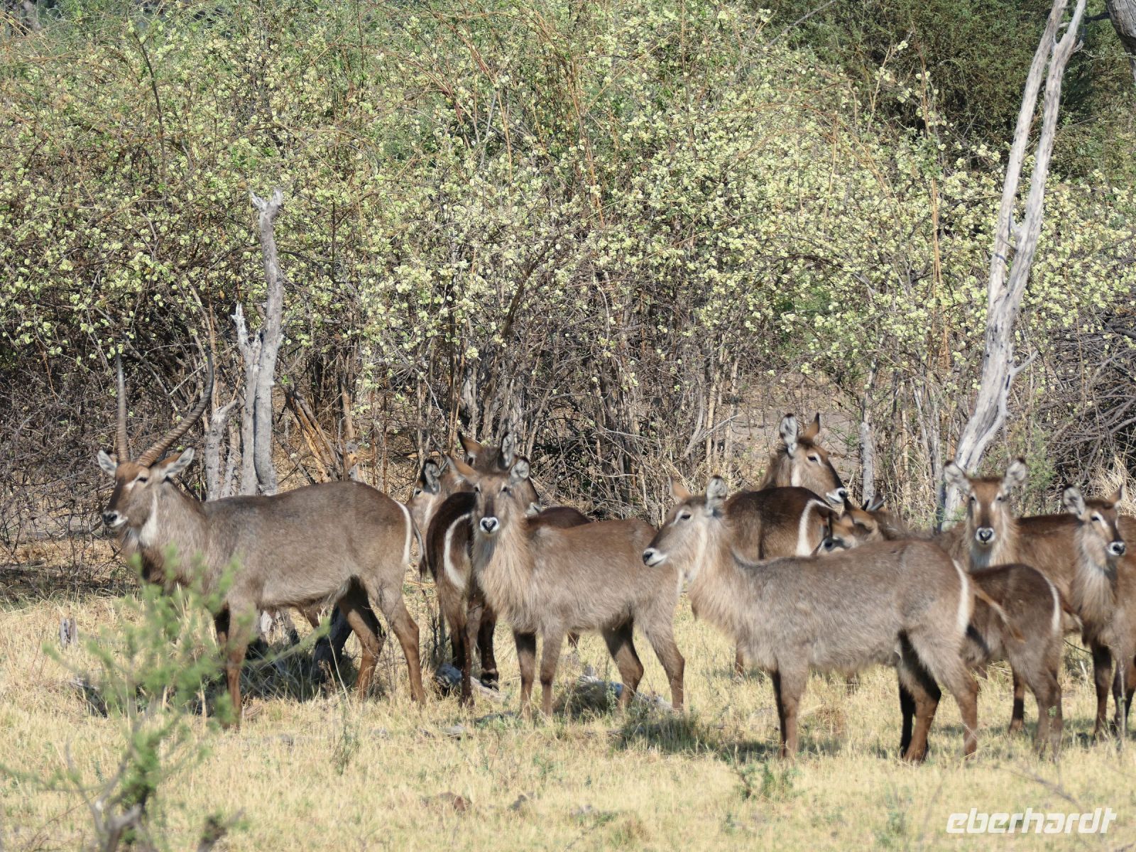 Nach einer angenehmen Nacht trafen wir uns zum reichhaltigen Frühstück wieder. An dieser Stelle schon mal ein großes Dankeschön an die Küchenfeen und -zauberer der Lodges auf unserer Reise. Gut gestärkt laufen wir zum kleinen Bootssteg der Lodge und via Bootstransfer setzen wir auf das "Festland" über. Unterwegs entdecken wir die Hippo Highways im Riedgras, Bienenfresser und die pinkfarbenen Scharlachspinte, die in den Uferwänden ihre Brutstätten haben. Wir steigen in 2 Jeeps um, die von Elias und Rektor gelenkt werden und starten unsere Pirschfahrt durch den Bwabwata Nationalpark. Wir genießen die Landschaft und die Sonnenstrahlen. Manche Wege muß Elias mit seiner Machete passierbar machen. Auf unserer Pirschfahrt bekommen so einiges vor die Linse: seltene und vom Aussterben bedrohte Rappenantilopen, Impalas, Kudus, Letschwe-(Sumpf-)Antilopen und schnellen Leierantilopen (Tsessebe). Wir erspähen einen mystisch aussehenden Baum. Auf diesem sitzen Ohren- und Weißrückengeier - eben ein Geierbaum. Am Ufer des Kwandos steigen wir später aus und beobachten die Uferzone: ein Krokodil wärmt sich in der Sonne, bevor es abtaucht - Büffel kommen zum Trinken - Familie Letschwe ruht sich im Gras aus. Kurze Zeit darauf gesellen sich Elefanten dazu - ein wunderschönes Bild. Und dann, ein Riesenglück: ein Baby Leopard im Baum, der wahrscheinlich auf seine Mama wartete. Mit seinen großen Augen schaute er neugierig auf uns herab. Unter einem Busch lag ein totes Impala, das sicher Mama Leopard erbeutet hatte. Entlang des Kwandos fahren wir zurück. Eine große Mehrgenerationsfamilie Paviane picknickt am Wasser und beschäftigt sich mit noch so anderen, lustvollen Dingen....., auch ein Sattelstorch stolziert daher, ein grüner Ibis (Hagedasch) macht sich gerade lautstark davon. Die heißen Mittagsstunden verbrachten wir in der Lodge und trafen uns am Nachmittag zur einer weiteren Pirschfahrt wieder. Diesmal ausschließlich eine Bootsfahrt auf dem Kwando-River, der hier, zwischen dem Bwabwata NP einem Delta ähnelt. Wir schippern zunächst gemächlich daher und genießen die Fahrt. Eine herrliche Landschaft aus Schilf und Papyrus mit blühenden Wasserlilien säumten die Wasserwege. Unser Bootsführer fuhr vorausschauend, denn überall könnten Krokodile und Flusspferde unerwartet auftauchen. Aufgrund der Dürre war Wasserstand auch hier extrem niedrig. Man sah die Trampelpfade der Hippos, kleine bunte Bienenfresser, leuchtende Scharlachspinte und ganz nah Krokodile, die, Gott sei Dank, noch nicht erwachsen waren. Ein Schreiseeadler präsentierte sich uns. Kurze Zeit später ein Hippo Road Block in einer Biegung des Kwandos. Wir beobachteten die Truppe aus sicherer Entfernung oder die Hippos uns? Danach gingen wir an Land und bauten unsere Sundowner-Bar auf. Mit dem passenden Getränk und kleinen Snacks betrachteten wir das Schauspiel der untergehenden Sonne. Für etwas aktive Bewegung sorgte ein "Fußballspiel" mit trockenen Elefantenknödeln. Unser Landgang wurde jäh unterbrochen. Etwas weiter wurden Löwen am Wasser gesichtet, also nix wie hin. Wir kamen leider zu spät. Aber auch ohne Löwen, die wir ja schon auf unserer Reise mehrmals gesehen hatten, war die Bootsfahrt erfolgreich. In der Dunkelheit schipperten wir zur Lodge zurück. Dort erwartete uns wiederum ein sehr leckeres und vielfältiges Abendbuffet.