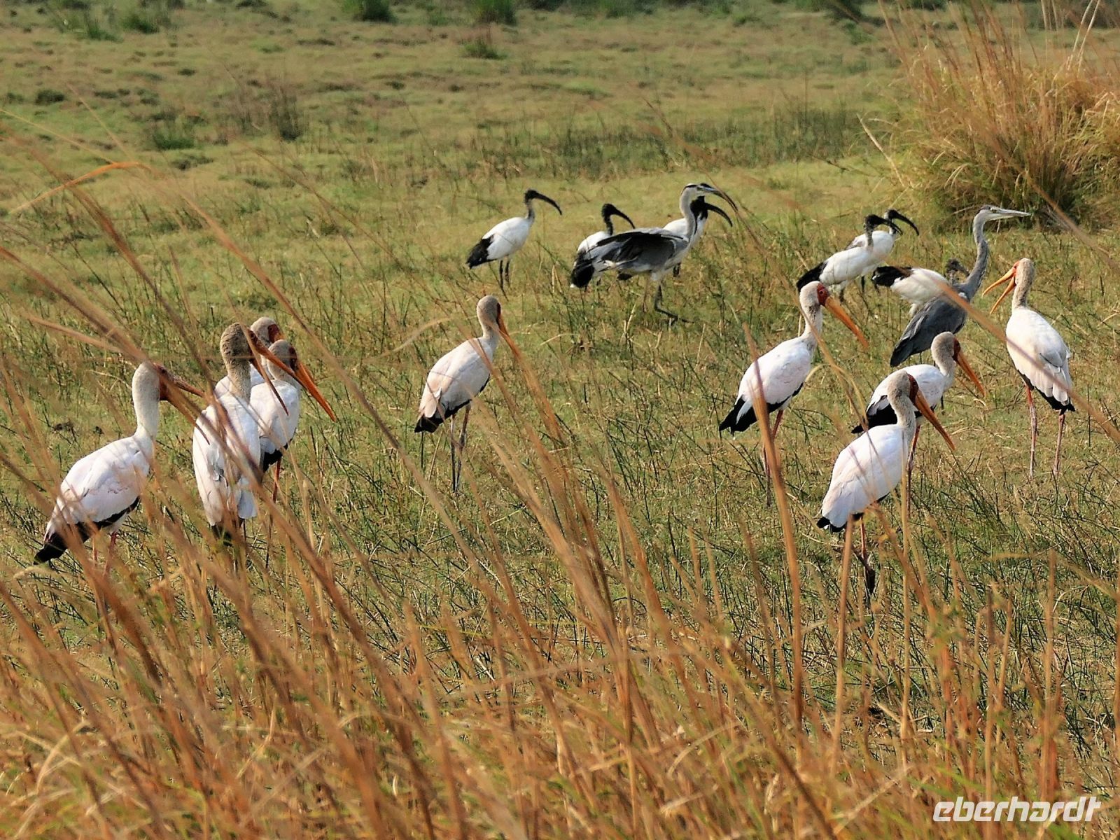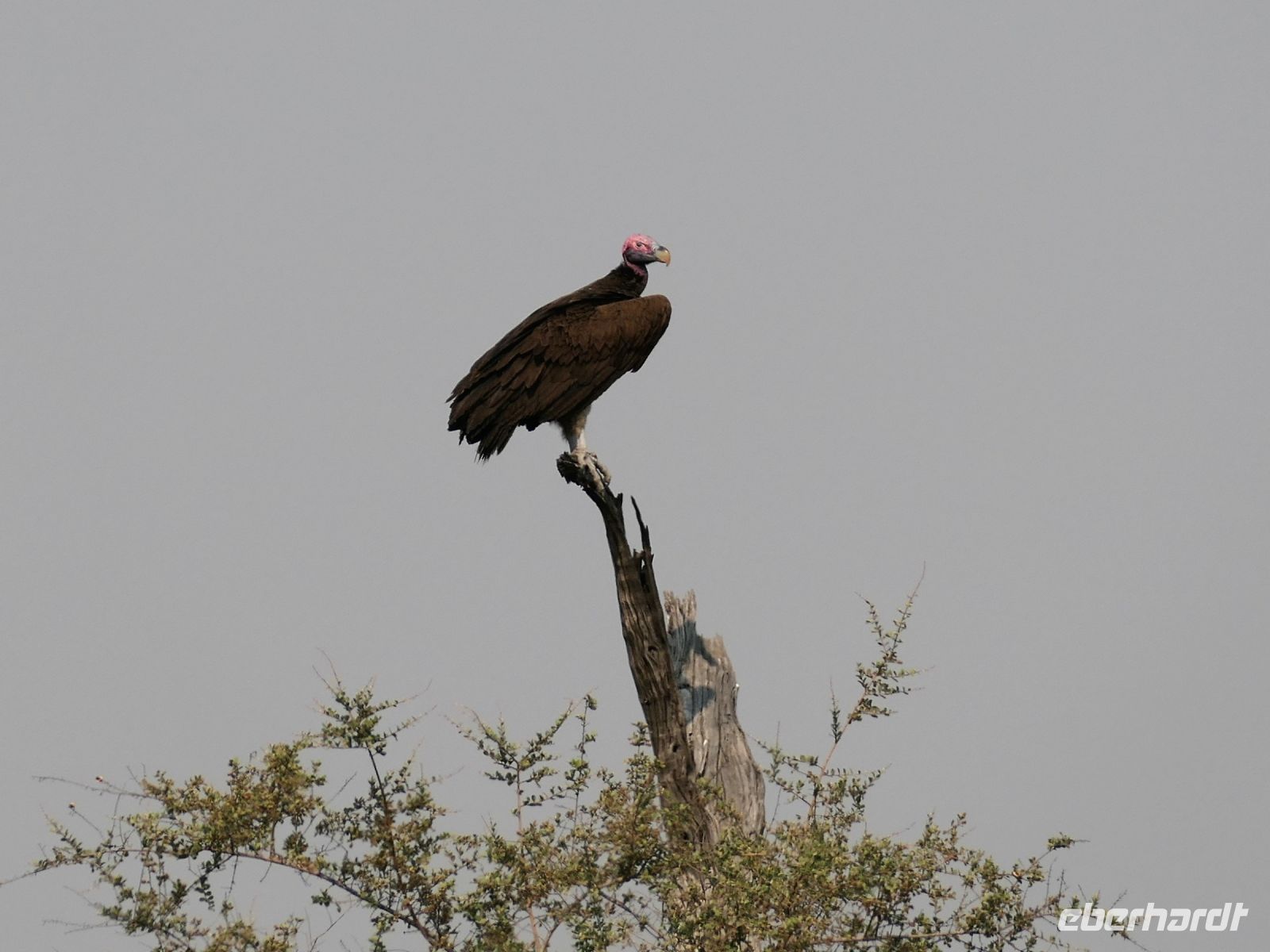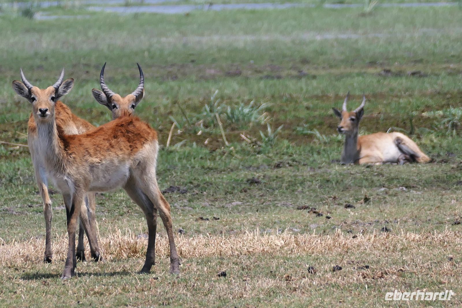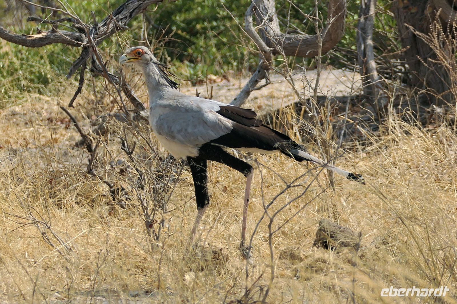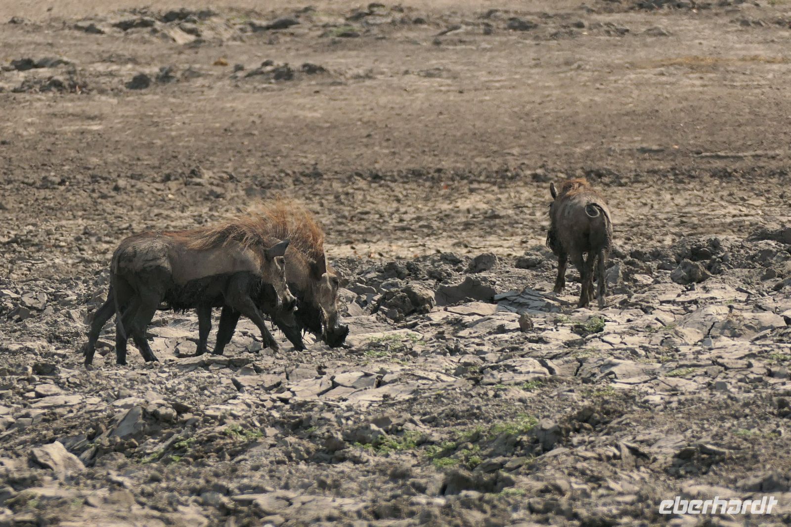 Nach einer angenehmen Nacht trafen wir uns zum reichhaltigen Frühstück wieder. An dieser Stelle schon mal ein großes Dankeschön an die Küchenfeen und -zauberer der Lodges auf unserer Reise. Gut gestärkt laufen wir zum kleinen Bootssteg der Lodge und via Bootstransfer setzen wir auf das "Festland" über. Unterwegs entdecken wir die Hippo Highways im Riedgras, Bienenfresser und die pinkfarbenen Scharlachspinte, die in den Uferwänden ihre Brutstätten haben. Wir steigen in 2 Jeeps um, die von Elias und Rektor gelenkt werden und starten unsere Pirschfahrt durch den Bwabwata Nationalpark. Wir genießen die Landschaft und die Sonnenstrahlen. Manche Wege muß Elias mit seiner Machete passierbar machen. Auf unserer Pirschfahrt bekommen so einiges vor die Linse: seltene und vom Aussterben bedrohte Rappenantilopen, Impalas, Kudus, Letschwe-(Sumpf-)Antilopen und schnellen Leierantilopen (Tsessebe). Wir erspähen einen mystisch aussehenden Baum. Auf diesem sitzen Ohren- und Weißrückengeier - eben ein Geierbaum. Am Ufer des Kwandos steigen wir später aus und beobachten die Uferzone: ein Krokodil wärmt sich in der Sonne, bevor es abtaucht - Büffel kommen zum Trinken - Familie Letschwe ruht sich im Gras aus. Kurze Zeit darauf gesellen sich Elefanten dazu - ein wunderschönes Bild. Und dann, ein Riesenglück: ein Baby Leopard im Baum, der wahrscheinlich auf seine Mama wartete. Mit seinen großen Augen schaute er neugierig auf uns herab. Unter einem Busch lag ein totes Impala, das sicher Mama Leopard erbeutet hatte. Entlang des Kwandos fahren wir zurück. Eine große Mehrgenerationsfamilie Paviane picknickt am Wasser und beschäftigt sich mit noch so anderen, lustvollen Dingen....., auch ein Sattelstorch stolziert daher, ein grüner Ibis (Hagedasch) macht sich gerade lautstark davon. Die heißen Mittagsstunden verbrachten wir in der Lodge und trafen uns am Nachmittag zur einer weiteren Pirschfahrt wieder. Diesmal ausschließlich eine Bootsfahrt auf dem Kwando-River, der hier, zwischen dem Bwabwata NP einem Delta ähnelt. Wir schippern zunächst gemächlich daher und genießen die Fahrt. Eine herrliche Landschaft aus Schilf und Papyrus mit blühenden Wasserlilien säumten die Wasserwege. Unser Bootsführer fuhr vorausschauend, denn überall könnten Krokodile und Flusspferde unerwartet auftauchen. Aufgrund der Dürre war Wasserstand auch hier extrem niedrig. Man sah die Trampelpfade der Hippos, kleine bunte Bienenfresser, leuchtende Scharlachspinte und ganz nah Krokodile, die, Gott sei Dank, noch nicht erwachsen waren. Ein Schreiseeadler präsentierte sich uns. Kurze Zeit später ein Hippo Road Block in einer Biegung des Kwandos. Wir beobachteten die Truppe aus sicherer Entfernung oder die Hippos uns? Danach gingen wir an Land und bauten unsere Sundowner-Bar auf. Mit dem passenden Getränk und kleinen Snacks betrachteten wir das Schauspiel der untergehenden Sonne. Für etwas aktive Bewegung sorgte ein "Fußballspiel" mit trockenen Elefantenknödeln. Unser Landgang wurde jäh unterbrochen. Etwas weiter wurden Löwen am Wasser gesichtet, also nix wie hin. Wir kamen leider zu spät. Aber auch ohne Löwen, die wir ja schon auf unserer Reise mehrmals gesehen hatten, war die Bootsfahrt erfolgreich. In der Dunkelheit schipperten wir zur Lodge zurück. Dort erwartete uns wiederum ein sehr leckeres und vielfältiges Abendbuffet.