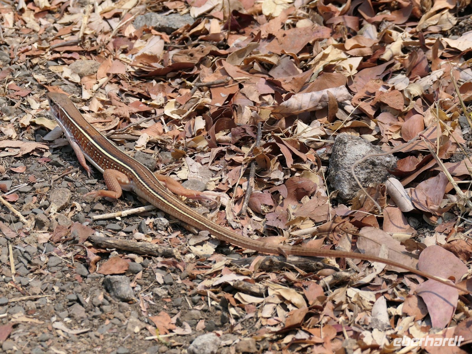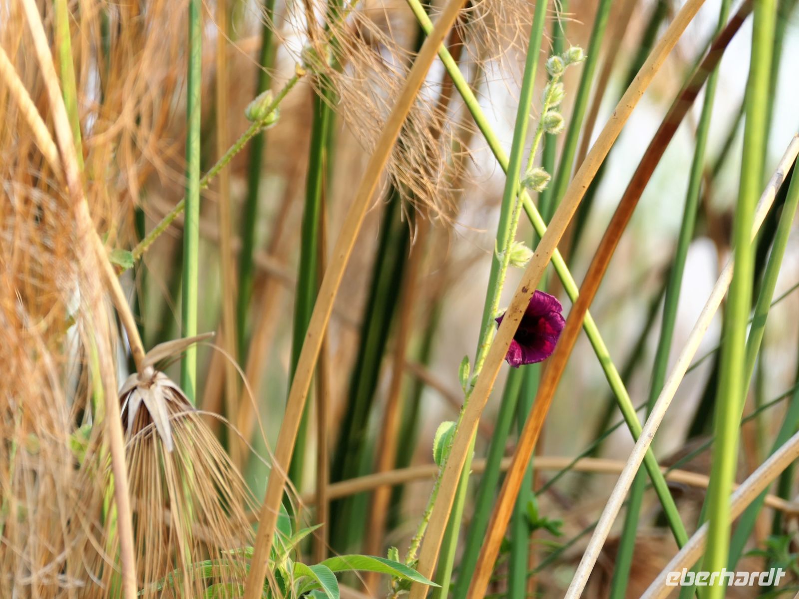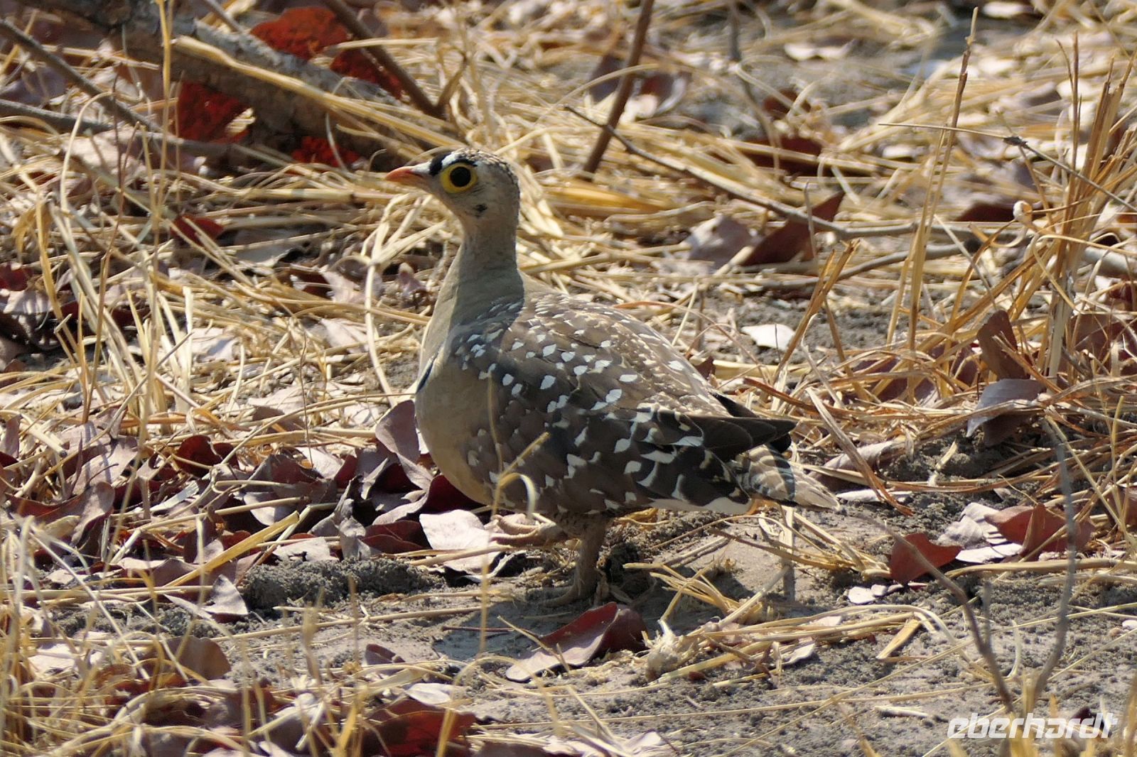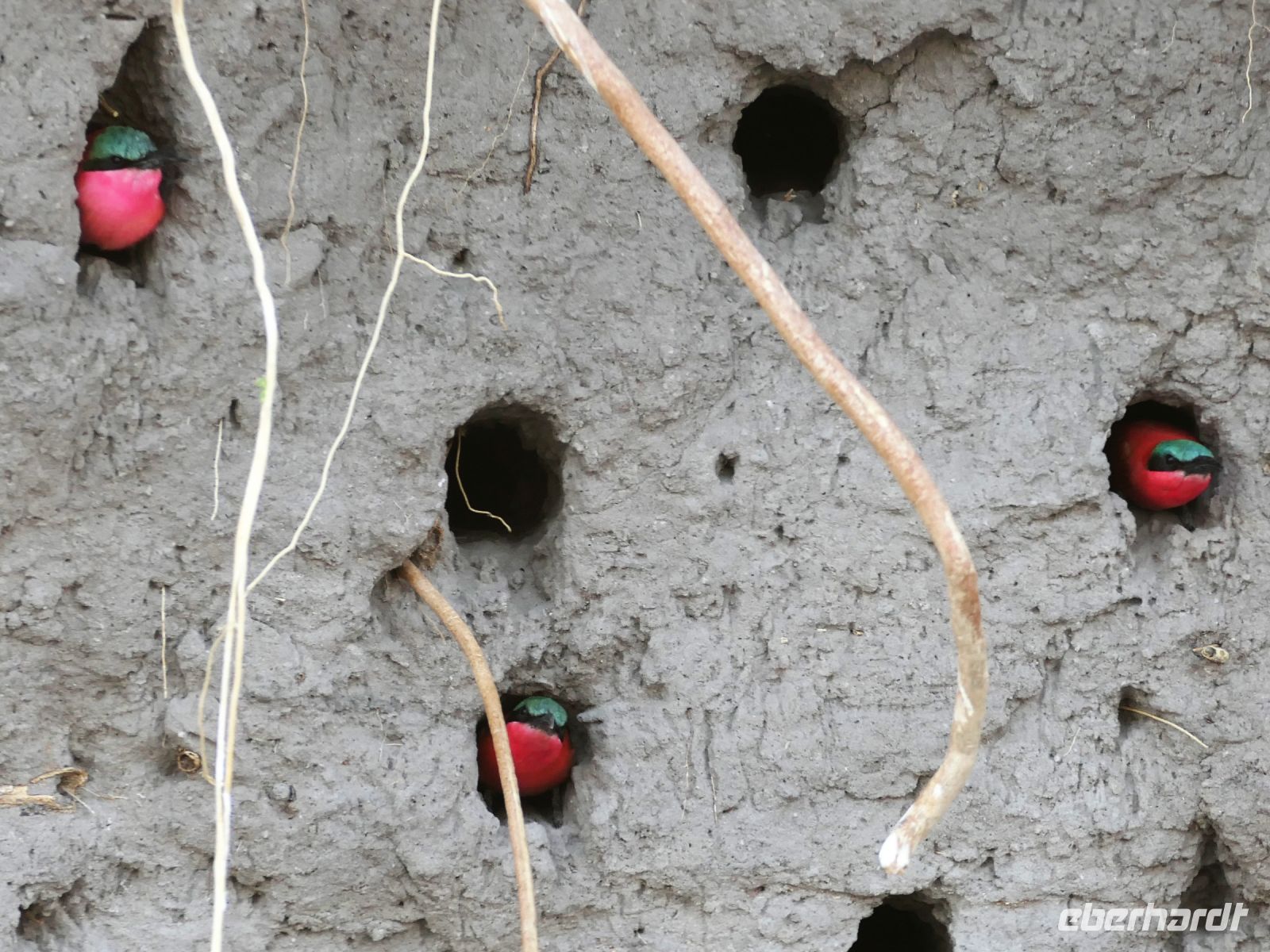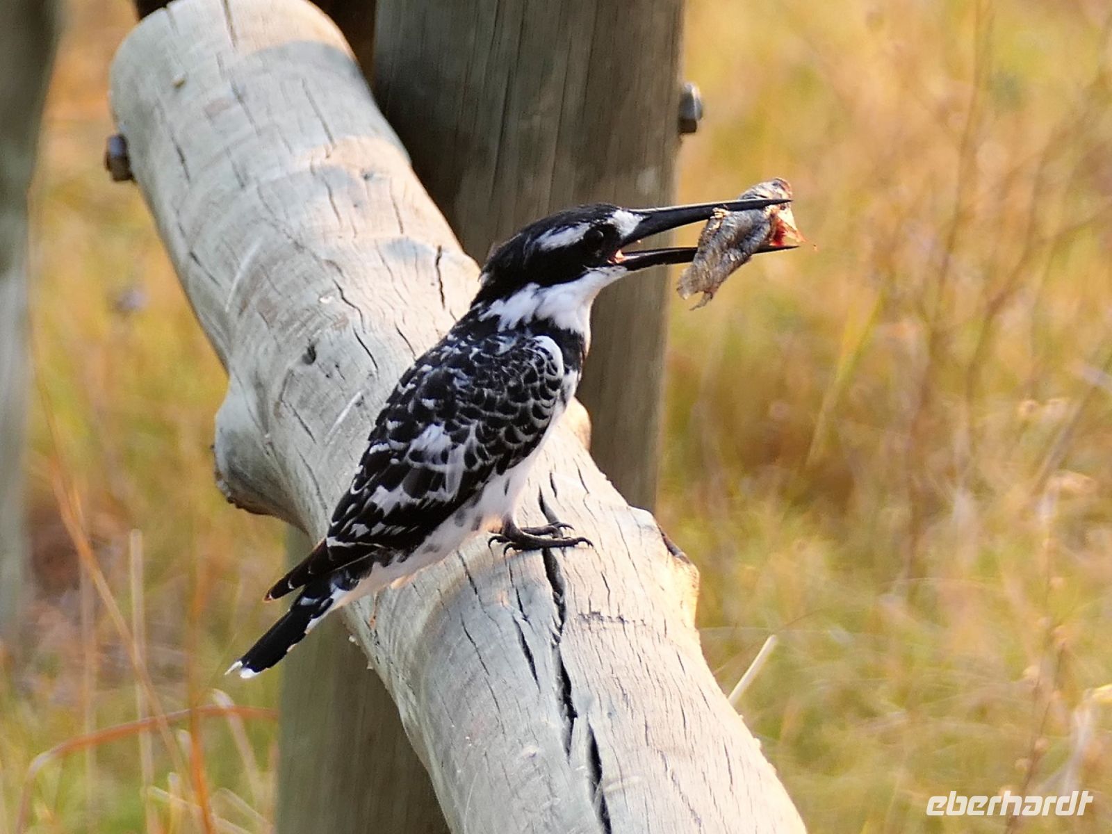 Nach einer angenehmen Nacht trafen wir uns zum reichhaltigen Frühstück wieder. An dieser Stelle schon mal ein großes Dankeschön an die Küchenfeen und -zauberer der Lodges auf unserer Reise. Gut gestärkt laufen wir zum kleinen Bootssteg der Lodge und via Bootstransfer setzen wir auf das "Festland" über. Unterwegs entdecken wir die Hippo Highways im Riedgras, Bienenfresser und die pinkfarbenen Scharlachspinte, die in den Uferwänden ihre Brutstätten haben. Wir steigen in 2 Jeeps um, die von Elias und Rektor gelenkt werden und starten unsere Pirschfahrt durch den Bwabwata Nationalpark. Wir genießen die Landschaft und die Sonnenstrahlen. Manche Wege muß Elias mit seiner Machete passierbar machen. Auf unserer Pirschfahrt bekommen so einiges vor die Linse: seltene und vom Aussterben bedrohte Rappenantilopen, Impalas, Kudus, Letschwe-(Sumpf-)Antilopen und schnellen Leierantilopen (Tsessebe). Wir erspähen einen mystisch aussehenden Baum. Auf diesem sitzen Ohren- und Weißrückengeier - eben ein Geierbaum. Am Ufer des Kwandos steigen wir später aus und beobachten die Uferzone: ein Krokodil wärmt sich in der Sonne, bevor es abtaucht - Büffel kommen zum Trinken - Familie Letschwe ruht sich im Gras aus. Kurze Zeit darauf gesellen sich Elefanten dazu - ein wunderschönes Bild. Und dann, ein Riesenglück: ein Baby Leopard im Baum, der wahrscheinlich auf seine Mama wartete. Mit seinen großen Augen schaute er neugierig auf uns herab. Unter einem Busch lag ein totes Impala, das sicher Mama Leopard erbeutet hatte. Entlang des Kwandos fahren wir zurück. Eine große Mehrgenerationsfamilie Paviane picknickt am Wasser und beschäftigt sich mit noch so anderen, lustvollen Dingen....., auch ein Sattelstorch stolziert daher, ein grüner Ibis (Hagedasch) macht sich gerade lautstark davon. Die heißen Mittagsstunden verbrachten wir in der Lodge und trafen uns am Nachmittag zur einer weiteren Pirschfahrt wieder. Diesmal ausschließlich eine Bootsfahrt auf dem Kwando-River, der hier, zwischen dem Bwabwata NP einem Delta ähnelt. Wir schippern zunächst gemächlich daher und genießen die Fahrt. Eine herrliche Landschaft aus Schilf und Papyrus mit blühenden Wasserlilien säumten die Wasserwege. Unser Bootsführer fuhr vorausschauend, denn überall könnten Krokodile und Flusspferde unerwartet auftauchen. Aufgrund der Dürre war Wasserstand auch hier extrem niedrig. Man sah die Trampelpfade der Hippos, kleine bunte Bienenfresser, leuchtende Scharlachspinte und ganz nah Krokodile, die, Gott sei Dank, noch nicht erwachsen waren. Ein Schreiseeadler präsentierte sich uns. Kurze Zeit später ein Hippo Road Block in einer Biegung des Kwandos. Wir beobachteten die Truppe aus sicherer Entfernung oder die Hippos uns? Danach gingen wir an Land und bauten unsere Sundowner-Bar auf. Mit dem passenden Getränk und kleinen Snacks betrachteten wir das Schauspiel der untergehenden Sonne. Für etwas aktive Bewegung sorgte ein "Fußballspiel" mit trockenen Elefantenknödeln. Unser Landgang wurde jäh unterbrochen. Etwas weiter wurden Löwen am Wasser gesichtet, also nix wie hin. Wir kamen leider zu spät. Aber auch ohne Löwen, die wir ja schon auf unserer Reise mehrmals gesehen hatten, war die Bootsfahrt erfolgreich. In der Dunkelheit schipperten wir zur Lodge zurück. Dort erwartete uns wiederum ein sehr leckeres und vielfältiges Abendbuffet.