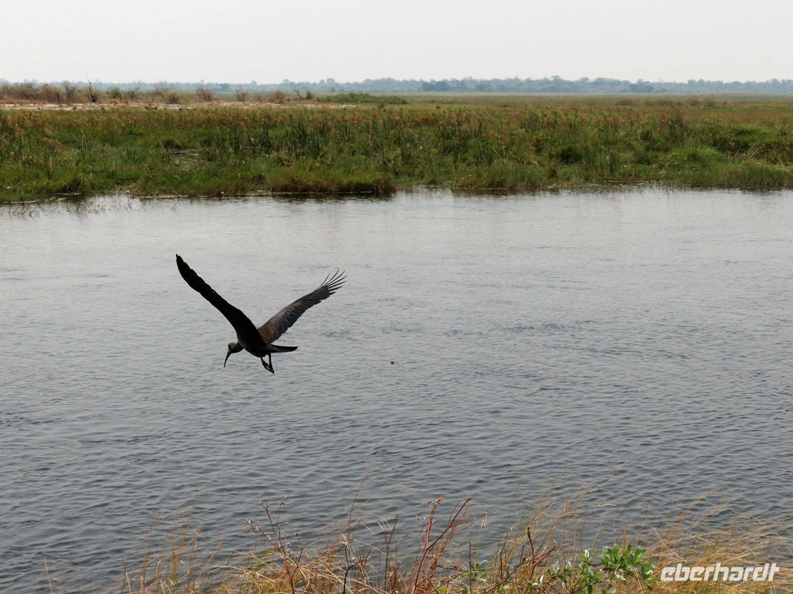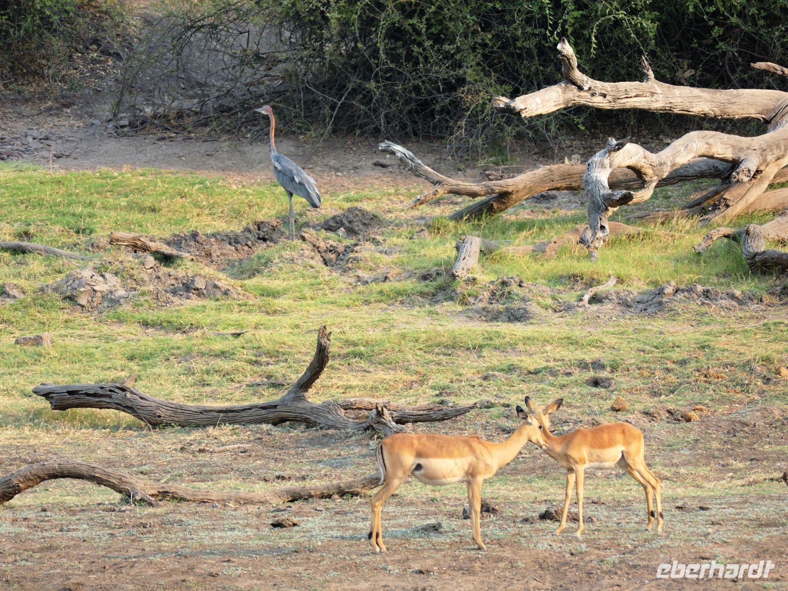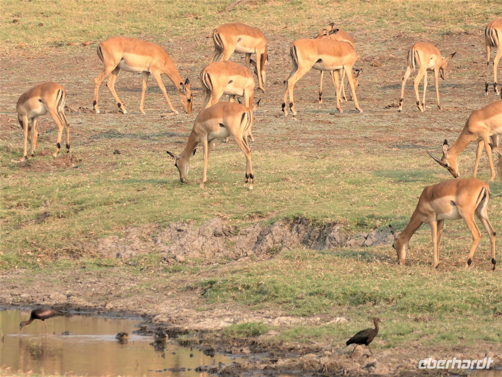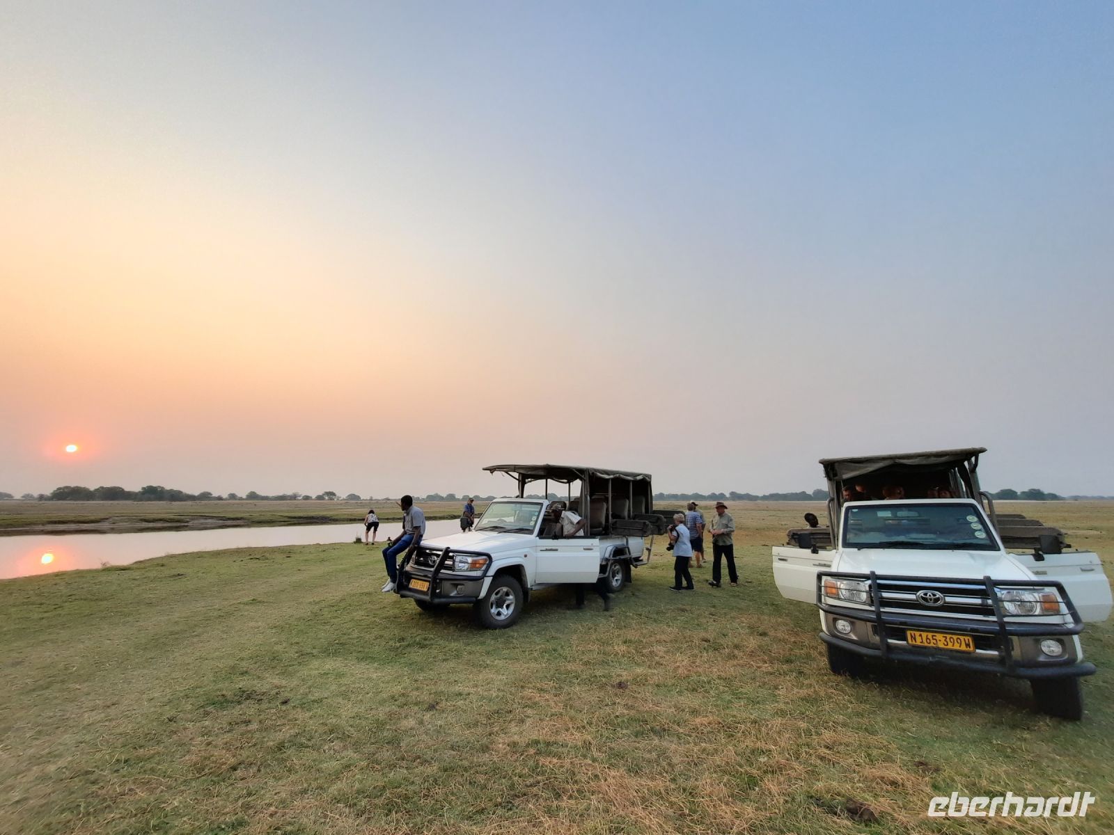 Für die meisten begann der frühe Morgen mit einem heißen Kaffee auf den privaten Terrassen der Zelt-Chalets. Während die Sonne aufging, erwachte auch die Natur: Graufischer beim Frühstück, Krokodile, Reiher - Natur soweit das Auge sehen konnte. Nach dem Frühstück unternahmen wir eine Kanu-Tour, die Eberhardt spontan ins Programm eingebaut hatte. In Zweier-Kajaks (wir mussten nicht selbst paddeln) glitten wir auf dem Chobe entlang. Das Wasser war nur kniehoch. Wir sichteten Klaffschnabler, Reiher einen Wasserwaran und so manch gefiedertes Getier auch Fischer mit ihren Einbooten waren unterwegs. Auf festen Boden pausierten wir uns genossen die Landschaft. Zu Mittag wurde uns ein üppiges Lunch spendiert, wieder viel zu viel. Den weiteren Nachmittag entspannten wir in der Lodge. Von der Terrasse konnten wir Giraffen, Zebras und viele Antilopen auf den weiten Ebenen der Inseln beobachten, auch viele Wasservögel und Krokodile. Glockengeläut kündigte Rinderherden an, die Ebenen werden auch als Weideflächen genutzt, ein Abkommen mit der lokalen Bevölkerung. Am Nachmittag starteten wir zu Pirschafahrt im Jeep, statt per Boot. Mit an Bord waren Petra aus Deutschland und Wolfgang aus Swakopmund, die zunächst wenig begeistert waren, im Jeep der begeisterten Ornithologen Platz zu finden. Ihre Meinung änderte sich aber schnell und es wurde eine lustige und interessante Pirschfahrt. Am Anfang dachten sicher viele wir machen eine Info-Tour zur Agrarwirtschaft Namibias, das änderte sich jedoch schnell. Wir sahen die Brutstätten der diverse Wasservögel ganz nah, ein buntes Kaleidoskop: Nimmersatt, Heiliger Ibis und Hagedasch, Grau- und Seidenreiher. Später entdeckten wir eine Sporengangs, Familie Waffenkiebitz mit flauschigen Nachwuchs, einen Weißbrust-Komoran sowie einen Fish Eagle. Am einer Insel , auf der anderen Seite der botswanische Chobe NP, kam ein stolzer Wasserbock auf uns zu, ein Wasserwaran schlängelte sich zum Wasser, ein gigantischer Goliathreiher traf auf Impalas - einfach toll und wir waren gegeistert. Plötzlich waren wir inmitten großer Herden Steppenzebras umringt. Wir erfuhren, dass diese aufgrund der gegenwärtigen Dürre aus der Khwai Region des Deltas hierher gewandert sind, um Nahrung zu finden (immerhin fast 200 km). An dieser Stelle ließen wir es uns gut gehen, mit Sundowner-Bar und kleinen Snacks zelebrierten wir den Sonnenuntergang in lustiger Runde. Es war eine super Alternative. Unsere Gruppe auf einer anderen Reisen, die sich zur gleichen Zeit direkt in Kasane (Botswana) befand, hat auf der Bootsfahrt keinen einzigen Elefanten gesehen! Und Elefanten hatten wir ja vorher schon zur genüge getroffen. Zurück in der Lodge erwartete uns wieder ein Schlemmer-Buffet in der Boma am Feuer. Mit Petra und Wolfgang an unserem Tisch ließen wir den Abend gemütlich und lustig ausklingen, was einzelne Privatgäste der Lodge etwas störte. Aber, was soll`s - man lebt nur einmal und sollte jeden Tag geniessen. Mein angepriesener Rock Sandy (Lieblingsgetränk) konnte zu später Stunde nur noch die wichtigen Bitters-Tropfen serviert werden. Der Bitters (Angosturo) war leider zur Neige gegangen. Ja, nach zwei Jahren Corona muss man wieder lernen, neu zu kalkulieren und rechtzeitig für Nachschub zu sorgen;-) - Trotzdem, ein schöner Tag neigte sich dem Ende wie auch unsere Reise.