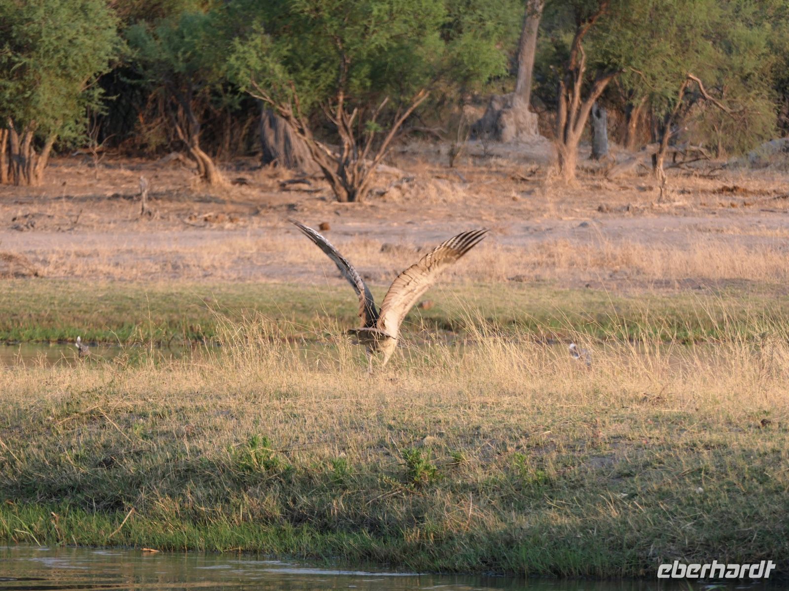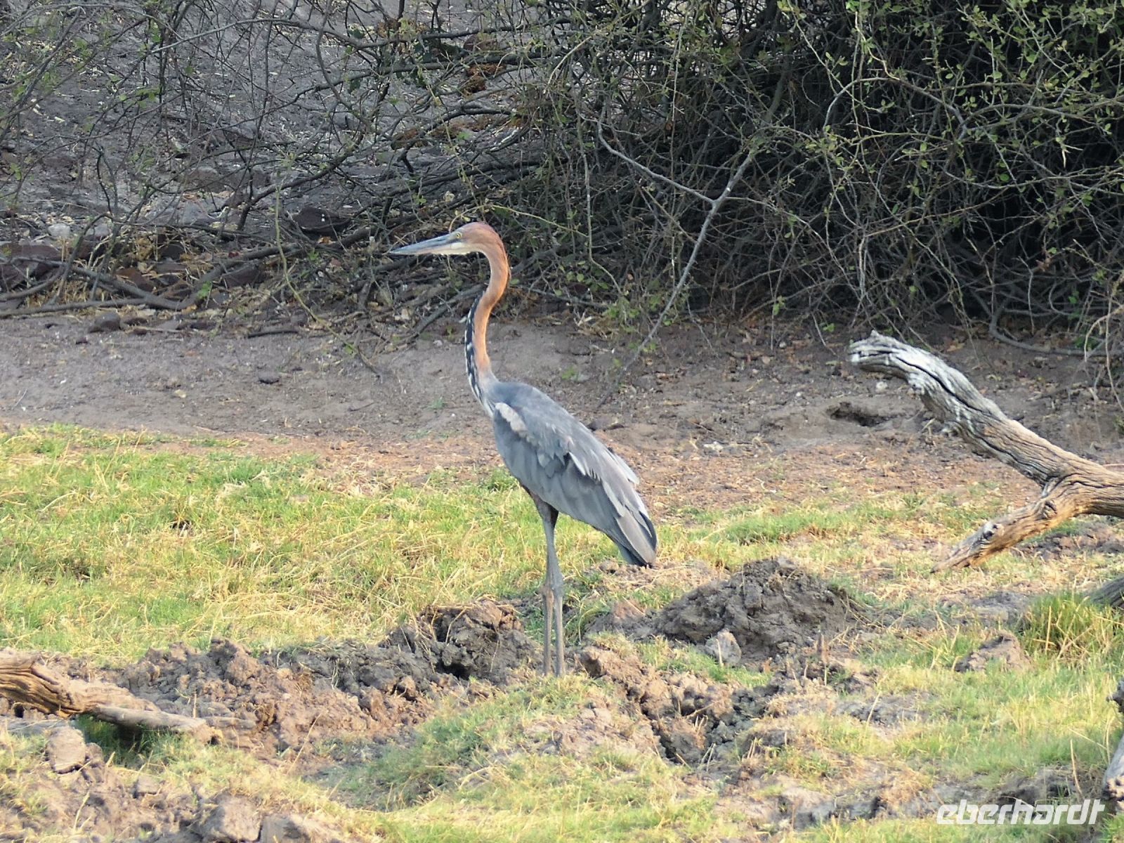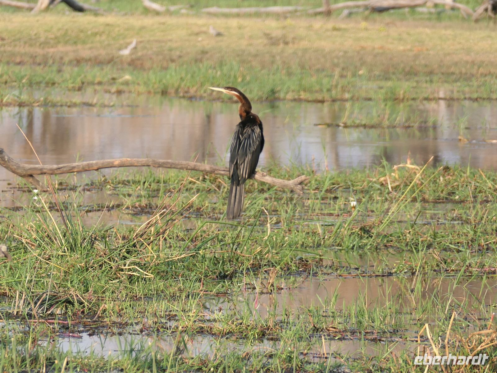 Für die meisten begann der frühe Morgen mit einem heißen Kaffee auf den privaten Terrassen der Zelt-Chalets. Während die Sonne aufging, erwachte auch die Natur: Graufischer beim Frühstück, Krokodile, Reiher - Natur soweit das Auge sehen konnte. Nach dem Frühstück unternahmen wir eine Kanu-Tour, die Eberhardt spontan ins Programm eingebaut hatte. In Zweier-Kajaks (wir mussten nicht selbst paddeln) glitten wir auf dem Chobe entlang. Das Wasser war nur kniehoch. Wir sichteten Klaffschnabler, Reiher einen Wasserwaran und so manch gefiedertes Getier auch Fischer mit ihren Einbooten waren unterwegs. Auf festen Boden pausierten wir uns genossen die Landschaft. Zu Mittag wurde uns ein üppiges Lunch spendiert, wieder viel zu viel. Den weiteren Nachmittag entspannten wir in der Lodge. Von der Terrasse konnten wir Giraffen, Zebras und viele Antilopen auf den weiten Ebenen der Inseln beobachten, auch viele Wasservögel und Krokodile. Glockengeläut kündigte Rinderherden an, die Ebenen werden auch als Weideflächen genutzt, ein Abkommen mit der lokalen Bevölkerung. Am Nachmittag starteten wir zu Pirschafahrt im Jeep, statt per Boot. Mit an Bord waren Petra aus Deutschland und Wolfgang aus Swakopmund, die zunächst wenig begeistert waren, im Jeep der begeisterten Ornithologen Platz zu finden. Ihre Meinung änderte sich aber schnell und es wurde eine lustige und interessante Pirschfahrt. Am Anfang dachten sicher viele wir machen eine Info-Tour zur Agrarwirtschaft Namibias, das änderte sich jedoch schnell. Wir sahen die Brutstätten der diverse Wasservögel ganz nah, ein buntes Kaleidoskop: Nimmersatt, Heiliger Ibis und Hagedasch, Grau- und Seidenreiher. Später entdeckten wir eine Sporengangs, Familie Waffenkiebitz mit flauschigen Nachwuchs, einen Weißbrust-Komoran sowie einen Fish Eagle. Am einer Insel , auf der anderen Seite der botswanische Chobe NP, kam ein stolzer Wasserbock auf uns zu, ein Wasserwaran schlängelte sich zum Wasser, ein gigantischer Goliathreiher traf auf Impalas - einfach toll und wir waren gegeistert. Plötzlich waren wir inmitten großer Herden Steppenzebras umringt. Wir erfuhren, dass diese aufgrund der gegenwärtigen Dürre aus der Khwai Region des Deltas hierher gewandert sind, um Nahrung zu finden (immerhin fast 200 km). An dieser Stelle ließen wir es uns gut gehen, mit Sundowner-Bar und kleinen Snacks zelebrierten wir den Sonnenuntergang in lustiger Runde. Es war eine super Alternative. Unsere Gruppe auf einer anderen Reisen, die sich zur gleichen Zeit direkt in Kasane (Botswana) befand, hat auf der Bootsfahrt keinen einzigen Elefanten gesehen! Und Elefanten hatten wir ja vorher schon zur genüge getroffen. Zurück in der Lodge erwartete uns wieder ein Schlemmer-Buffet in der Boma am Feuer. Mit Petra und Wolfgang an unserem Tisch ließen wir den Abend gemütlich und lustig ausklingen, was einzelne Privatgäste der Lodge etwas störte. Aber, was soll`s - man lebt nur einmal und sollte jeden Tag geniessen. Mein angepriesener Rock Sandy (Lieblingsgetränk) konnte zu später Stunde nur noch die wichtigen Bitters-Tropfen serviert werden. Der Bitters (Angosturo) war leider zur Neige gegangen. Ja, nach zwei Jahren Corona muss man wieder lernen, neu zu kalkulieren und rechtzeitig für Nachschub zu sorgen;-) - Trotzdem, ein schöner Tag neigte sich dem Ende wie auch unsere Reise.