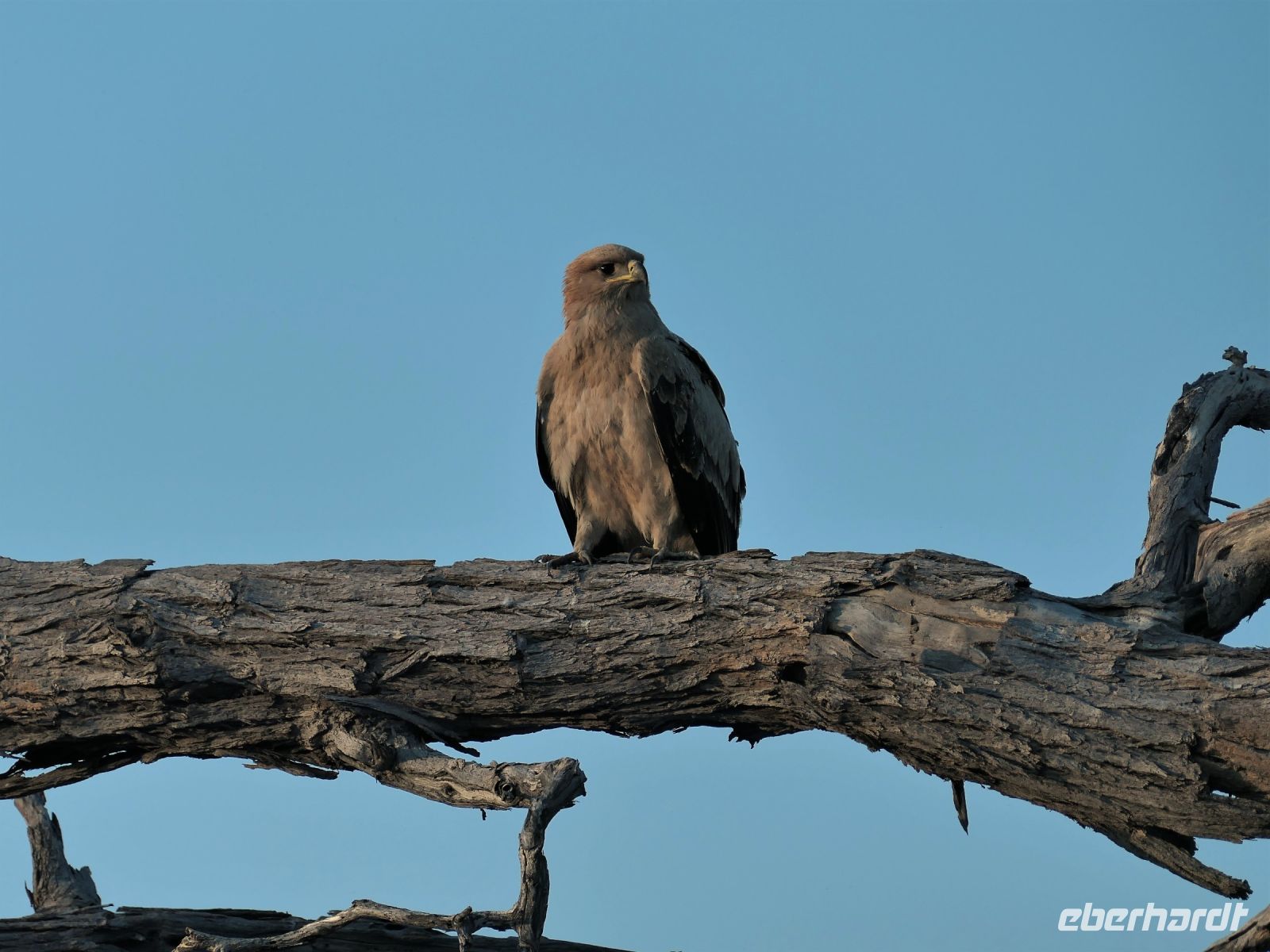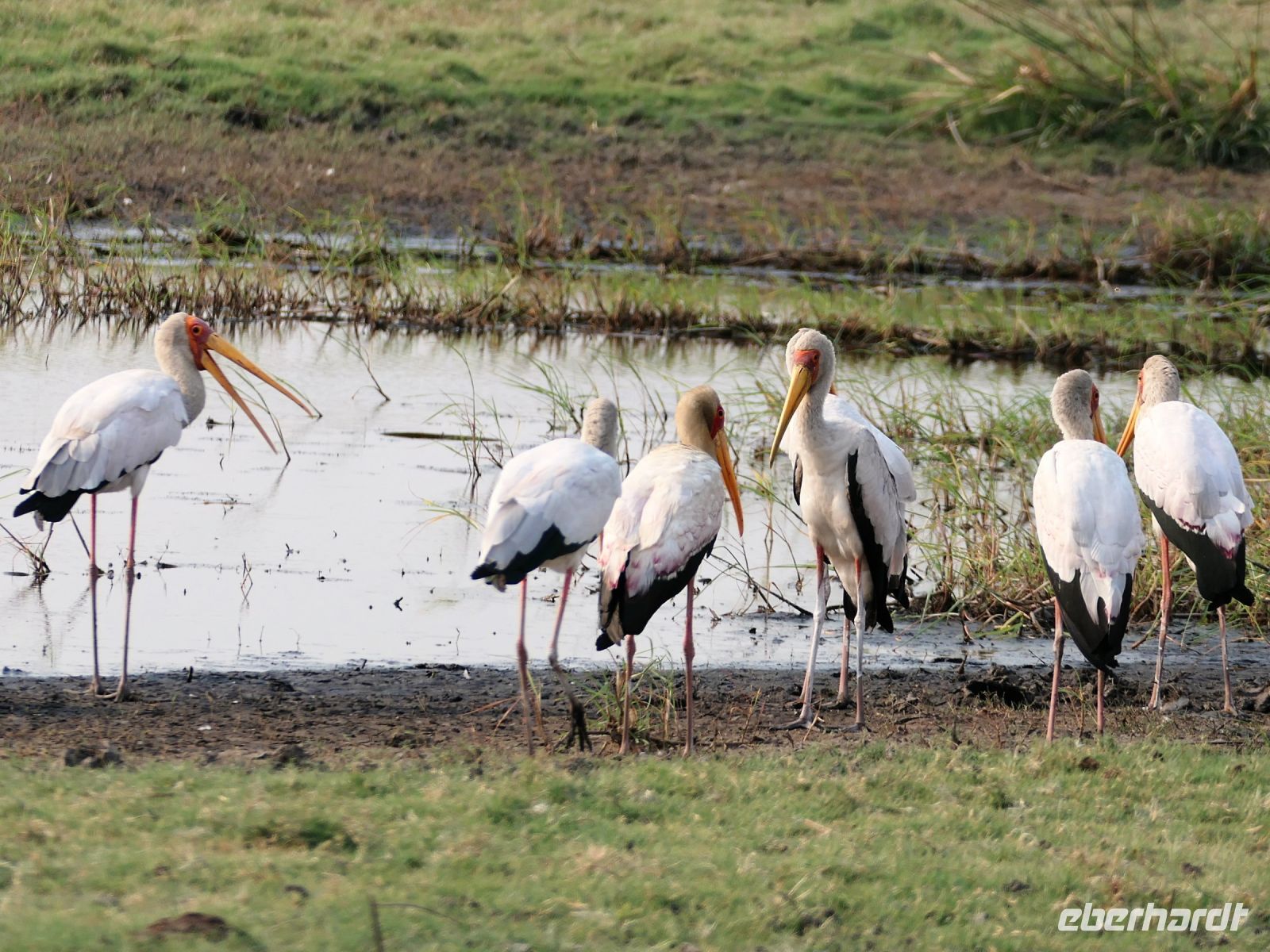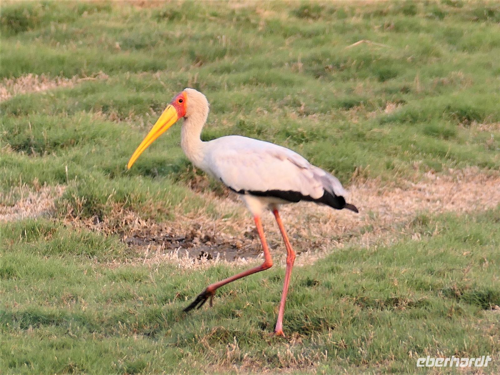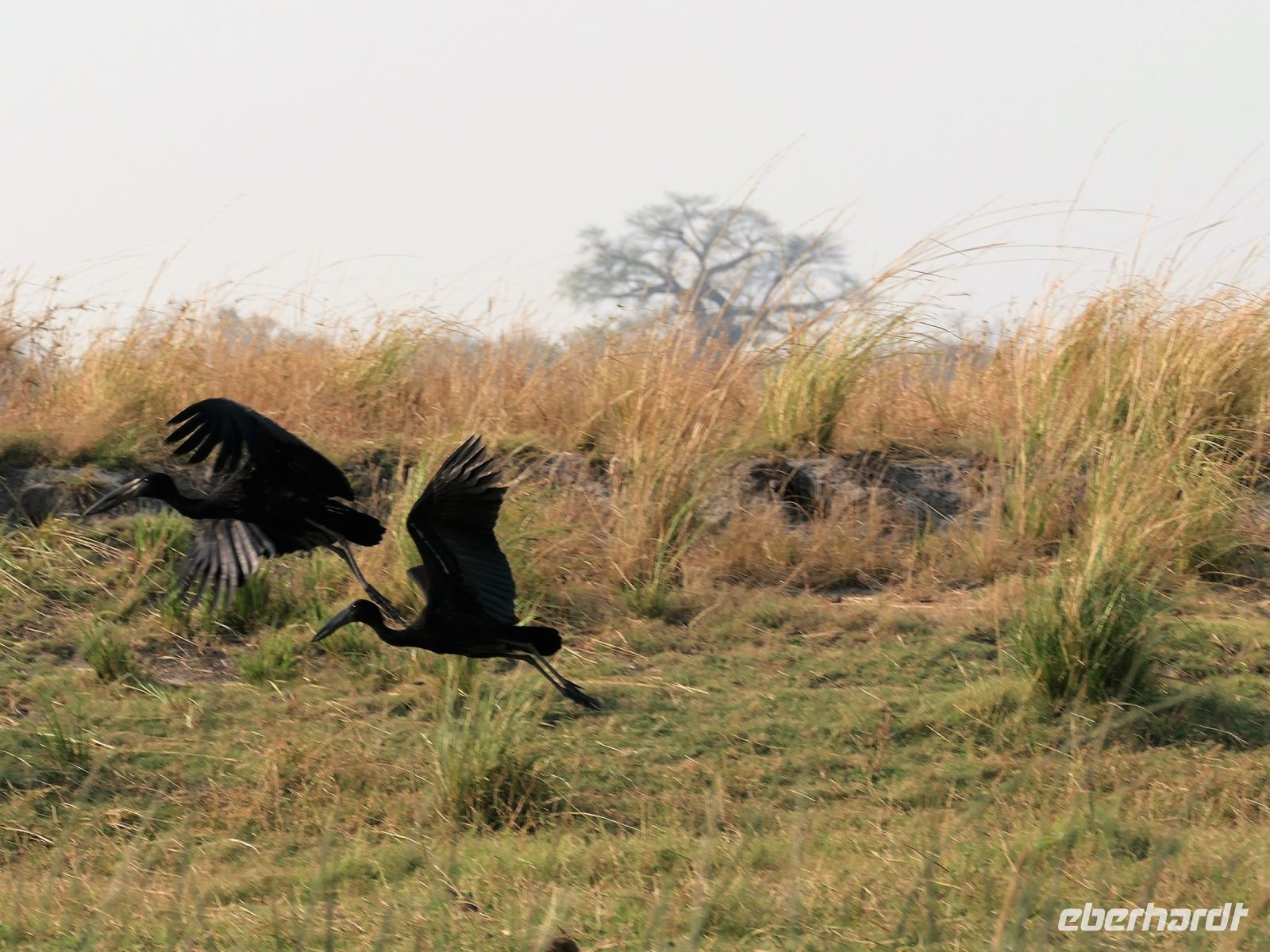 Für die meisten begann der frühe Morgen mit einem heißen Kaffee auf den privaten Terrassen der Zelt-Chalets. Während die Sonne aufging, erwachte auch die Natur: Graufischer beim Frühstück, Krokodile, Reiher - Natur soweit das Auge sehen konnte. Nach dem Frühstück unternahmen wir eine Kanu-Tour, die Eberhardt spontan ins Programm eingebaut hatte. In Zweier-Kajaks (wir mussten nicht selbst paddeln) glitten wir auf dem Chobe entlang. Das Wasser war nur kniehoch. Wir sichteten Klaffschnabler, Reiher einen Wasserwaran und so manch gefiedertes Getier auch Fischer mit ihren Einbooten waren unterwegs. Auf festen Boden pausierten wir uns genossen die Landschaft. Zu Mittag wurde uns ein üppiges Lunch spendiert, wieder viel zu viel. Den weiteren Nachmittag entspannten wir in der Lodge. Von der Terrasse konnten wir Giraffen, Zebras und viele Antilopen auf den weiten Ebenen der Inseln beobachten, auch viele Wasservögel und Krokodile. Glockengeläut kündigte Rinderherden an, die Ebenen werden auch als Weideflächen genutzt, ein Abkommen mit der lokalen Bevölkerung. Am Nachmittag starteten wir zu Pirschafahrt im Jeep, statt per Boot. Mit an Bord waren Petra aus Deutschland und Wolfgang aus Swakopmund, die zunächst wenig begeistert waren, im Jeep der begeisterten Ornithologen Platz zu finden. Ihre Meinung änderte sich aber schnell und es wurde eine lustige und interessante Pirschfahrt. Am Anfang dachten sicher viele wir machen eine Info-Tour zur Agrarwirtschaft Namibias, das änderte sich jedoch schnell. Wir sahen die Brutstätten der diverse Wasservögel ganz nah, ein buntes Kaleidoskop: Nimmersatt, Heiliger Ibis und Hagedasch, Grau- und Seidenreiher. Später entdeckten wir eine Sporengangs, Familie Waffenkiebitz mit flauschigen Nachwuchs, einen Weißbrust-Komoran sowie einen Fish Eagle. Am einer Insel , auf der anderen Seite der botswanische Chobe NP, kam ein stolzer Wasserbock auf uns zu, ein Wasserwaran schlängelte sich zum Wasser, ein gigantischer Goliathreiher traf auf Impalas - einfach toll und wir waren gegeistert. Plötzlich waren wir inmitten großer Herden Steppenzebras umringt. Wir erfuhren, dass diese aufgrund der gegenwärtigen Dürre aus der Khwai Region des Deltas hierher gewandert sind, um Nahrung zu finden (immerhin fast 200 km). An dieser Stelle ließen wir es uns gut gehen, mit Sundowner-Bar und kleinen Snacks zelebrierten wir den Sonnenuntergang in lustiger Runde. Es war eine super Alternative. Unsere Gruppe auf einer anderen Reisen, die sich zur gleichen Zeit direkt in Kasane (Botswana) befand, hat auf der Bootsfahrt keinen einzigen Elefanten gesehen! Und Elefanten hatten wir ja vorher schon zur genüge getroffen. Zurück in der Lodge erwartete uns wieder ein Schlemmer-Buffet in der Boma am Feuer. Mit Petra und Wolfgang an unserem Tisch ließen wir den Abend gemütlich und lustig ausklingen, was einzelne Privatgäste der Lodge etwas störte. Aber, was soll`s - man lebt nur einmal und sollte jeden Tag geniessen. Mein angepriesener Rock Sandy (Lieblingsgetränk) konnte zu später Stunde nur noch die wichtigen Bitters-Tropfen serviert werden. Der Bitters (Angosturo) war leider zur Neige gegangen. Ja, nach zwei Jahren Corona muss man wieder lernen, neu zu kalkulieren und rechtzeitig für Nachschub zu sorgen;-) - Trotzdem, ein schöner Tag neigte sich dem Ende wie auch unsere Reise.