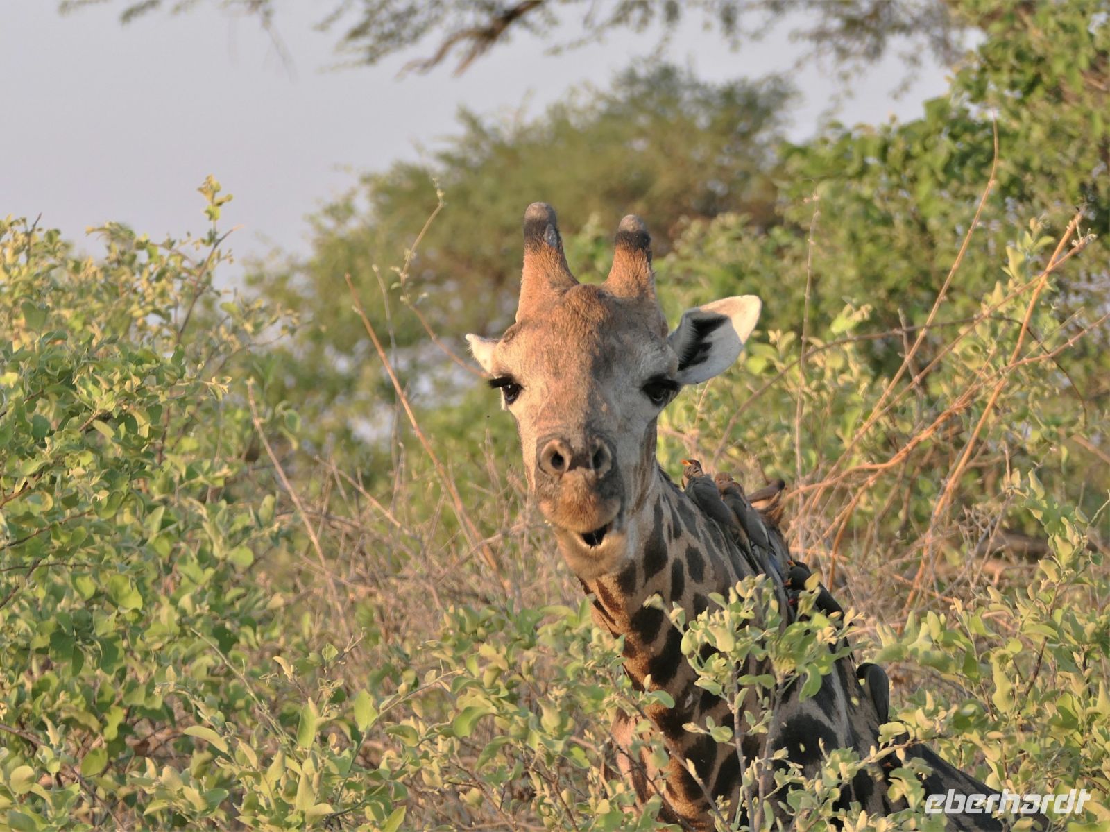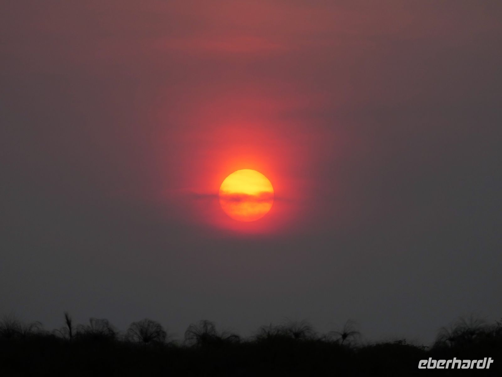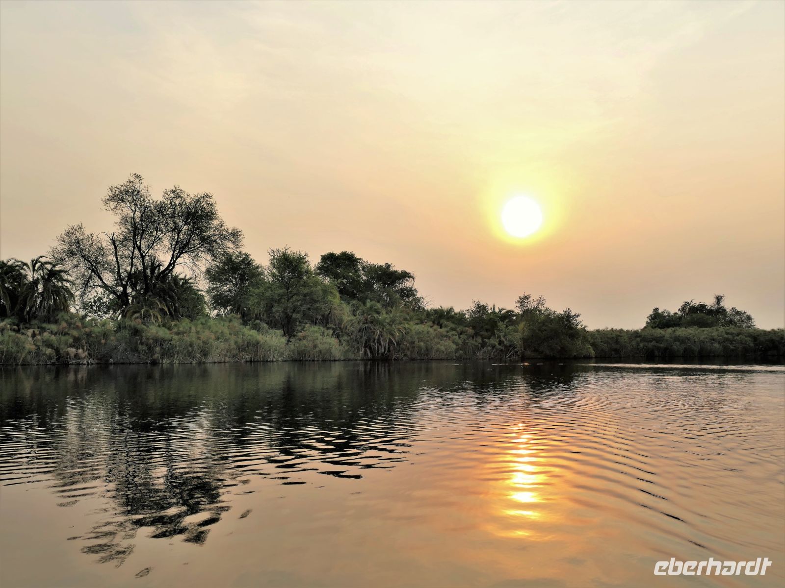 Heute stand wieder ein Fahrtag mit Länderwechsel auf dem Programm. Erstaunlicherweise wurde die Straße, je näher wir der Grenze zu Namibia kamen besser und wir kamen schnell voran. Die Beamten am Veterinärzaun mit Desi-Schleuse waren am Morgen noch nicht betriebswarm und wir konnten einfach durchfahren. An der Grenze bei Mohembo war wieder Zettelwirtschaft angesagt. Die botswanischen Beamten beharrten auf ihren Ausreiseformularen, obwohl diese gar nicht mehr gebraucht werden. Also schnell ausgefüllt und zur Einreise Namibia, bewaffnet mit bereits ausgefüllten Einreiseformularen. Doch zuvor war noch ein Gesundheitscheck angesagt inklusive handschriftlicher Bestätigung, dass man gesund ist.... Aber alles gut, dass sichert viele Arbeitsplätze. Kurz darauf durchquerten wir den kleinen Mahango NP auf der Transitstrecke. Bei Divundu treffen wir auf den mächtigen (O)Kavango, einer der drei großen Flüsse, die ständig Wasser führen und durch die Sambesi Region führen. Wir überqueren die Brücke: auf der einen Seite heißt der Fluss Okavango, auf der anderen Kavango - je nach dem von welcher Seite man kommt. Nach einer kurzen Pause mit Picknick geht es nun durch den Caprivi-Streifen (heute Zambezi Region genannt) gen Ost. Die Region wird nun immer grüner. Wir reisen entlang des großen Bwatwata Nationalparks, der sich fast durch das gesamte Gebiet des westlichen Caprivi-Streifens erstreckt. Der schmale Streifen gehört zu Namibia, rechts liegt Botswana und links Angola. Bäume säumen die Teerstraße. Rechts und links viele Dörfer mit ihren Rundhütten aus Lehm. Verkehrsschilder warnen vor Elefanten, die hier regelmäßig zum Okavango durchstapfen. Wir halten die Augen offen, auch einige Buschfeuer sehen und riechen wir (nicht ungewöhnlich in dieser Zeit, kurz vor dem Regen und teilweise auch kontrolliert gezündet, um der Verbuschung Herr zu werden). Bei Kongola erreichen wir den Kwando, der auch in Angola entspringt und in den Sambesi fließt. Am Unterlauf wird der Fluß Linyanti und später Chobe genannt - 3 Namen für einen Fluß. Am frühen Nachmittag checkten wir in die wildromantische Namushasha Lodge ein und bezogen unsere komfortablen Chalets. King KK und seine Queen wohnten standesgemäß im großen 2-Zimmer-Chalet. Die Zeit bis zum Abendessen verbringen wir mit Relaxen, beim Durchstreifen des wunderschönen Gartens oder auf der Aussichtsterrasse bei einem kühlen Getränk. Am Abend bedienten wir uns am super leckeren Buffet, genossen den lauen Sommerabend auf der Terrasse unterm Sternenzelt und beendeten den Tag mit einem Amarula oder Gin & Tonic. Der Gesang der Frösche mit ihren Klick, Klick, Klick und das Grunzen der Hippos begleitete uns durch die Nacht.