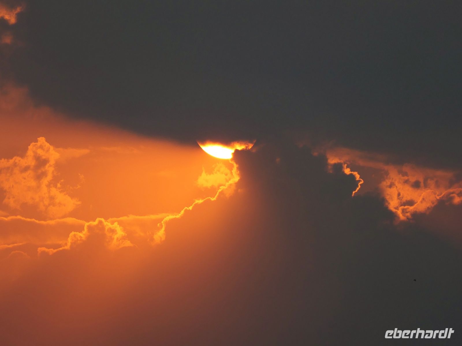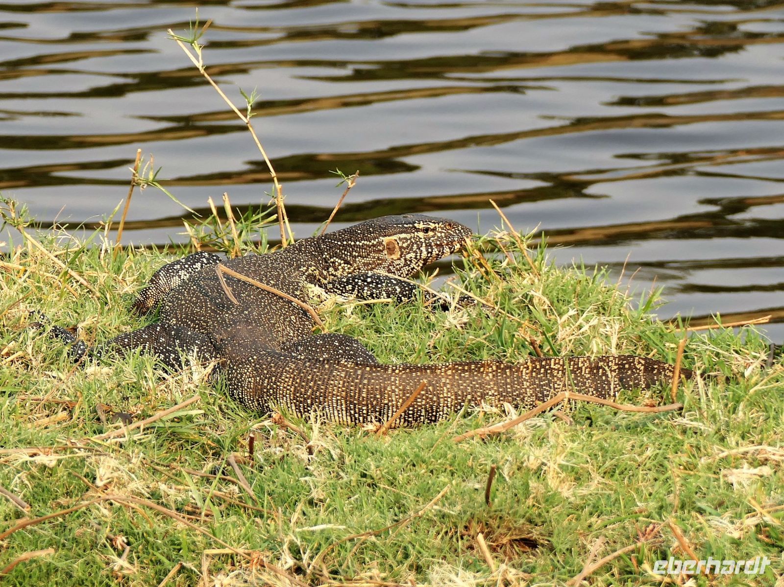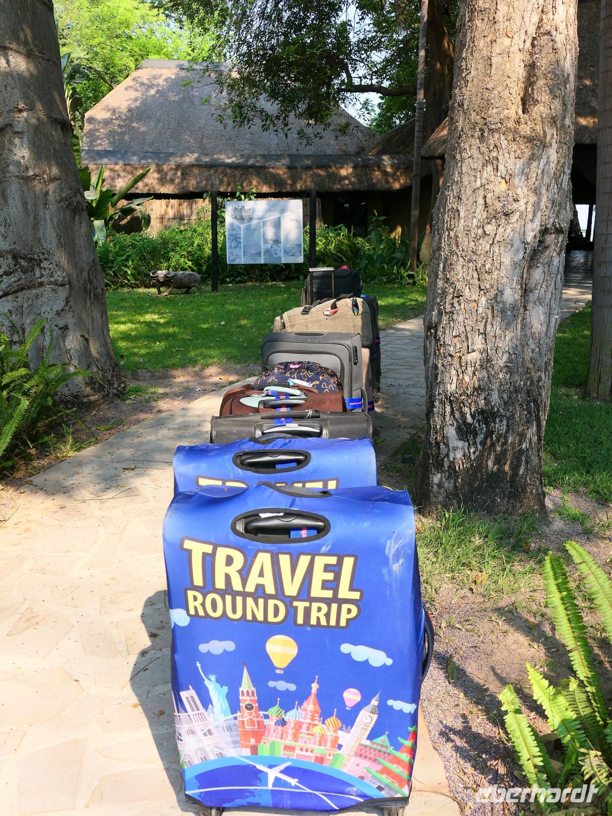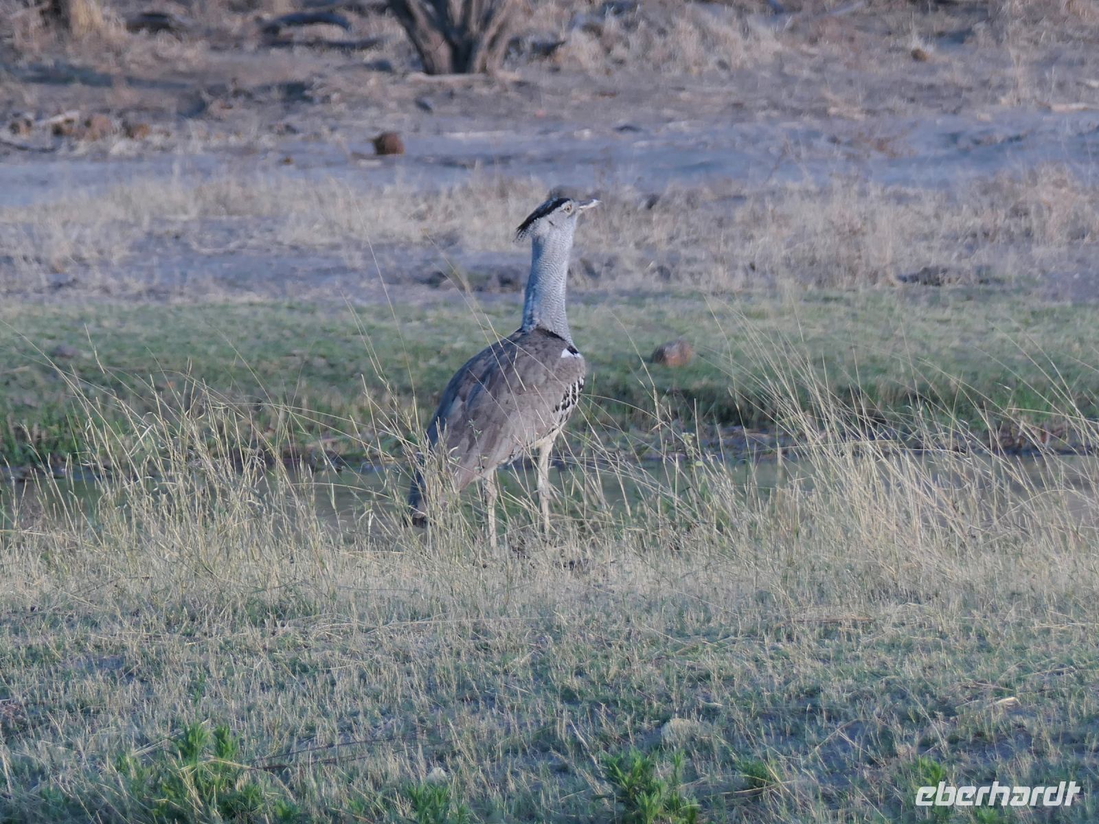 Heute stand wieder ein Fahrtag mit Länderwechsel auf dem Programm. Erstaunlicherweise wurde die Straße, je näher wir der Grenze zu Namibia kamen besser und wir kamen schnell voran. Die Beamten am Veterinärzaun mit Desi-Schleuse waren am Morgen noch nicht betriebswarm und wir konnten einfach durchfahren. An der Grenze bei Mohembo war wieder Zettelwirtschaft angesagt. Die botswanischen Beamten beharrten auf ihren Ausreiseformularen, obwohl diese gar nicht mehr gebraucht werden. Also schnell ausgefüllt und zur Einreise Namibia, bewaffnet mit bereits ausgefüllten Einreiseformularen. Doch zuvor war noch ein Gesundheitscheck angesagt inklusive handschriftlicher Bestätigung, dass man gesund ist.... Aber alles gut, dass sichert viele Arbeitsplätze. Kurz darauf durchquerten wir den kleinen Mahango NP auf der Transitstrecke. Bei Divundu treffen wir auf den mächtigen (O)Kavango, einer der drei großen Flüsse, die ständig Wasser führen und durch die Sambesi Region führen. Wir überqueren die Brücke: auf der einen Seite heißt der Fluss Okavango, auf der anderen Kavango - je nach dem von welcher Seite man kommt. Nach einer kurzen Pause mit Picknick geht es nun durch den Caprivi-Streifen (heute Zambezi Region genannt) gen Ost. Die Region wird nun immer grüner. Wir reisen entlang des großen Bwatwata Nationalparks, der sich fast durch das gesamte Gebiet des westlichen Caprivi-Streifens erstreckt. Der schmale Streifen gehört zu Namibia, rechts liegt Botswana und links Angola. Bäume säumen die Teerstraße. Rechts und links viele Dörfer mit ihren Rundhütten aus Lehm. Verkehrsschilder warnen vor Elefanten, die hier regelmäßig zum Okavango durchstapfen. Wir halten die Augen offen, auch einige Buschfeuer sehen und riechen wir (nicht ungewöhnlich in dieser Zeit, kurz vor dem Regen und teilweise auch kontrolliert gezündet, um der Verbuschung Herr zu werden). Bei Kongola erreichen wir den Kwando, der auch in Angola entspringt und in den Sambesi fließt. Am Unterlauf wird der Fluß Linyanti und später Chobe genannt - 3 Namen für einen Fluß. Am frühen Nachmittag checkten wir in die wildromantische Namushasha Lodge ein und bezogen unsere komfortablen Chalets. King KK und seine Queen wohnten standesgemäß im großen 2-Zimmer-Chalet. Die Zeit bis zum Abendessen verbringen wir mit Relaxen, beim Durchstreifen des wunderschönen Gartens oder auf der Aussichtsterrasse bei einem kühlen Getränk. Am Abend bedienten wir uns am super leckeren Buffet, genossen den lauen Sommerabend auf der Terrasse unterm Sternenzelt und beendeten den Tag mit einem Amarula oder Gin & Tonic. Der Gesang der Frösche mit ihren Klick, Klick, Klick und das Grunzen der Hippos begleitete uns durch die Nacht.
