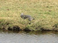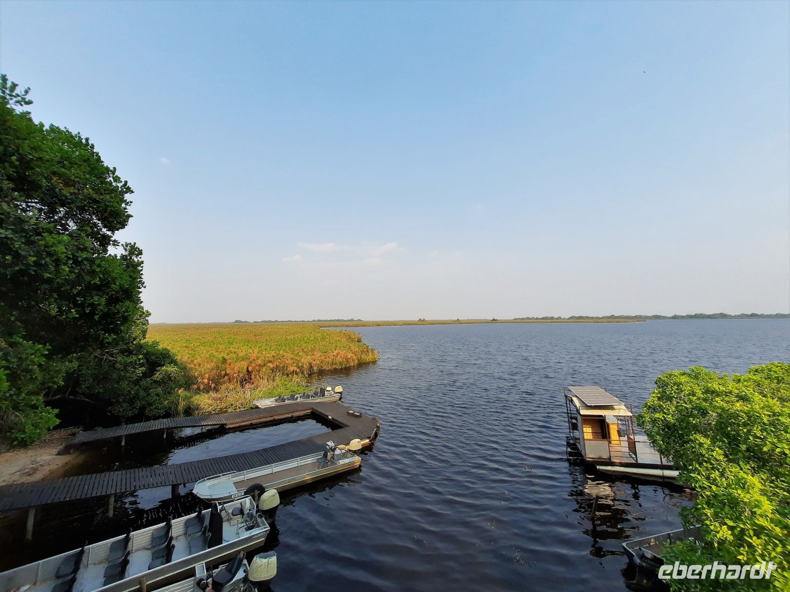 Heute hieß es Abschied nehmen von der Khwai Region und unseren netten Gastgebern der Mogotlho Lodge, die uns ebenso so herzlich Bye Bye sagen wie wir empfangen wurden. Nicht nur unser Gepäck, sondern auch leckere Lunchpakete werden im Truck verstaut. Wir fuhren früher als üblich ab, denn zunächst mussten wir die Dirty Road zurück nach Maun (ca. 4 h für 114 km). Brendon, einer der Manager sagte mir noch, dass er nicht glaubt, dass die öffentliche Pad Kasane - Maun in nächster Zeit ausgebessert wird, das Geld fehle. Für den nun wieder langsam beginnenden Tourismus sei das für die Lodge schlecht. Daher überlegt der Eigentümer, einen eigenen Airstrip zu bauen, damit Gäste die Lodge bequem mit dem Busch-Flieger erreichen können. Wir werden die Entwicklung verfolgen. Am Buffalo Gate (Veterinärzaun) nahm man es diesmal nicht so genau, nur unser Fahrzeug musste durch die Desi-Kuhle. Von Maun, die Stadt ist in den letzten Jahren enorm gewachsen, vieles wurde neu gebaut, führte eine besser ausgebaute Asphaltstraße vorbei an kleinen Dörfern. Das Projekt: Ausbau der Wasserversorgungsinfrastruktur, welches vor Corona begonnen wurde, ist immer noch nicht fertig - große Wasserrohre warten am Straßenrand auf die Verlegung. Eine stabile Wasserversorgung wird immer wichtiger, denn der Klimawandel macht auch vorm südlichen Afrika nicht halt. Teilweise spielt das Wetter verrückt, so hat es während unserer Reise in Windhoek mächtig gehagelt. Die Hagelkörner hatten die Größe von Tischtennisbällen, die wurden dann zur Kühlung diverser Getränke in den Vorgärten genutzt. Die Dürreperioden werden immer häufiger und länger, die großen Flüsse führen weniger Wasser. Wir umrunden heute das Okavango Delta am südlichen Rand bis zur westlichen Seite, zum sogenannten Pfannenstil. Die Straße, die wir zunächst Richtung Westen befahren, bildet die Grenze zum trockenen Süden, wo das Wasser aus dem Delta in den Salzpfannen endet bzw. verdunstet. Hier befindet sich noch ein letzter, großer See, der Lake Ngami, der vom Wasser aus dem Okavango Delta gespeist wird. Er hat ganzjährig Wasser, da er in einer Senke des Kalahari-Becken an der Nordgrenze der Wüste liegt. Obwohl alles flach und eben, befinden wir uns fast 1.000 m über den Meerspiegel. Später biegen wir nach Norden ab und die Straße wird zunehmender dirty und einsamer und es wird auch heiß. Ein Baum spendet uns etwas Schatten für ein schnelles Picknick. Auf den letzten 150 km gibt es nur eine größere Ortschaft namens Gumare mit einer Tankstelle. Unser Truck hatte Durst. Am Nachmittag erreichten wir Etsha. In der Region leben 13 Hambukushu-Clans, die ursprünglich aus Angola stammen. Deshalb besteht Etsha aus ca. 13 Dörfern, die ebenso nummeriert sind. Bei Etsha 13 biegen wir zu unserer nächsten Lodge ab. Umsteigen müssen wir nicht, denn es ist trocken und unser Fahrzeug hat Allrad-Antrieb. Ein Escort-Fahrzeug begleitet uns dennoch. In der grünen, nassen Saison gelangt man zur Lodge nur mit Booten oder geländegängigen Jeeps, da die Ebenen vom Okavango geflutet sind. In der Trockenzeit werden sie als Weideflächen für die Rinderherden der Clans genutzt. Die "Nguma Island Lodge" befindet an der großen Nguma-Lagune westlich des "Pfannenstiel" (Panhandle) des Okavango-Delta. Der Okavango führt hier am Unterlauf permanent Wasser, bevor er sich ins Delta breit ausfächert. Wenn man das Okavango Delta erklären möchte, nimmt am Besten seinen Arm: der Unterarm ist der Okavango, der in Angola entspringt - das Handgelenk ist der Pfannenstiel und die gespreizte Hand symbolisiert das verzweigte Delta des Flusses. Auf Nguma Island bezogen wir unsere Zeltchalets auf Stelzen (mit eigener Du/WC und kleiner Terrasse) unter den neugierigen Augen der der kleinen Meerkatzen. Die Zeltchalets tragen alle Namen von heimischen Fischen, sie sind einfacher, als die luxuriösen Unterkünfte der letzten Tage, aber sauber und man hat alles was man braucht. Die Lodge befindet sich eigentlich auf einer kleinen Insel, die wir aber trockenen Fußes erreichten. Die herrliche Lage, direkt an der Lagune, die Schatten spendenden Bäume und die Ruhe - eine kleine Oase nach der holprigen Fahrt hierher. Am Abend wartete ein gedeckter Tisch und ein leckeres Abendessen a la Hausmannskost auf uns. Den Tag ließen wir am Lagerfeuer mit Amarula und Gin & Tonic ausklingen und beschlossen einstimmig den nächsten Tag ganz entspannt zu verbringen.