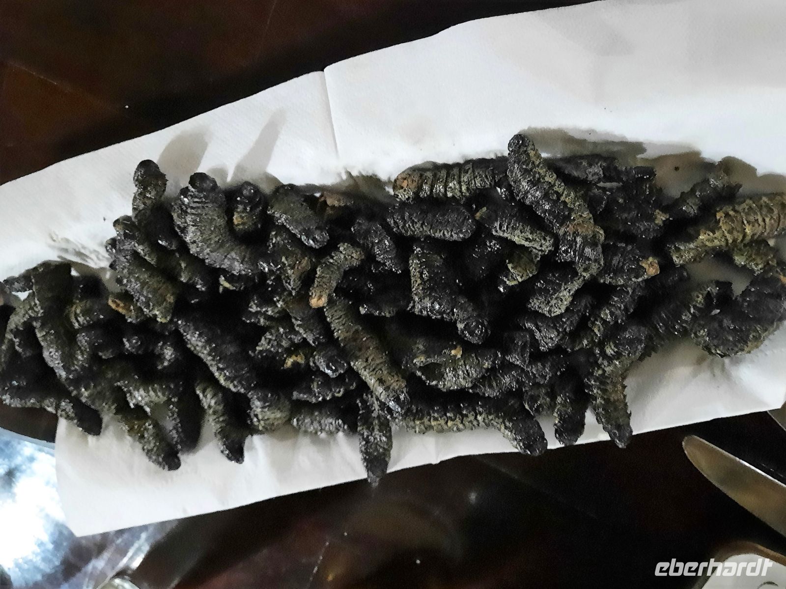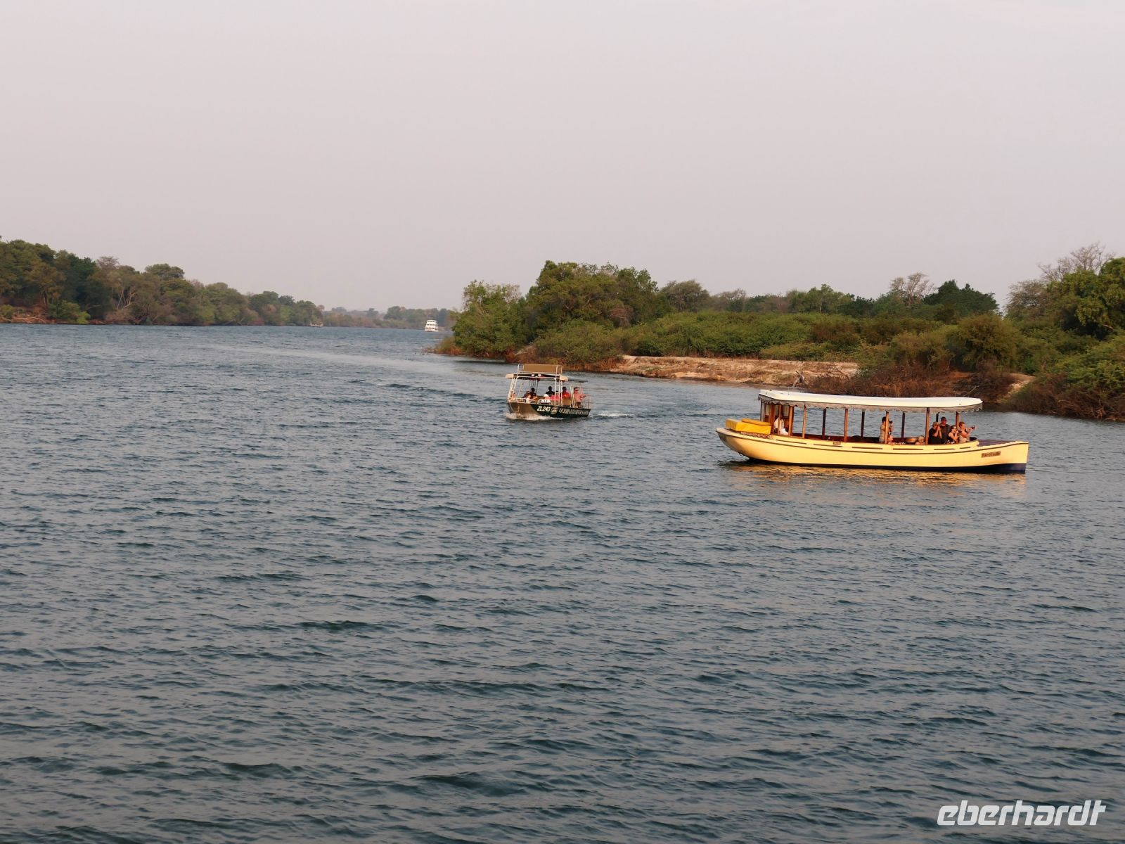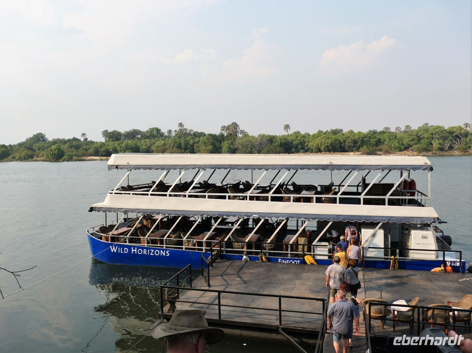 Am späteren Nachmittag stand eine letzte Bootsfahrt auf dem mächtigen Sambesi auf dem Programm. Bei Getränken , kleinen Snacks und vielen Gesprächen ließen wir die vielen, unvergesslichen Momente der Reise noch einmal Revue passieren. Als Bonus präsentierten sich uns noch einmal Hippos, Elefanten am Ufer, Krokodil & Co. Wir genossen einfach nur den letzten Sundowner am Sambesi. Am letzten Abend bedienten wir uns am schmackhaften Buffet mkt gegrilltem Krokodil, Kudu und anderem Game-Fleisch, auch geröstete Mopane-Würmer konnten verkostet werden. Mit Musik und Tanz wurden wir verabschiedet - ein kleiner Umtrunk auf der Terrasse beendete den Tag. An diesem Abend verabschieden wir auch herzlich unseren Tutu, der uns auf ca. 2.229 km chauffiert und begleitet hat, denn am nächsten frühen Morgen fährt er schon die lange Strecke nach Windhoek zurück.
