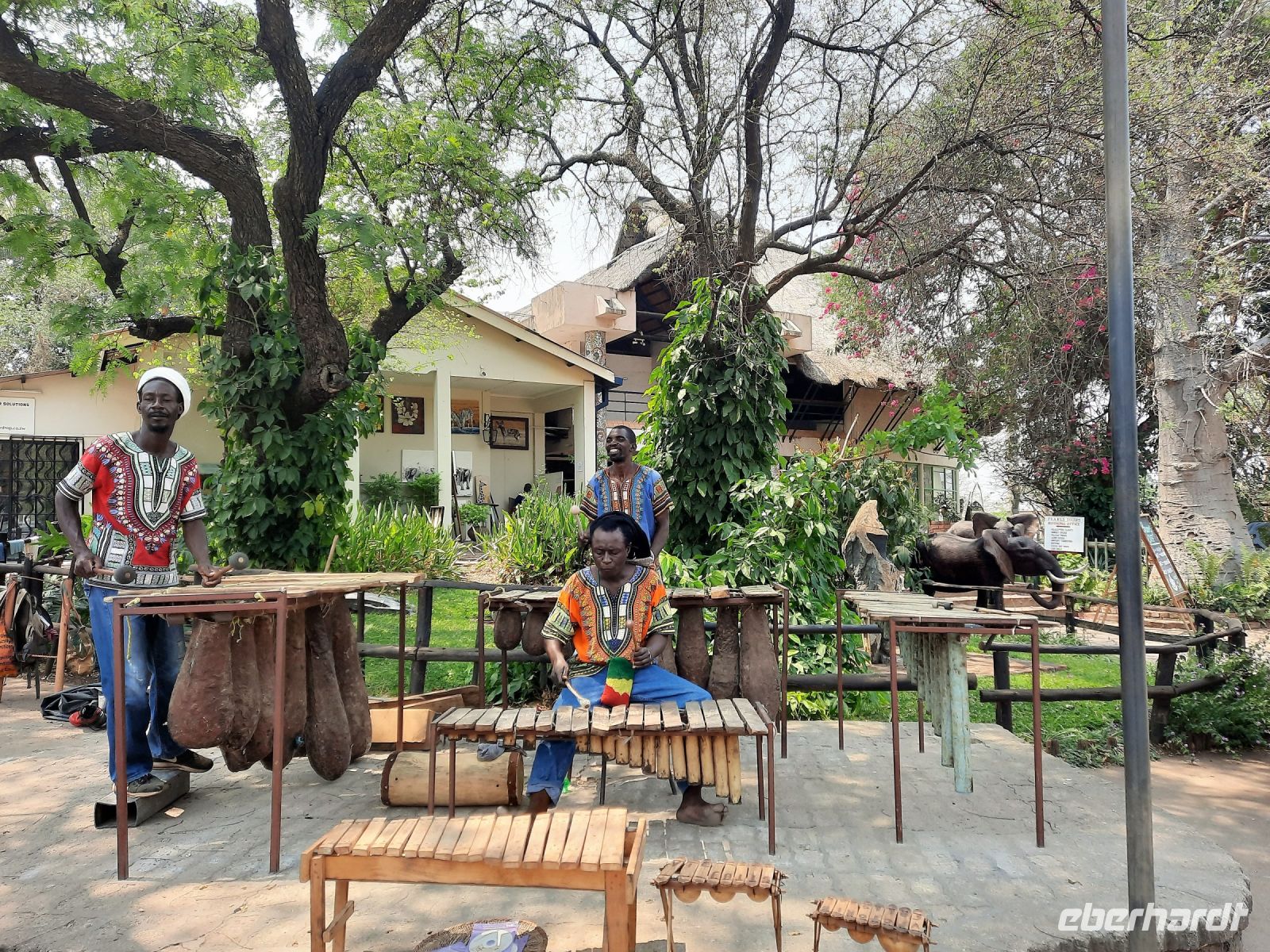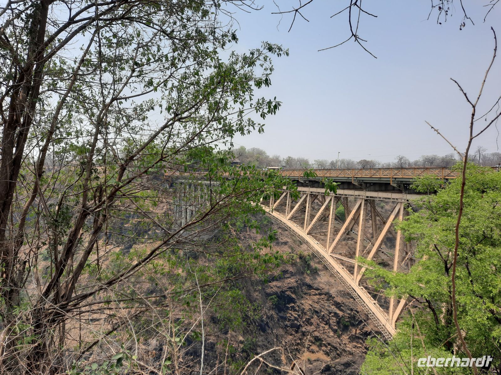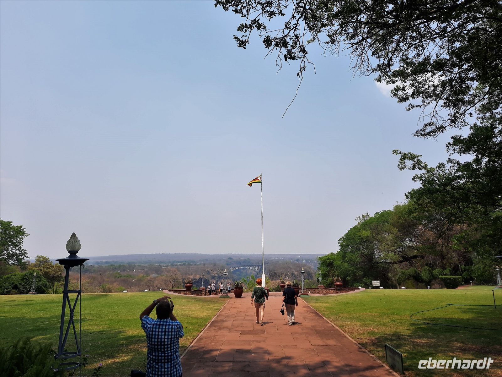 Abschied von Namibia - Nach dem Frühstück checken wir aus und fahren nach Ngoma zürück. Über die Bridge gelangen wir zur Grenze. Die Ausreiseformalitäten Namibia sind schnell erledigt. Bei Einreise in Botswana entgehen wir diesmal der Zettelwirtschaft, keinerlei Formulare werden verlangt (umsonst durch EHT vorbereitet). Das ist eben Afrika, mal so, mal so. Trotzdem Gesundheitscheck ist diesmal erforderlich. On man nun den OR-Code der LIDL App zeigt oder vom Impfzertifikat scheint nicht wichtig. Mittlerweile sind alle Beschränkungen zur Einreise in Botswana aufgehoben. Veterinärschleuse mit 2. Paar Schuhe wird aber hier Ernst genommen, wie auch die Kontrolle der bisherigen Ein- und Ausreisetempel. Auf freundliche Nachfrage dürfen wir die Grenze, die Schleusen matte und auch die gigantischen Baobas an der Grenze fotografieren, kein Problem. Nach dem GÜS warnen uns wieder Schilder vor Elefanten. Die asphaltierte Transitstrecke führt direkt durch den Chobe NP und wird dürfen nur mit geminderter Geschwindigkeit fahren und nicht anhalten: Wir sehen Elefanten, Giraffen und den seltenen Hornraben mit ihrem markanten roten Horn auf dem Schnabel. Sie trifft man nur in ungeraden Gruppen n (3, 5 oder 7). Das finde ich persönlich super, da gibt es bei Abstimmungen nie ein Unentschieden. Vorbei an Kasane fahren wir Richtung Kazungula. Seit Anfang 2022 ist dort die neue Grenzbrücke von Botswana nach Sambia eröffnet. Bisher war die Überfahrt nur per maroder, öffentlicher Fähre oder kleinen privaten Booten möglich. Wir erfuhren, dass der Mann von Nookie (Besitzerin der Nguma Island Lodge) ist ein südafrikanischer Multi-Bauunternehmer und war maßgeblich am Bau dieser Brücke beteiligt. An der Grenze zu Simbabwe ging es relativ schnell, ohne Formulare und Bürokratie, auch Dank des Multi-Entry-Visa (doppelte Einreise Simbabwe), welches schon in unseren Pässen klebte. Zügig kamen wir am frühen Nachmittag in Vic Falls an. Unsere Pause verbrachten wir im Elephant Walk Center, wo wir mit Marimba-Kängen empfangen wurden. Gestöbert wurde in den zahlreichen Souvenirshops oder auf dem angrenzenden lokalen Holzmarkt, wo gefeilscht werden durfte. Andere gönnten sich einen Kaffee oder ein kühles Getränk m schattigen Garten-Cafe. Bald darauf checkten wir in unserer letzten Unterkunft der A Zambezi Lodge, direkt am Ufer des Sambesis ein. In der Lodge entspannten wir und erfrischten uns im Pool, denn dieser Tag war auch wieder sehr warm. Beim gemeinsamen Abendessen mit musikalischer Unterhaltung waren auch Elefanten zu Gast. Später wollten wir noch einen Schlummertrunk auf den Terrassen unserer Zimmer nehmen. Die Getränke waren in Annetts Zimmer deponiert. Diese waren aber nur von hinten zugänglich. Bevor Annett in ihr Zimmer kam, musste sie sich noch etwas gedulden. Keine 3 m vor der Tür graste eine großer Elefantenbulle und die Sicherheitsmitarbeiter der Lodge zerrten Annett in sichere Zonen. Uff, später auf Terrasse saßen wir in geselliger Runde und beobachteten den Elefanten, wie er keine 20 m vor uns, gemächlich über die grüne Wiese zum Pool marschierte. Zu später Stunde kamen dann noch die Hippos zum Futtern, keine 3 m von unseren Terrassentüren entfernt. Ich hab sie leider verschlafen, obwohl ich mich verkehrt herum ins Bett gelegt hatte, um den besten Blick zu haben.