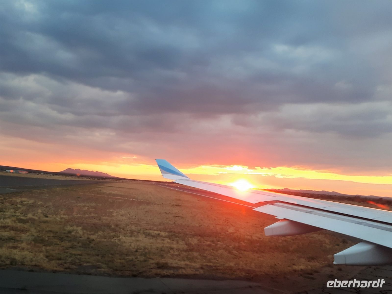 Auf dem Flughafen in Frankfurt/Main trafen sich 12 Reisegäste und Reisebegleitung Annett, um gemeinsam via Windhoek nach Vic Falls in Simbabwe zu fliegen. Wir waren alle sehr gespannt, endlich wieder dorthin reisen zu können. 2 Jahre herrschte in Botswana und Simbabwe fast touristischer Stillstand wegen Corona. Und pünktlich nach Öffnung hat Eurowings Discover diese Flugverbindung 2022 ins Programm genommen. Der Flieger startete am Abend und war nur mässig gefüllt, sodass wir uns etwas ausbreiten konnten. Bei der Zwischenlandung in Windhoek am nächsten Morgen konnten wir in der Maschine bleiben.