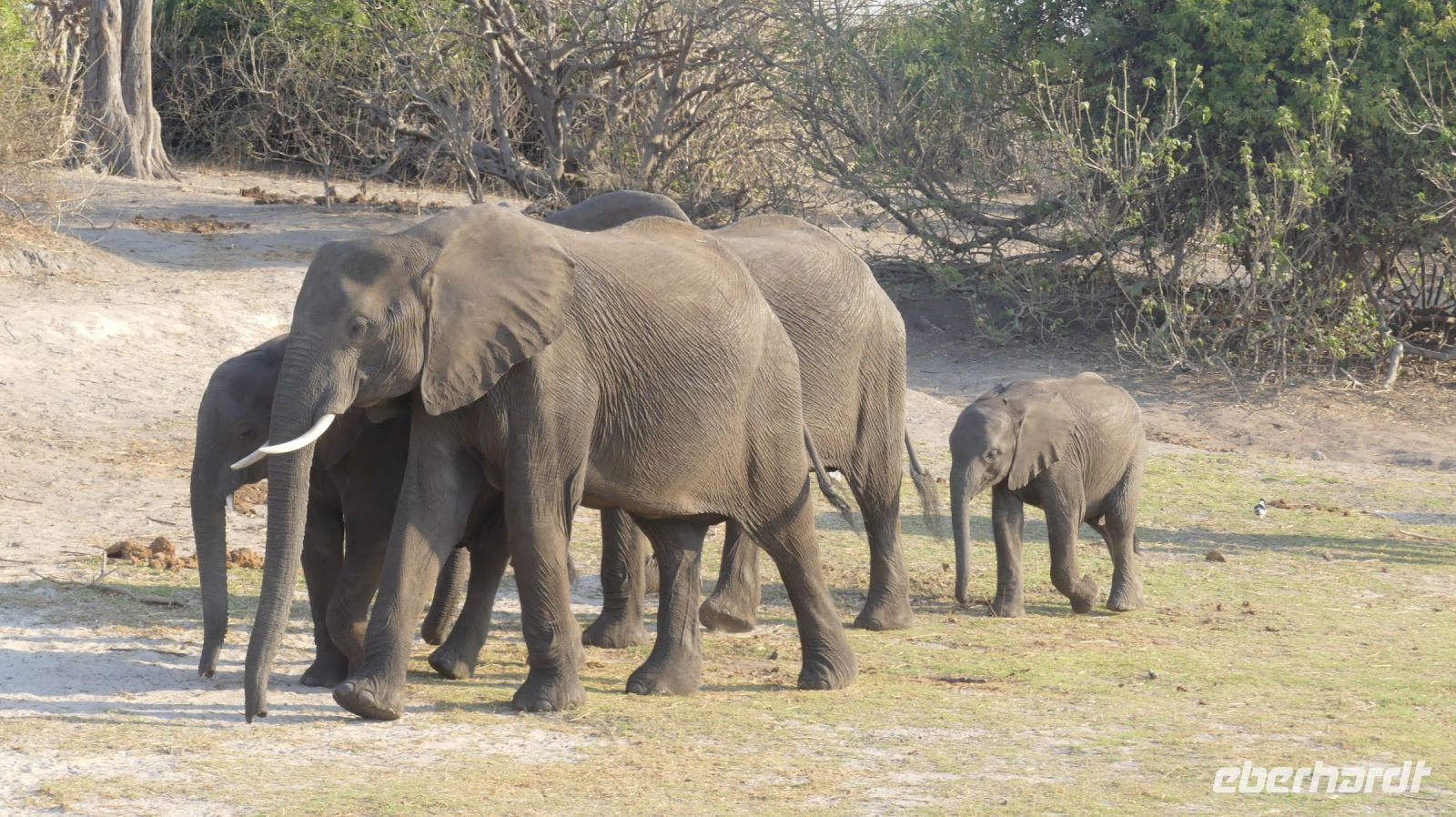 Nach einem Halt am Supermarkt und Geldautomaten, der nicht jedem Geld geben möchte, verlassen wir Kasane. Die Fahrt Richtung Süden führt durch flaches Buschland, welches von der trockenen Jahreszeit geprägt ist. Zuletzt soll es im April Regen gegeben haben. Hin und wieder sichten wir Wildtiere wie Paviane, Giraffen, Hornraben, Giraffen, Impalas, Strauße, Elefanten…und Heiner versorgt uns mit den passenden Informationen dazu. Nach einem Veterinärcheckpoint – d. h. aussteigen und Schuhsohlen desinfizieren, legen wir mittags eine Pause in der Elephant Sands Lodge ein. Die Lodge hat sehr nah am Restaurantbereich eine Wasserstelle. Hier herrscht ein Kommen und Gehen der Elefanten und wenn die Rangordnung nicht eingehalten wird, dann sorgt der Stärkere dafür, dass sie wieder hergestellt wird. So können wir während unserer Mittagspause spannendes Elefantenkino genießen.