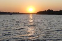 Direkt neben unserer schönen Lodge am Sambesi befindet sich unser Ausflugsschiff für die Sundowner Tour. Nach Chobe, Okavango und Kwando ist der Sambesi nun Nummer 4 der von uns befahrenen Flüsse. Bei einem Bier, einem Glas Wein oder Gin Tonic treffen wir mit Krokodil und Hippo auf alte Bekannte und erleben einen wunderschönen Sonnenuntergang über dem viertgrößten Strom Afrikas.