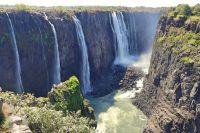 Wider Erwarten sind trotz Hochsaison keine Besuchermassen unterwegs, die Zahl der Besucher ist sehr überschaubar. Wir beginnen unsere Tour an der Livingstone Statue und dem Devils Pool. Entlang der Schlucht ergeben sich immer wieder neue faszinierende Perspektiven auf die Wasserfälle. Ich denke, wir sind genau zur richtigen Zeit hier – es ist nicht zu viel Wasser im Sambesi wie am Ende der Regenzeit. Dann wäre die Gischt zu hoch. Heiner bringt es auf dem Punkt: weniger ist mehr. Bei unserer Wanderung entlang der Fälle können wir auch die Victoria Falls Bridge sehen. Die 1905 eröffnete Stahlbrücke überspannt die über 100 Meter tiefe Schlucht des Sambesi und war ursprünglich ein wichtiges Puzzleteil der unvollendeten Eisenbahnstrecke Kairo - Kapstadt des britischen Empires.