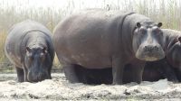 Während der Rückfahrt mit dem Boot zur Lodge beobachten wir Nilkrokodile und viele Flusspferde, die sich außerhalb des Wassers auf einer Sandbank befinden.