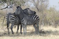 Am Vormittag kommen uns Sam und Phenyo mit Safarifahrzeugen abholen. Unser großes Reisegepäck wird auf den Dächern der Fahrzeuge verstaut und sicher festgezurrt. Zwei Stunden dauert unsere Fahrt, davon die meiste Zeit durch trockenen Busch mit Mopanesträuchern und entlang des Büffelzaunes. Dieser trennt die Gebiete mit Rinderzucht von Regionen mit Büffeln, welche die gefürchtete Maul- und Klauenseuche übertragen.