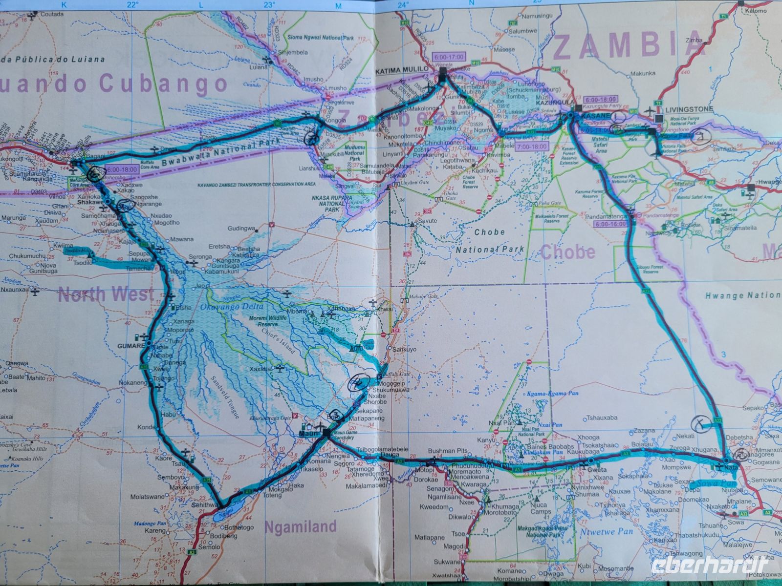 Wir verließen die Thamalakane River Lodge via Maun in Richtung Süden. In Maun selbst legten wir an einem Handwerkermarkt einen Stopp ein, so dass wir kleine Kunstwerke aus Holz (meist Elefanten und Nilpferde) erwerben konnten. Bis Sahitwa fuhren wir auf gut ausgebauten Straßen bis zum südlichsten Punkt unserer Reise, um dort in Richtung Norden mit Ziel Shakawe abzubiegen. Die Straßen wurden deutlich schlechter und ab und zu mussten wir neben diesen fahren, da die vielen Löcher ein normales Fahren nicht zuließen.