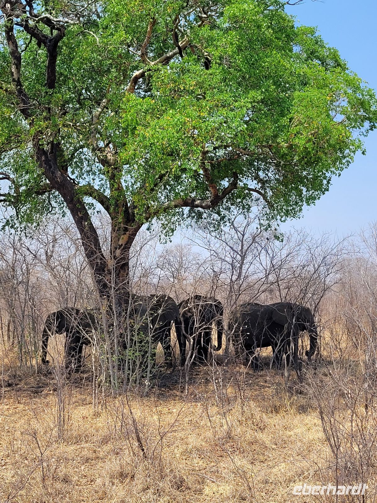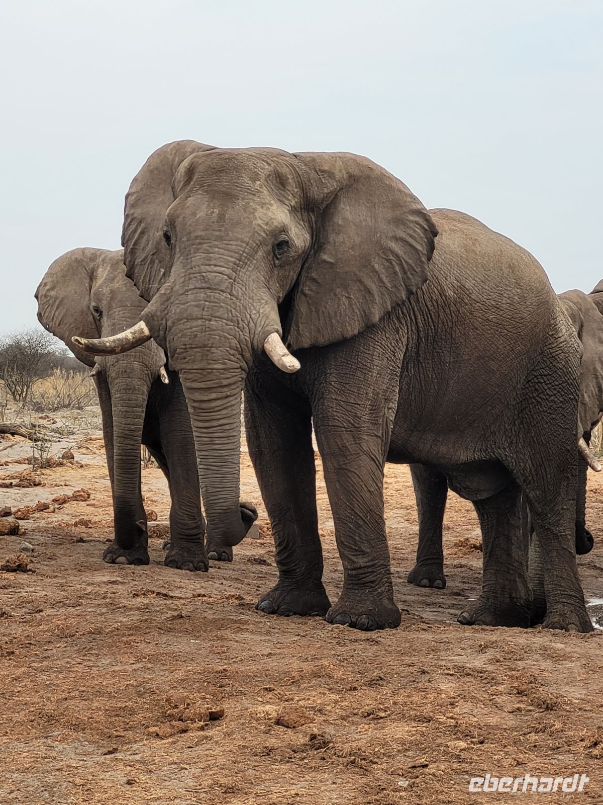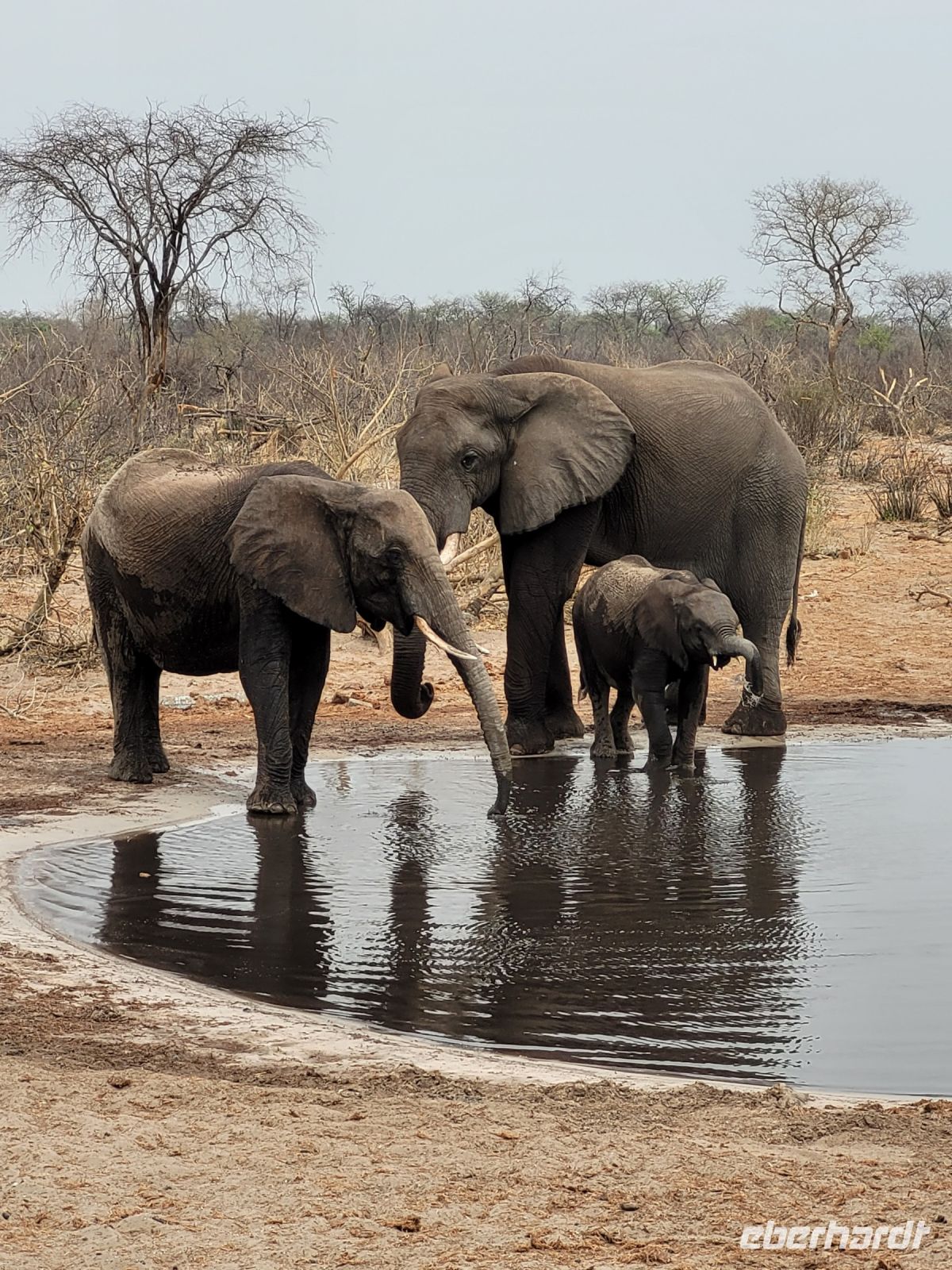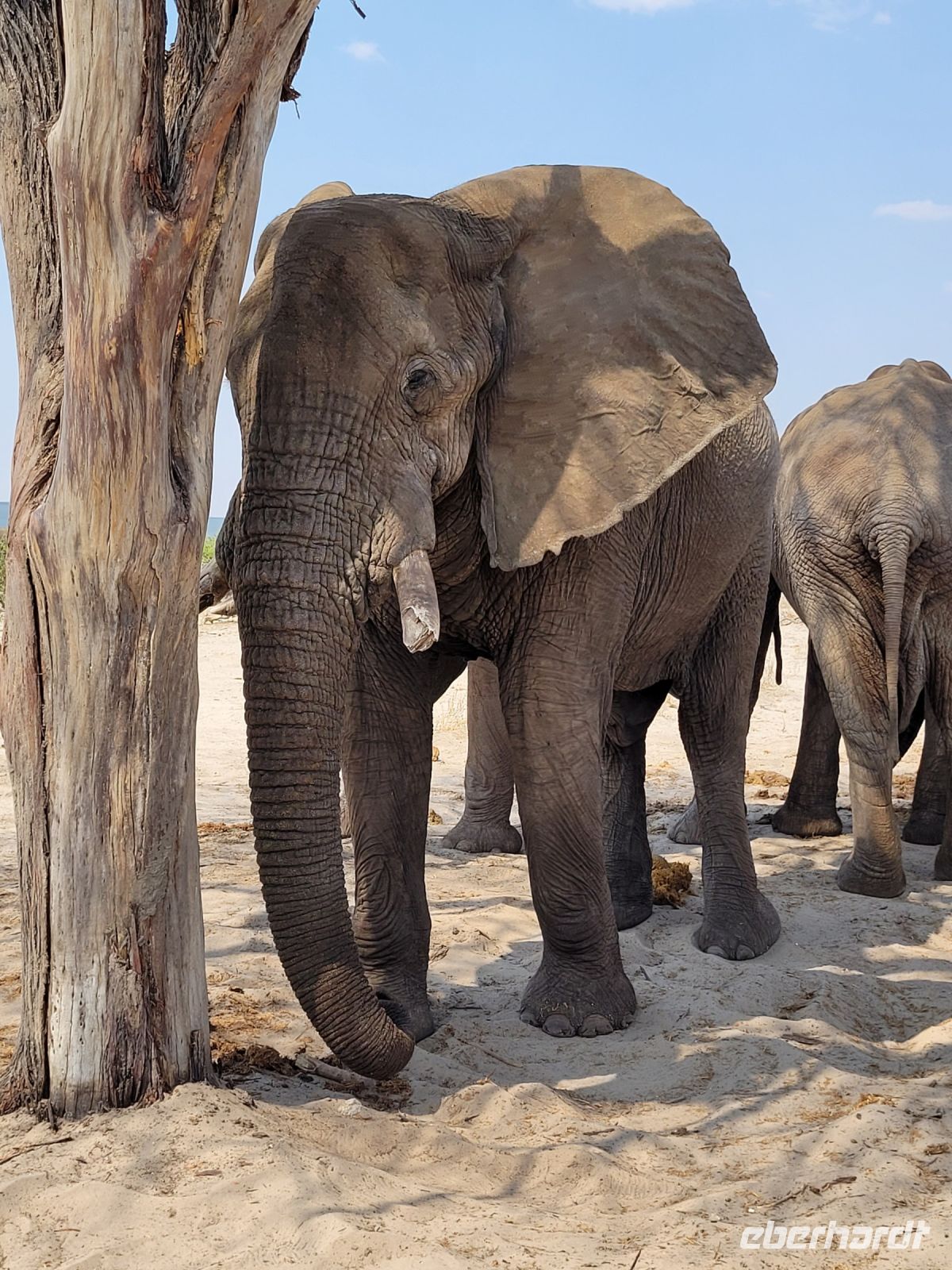 Für die nächsten 2 Tage wechselten wir in die „Wildnis“. Abseits der Zivilisation war die Shokomoka Adventure Lodge unser nächstes Ziel. Dazu ließen wir unsere Koffer in der Thamalakane Lodge und nahmen nur das Notwendigste in den beiden Jeeps mit. Die ersten Kilometer wurden noch recht bequem auf asphaltierten Straßen zurückgelegt, um dann auf Sandwege zu wechseln. Dieser war relativ weich und da einer unserer beiden Jeeps wohl vergessen hatte, das Allrad zuzuschalten bzw. zu viel Druck auf den Reifen war, blieb er fast folgerichtig stecken. Er konnte aber mithilfe des zweiten Jeeps befreit werden und so konnte die Fahrt zur Lodge weitergehen. Während unserer Fahrt sahen wir mehrere größere Elefantenherden und einige andere Tiere. In der Lodge angekommen, wurden wir herzlich von allen Angestellten begrüßt und konnten uns erst einmal bei einem Mittagessen stärken. Anschließend bezogen wir unsere sehr komfortablen alleinstehenden Zelte und bereiteten uns auf unsere erste Pirschfahrt am späten Nachmittag vor. Wieder sahen wir etliche Tiere, Große und Kleine. Den Abschluss der Fahrt bildete ein kleines Sundowner-Picknick. Dabei standen wir scheinbar einer kleinen Elefantengruppe mit unseren Fahrzeugen im Wege. Erst beäugten sie uns eine Weile bis dann das Leittier befand, dass es auch noch einen Weg an uns vorbei gab. Das sehr leckere Abendessen nahmen wir dann im Hauptzelt ein, um den Tag mit dem einen oder anderen Getränk am Lagerfeuer abzuschließen.