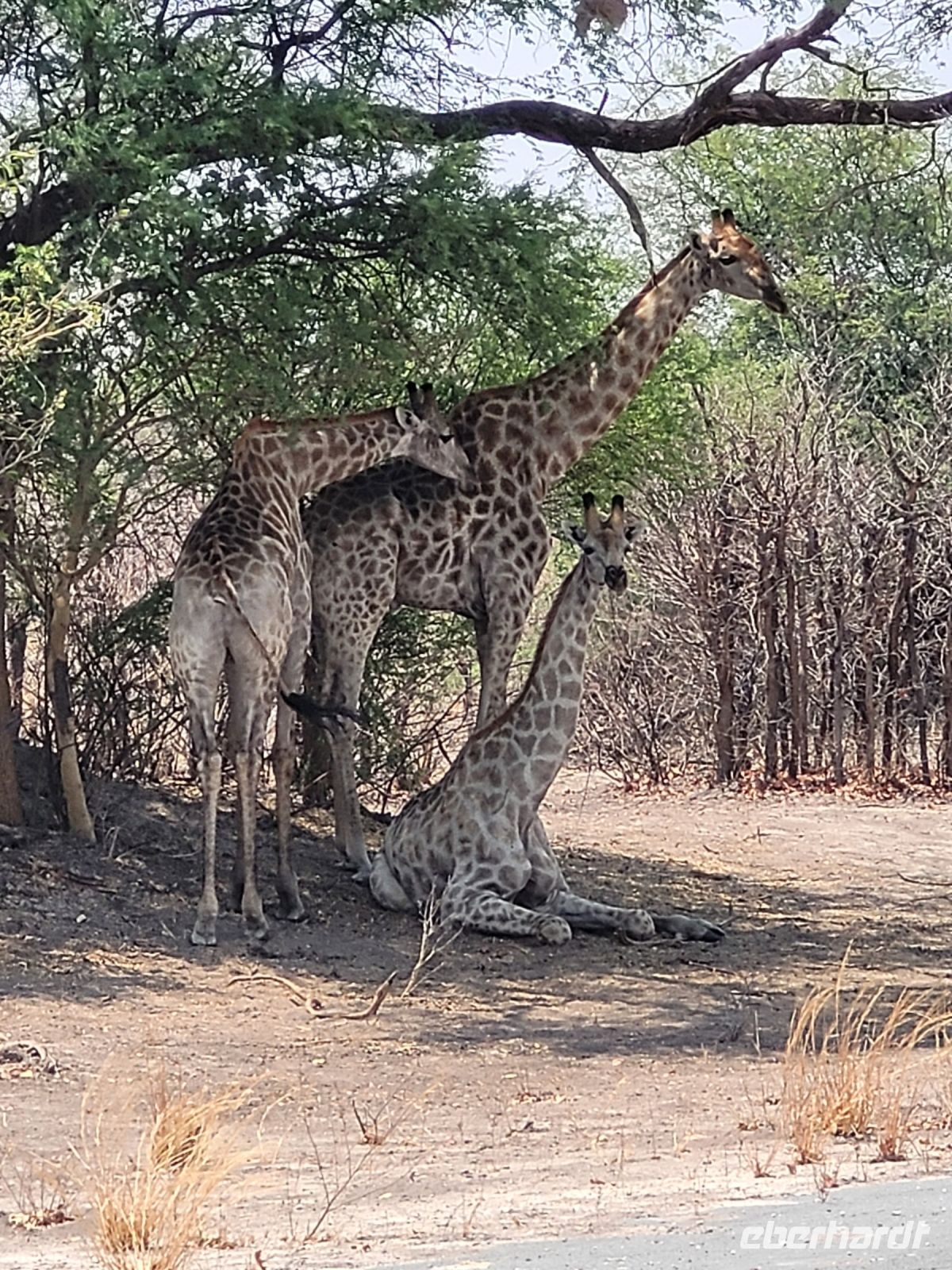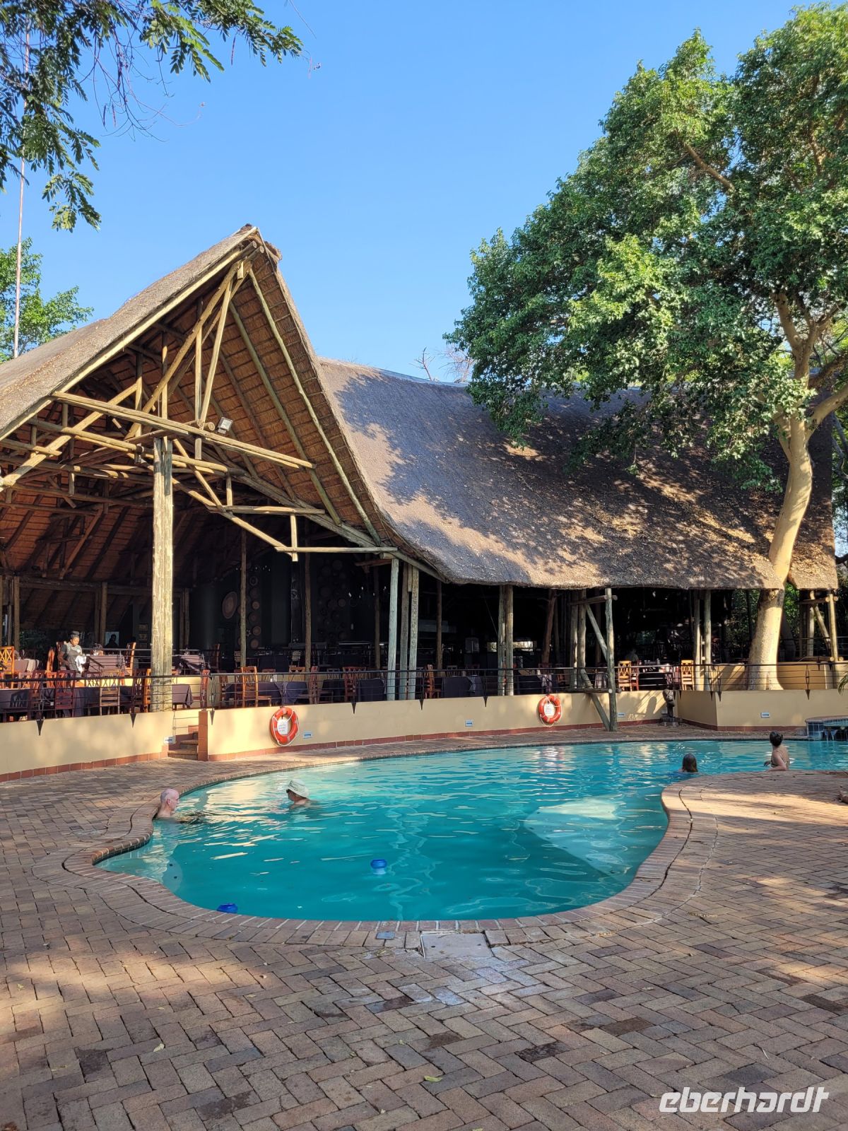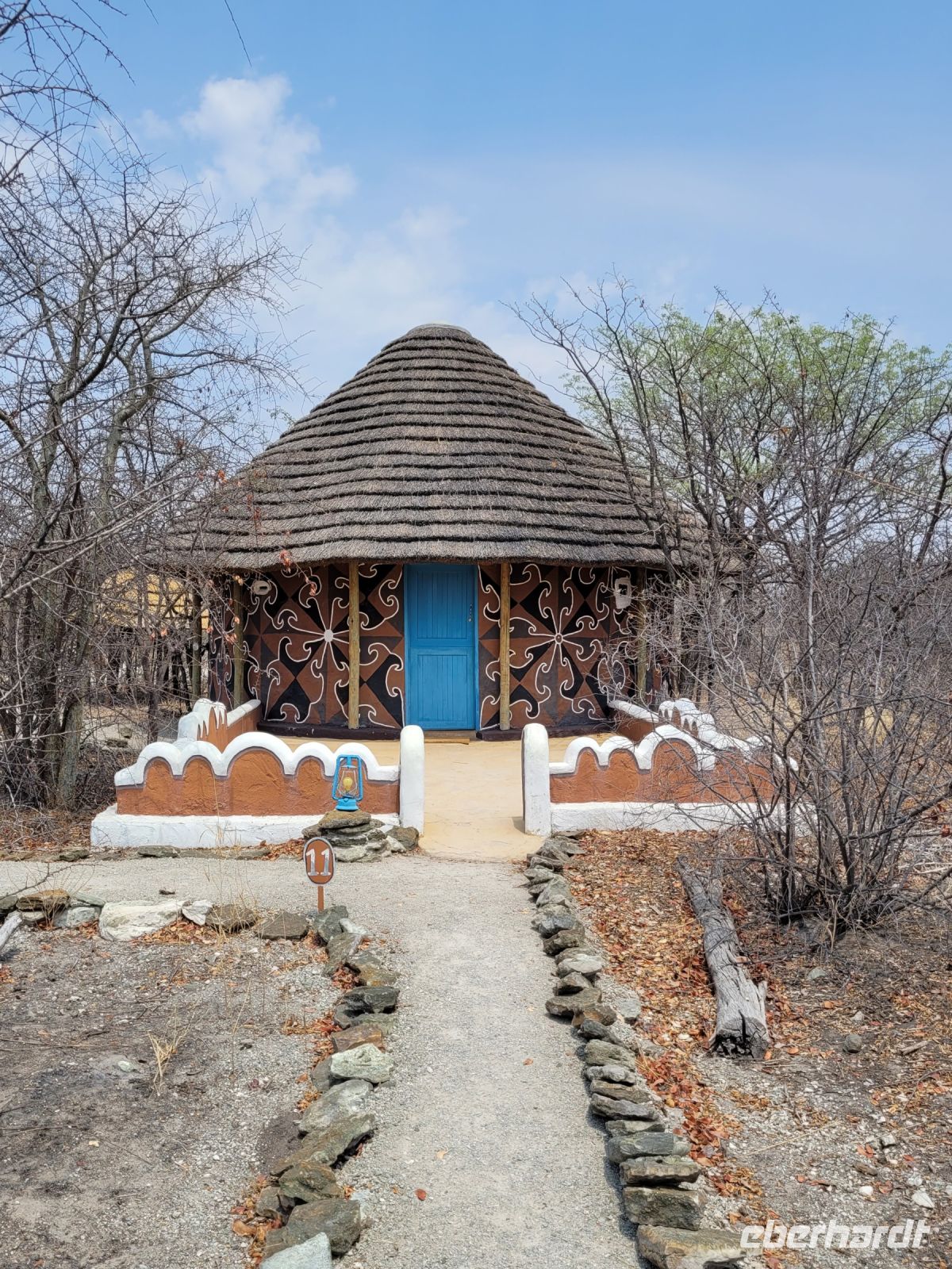 An diesem Tag verließen wir Namibia und kehrten nach Botswana zurück. Unseren ersten Stopp machten wir nur wenige Minuten nach dem Verlassen der Namushasha Lodge. Wir besuchten das Namushasha Heritage Centre, eine Art lebendiges Museum. In diesem Dorf wurde uns die alte Lebensweise anhand von Tafeln, aber auch praktisch vorgeführt. So konnten wir zum Beispiel sehen, wie Körbe geflochten werden, wie das Eisen mittels Blasebalg erhitzt und anschließend bearbeitet wird, wie die Vorfahren mittels Fallen Antilopen gejagt haben, wie Hirse gestampft wurde und einiges mehr. Natürlich durften sich beim Stampfen oder Flechten auch die Gäste mal versuchen. Talente waren dabei. Zum Abschluss führten uns einige Stammesmitglieder auf alten Instrumenten (Xylophon und Trommeln) verschiedene Lieder und Tänze vor. Auch der Schamane tanzte für unsere Gesundheit. Anschließend war noch einmal Manneskraft gefragt, denn unser Bus hatte sich im weichen Sand festgefahren und so musste erst das gesamte Gepäck ausgeladen werden, damit wir den Bus aus der Sandkuhle herausbekamen. Nachdem das geschafft war und alles wieder eingeladen war, setzten wir unseren Weg in Richtung Grenze fort. Die Einreise aus Namibia ging flott und auch die Einreise nach Botswana relativ zügig. Anschließend fuhren wir durch den Chobe Nationalpark, einem der Bekanntesten in Botswana, nach Kasane und erreichten auch bald unser Quartier für die nächsten 2 Nächte, die River View Lodge. Die Zimmer waren schnell bezogen und vermutlich alle Gäste freuten sich angesichts des heißen Tages auf eine erfrischende Dusche. Den Tag ließen wir bei schönstem Wetter mit dem einem oder anderen Getränk und dem gemeinsamen Abendessen ausklingen.