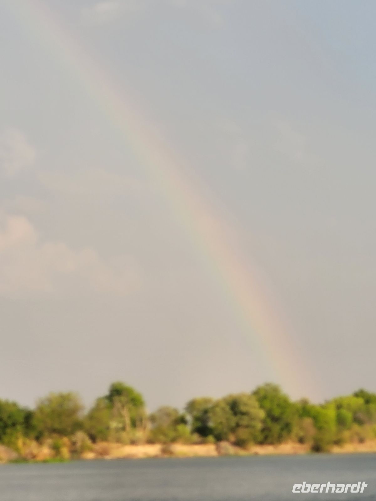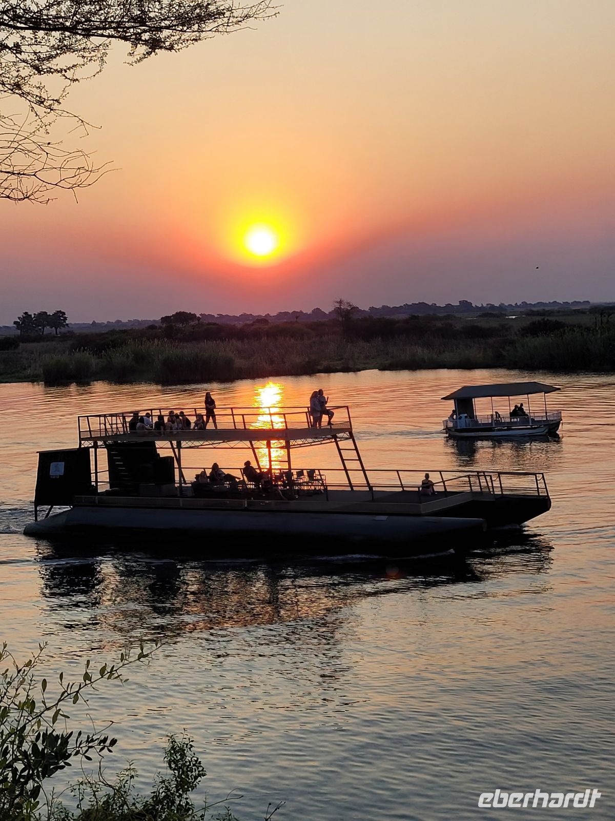 Angekommen in unseren am Rande der Stadt und direkt am Ufer des Sambesi gelegenen Hotels bezogen wir unsere Zimmer und konnten etwas relaxen. Am Nachmittag ging es dann zu unserer letzten Bootstour auf dieser Reise. In unmittelbarer Nähe zu unserem Hotel gingen wir an Bord und feierten ein im wahrsten Sinne des Wortes feucht-fröhliche Tour. Es fing nicht nur während der Fahrt kräftig an zu regnen (der Himmel weinte angesichts des nahenden Abschieds) sondern auch die Nässe in unseren Gläsern schien nie zu versiegen. Die Stimmung war einfach prächtig. Wir feierten eine beeindruckende Reise mit wunderschönen Erlebnissen, vielen Tierbeobachtungen, herrlichen Sonnenuntergängen und vielen neuen Erkenntnissen zu Land und Leute, vor allem in Botswana und Namibia. Wir feierten aber auch den Abschied von Jaco, unserem Reiseleiter, der uns alle mit seinem Wissen über Land und Leute, aber auch mit einer seiner erfrischenden Art begeistert hat. Zum gemeinsamen Abendessen (mit Krokodilfleisch) und beim abschließenden Umtrunk erinnerten wir uns noch einmal an die wunderschöne Reise und verabschiedeten Jaco, der am nächsten Tag schon sehr früh nach Windhoek zurückmusste.