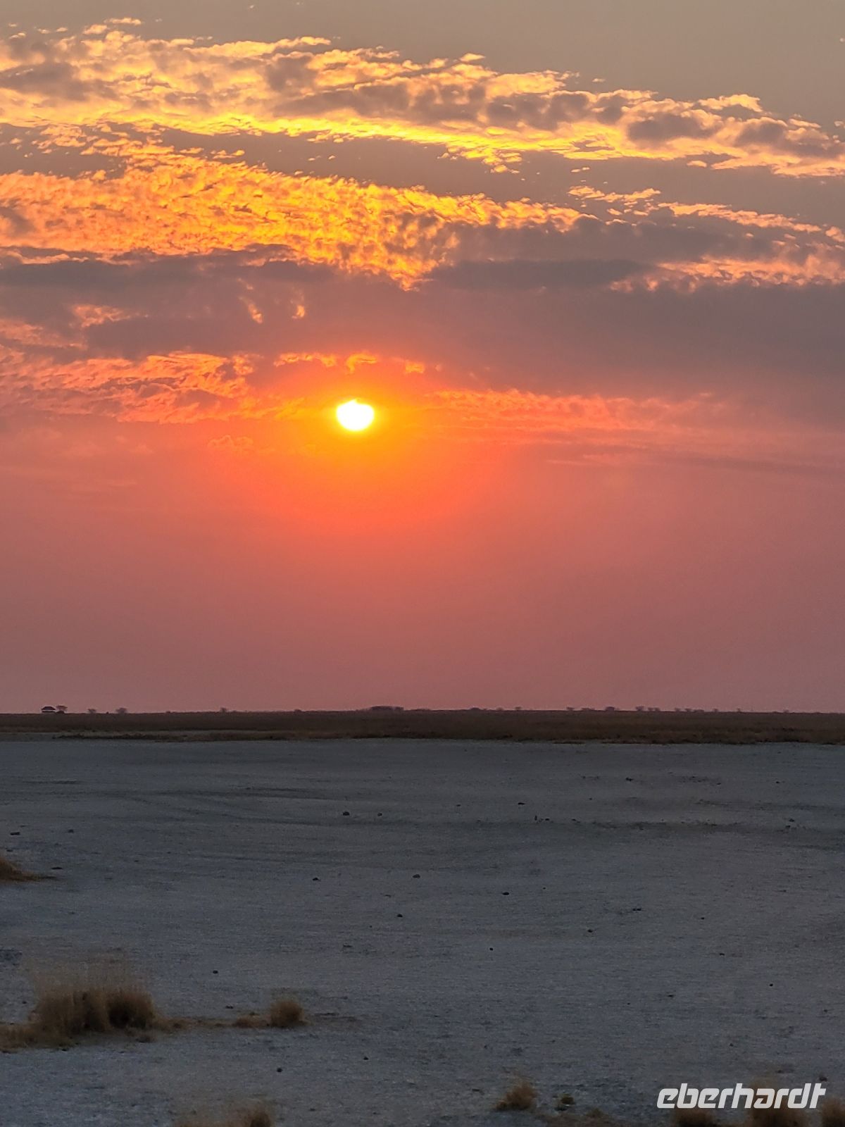 Am zeitigen Nachmittag erreichten wir unsere nächste Unterkunft, die Nata Lodge. Der Tag war aber noch nicht vorbei, denn eine Sundowner-Fahrt mit Jeeps in die fast vegetationslosen Salzpfannen, mit einer Größe von rund 17.000 Quadratkilometern die Größte in der Welt. Neben einigen Tiersichtungen (u.a. Gnus) erlebten wir mit einem erfrischenden Getränk in der Hand einen sehr schönen Sonnenuntergang. Zurück in der Lodge stärkten wir uns bei einem wiederum sehr guten Abendessen und dem einen oder anderen Bier zum Abschluss des Tages.