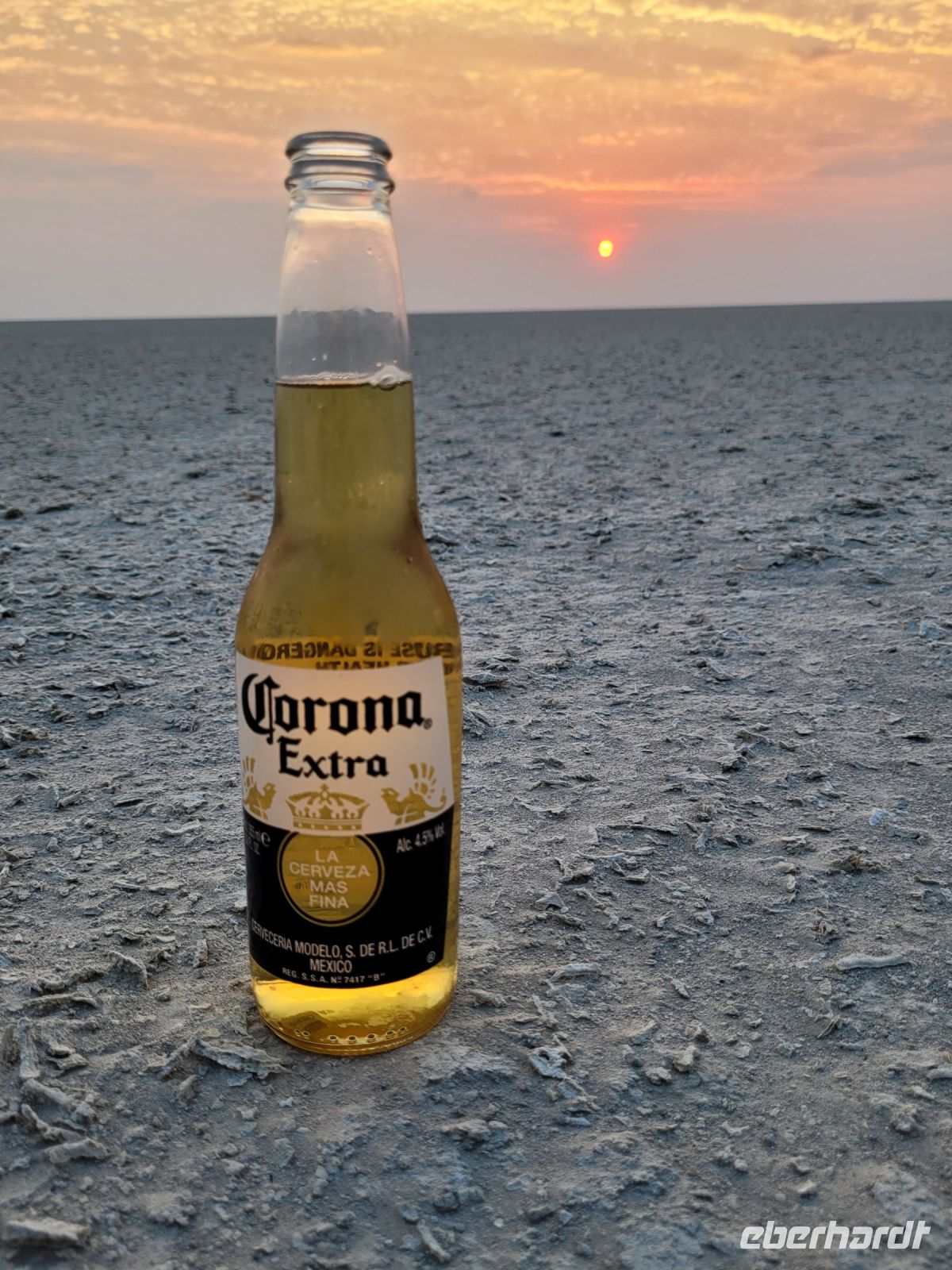 Der Campingtisch im Bus sollte an diesem Tag noch einmal zum Einsatz kommen, den unser Reiseleiter Jaco wollte noch einen Gin-Tonic-Umtrunk mit uns machen. Also fuhren wir vor dem Sonnenuntergang noch einmal aus der Anlage heraus und genossen die von Jaco zubereiteten Drinks. Lecker lecker. Happy Day kann man da nur sagen.