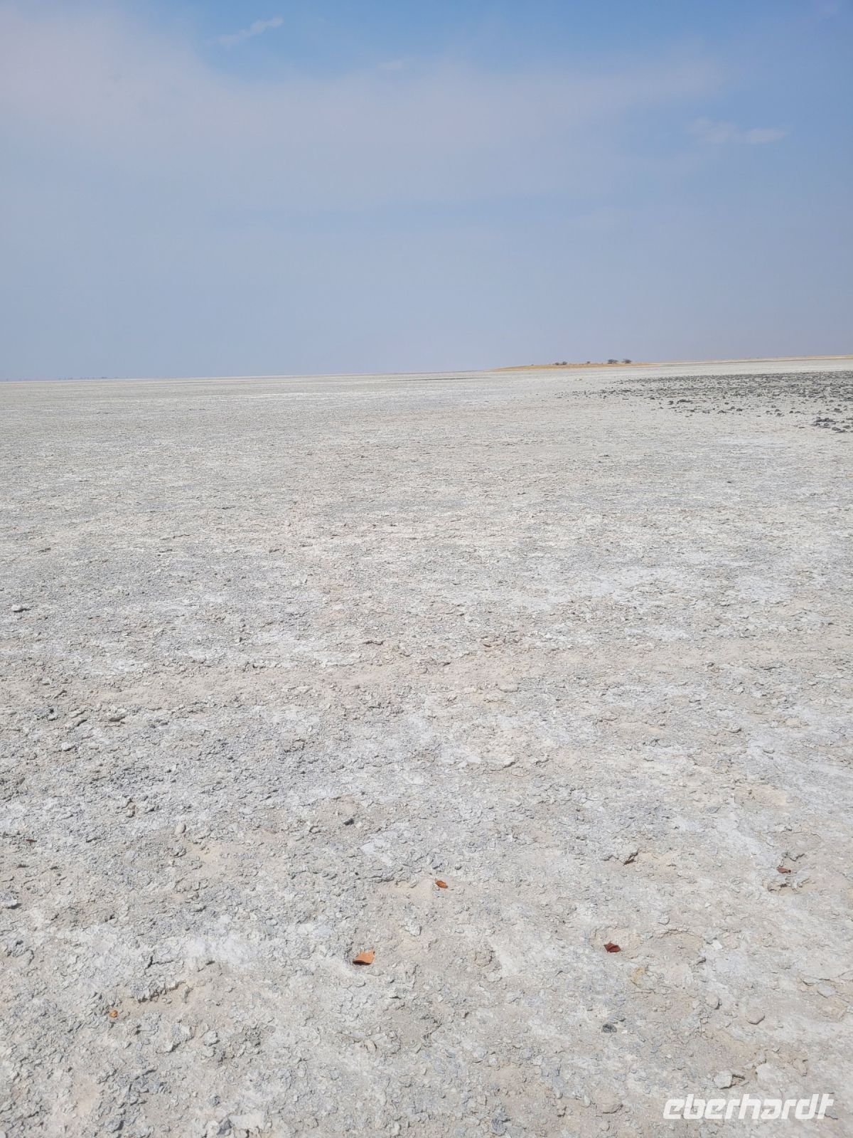 An diesem Morgen verließen wir die Nata Lodge in westlicher Richtung. Ziel war Maun und die Thamalakane River Lodge. Nach einigen Kilometern Fahrt bog Jaco, der nicht nur unser Reiseleiter, sondern auch unser Fahrer war, von der Straße ab und fuhr mit uns noch einige hundert Meter in eine Salzpfanne hinein. Wie schon am Vortag war die fast unendliche Weite dieser Landschaft sehr beeindruckend.