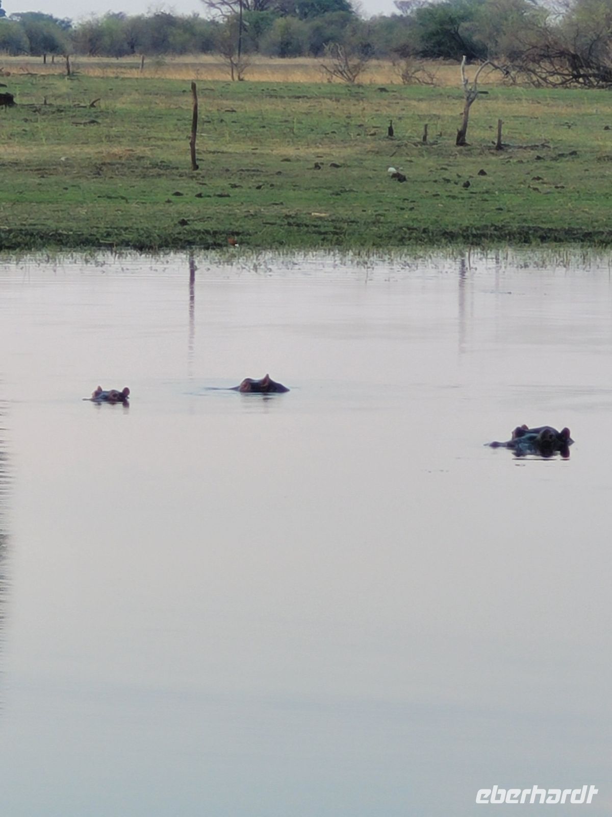Am Nachmittag verließen wir vorläufig Botswana und überquerten nach Shakawe die Grenze nach Namibia. Jeder Grenzübertritt ist scheinbar anders. Diesmal mussten wir sogar ein Ausreiseformular in Botswana ausfüllen, in Namibia dann einen Gesundheitsbogen beantworten und eine Fiebermessung machen, um dann mit dem namibischen Einreiseformular und dem Pass die Grenze zu überschreiten. Da aber die Grenze fast menschenleer war, ging insgesamt alles relativ zügig und wir konnten unsere Fahrt zu der nur wenige Kilometer entfernten Ndhovu Safari Lodge fortsetzen. Anders als bisher waren die Straßen nicht asphaltiert, sondern sandige Schotterpisten. Nachmittags erreichten wir auch diese sehr malerisch direkt am Okavango gelegene Lodge und erfrischten uns nach dem Bezug der Zelte erst einmal mit einem frisch gezapften kühlen Bier. Dabei konnten wir von der Terrasse der Lodge im und am Wasser verschiedene Tiere beobachten: Nilpferde, Antilopen, Büffel, Warzenschweine, Elefanten und einiges mehr.